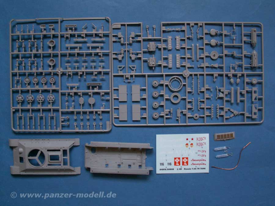 Im Karton finden sich 8 Spritzlinge, die Ober- und Unterwanne, die Motorabdeckung aus Plastik mit bereits integriertem Lüftergitter aus PE Teilen, Klarsichtteile, Metalldraht und Decals.