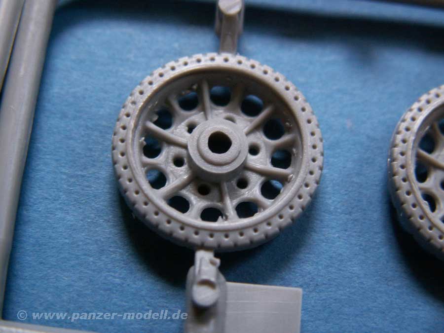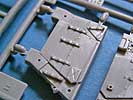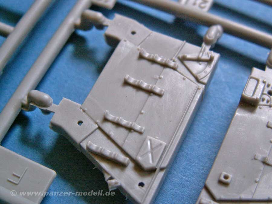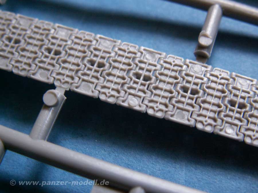 Die Teile sind durch die Bank für diesen kleinen Maßstab erstaunlich gut, vor allem wenn man sich mal die Wanne oder die verschiedenen Stahl- und Gummilaufrollen ansieht. Auch die Ketten sehen sehr gut aus, die aus verschieden langen Stücken besteht, wobei man bei sehr nahem Hinsehen auf der Unterseite einige Auswerferstellen entdeckt.