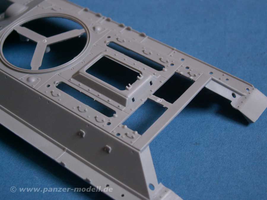 Was ebenfalls sehr gut ist, ist die Tatsache, dass der Bausatz eine KOMPLETTE Inneneinrichtung mit allem drum und dran enthält. Die Ausstattung ist nahezu perfekt mit Motorraum, Motor, Getriebe, Kühler, Kampf- und Fahrerraum mit Munitionslagerungen, Fahrerplatz, Druckluftflaschen, Turminnenleben und weiteren Innenraumdetails ohne Ende.
