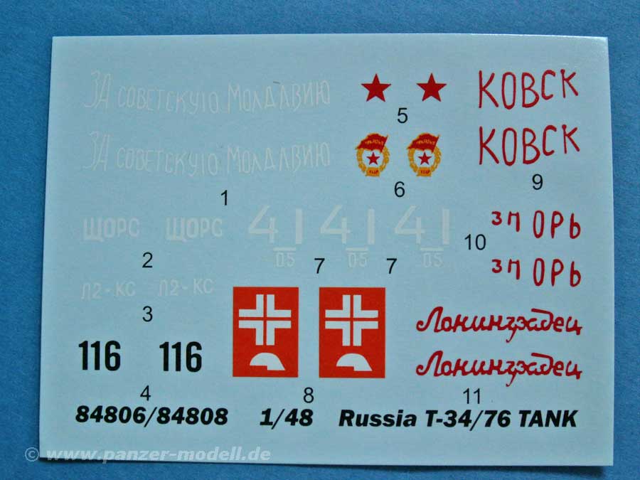 Für die Markierung und Farbgebung liegt ein farbig gedruckter DIN A4 Bogen bei für eine Version in russisch grün. Der Decalbogen beinhaltet aber noch andere hochinteressante Markierungen.
