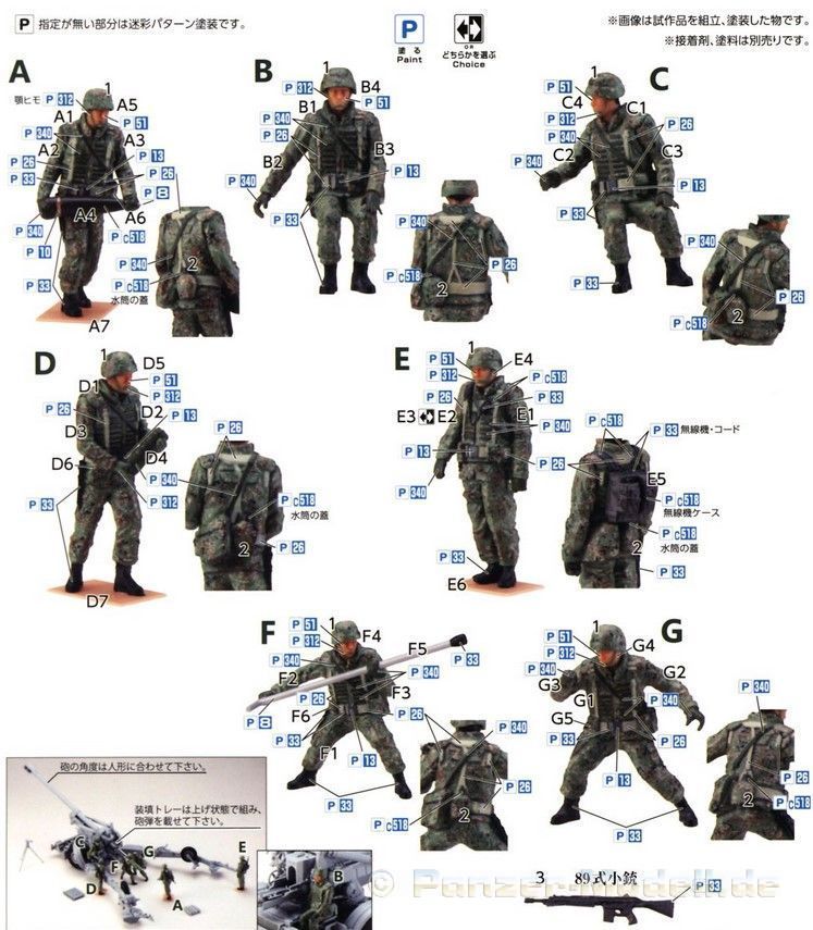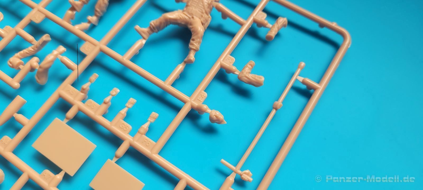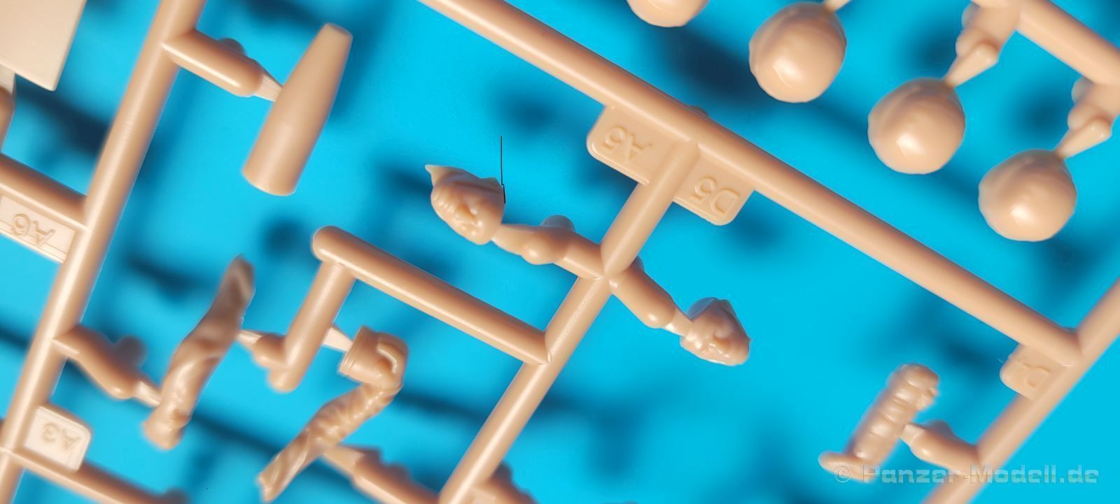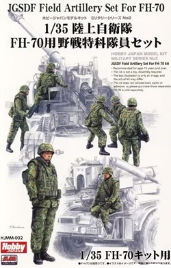 Passend zur japanischen Ausführung der FH-70 des gleichen Herstellers, folgt hier ein Set mit der passenden Bedienermannschaft. Insgesamt sind Sieben Figuren enthalten: Der Geschützführer Ein sitzender Kanonier (Fahrer, falls die Haubitze in Fahrstellung gebaut wird) Vier Kanoniere bei Ladetätigkeiten. Der Richtschütze. Die Figuren und Ausrüstungsgegenstände wie Feldflaschen und Sturmgewehre, sowie etwas artilleristische Ausrüstung, befinden sich auf zwei Spritzlingen. Es findet sich weder Grat noch Fischhaut. Insgesamt machen die Figuren einen soliden Eindruck, jedoch wirken diese bei näherer Betrachtung nicht so Filigran, wie die Figuren mancher Mitbewerber. Für den Fan europäischer Armeen ist die Bedienmannschaft eher ungeeignet, da die Figuren dann wohl umfangreich umgebaut werden müssten, angefangen von den Helmen, den Gewehren, den Schutzwesten etc. Die Bauanleitung befindet sich auf der Rückseite des Kartons. Empfehlenswert für den Freund der JGDSF.