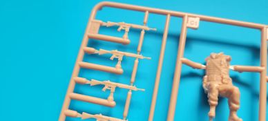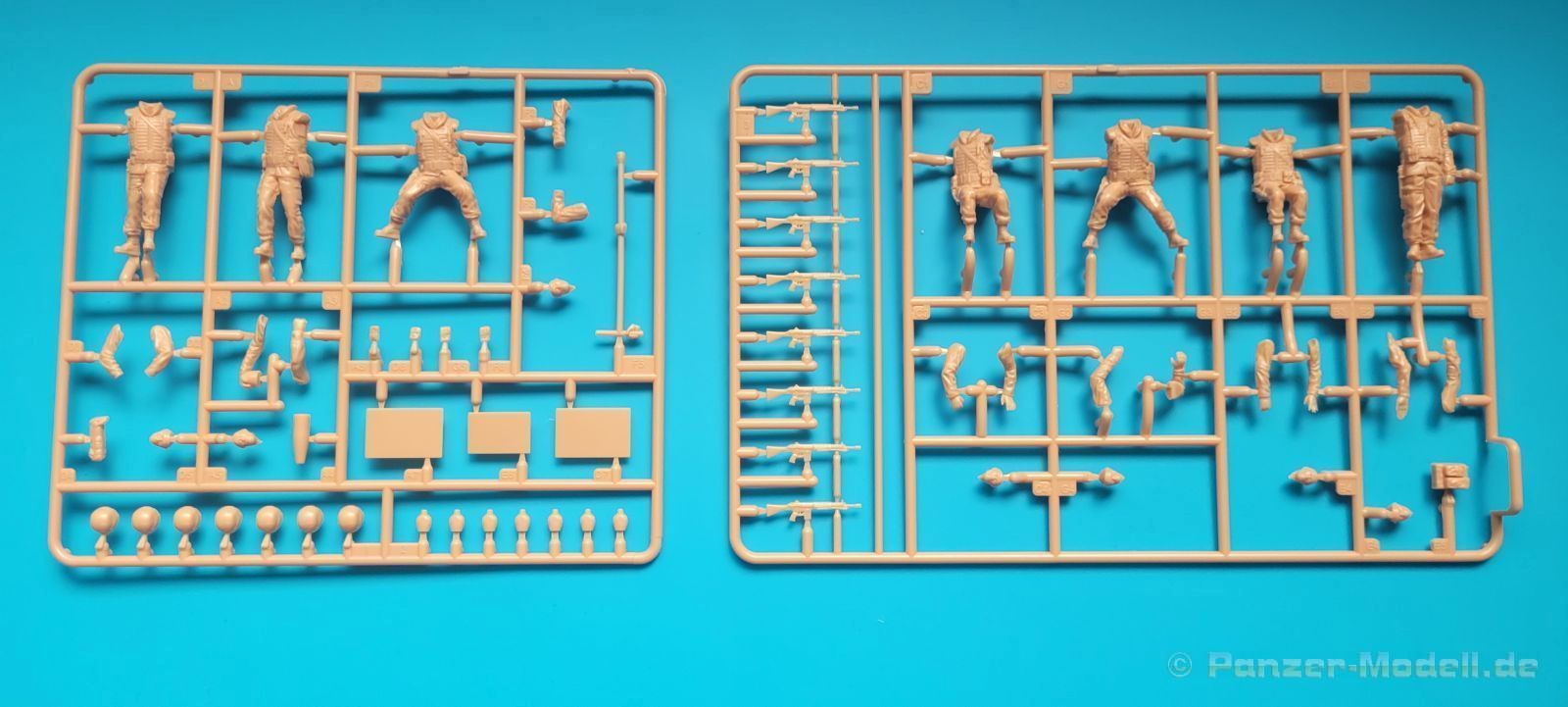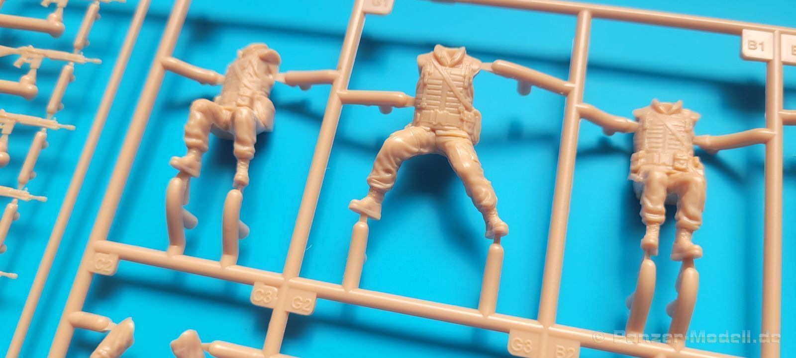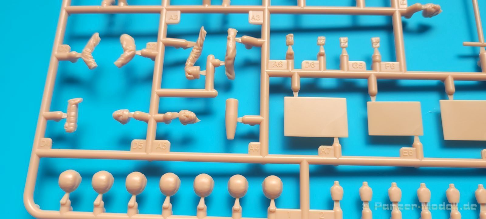 Passend zur japanischen Ausführung der FH-70 des gleichen Herstellers, folgt hier ein Set mit der passenden Bedienermannschaft. Insgesamt sind Sieben Figuren enthalten: Der Geschützführer Ein sitzender Kanonier (Fahrer, falls die Haubitze in Fahrstellung gebaut wird) Vier Kanoniere bei Ladetätigkeiten. Der Richtschütze. Die Figuren und Ausrüstungsgegenstände wie Feldflaschen und Sturmgewehre, sowie etwas artilleristische Ausrüstung, befinden sich auf zwei Spritzlingen. Es findet sich weder Grat noch Fischhaut. Insgesamt machen die Figuren einen soliden Eindruck, jedoch wirken diese bei näherer Betrachtung nicht so Filigran, wie die Figuren mancher Mitbewerber. Für den Fan europäischer Armeen ist die Bedienmannschaft eher ungeeignet, da die Figuren dann wohl umfangreich umgebaut werden müssten, angefangen von den Helmen, den Gewehren, den Schutzwesten etc. Die Bauanleitung befindet sich auf der Rückseite des Kartons. Empfehlenswert für den Freund der JGDSF.