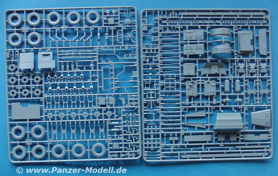 Ganz neu ist die kleine Feldküche, die auch als separater Bausatz erschienen ist. Die teile hierfür sehen gut aus mit dem Ofen, dem Ofenrohr und dem Kessel, den man auch offen darstellen kann. Das Untergestell aus Profilen ist neu zum aufbringen auf der Pritsche.