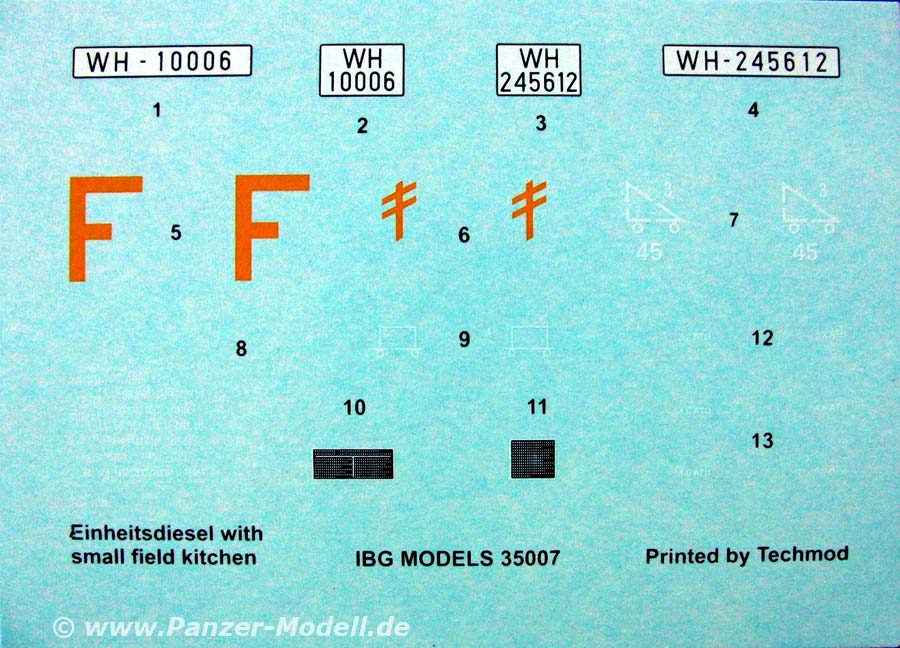 Es werden in der Bemalungsanleitung Farbangaben für Gunze, Model Master, Humbrol und Vallejo gemacht. An Varianten mit dem kleinen Decalbogen sind folgende machbar: