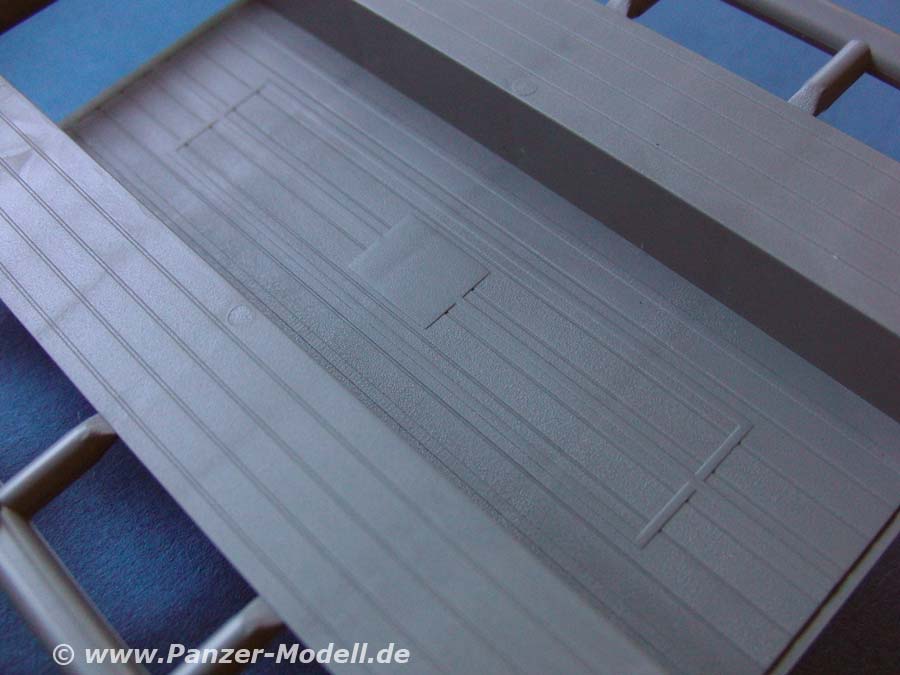 Die Pritsche ist die Stahlversion und besteht aus Holzboden, der mit entsprechenden Planken in Plastik dargestellt ist, sowie genietete Bleche für die Seitenwände mit feinen Details.