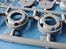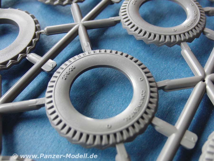 An den Achsen werden die Reifen aufgesteckt, die hier in der Scheibenmethode zusammengesetzt werden und dadurch recht feines Profil aufweisen. Da diese Reifen denen der Bausätze der 500er und 4500A entsprechen, haben auch diese Reifen die Herstelleraufdrucke an den Seiten.