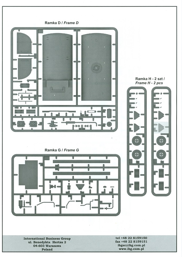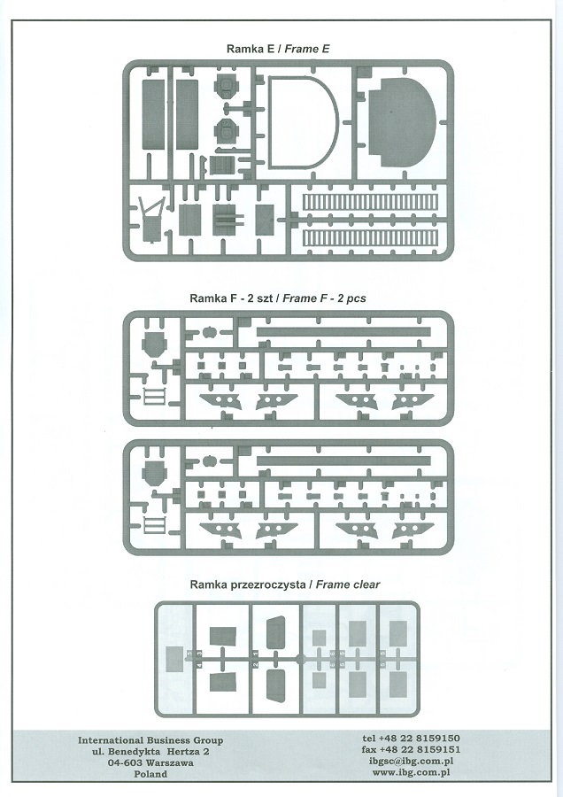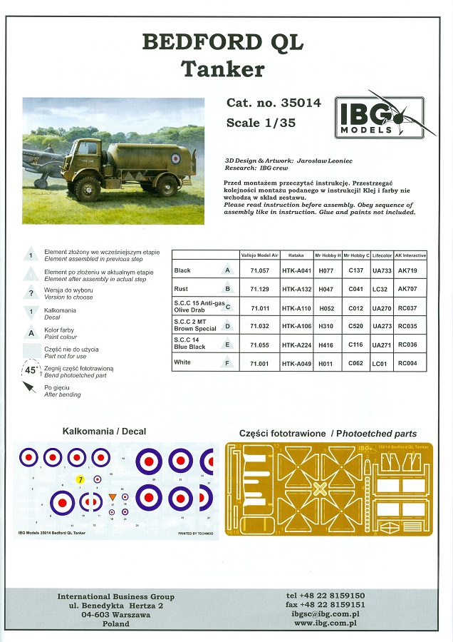 Leider gibt es immer noch keine Decals für das Armaturenbrett und Instrumente, welches auch grad bei den Tankpumpen das Aussehen aufwerten würde. Dafür sind die vorhandenen erfrischend seidenmatt ohne Trägerrand. Die 20-seitige Bauanleitung im A4 Format ist hauptsächlich in schwarz-weiß gehalten, mit farbigen Abbildungen bei den Decals, PEs und den Bemalungsanleitungen. Kurze Beschreibungen oder Anleitungen sind in polnisch und in englisch gehalten. Die erste Seite startet mit den benötigten Farben und gibt Farbnummern für Vallejo Model Air, Hataka, Mr. Hobby H, Mr Hobby C, Lifecolor und AK Interactive an. Die großformatige Teile- und Spritzlingübersicht zieht sich von Seite 1-4. Alle Teile sind deutlich erkennbar. Schnell hat man überprüft, ob sich alles dort befindet, wo es sein soll. Der Bau des Fahrzeugs wird in 45 sinnvoll aufgeteilten, leicht verständlichen Schritten mit ausreichend großen CAD-Zeichnungen erklärt. Einzelne Baugruppen, die in einem späteren Bauschritt verbaut werden, erhalten eine weiße Nummer in einem Dreieck. Bei Verwendung der Baugruppe erscheint das Dreieck wieder, dann in schwarzer Schrift. Am Ende der Bauschritte gibt es noch 1 Zeichnung des fertigen Modells von vorn rechts und hinten links gesehen. Die Anbringung der Decals und die Bemalungsanleitung von 3 Fahrzeugen finden wir auf den letzten Seiten. Erst einmal ist es toll, dass IBG sich des Bedford Tankers angenommen hat. Aus meiner Sicht ein tolles Modell mit vielen Details, dessen Anschaffung sich bei einem Preis in Deutschland zwischen 33 und 35 Euro lohnt. Fortgeschrittene Anfänger sollten damit zurechtkommen und Experten haben noch etwas Luft, noch etwas mehr draus zu machen.