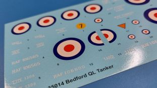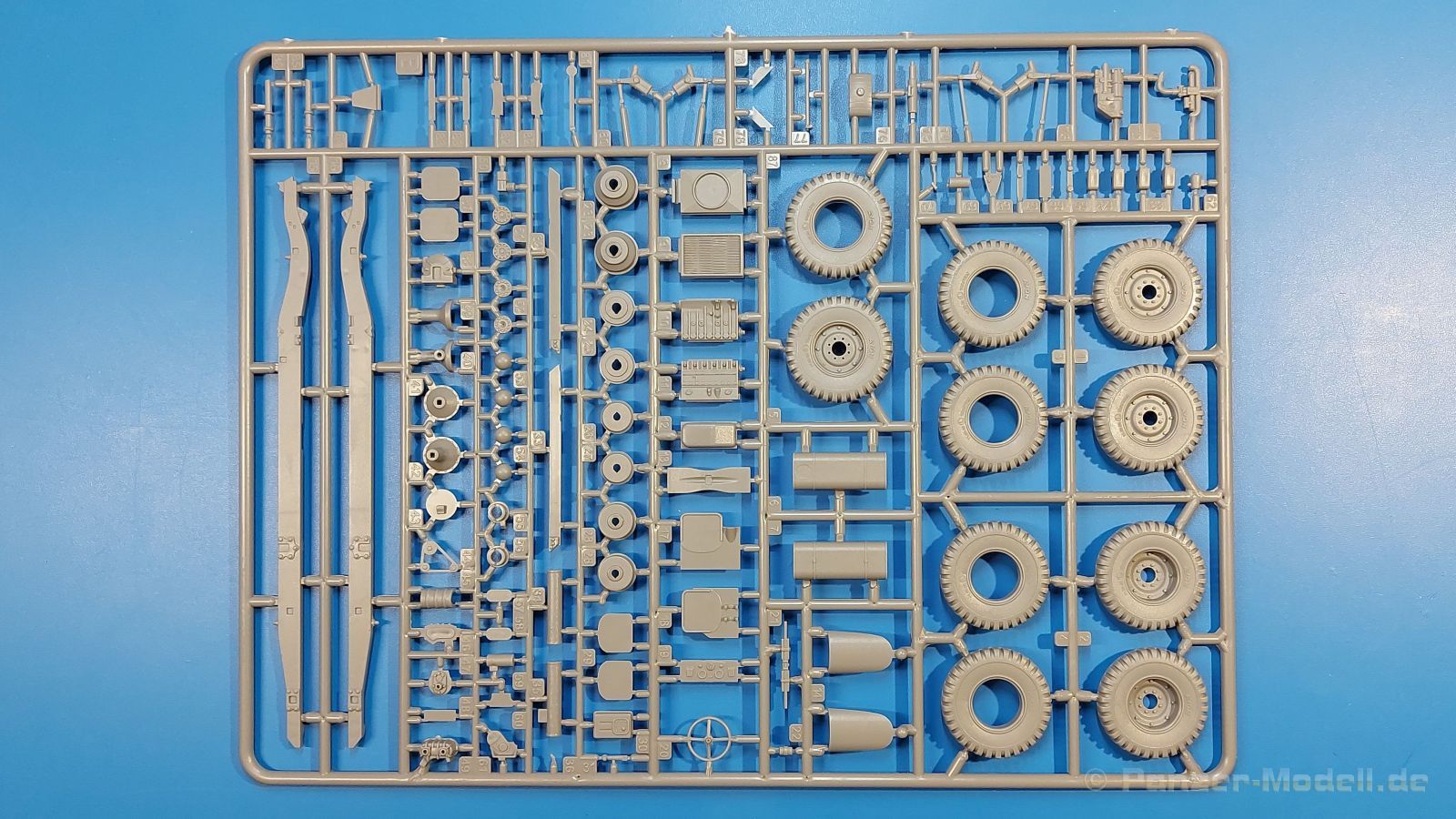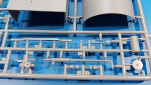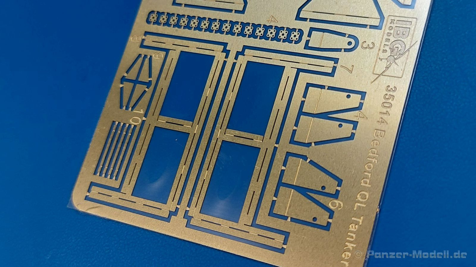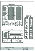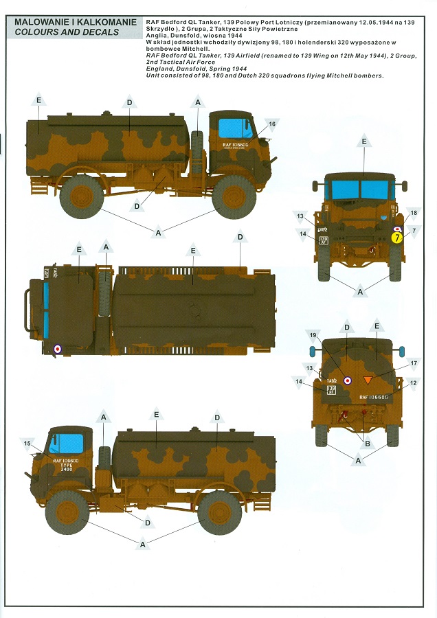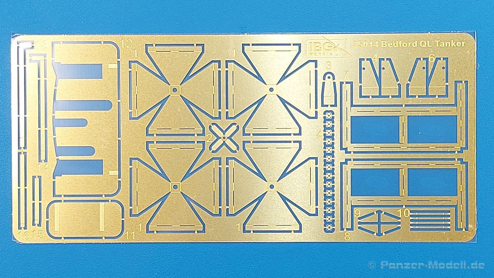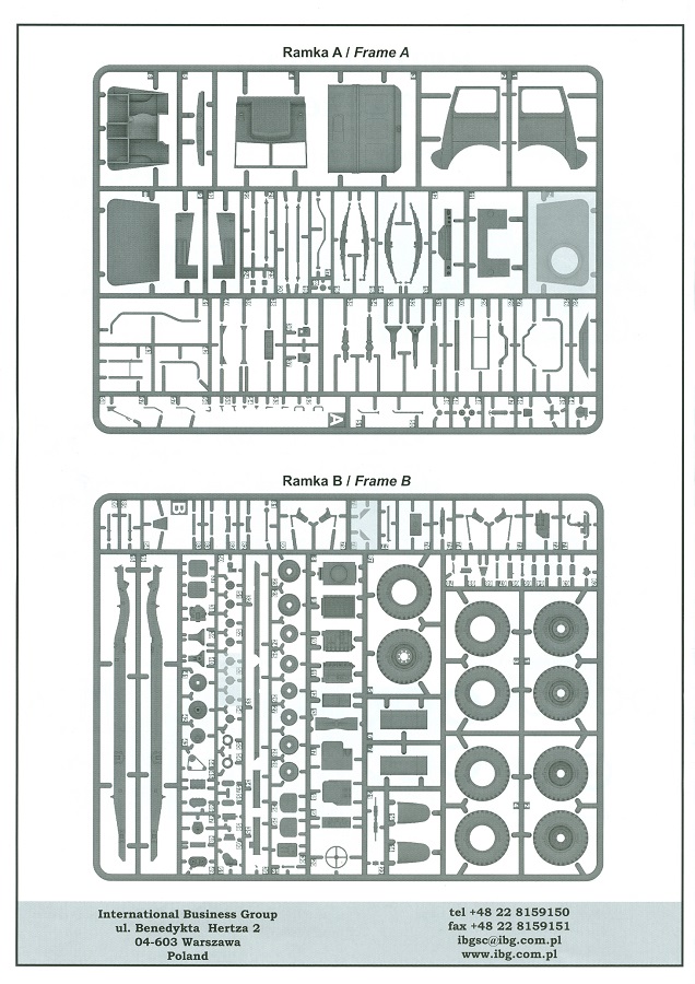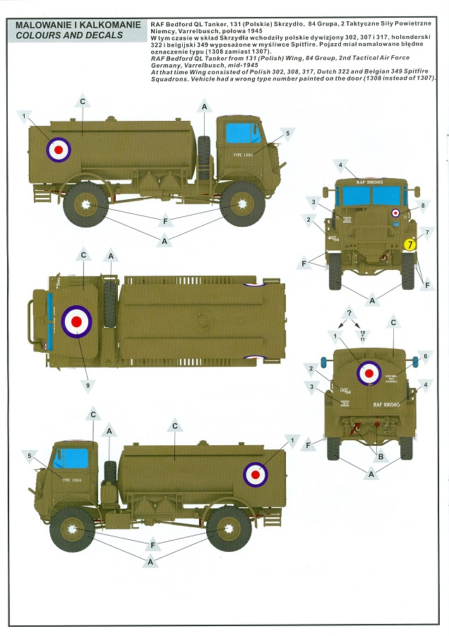 Das Original Der Bedford QL der gleichnamigen Firma Bedford gehörte zu einer Reihe von 3 to. Lkws, die zwischen 1941 und 1945 hergestellt und von den britischen Streitkräften im 2. Weltkrieg einsetzt wurden. Der QL Tanker war die Version eines Kraftstofftankfahrzeuges, welches hauptsächlich durch die Royal Air Force zum Betanken der Flugzeuge eingesetzt wurde. Der Tank fasste 950 Gallonen (ca. 4.319 Liter Umrechnung von britischen Gallonen in Liter). Der QL Tanker war natürlich auf Flugplätzen in England zu sehen, aber im Verlauf des Krieges auch näher an der Front wie z.B. in Belgien oder Italien. Der Bausatz: IBG Models führt seine Reihe des Bedford QL konsequent weiter und bringt als Nr. 5 einen QL Tankwagen auf den Markt. Im 405 x 258 x 60 mm großen Karton mit Stülpdeckel entdecken wir ein paar alte, bekannte und natürlich neue Spritzlinge. Insgesamt sind 9 graue Spritzlinge (Spritzlinge A und B sind bereits aus vorangegangenen Bedford QL Bausätzen von IBG bekannt.), 1 ebenfalls bekannter Klarsichtspritzling (Achtung: Ansicht in der Teileübersicht in der Bauanleitung entspricht nicht dem im Karton enthaltenen!), 1 PE-Platine, 1 Decalsheet und die Bauanleitung enthalten. Die Teile aus mittelgrauem Plastik sind größtenteils sauber ausgespritzt, ohne Grat und Versatz. Die Auswerfer sind meist auf den Spritzrahmen platziert. Leider finden sich an den Innenseiten der Blattfederpakete (Teile A13-A16), auf den Scheinwerfern (Teile B53, B54) und am Teil B72 Sinkstellen, die man außer bei den Scheinwerfern ggfs. ignorieren kann, weil sie am fertigen Modell nur schwer einzusehen sind. Die Klarsichtteile sind kristallklar ohne Kratzer oder Schlieren. Am Spritzling A finden wir die Hauptkomponenten des Fahrerhauses. Die Türen sind an den Seitenteilen fest angegossen. Innen sind die Fensterkurbeln bereits vorhanden, außen werden die Türgriffe noch angebracht. Aus den Klarsichtteilen werden nur die 2 Windschutzscheiben und die Türscheiben gebraucht. Bei den Türscheiben wurde auch das dreieckige Ausstellfenster bedacht. Man muss nur den Rahmen entsprechend in Fahrzeugfarbe bemalen. Das sehr gut getroffene Kühlergitter an der Frontseite ist auch fest eingegossen in die Front. Als Dach ist für den Tanker nur das geschlossene zu verwenden. Das ebenfalls vorhandene Dach mit der runden Öffnung wandert in die Ersatzteilkiste. Alle Pedale, Schalt- und Feststellbremshebel sind da und machen sich gut. Die Armaturentafel beim Original ist spartanisch eingerichtet, aber dennoch gut im Modell wiedergegeben. Der Feuerlöscher ist einfach gehalten, aber akzeptabel. Er verschwindet hinter dem Fahrersitz ohne weitere Aufmerksamkeit zu erregen. Bei den 3-teiligen Sitzen (Rückenlehne, Bodenplatte, Sitzpolster) gefällt mir die angeraute Oberfläche der Sitzpolster, die somit etwas Stoffstruktur wiedergeben. Der Fahrerhausboden hat die Motorabdeckung bereits integriert, so dass man den Motor nur zeigen könnte, wenn man das Fahrerhaus nicht festklebt. Die an den Ecken gerundeten, größeren Außenspiegel in der Form wie im Bausatz sieht man oft an restaurierten Fahrzeugen. Auf Fotos aus den 40 Jahren sind sie eher kleiner und viereckig. Auf den Kotflügeln des Fahrerhauses befinden sich Trittstufen mit feiner Antirutschriffelung. Zum ersten Mal ist eine PE-Platine im Bausatz, die auch das oft gesehene Gasdetektorblech samt Halterungen enthält. Auch ein großes Unterbodenblech, vermutlich um Motorwärme vom Tank fernzuhalten, ist dabei. Der Leiterrahmen besteht aus mehreren Längs- und Querträgern. Der 6-Zylinder Benzinmotor ist mit allen wichtigen Bauelementen (Motorblock, Zylinderkopf, Ölwanne, Anlasser, Generator, Vergaser, Zuluft-, Abgaskrümmer, Keilriemenscheiben mit Keilriemen, Lüfterpropeller) wiedergegeben. Kupplungsgehäuse und Schaltgetriebe schließen an den Motor an. Separate Kardanwellen werden zwischen Schalt- und Verteilergetriebe angebaut. Von dort zu Vorder- und Hinterachse. Die Gelenkköpfe der Kardanwellen kommen gut zur Geltung. Die Achsen sind mehrteilig ausgeführt, sollten sich aber problemlos gerade bauen lassen. Die Auslegung der Teile der Vorderachse lassen vermuten, dass ein Lenkeinschlag modellseitig nicht vorgesehen ist, aber es sind alle Teile des Lenkgestänges, Lenkgetriebe etc dabei. Die Federpakete der Blattfedern sind gut dargestellt, wären da nicht die Sinkstellen auf den Innenseiten. Die Federdämpfer der beiden Achsen sind sauber ausgearbeitet. Ein Auspuffrohr führt vom Abgaskrümmer zum 2-teiligen Schalldämpfer, der im linken Rahmenlängsträger verbaut wird. Das dort anzubringende Auspuffendrohr ist am Ende angeschrägt, aber leider nicht aufgebohrt. Für die linke Seite des Rahmens gibt es noch einen großen Staukasten unterhalb des Fahrzeugtanks, auf der rechten Seite den Druckluftbehälter für die Bremsen. Hinter dem Fahrerhaus wird ein 12-teiliges Gestell aufgebaut, dass sowohl den Kraftstofftank des Fahrzeugs als auch das Ersatzrad aufnimmt. Die Felgenlöcher sind des Ersatzrades durchbrochen (also ohne Schrauben), wie es sich gehört. Sowohl Ersatzrad als auch die vier anderen Räder tragen erhabene Hersteller- (AVON - Anmerkung: Bei den AVON Reifen scheint es sich gemäß anderer Quelle um Nachkriegsreifen zu handeln!) und Reifengrößenaufschriften (11.00-20). Die Radschrauben sind gut wiedergegeben. Als Fünfter im Bunde der IBG Bedford QL zeichnet sich der Tanker natürlich durch seinen Tankaufbau aus. Am Auffälligsten sind die große Unter- und Oberschale des Tanks. Zur Befestigung am Fahrzeugrahmen werden an der Unterschale vier Träger, jeder aus 4 Teilen bestehend, angebracht. Diese Träger nehmen auch beidseitig die Laufroste auf. Die hinteren Kotflügel werden mit dem Tank, nicht mit dem Rahmen verbunden. Zwei Gestelle aus PE nehmen insgesamt 4 Trichter (ebenfalls aus PE) auf. Die Stutzen der Trichter sind aus Plastik. Mein erster Gedanke war, dass ich diese beim Bau dann wohl aufbohren müsste, aber auf Originalfotos kann man se