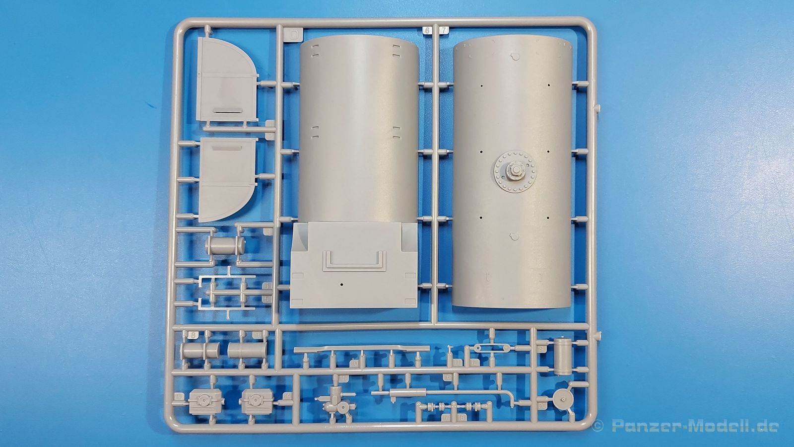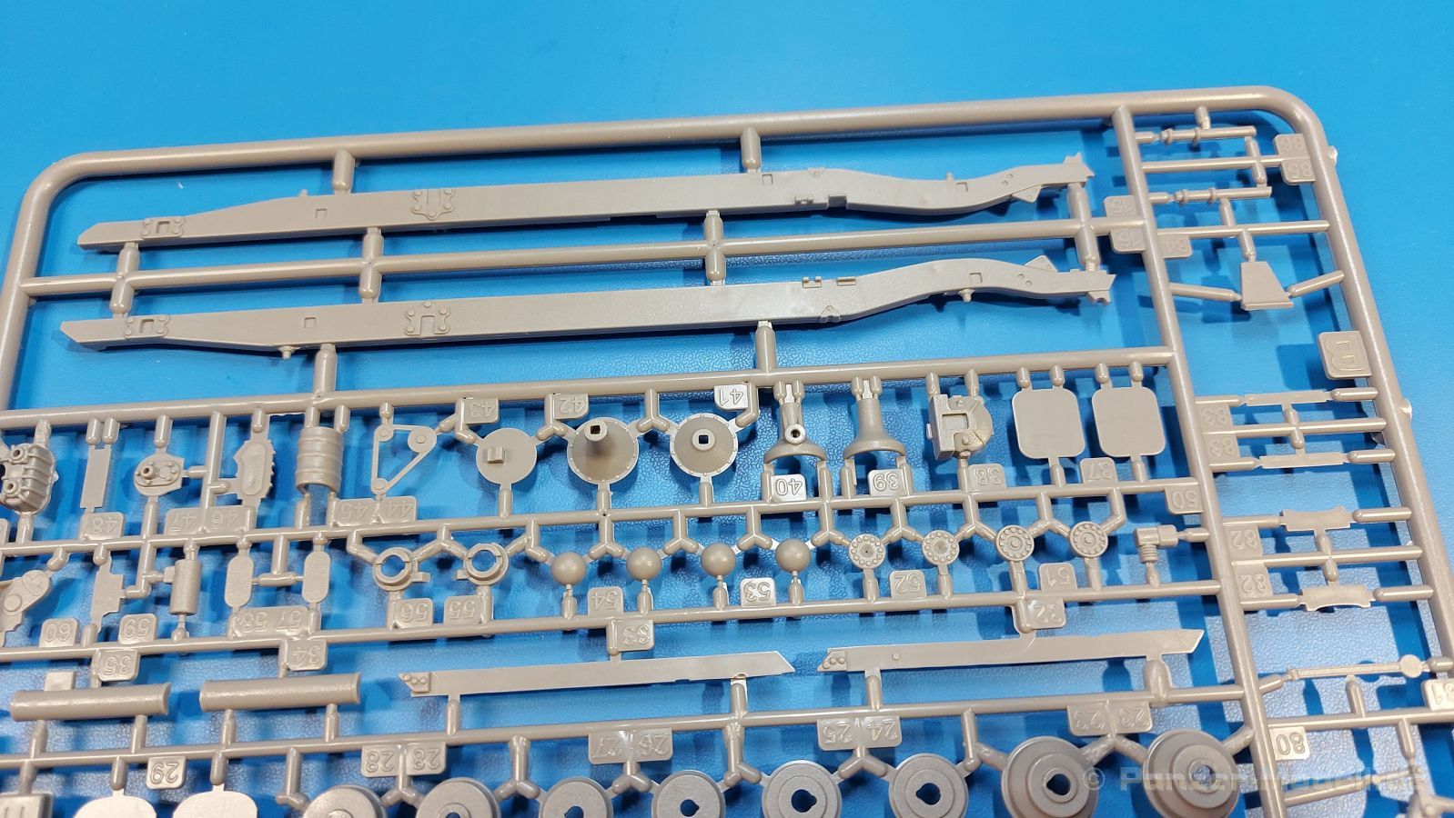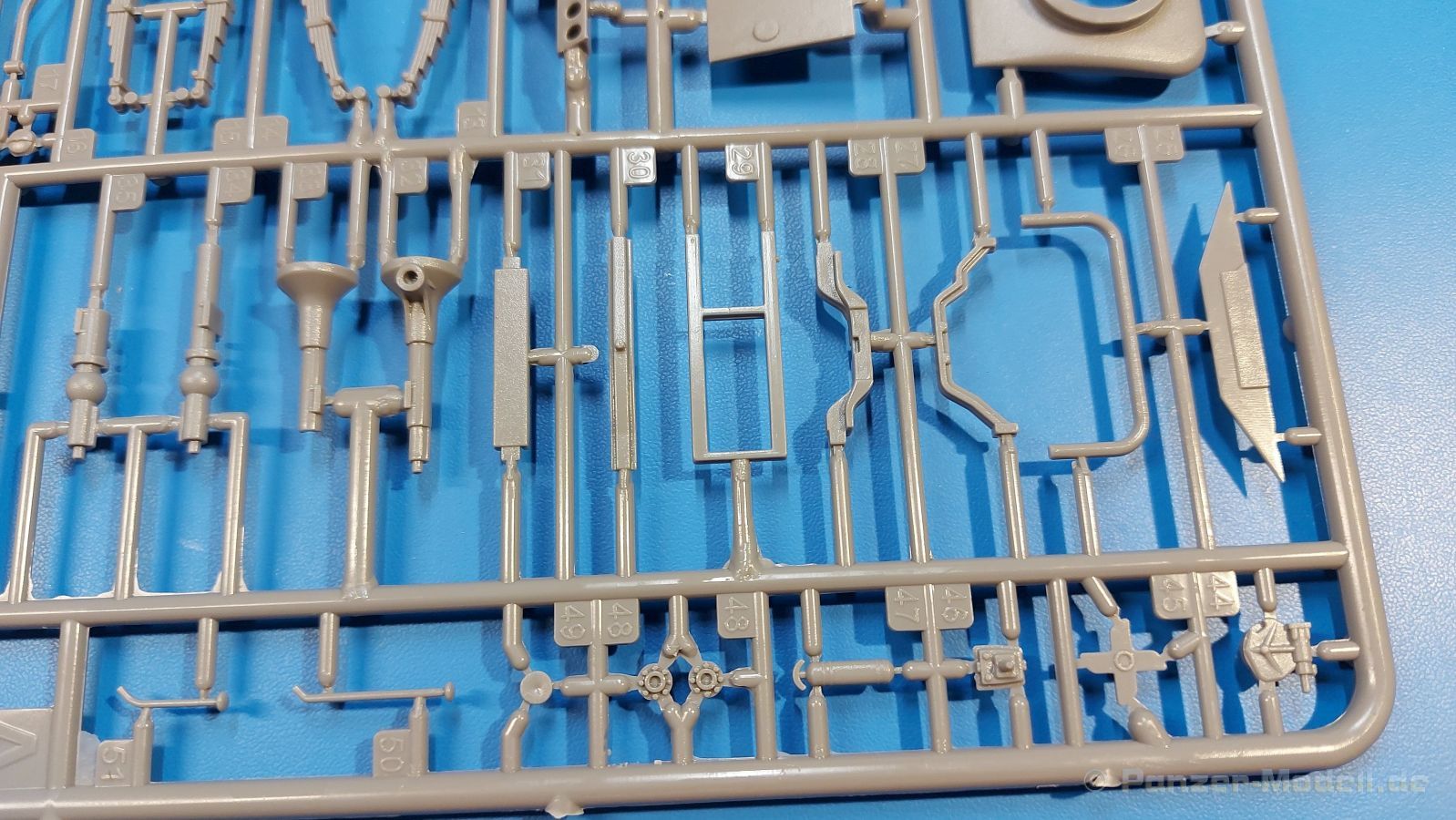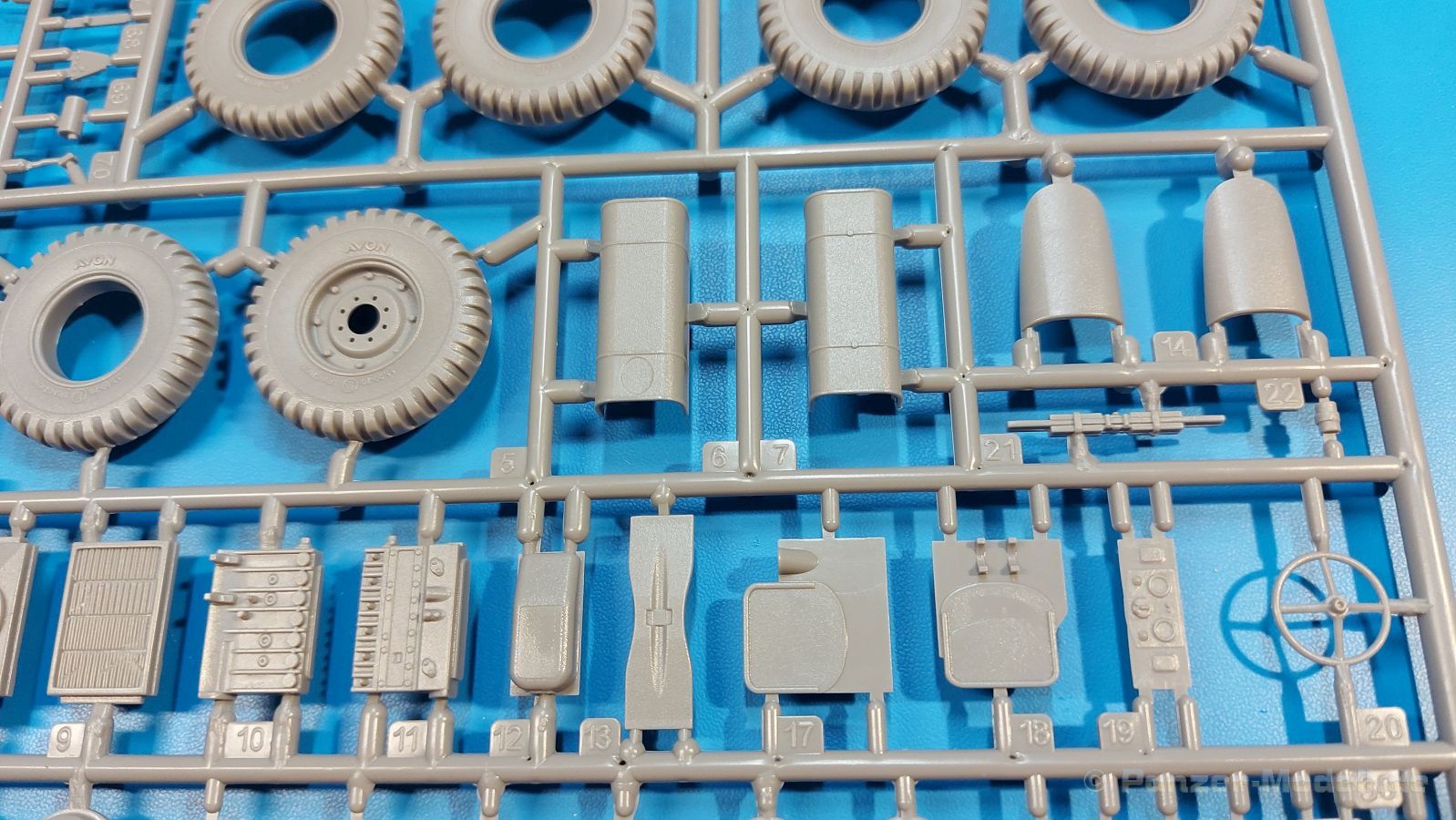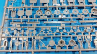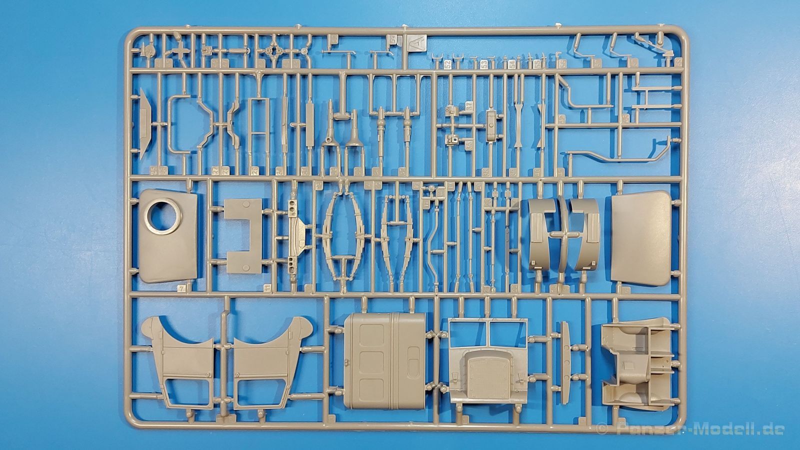 Das Original Der Bedford QL der gleichnamigen Firma Bedford gehörte zu einer Reihe von 3 to. Lkws, die zwischen 1941 und 1945 hergestellt und von den britischen Streitkräften im 2. Weltkrieg einsetzt wurden. Der QL Tanker war die Version eines Kraftstofftankfahrzeuges, welches hauptsächlich durch die Royal Air Force zum Betanken der Flugzeuge eingesetzt wurde. Der Tank fasste 950 Gallonen (ca. 4.319 Liter Umrechnung von britischen Gallonen in Liter). Der QL Tanker war natürlich auf Flugplätzen in England zu sehen, aber im Verlauf des Krieges auch näher an der Front wie z.B. in Belgien oder Italien. Der Bausatz: IBG Models führt seine Reihe des Bedford QL konsequent weiter und bringt als Nr. 5 einen QL Tankwagen auf den Markt. Im 405 x 258 x 60 mm großen Karton mit Stülpdeckel entdecken wir ein paar alte, bekannte und natürlich neue Spritzlinge. Insgesamt sind 9 graue Spritzlinge (Spritzlinge A und B sind bereits aus vorangegangenen Bedford QL Bausätzen von IBG bekannt.), 1 ebenfalls bekannter Klarsichtspritzling (Achtung: Ansicht in der Teileübersicht in der Bauanleitung entspricht nicht dem im Karton enthaltenen!), 1 PE-Platine, 1 Decalsheet und die Bauanleitung enthalten. Die Teile aus mittelgrauem Plastik sind größtenteils sauber ausgespritzt, ohne Grat und Versatz. Die Auswerfer sind meist auf den Spritzrahmen platziert. Leider finden sich an den Innenseiten der Blattfederpakete (Teile A13-A16), auf den Scheinwerfern (Teile B53, B54) und am Teil B72 Sinkstellen, die man außer bei den Scheinwerfern ggfs. ignorieren kann, weil sie am fertigen Modell nur schwer einzusehen sind. Die Klarsichtteile sind kristallklar ohne Kratzer oder Schlieren. Am Spritzling A finden wir die Hauptkomponenten des Fahrerhauses. Die Türen sind an den Seitenteilen fest angegossen. Innen sind die Fensterkurbeln bereits vorhanden, außen werden die Türgriffe noch angebracht. Aus den Klarsichtteilen werden nur die 2 Windschutzscheiben und die Türscheiben gebraucht. Bei den Türscheiben wurde auch das dreieckige Ausstellfenster bedacht. Man muss nur den Rahmen entsprechend in Fahrzeugfarbe bemalen. Das sehr gut getroffene Kühlergitter an der Frontseite ist auch fest eingegossen in die Front. Als Dach ist für den Tanker nur das geschlossene zu verwenden. Das ebenfalls vorhandene Dach mit der runden Öffnung wandert in die Ersatzteilkiste. Alle Pedale, Schalt- und Feststellbremshebel sind da und machen sich gut. Die Armaturentafel beim Original ist spartanisch eingerichtet, aber dennoch gut im Modell wiedergegeben. Der Feuerlöscher ist einfach gehalten, aber akzeptabel. Er verschwindet hinter dem Fahrersitz ohne weitere Aufmerksamkeit zu erregen. Bei den 3-teiligen Sitzen (Rückenlehne, Bodenplatte, Sitzpolster) gefällt mir die angeraute Oberfläche der Sitzpolster, die somit etwas Stoffstruktur wiedergeben. Der Fahrerhausboden hat die Motorabdeckung bereits integriert, so dass man den Motor nur zeigen könnte, wenn man das Fahrerhaus nicht festklebt. Die an den Ecken gerundeten, größeren Außenspiegel in der Form wie im Bausatz sieht man oft an restaurierten Fahrzeugen. Auf Fotos aus den 40 Jahren sind sie eher kleiner und viereckig. Auf den Kotflügeln des Fahrerhauses befinden sich Trittstufen mit feiner Antirutschriffelung. Zum ersten Mal ist eine PE-Platine im Bausatz, die auch das oft gesehene Gasdetektorblech samt Halterungen enthält. Auch ein großes Unterbodenblech, vermutlich um Motorwärme vom Tank fernzuhalten, ist dabei. Der Leiterrahmen besteht aus mehreren Längs- und Querträgern. Der 6-Zylinder Benzinmotor ist mit allen wichtigen Bauelementen (Motorblock, Zylinderkopf, Ölwanne, Anlasser, Generator, Vergaser, Zuluft-, Abgaskrümmer, Keilriemenscheiben mit Keilriemen, Lüfterpropeller) wiedergegeben. Kupplungsgehäuse und Schaltgetriebe schließen an den Motor an. Separate Kardanwellen werden zwischen Schalt- und Verteilergetriebe angebaut. Von dort zu Vorder- und Hinterachse. Die Gelenkköpfe der Kardanwellen kommen gut zur Geltung. Die Achsen sind mehrteilig ausgeführt, sollten sich aber problemlos gerade bauen lassen. Die Auslegung der Teile der Vorderachse lassen vermuten, dass ein Lenkeinschlag modellseitig nicht vorgesehen ist, aber es sind alle Teile des Lenkgestänges, Lenkgetriebe etc dabei. Die Federpakete der Blattfedern sind gut dargestellt, wären da nicht die Sinkstellen auf den Innenseiten. Die Federdämpfer der beiden Achsen sind sauber ausgearbeitet. Ein Auspuffrohr führt vom Abgaskrümmer zum 2-teiligen Schalldämpfer, der im linken Rahmenlängsträger verbaut wird. Das dort anzubringende Auspuffendrohr ist am Ende angeschrägt, aber leider nicht aufgebohrt. Für die linke Seite des Rahmens gibt es noch einen großen Staukasten unterhalb des Fahrzeugtanks, auf der rechten Seite den Druckluftbehälter für die Bremsen. Hinter dem Fahrerhaus wird ein 12-teiliges Gestell aufgebaut, dass sowohl den Kraftstofftank des Fahrzeugs als auch das Ersatzrad aufnimmt. Die Felgenlöcher sind des Ersatzrades durchbrochen (also ohne Schrauben), wie es sich gehört. Sowohl Ersatzrad als auch die vier anderen Räder tragen erhabene Hersteller- (AVON - Anmerkung: Bei den AVON Reifen scheint es sich gemäß anderer Quelle um Nachkriegsreifen zu handeln!) und Reifengrößenaufschriften (11.00-20). Die Radschrauben sind gut wiedergegeben. Als Fünfter im Bunde der IBG Bedford QL zeichnet sich der Tanker natürlich durch seinen Tankaufbau aus. Am Auffälligsten sind die große Unter- und Oberschale des Tanks. Zur Befestigung am Fahrzeugrahmen werden an der Unterschale vier Träger, jeder aus 4 Teilen bestehend, angebracht. Diese Träger nehmen auch beidseitig die Laufroste auf. Die hinteren Kotflügel werden mit dem Tank, nicht mit dem Rahmen verbunden. Zwei Gestelle aus PE nehmen insgesamt 4 Trichter (ebenfalls aus PE) auf. Die Stutzen der Trichter sind aus Plastik. Mein erster Gedanke war, dass ich diese beim Bau dann wohl aufbohren müsste, aber auf Originalfotos kann man se