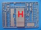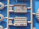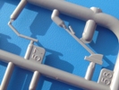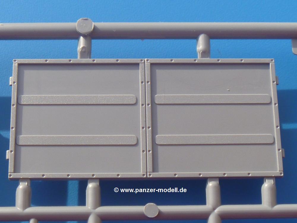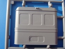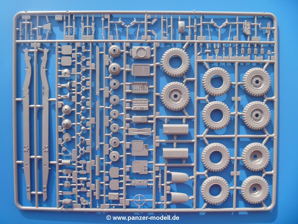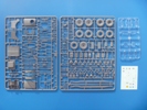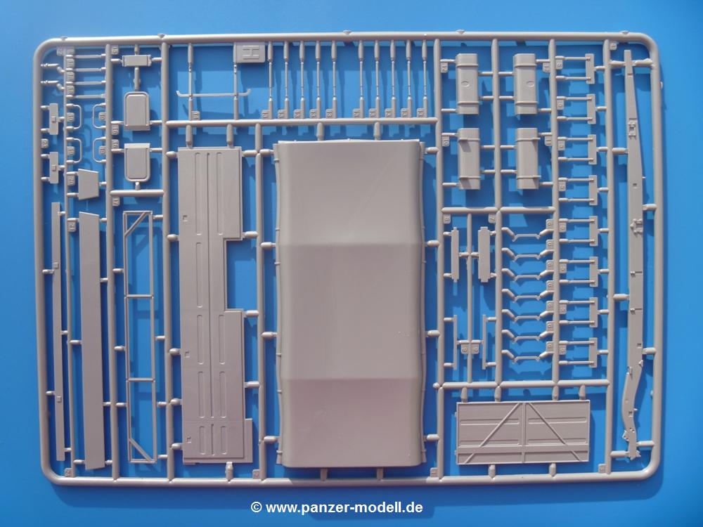 Was den QL zum QLT (Troop Carrier - Truppentransporter) macht, finden wir an den Spritzlingen G und H. Als Ersatz für die nicht benötigten Längsträger des Spritzlings B gibt es hier die verlängerte Version. Der Pritschenboden besteht aus einem großen Stück mit Hinterradkästen und Querträgern bereit s angegossen, welches einem einige Arbeit spart, ohne die Detailtreue zu vermindern. Auch die Seitenteile bestehen (leider) aus einem Stück, denn die Seitentüren sind geschlossen angegossen. Gleiches gilt für die zweiflügelige Hecktür, aber hier kann man mit einem geschickten Schnitt die Türen trennen und ggfs. geöffnet anbauen. Die beiden seitlichen Sitzbänke bestehen aus der einteiligen Sitzfläche, einem ebensolchen Rückenpolster, das an die Seitenwand geklebt wird und 4 Stützstreben. Für die kleinen Seitentüren gibt es Extrasitze, Polster und Stützen. Die lange Mittelsitzbank wird interessant durch die versetzte Anordnung der Rückenlehnen. Man wird beim Bau sicherlich aufpassen müssen, die Rückenlehnen im richtigen Winkel und gleichmäßig auf die Sitzfläche zu bekommen. Ebenso groß wie der Pritschenboden ist die Plane. Sie besteht eigentlich nur aus dem Dach mit hochgerollten Seitenplanen, wie es wohl oft im Einsatz üblich war. Das Dach ist sehr glatt ohne Stoffstruktur und ruht auf 8 dünnen Streben. Der Pritschenboden erhält noch die Schmutzfänger mit ihren Stützstreben für die Hinterräder und Trittstufen für die Seitentüren und 2 weitere für das Heck. Dazu kommt die Ersatzradhalterung (mit dem Ersatzrad), ein großer Staukasten und links und rechts je eine Kanisterhalterung für je 2 Kanister (die leider nicht zum Umfang des Bausatzes gehören). Statt des einen Kraftstofftanks zwischen Fahrerhaus und Pritsche hat der QLT zwei Tanks, die sich links und rechts unter der Pritsche am Rahmen wiederfinden.