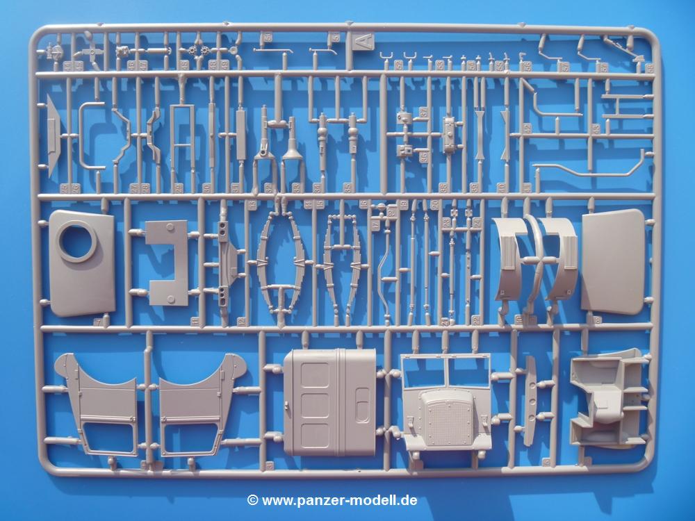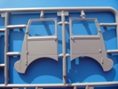 Die Hauptkomponenten des Fahrerhauses finden wir am Spritzling A. Die Türen sind an den Seitenteilen fest angegossen. Das gleiche gilt für das Kühlergitter an der Frontseite. Es sieht gut aus, aber hier hätte dem QLT doch ein Ätzteilgitter besser zu Gesicht gestanden. Als Dach ist für den QLT nur das mit der runden Öffnung vorgesehen, auch wenn das geschlossene Dach auch vorhanden ist.