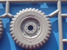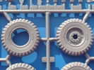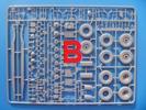 Die auffälligsten Teile am Spritzling B sind die Radhälften. Eine Hälfte jeweils mit, die andere Hälfte ohne die Felge. Besondere Hingucker sind die Aufdrucke wie z.B. Hersteller "AVON" und Größenangaben "11.00-20" etc. Die Schrauben sind sauber gestaltet. Beim Ersatzrad sind die Schraubenlöcher bereits aufgebohrt. Die beiden Rahmenlängsträger und der große Tank an diesem Spritzling werden nicht gebraucht. Die Federdämpfer der Vorderachse (B73, B74) bestehen aus 2 aneinanderhängenden Zylindern mit einem langen Hebelarm und sind sauber ausgearbeitet. Die Zwillingsbrüder (B79, B80) an der Hinterachse mit dem kürzeren Hebelarm weisen leider an der Nahtstelle zwischen den beiden Zylindern grad an der Außenseite leichte, aber nicht zu übersehende Sinkstellen auf. Die meisten Teile des Motors, der Kupplung, des Kühlers und Teile des Schaltgetriebes sind hier zu finden. Sauber und schön gestaltet ist es schade, das alles unter dem Fahrerhaus verschwinden zu lassen. Der Fahrerhausboden ist leider einteilig und erlaubt eine Wartungsszene nicht.