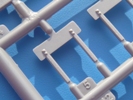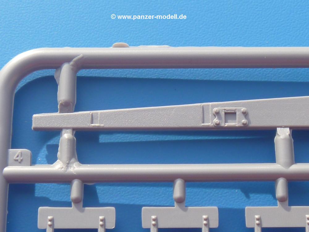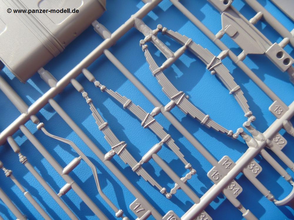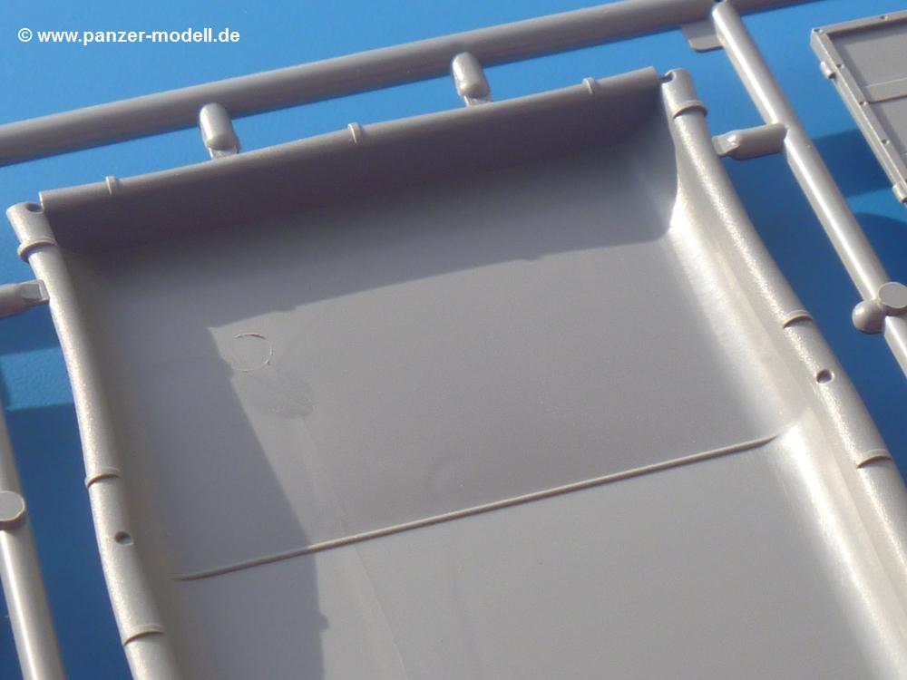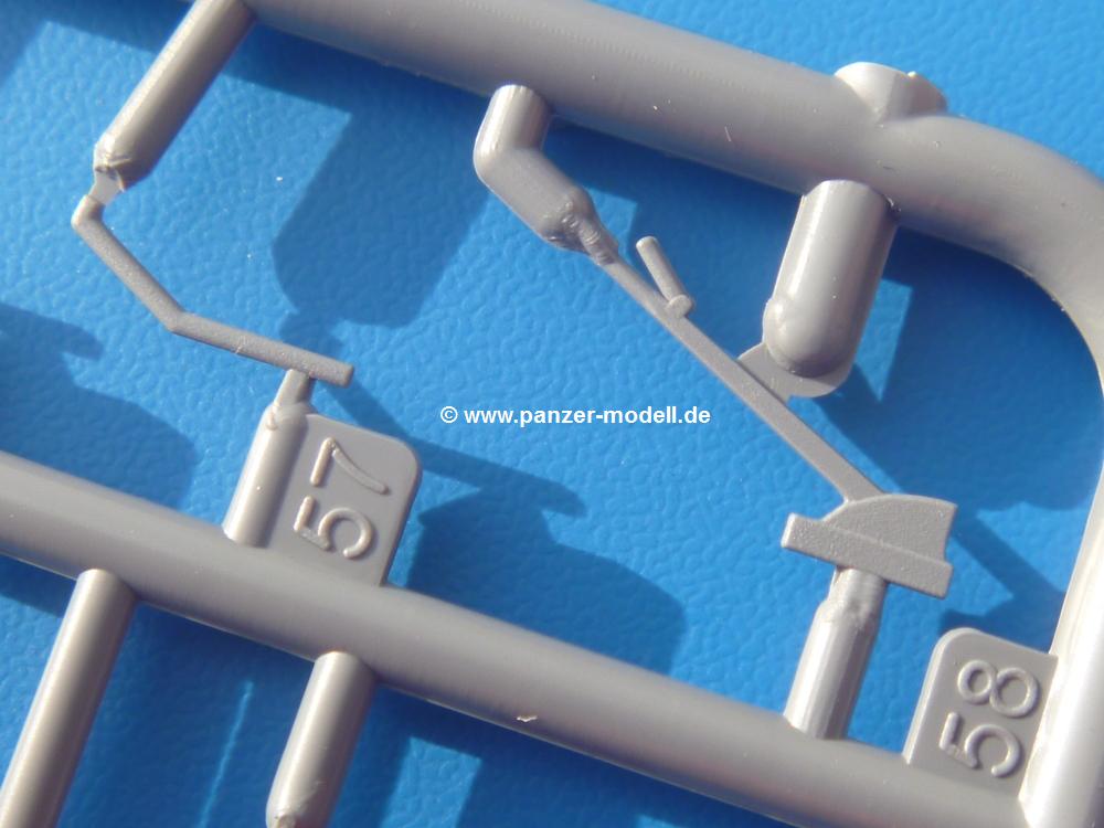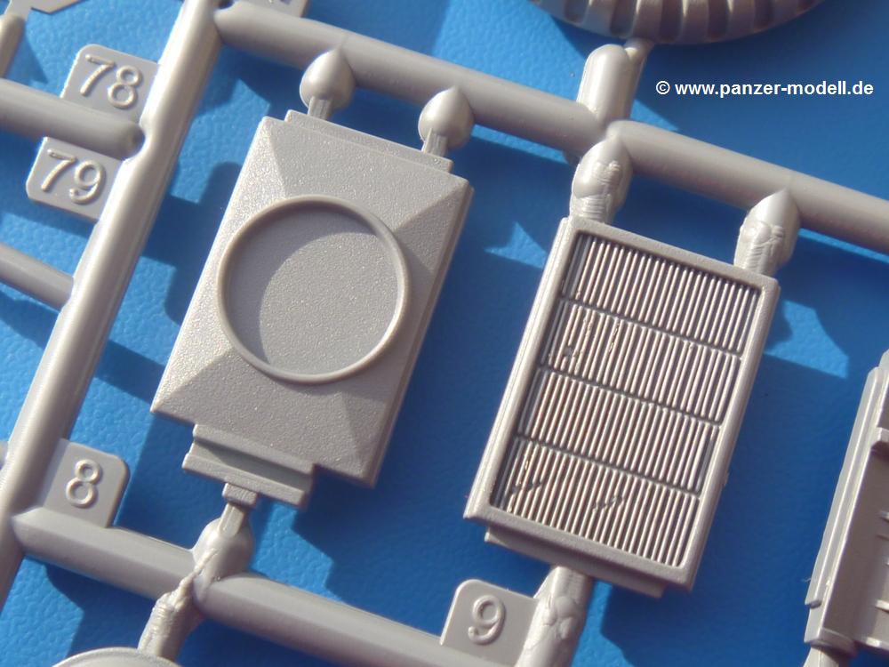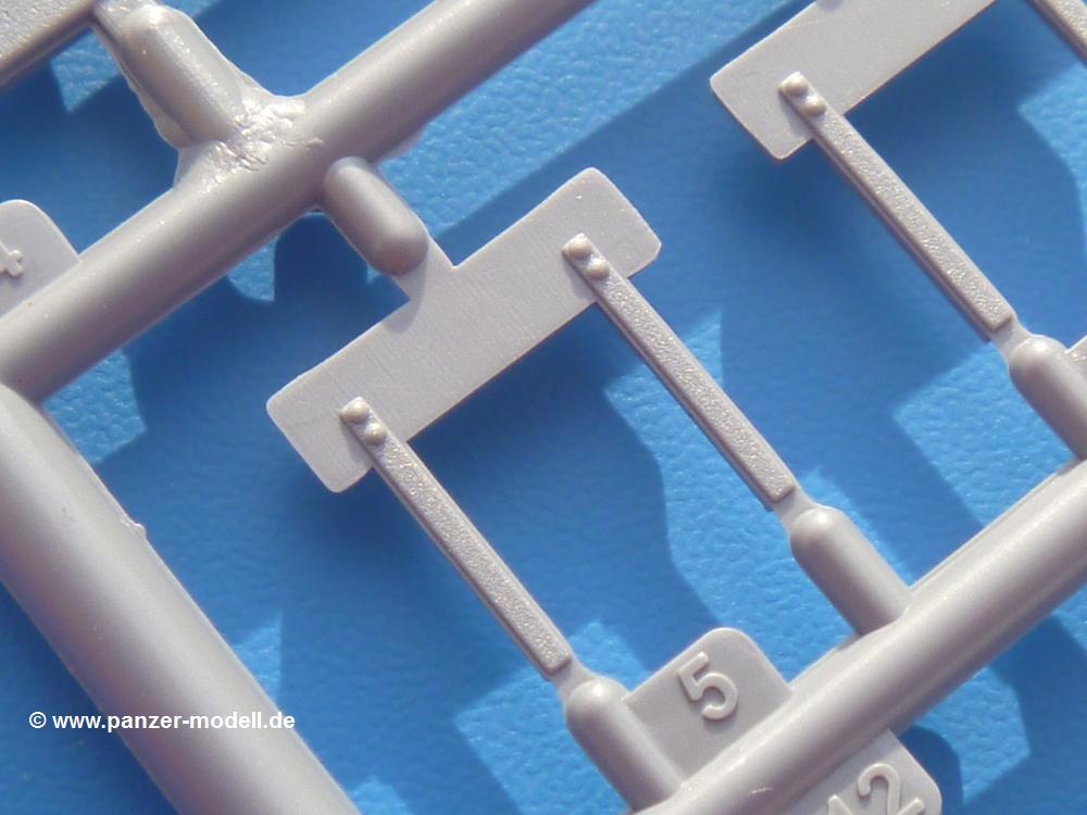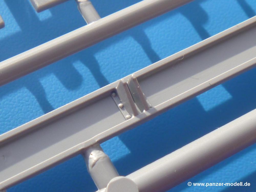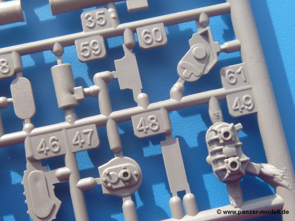 Die Teile aus mittelgrauem Plastik sind sauber ausgespritzt, ohne Grat und Versatz. Die Auswerfer sind meist auf den Spritzrahmen platziert. Einige wenige sind auf Teilen zu finden, aber so platziert, dass sie auch ohne Verspachteln nach dem Zusammenbau nicht mehr stören würden. An den Teilen B79 und B80 sind leichte Sinkstellen zu sehen.