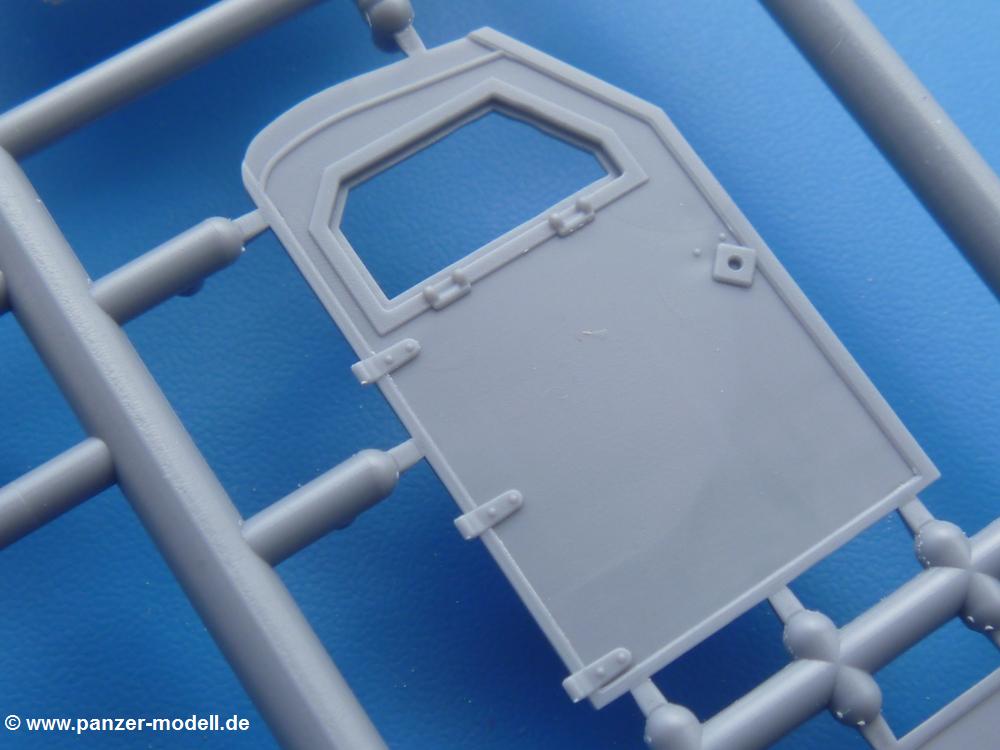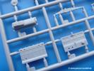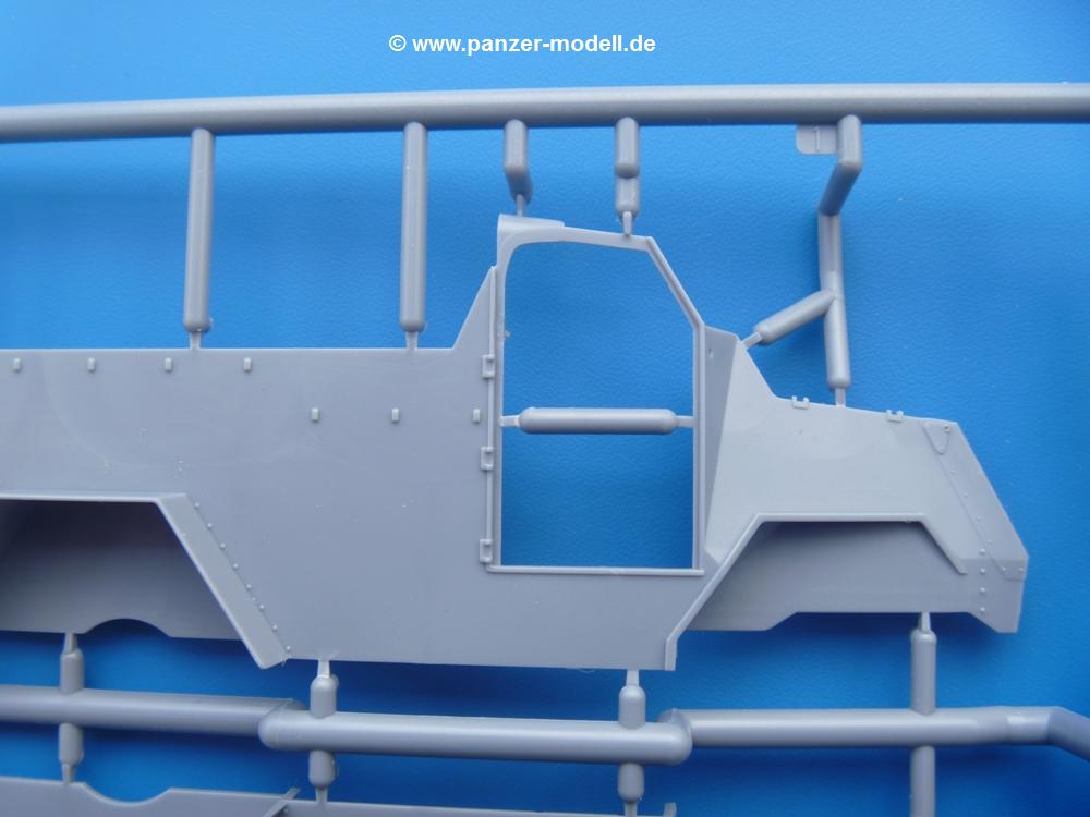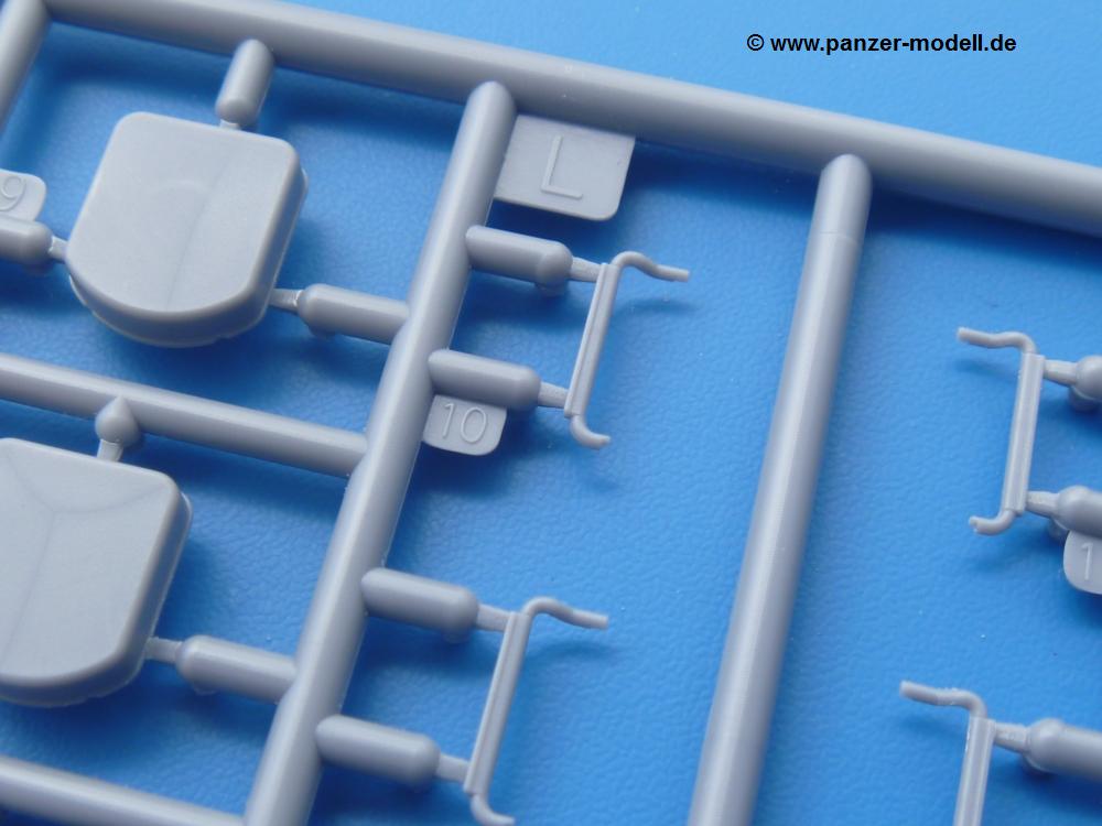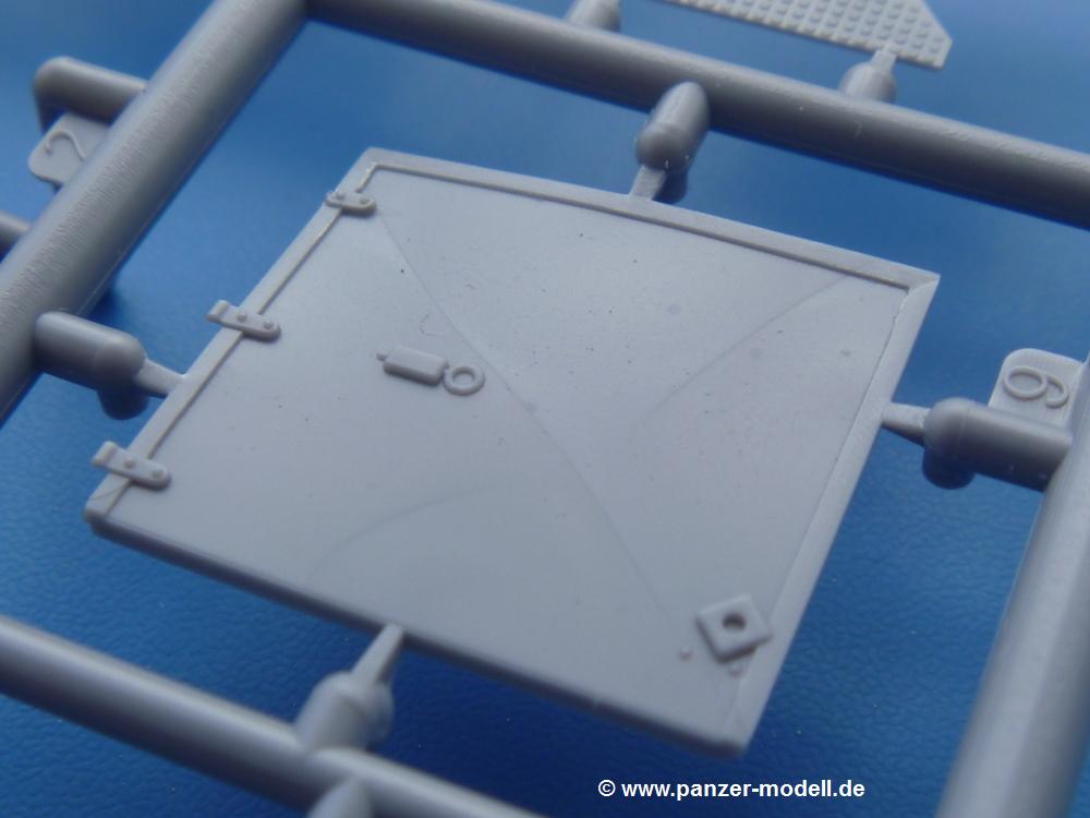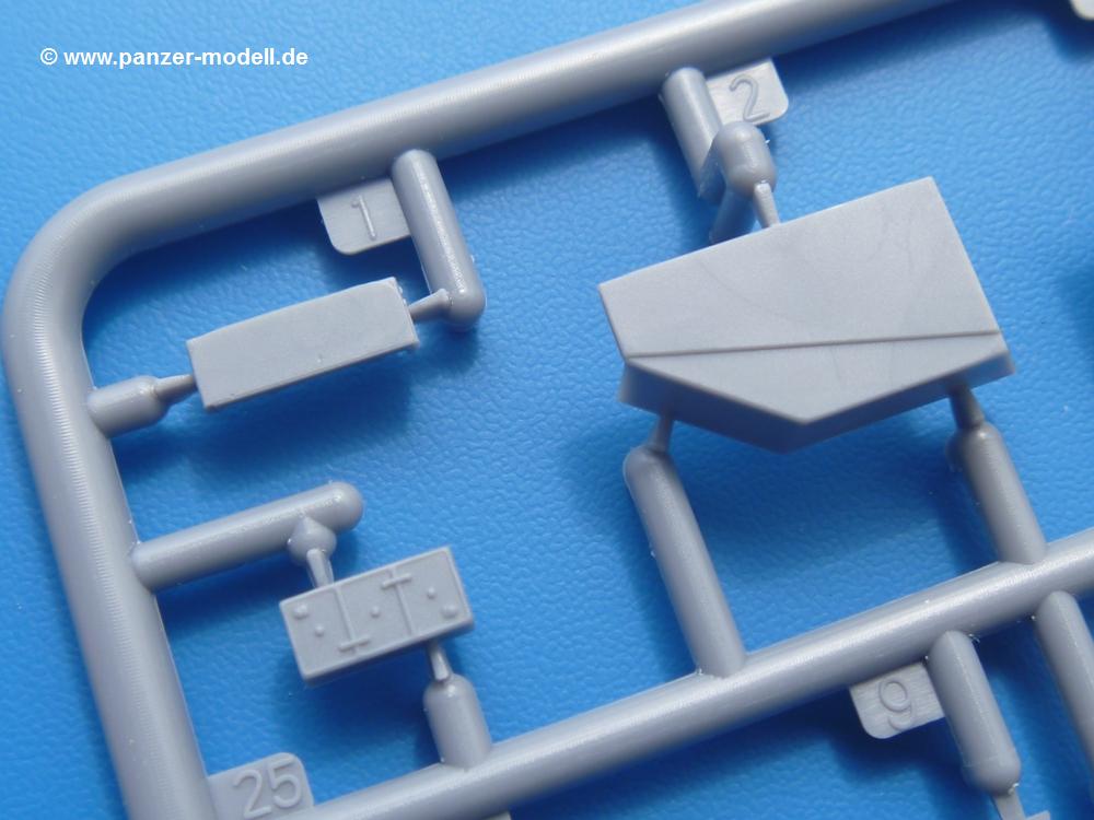 Die Teile aus mittelgrauem Plastik sind sauber ausgespritzt, ohne Grat und Versatz. Die Auswerfer sind meist auf den Spritzrahmen platziert. Einige wenige sind auf Teilen zu finden, aber so platziert, dass sie auch ohne Verspachteln nach dem Zusammenbau nicht mehr stören würden. Die innere Spannung einzelner Spritzlinge hat zum Verbiegen der Hecktür (H9) und des Fensterrahmens der Fahrerhausfront (I8) geführt, welches aber zu beheben sein wird.