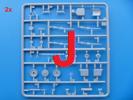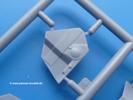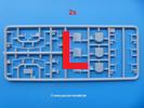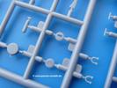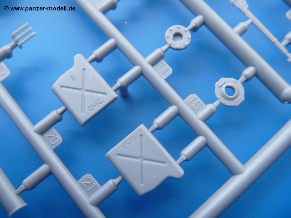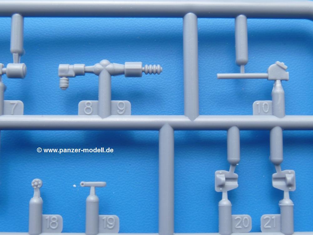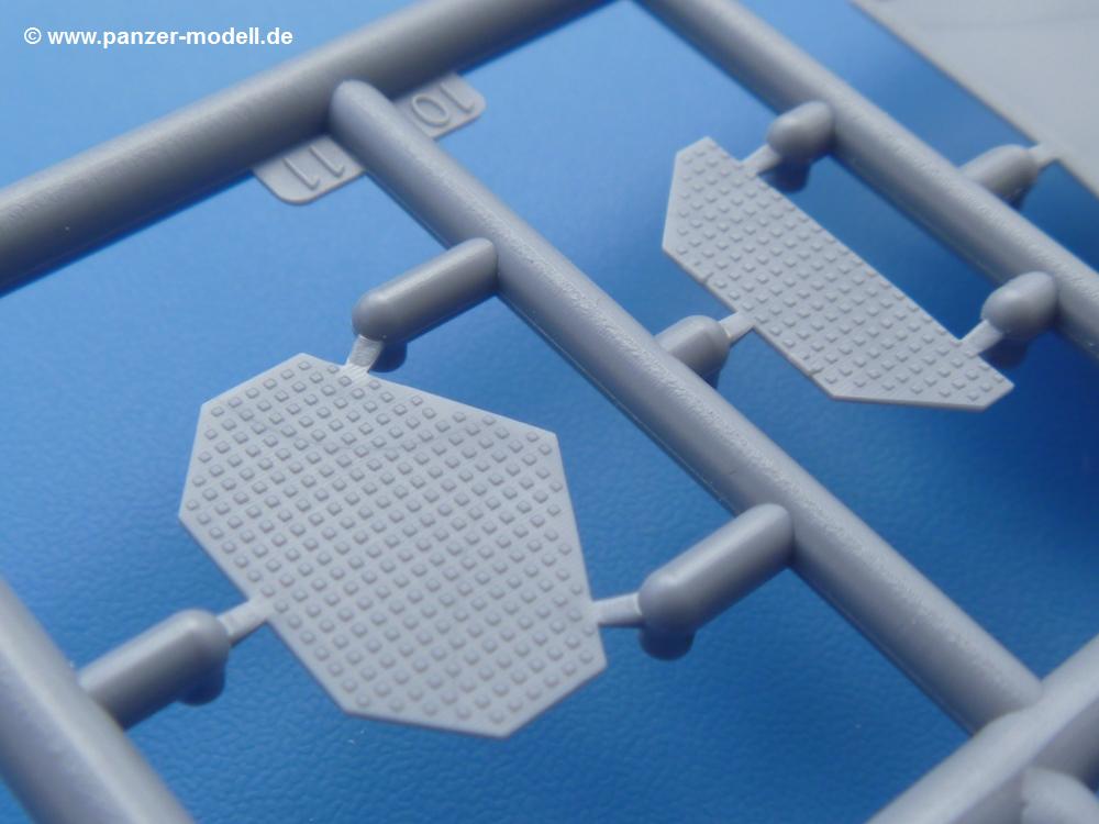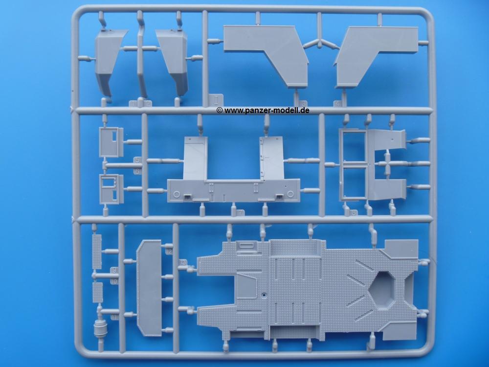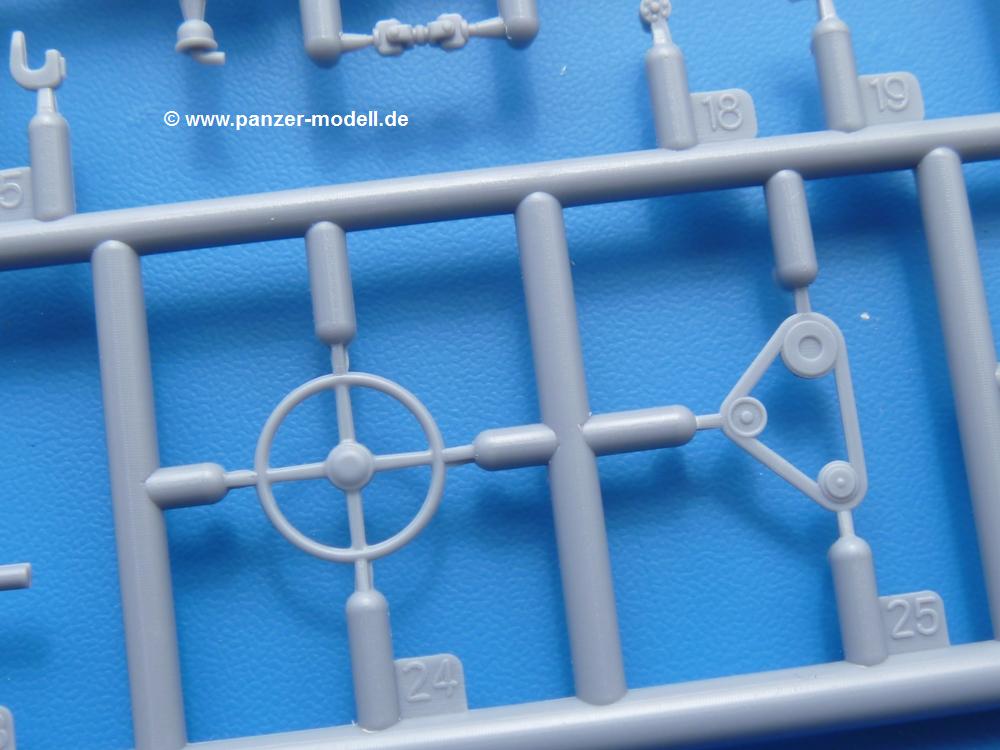 Die Teile aus mittelgrauem Plastik sind sauber ausgespritzt, ohne Grat und Versatz. Die Auswerfer sind meist auf den Spritzrahmen platziert. Einige wenige sind auf Teilen zu finden, aber so platziert, dass sie auch ohne Verspachteln nach dem Zusammenbau nicht mehr stören würden. Die innere Spannung einzelner Spritzlinge hat zum Verbiegen der Hecktür (H9) und des Fensterrahmens der Fahrerhausfront (I8) geführt, welches aber zu beheben sein wird.