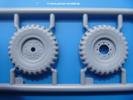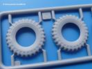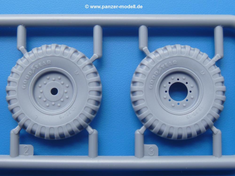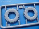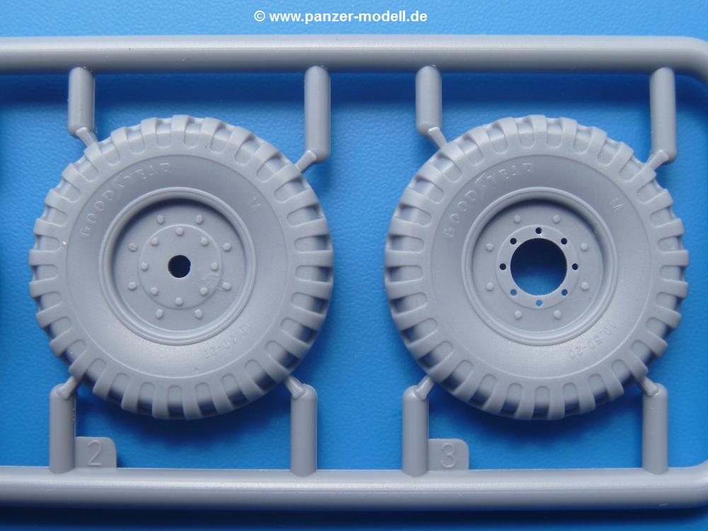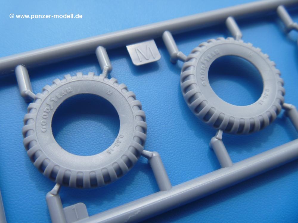 Fahrgestell: Wie heutezutage bei Lkw Modellen meist üblich besteht der Rahmen aus separaten Längs- und Querträgern. Der Aufbau der Teile hinterlässt den Eindruck, dass auch ein Anfänger einen verzugsfreien Rahmen hinbekommt. Die Blattfedern sind schön strukturiert. Der Allradantrieb mit geteilten Achsen, einzelnen Kardanwellen und Getriebe ist toll detailliert. Sämtliche Lenkgestänge der Vorderachse sind dabei. Der Minuspunkt ist, dass man die Räder nur in Geradeausstellung montieren kann. Die Differentialgehäuse erhalten Schutzbleche aus PE-Teilen. Die für den Bausatz benötigten Räder befinden sich am Spritzling N. Jedes Rad besteht aus 2 Hälften. Sehr schön der hervorgehobene Herstelleraufdruck, die Rad-/Felgengröße (Goodyear 10.50-16), das Profil und die Verschraubungen. Es liegen auch noch andere Radspritzlinge mit kleineren (M) und größeren (O) Rädern bei, die laut Bauanleitung aber keine Verwendung finden.