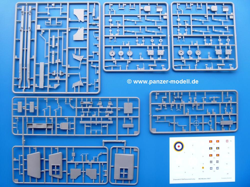 Das Original: CMP (Canadian Military Pattern) Lkws waren nach britischen Spezifikationen in großen Stückzahlen in Kanada hergestellte Lastkraftwagen, die für den Gebrauch durch Commonwealth Armeen und deren Verbündete bestimmt waren. Der CMP C15A war ein Allrad-Lkw mit einer Ladekapazität von ca. 750 kg (15 cwt). Im Design dem Ford 15 cwt gleich, hatte der Chevrolet einen 85 PS (63 kW) 6-Zylinder Reihenmotor mit einem Hubraum von 3,5 Litern, mit dem er 80 km/h erreichen konnte. Es gab ihn in vielen verschiedenen Varianten wie z.B. als Transporter, Tankfahrzeug und Waffenplattform. Im Laufe der Produktion bekam er auch verschiedene Fahrerkabinen (Cab), die ihm ein recht unterschiedliches Aussehen gaben. Er wurde auf fast allen Kriegsschauplätzen im 2. Weltkrieg eingesetzt und auch von den Achsenmächten als Beutefahrzeug eingesetzt und modifiziert. Der Bausatz: Aus IBGs Reihe von britischen Fahrzeugen erreichte uns diesmal der Chevrolet C15A als variantenreicher Bausatz.Im Karton befinden sich 16 graue, ein klarer Spritzling und die Ladeflächenplane. Dazu kommen 2 PE-Platinen, Decals und die Bauanleitung.