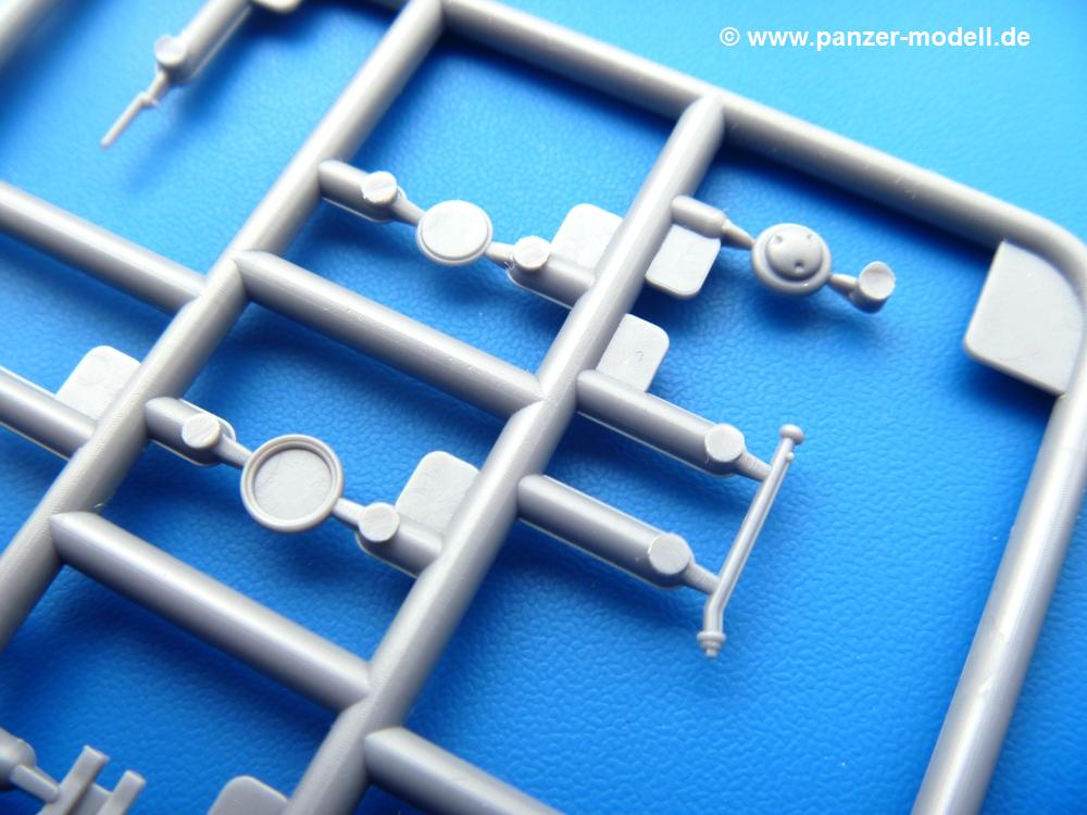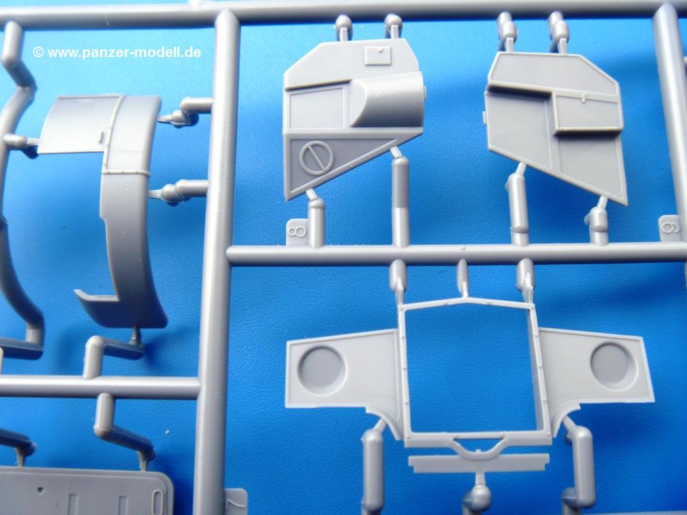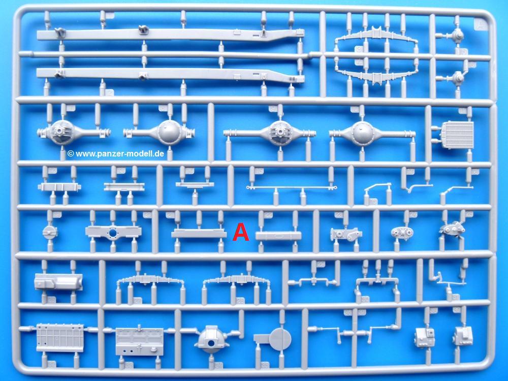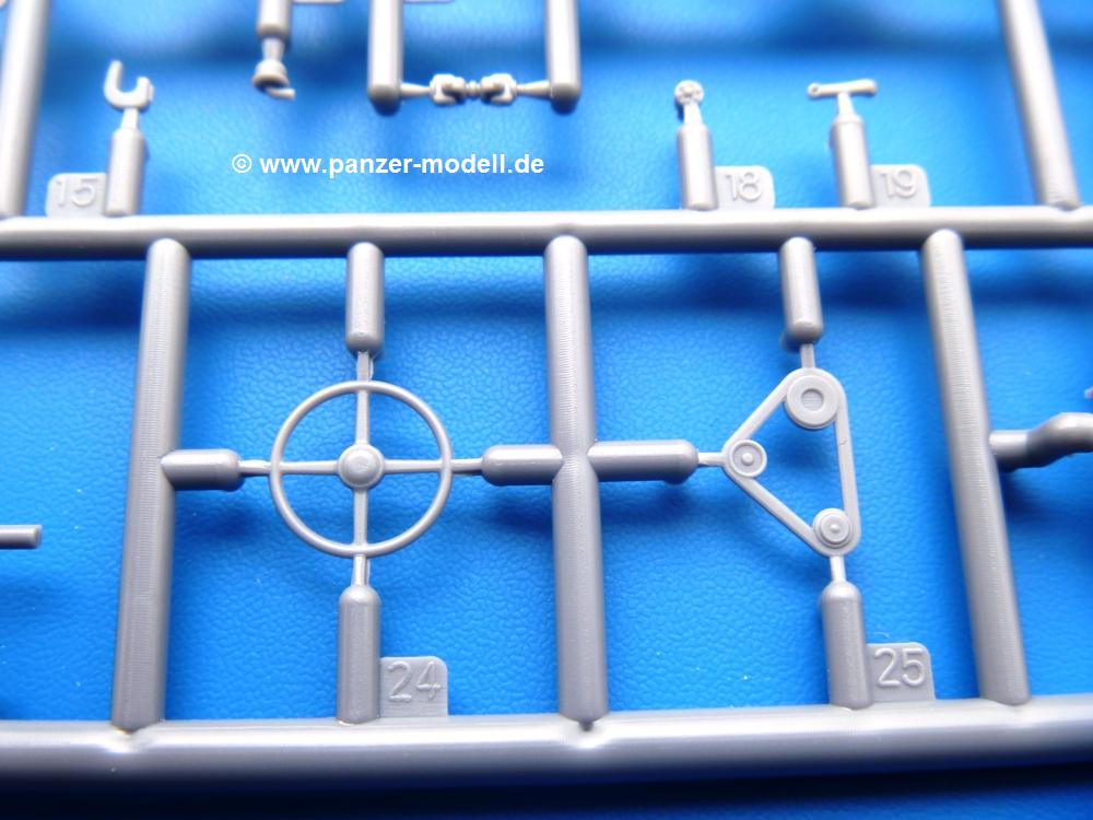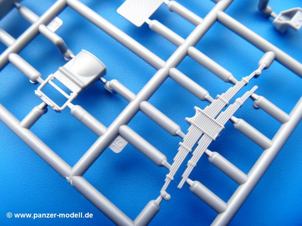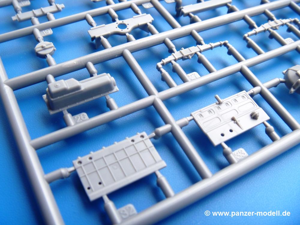 Die Teile aus mittelgrauem Plastik sind sauber ausgespritzt, ohne Grat und Versatz. Die Auswerfer sind meist auf den Spritzrahmen platziert. Einige wenige sind auf Teilen zu finden, aber so platziert, dass sie auch ohne Verspachteln nach dem Zusammenbau nicht mehr stören würden.Fahrgestell: Wie heutzutage bei Lkw Modellen meist üblich besteht der Rahmen aus separaten Längs- und Querträgern. Der Aufbau der Teile hinterlässt den Eindruck, dass auch ein Anfänger einen verzugsfreien Rahmen hinbekommt. Die Blattfedern sind schön strukturiert. Der Allradantrieb mit geteilten Achsen, einzelnen Kardanwellen und Getriebe ist toll detailliert. Sämtliche Lenkgestänge der Vorderachse sind dabei. Der Minuspunkt ist, dass man die Räder nur in Geradeausstellung montieren kann. Jedes Rad besteht aus 2 Hälften. Sehr schön der hervorgehobene Herstelleraufdruck, die Rad-/Felgengröße (Goodyear 9.00-15), das Profil und die Verschraubungen. Am Rahmen finde Tanks mit langen Einfüllstutzen Platz. Auch die Trittbleche für's Fahrerhaus werden am Rahmen befestigt. Hier muss man darauf achten, dass das rechte Blech zwischen Cab 12 und 13 abweicht, während das linke bei beiden gleich ist. Zwischen Fahrerhaus und Ladefläche sitzt ein großer Staukasten mit Halterung für das Ersatzrad quer auf dem Rahmen. Die Staukastenklappen lassen sich offen oder geschlossen bauen.Motor: Der Motor weist viele Einzelteile und somit Details auf. Lichtmaschine, Zündspule, Luftfilter, Keilriemen, Lüfterrad usw. Wenn man den Motor zeigen möchte, sollte man die Motorhaube offen lassen, was zum Glück möglich ist. Der Auspuff ist mehrteilig ausgelegt, welches hoffentlich die Anbringung erleichtert.Fahrerhaus: Der Bausatz enthält Bauteile für 2x 2 Fahrerhäuser. Man hat die Wahl zwischen Cab 12 und Cab 13. Und jede dieser Versionen kann wahlweise mit geschlossenem Dach oder mit Dach mit einer Dachluke gebaut werden. Alle Sitze bestehen aus je 2 Bodenschienen, Sitzpolster und Rückenlehnen. Die Sitzpolster sind mir etwas zu glatt. Ein wenig Struktur wäre schön gewesen. Der Fahrer muss kein Bedienelement vermissen - Gas-, Brems-, Kupplungspedal, Schalt-, Allrad-, Handbremshebel, Lenkstange, Lenkrad, Armaturentafel - alles da, aber man vermisst etwas die Decals für die Armaturen. Feuerlöscher und die Karabiner der Besatzung finden auch ihren Platz im Fahrerhaus. Die Motorhaube(n) liegen als separate Teile bei. Man kann also einen Blick auf den Motor ermöglichen, nur muss man sich für die Scharniere selbst etwas einfallen lassen. Für die Kühlergrills gibt es schöne PE-Teile. Beim Cab 13 Grill sind Chevrolet Logo mit Schriftzug gut gestaltet. Für die Frontscheiben gibt es kratzer- und schlierenfreie Klarsichtteile. An Scheibenwischer in Form von PE-Teilen wurde auch gedacht.Ladefläche: Hier hat die Wahl zwischen 2, bzw. 3 Gestaltungsmöglichkeiten - mit Plane oder nur mit Spriegel. Lässt man die Spriegel weg und verspachtelt die Löcher für die Verbindungszapfen, hat man die 3. Möglichkeit. Die Bodenplatte mit den Längsbrettern ist für alle gleich. Rahmenaufsatzbalken, 4 Staukästen, teils mit separaten Klappen, und die hinteren Schmutzfänger gestalten die Unterseite.Entscheidet man sich für die Spriegel Version, bringt man Seiten-, Frontteile und die Heckklappe an. Letztere kann man auch heruntergeklappt anbauen. Dann folgen noch 2 Doppelsitzpolster auf den Radkästen. Die Spriegel besten aus 3 U-förmigen, sehr feinen Stangen. Vorsicht beim Abtrennen vom Spritzling! Dazu kommen noch 4 ebenso feine Stabilisierungsstangen.Bei der Planenversion bringt man nur die Sitzpolster auf den Radkästen an, dann folgt schon die Plane aus einem Stück, bei der Seiten- und Frontteile integriert sind. Die Plane ist trotz dünnem Material stabil. Innen sind die Spriegel angedeutet, aussen ist ein leichter, aber glaubhafter Faltenwurf vorhanden. Auch an die Zurrseile wurde gedacht. Die Heckklappe kann offen oder geschlossen gebaut werden.Gemäß Anleitung kann man mit den Decals 3 Fahrzeuge darstellen: