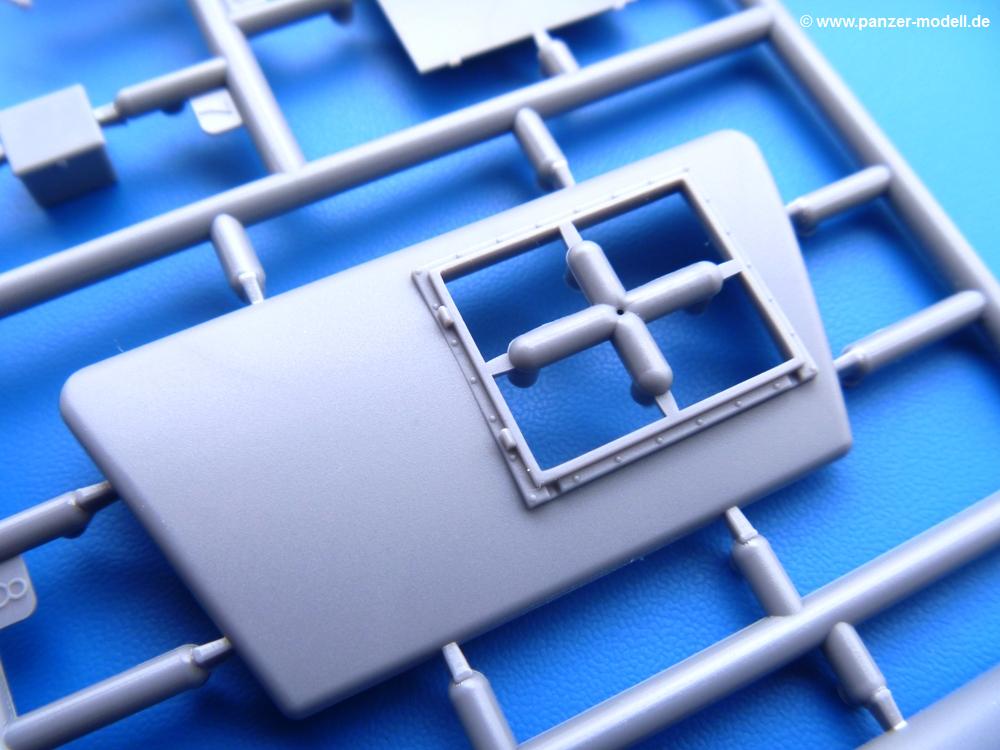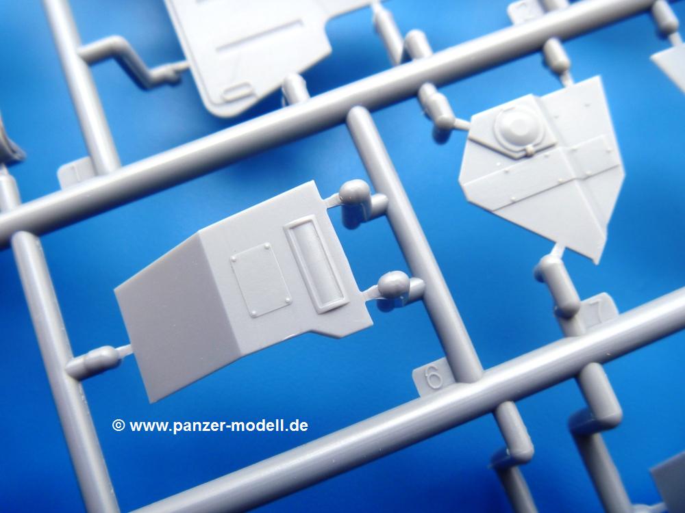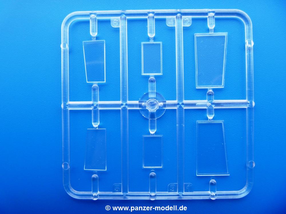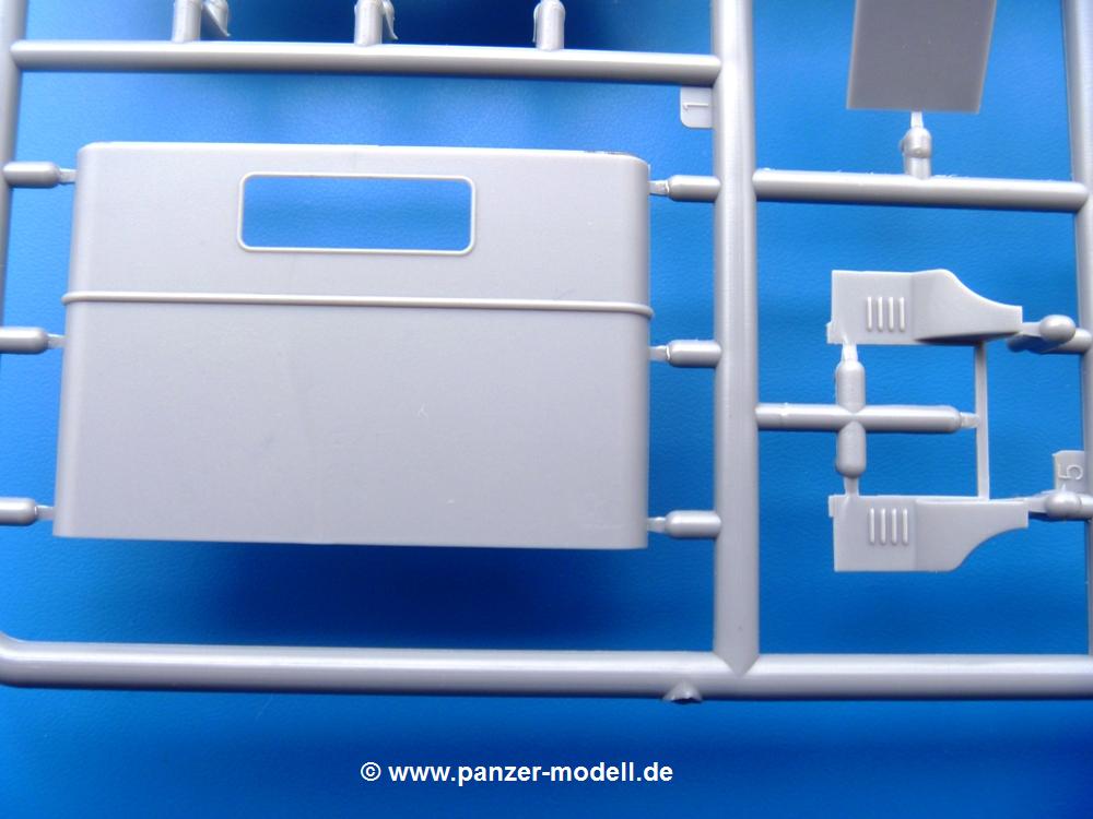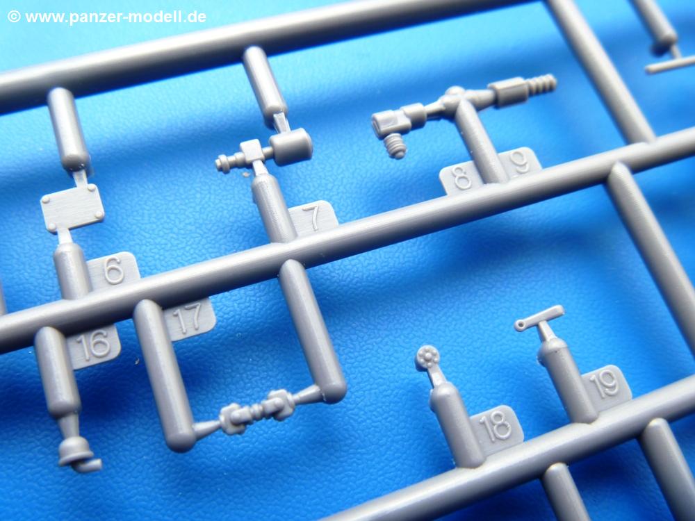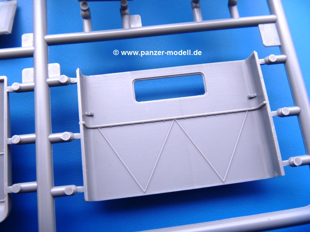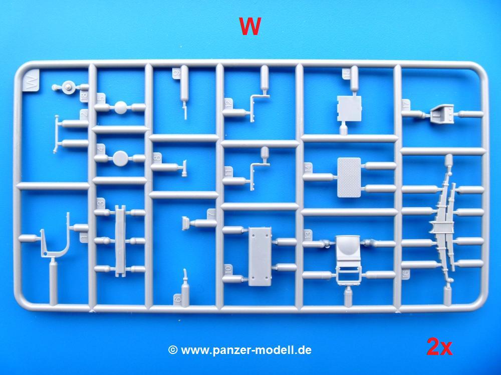Die Teile aus mittelgrauem Plastik sind sauber ausgespritzt, ohne Grat und Versatz. Die Auswerfer sind meist auf den Spritzrahmen platziert. Einige wenige sind auf Teilen zu finden, aber so platziert, dass sie auch ohne Verspachteln nach dem Zusammenbau nicht mehr stören würden.Fahrgestell: Wie heutzutage bei Lkw Modellen meist üblich besteht der Rahmen aus separaten Längs- und Querträgern. Der Aufbau der Teile hinterlässt den Eindruck, dass auch ein Anfänger einen verzugsfreien Rahmen hinbekommt. Die Blattfedern sind schön strukturiert. Der Allradantrieb mit geteilten Achsen, einzelnen Kardanwellen und Getriebe ist toll detailliert. Sämtliche Lenkgestänge der Vorderachse sind dabei. Der Minuspunkt ist, dass man die Räder nur in Geradeausstellung montieren kann. Jedes Rad besteht aus 2 Hälften. Sehr schön der hervorgehobene Herstelleraufdruck, die Rad-/Felgengröße (Goodyear 9.00-15), das Profil und die Verschraubungen. Am Rahmen finde Tanks mit langen Einfüllstutzen Platz. Auch die Trittbleche für's Fahrerhaus werden am Rahmen befestigt. Hier muss man darauf achten, dass das rechte Blech zwischen Cab 12 und 13 abweicht, während das linke bei beiden gleich ist. Zwischen Fahrerhaus und Ladefläche sitzt ein großer Staukasten mit Halterung für das Ersatzrad quer auf dem Rahmen. Die Staukastenklappen lassen sich offen oder geschlossen bauen.Motor: Der Motor weist viele Einzelteile und somit Details auf. Lichtmaschine, Zündspule, Luftfilter, Keilriemen, Lüfterrad usw. Wenn man den Motor zeigen möchte, sollte man die Motorhaube offen lassen, was zum Glück möglich ist. Der Auspuff ist mehrteilig ausgelegt, welches hoffentlich die Anbringung erleichtert.Fahrerhaus: Der Bausatz enthält Bauteile für 2x 2 Fahrerhäuser. Man hat die Wahl zwischen Cab 12 und Cab 13. Und jede dieser Versionen kann wahlweise mit geschlossenem Dach oder mit Dach mit einer Dachluke gebaut werden. Alle Sitze bestehen aus je 2 Bodenschienen, Sitzpolster und Rückenlehnen. Die Sitzpolster sind mir etwas zu glatt. Ein wenig Struktur wäre schön gewesen. Der Fahrer muss kein Bedienelement vermissen - Gas-, Brems-, Kupplungspedal, Schalt-, Allrad-, Handbremshebel, Lenkstange, Lenkrad, Armaturentafel - alles da, aber man vermisst etwas die Decals für die Armaturen. Feuerlöscher und die Karabiner der Besatzung finden auch ihren Platz im Fahrerhaus. Die Motorhaube(n) liegen als separate Teile bei. Man kann also einen Blick auf den Motor ermöglichen, nur muss man sich für die Scharniere selbst etwas einfallen lassen. Für die Kühlergrills gibt es schöne PE-Teile. Beim Cab 13 Grill sind Chevrolet Logo mit Schriftzug gut gestaltet. Für die Frontscheiben gibt es kratzer- und schlierenfreie Klarsichtteile. An Scheibenwischer in Form von PE-Teilen wurde auch gedacht.Ladefläche: Hier hat die Wahl zwischen 2, bzw. 3 Gestaltungsmöglichkeiten - mit Plane oder nur mit Spriegel. Lässt man die Spriegel weg und verspachtelt die Löcher für die Verbindungszapfen, hat man die 3. Möglichkeit. Die Bodenplatte mit den Längsbrettern ist für alle gleich. Rahmenaufsatzbalken, 4 Staukästen, teils mit separaten Klappen, und die hinteren Schmutzfänger gestalten die Unterseite.Entscheidet man sich für die Spriegel Version, bringt man Seiten-, Frontteile und die Heckklappe an. Letztere kann man auch heruntergeklappt anbauen. Dann folgen noch 2 Doppelsitzpolster auf den Radkästen. Die Spriegel besten aus 3 U-förmigen, sehr feinen Stangen. Vorsicht beim Abtrennen vom Spritzling! Dazu kommen noch 4 ebenso feine Stabilisierungsstangen.Bei der Planenversion bringt man nur die Sitzpolster auf den Radkästen an, dann folgt schon die Plane aus einem Stück, bei der Seiten- und Frontteile integriert sind. Die Plane ist trotz dünnem Material stabil. Innen sind die Spriegel angedeutet, aussen ist ein leichter, aber glaubhafter Faltenwurf vorhanden. Auch an die Zurrseile wurde gedacht. Die Heckklappe kann offen oder geschlossen gebaut werden.Gemäß Anleitung kann man mit den Decals 3 Fahrzeuge darstellen: