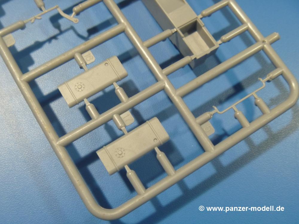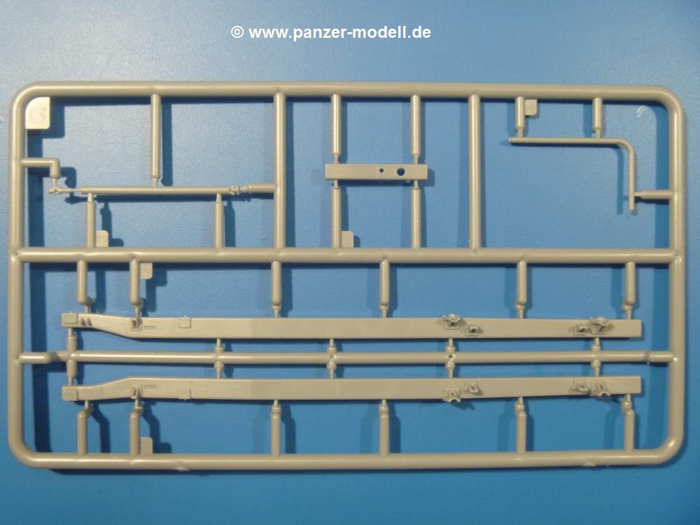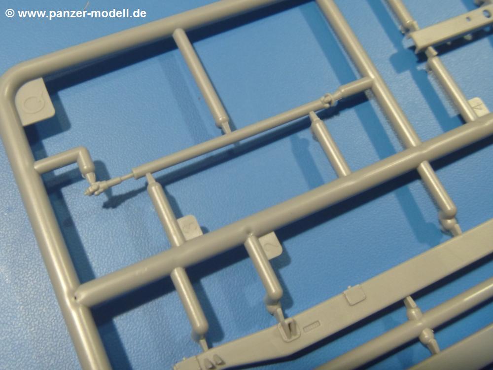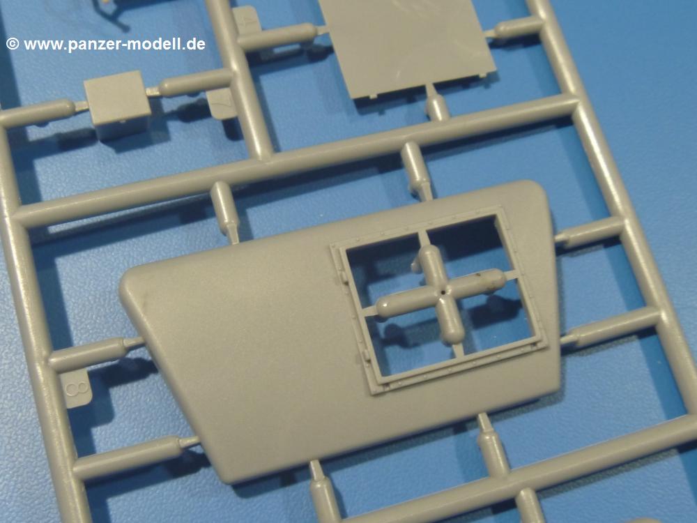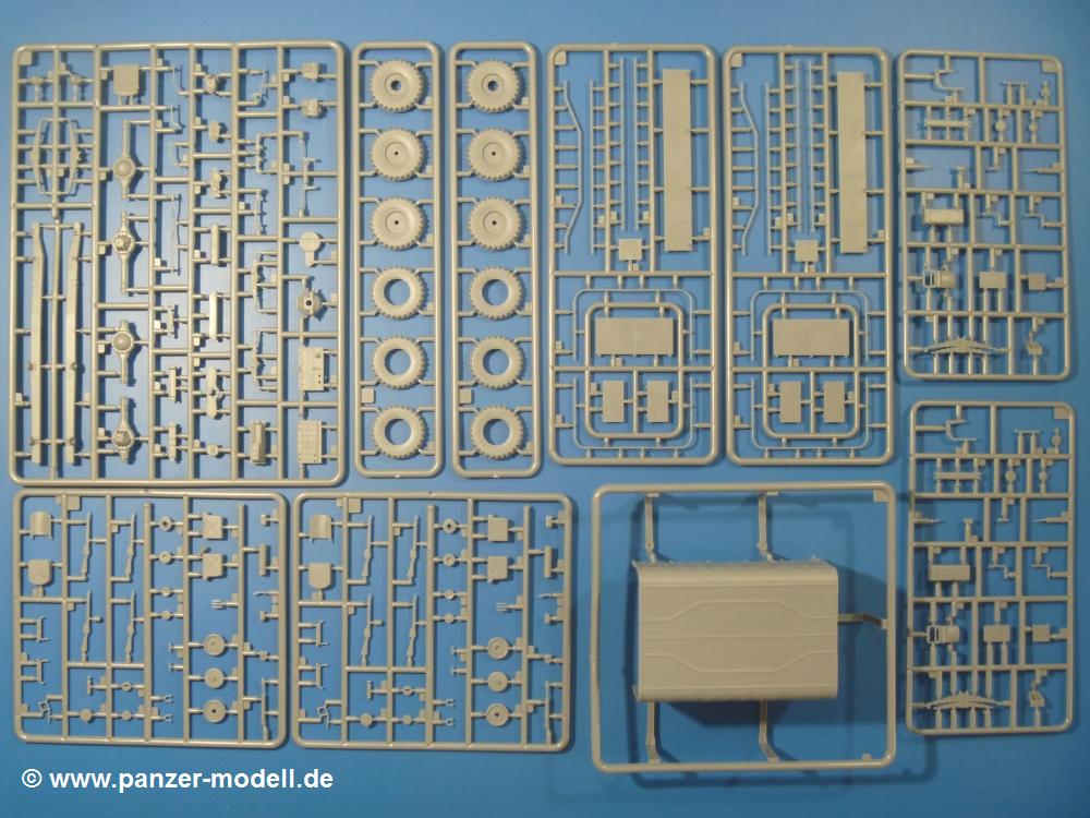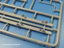 Die Teile aus mittelgrauem Plastik sind sauber ausgespritzt, ohne Grat und Versatz. Die Auswerfer sind meist auf den Spritzrahmen platziert. Einige wenige sind auf Teilen zu finden, aber so platziert, dass sie auch ohne Verspachteln nach dem Zusammenbau nicht mehr stören würden.Fahrgestell: Wie heutzutage bei Lkw Modellen meist üblich besteht der Rahmen aus separaten Längs- und Querträgern. Der Aufbau der Teile hinterlässt den Eindruck, dass auch ein Anfänger einen verzugsfreien Rahmen hinbekommt. Die Blattfedern sind schön strukturiert. Der Allradantrieb mit geteilten Achsen, einzelnen Kardanwellen und Getriebe ist toll detailliert. Sämtliche Lenkgestänge der Vorderachse sind dabei. Der Minuspunkt ist, dass man die Räder nur in Geradeausstellung montieren kann. Jedes Rad besteht aus 2 Hälften. Sehr schön der hervorgehobene Herstelleraufdruck, die Rad-/Felgengröße (Goodyear 10.50-16), das Profil und die Verschraubungen. Am Rahmen finden Tanks mit langen Einfüllstutzen Platz. Auch die Trittbleche für's Fahrerhaus werden am Rahmen befestigt.Motor: Der Motor weist viele Einzelteile und somit Details auf. Lichtmaschine, Zündspule, Luftfilter, Keilriemen, Lüfterrad usw. Wenn man den Motor zeigen möchte, sollte man die Motorhaube offen lassen, was zum Glück möglich ist. Der Auspuff ist mehrteilig ausgelegt, welches hoffentlich die Anbringung erleichtert.Fahrerhaus: Das Fahrerhaus (Cab 12) kann wahlweise mit geschlossenem Dach oder mit Dach mit einer Dachluke gebaut werden. Alle Sitze bestehen aus je 2 Bodenschienen, Sitzpolster und Rückenlehnen. Die Sitzpolster könnt ein wenig mehr Struktur gebrauchen. Der Fahrer muss kein Bedienelement vermissen - Gas-, Brems-, Kupplungspedal, Schalt-, Allrad-, Handbremshebel, Lenkstange, Lenkrad, Armaturentafel - alles da, aber man vermisst auch hier Decals für die Armaturen. Feuerlöscher und die Karabiner der Besatzung finden auch ihren Platz im Fahrerhaus. Die Motorhaube liegt als separates Teil bei. Man kann also einen Blick auf den Motor ermöglichen, nur muss man sich für die Scharniere selbst etwas einfallen lassen. Für den Kühlergrill gibt es schöne PE-Teile. Für die Frontscheiben gibt es kratzer- und schlierenfreie Klarsichtteile. An Scheibenwischer in Form von PE-Teilen wurde auch gedacht.Ladefläche: Hier hat die Wahl zwischen 2, bzw. 3 Gestaltungsmöglichkeiten - mit Plane oder nur mit Spriegel. Lässt man die Spriegel weg und verspachtelt die Löcher für die Verbindungszapfen, hat man die 3. Möglichkeit. Die Blechbodenplatte ist für alle gleich. Radkasten und 3 Staukästen pro Seite mit separaten Klappen bilden gleichzeitig Sitzbänke auf der Ladefläche. An der Unterseite finden wir hier nur die Rahmenaufsatzbalken und angegossene Querrippen. Der C30A kommt ohnme Schmutzfänger aus.Entscheidet man sich für die Spriegel Version, bringt man Seiten-, Frontteile und die Heckklappe an. Letztere kann man auch heruntergeklappt anbauen. Die Spriegel besten aus 4 U-förmigen, sehr feinen Stangen. Vorsicht beim Abtrennen vom Spritzling! Dazu kommen noch 5 ebenso feine Stabilisierungsstangen.Bei der Planenversion bringt man nur die Plane aus einem Stück an, bei der Seiten- und Frontteile integriert sind. Die Plane ist trotz dünnem Material stabil. Innen sind die Spriegel angedeutet, aussen ist ein leichter, aber glaubhafter Faltenwurf vorhanden. Auch an die Zurrseile wurde gedacht. Die Heckklappe kann offen oder geschlossen gebaut werden.Gemäß Anleitung kann man mit den Decals 2 Fahrzeuge darstellen: