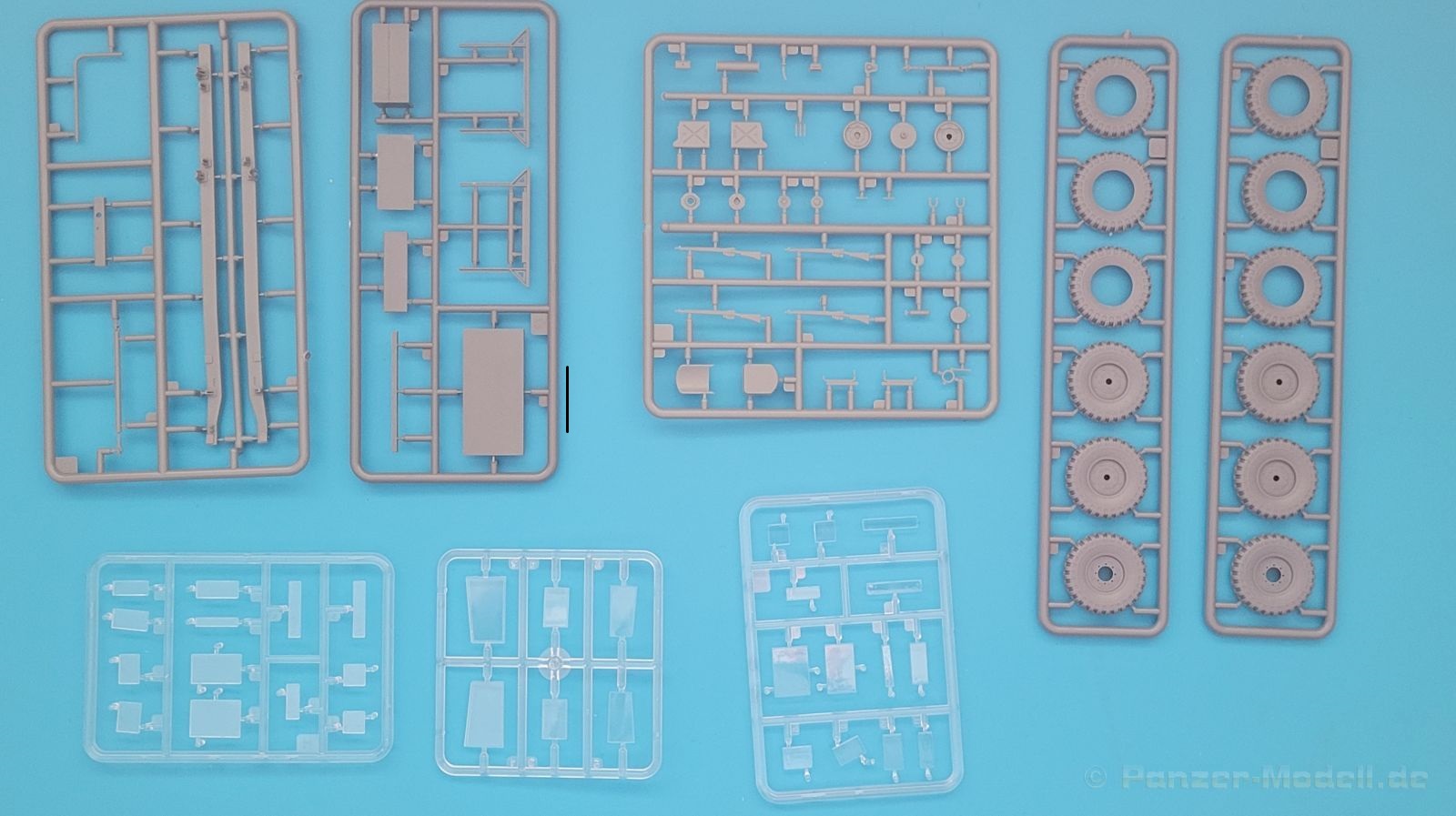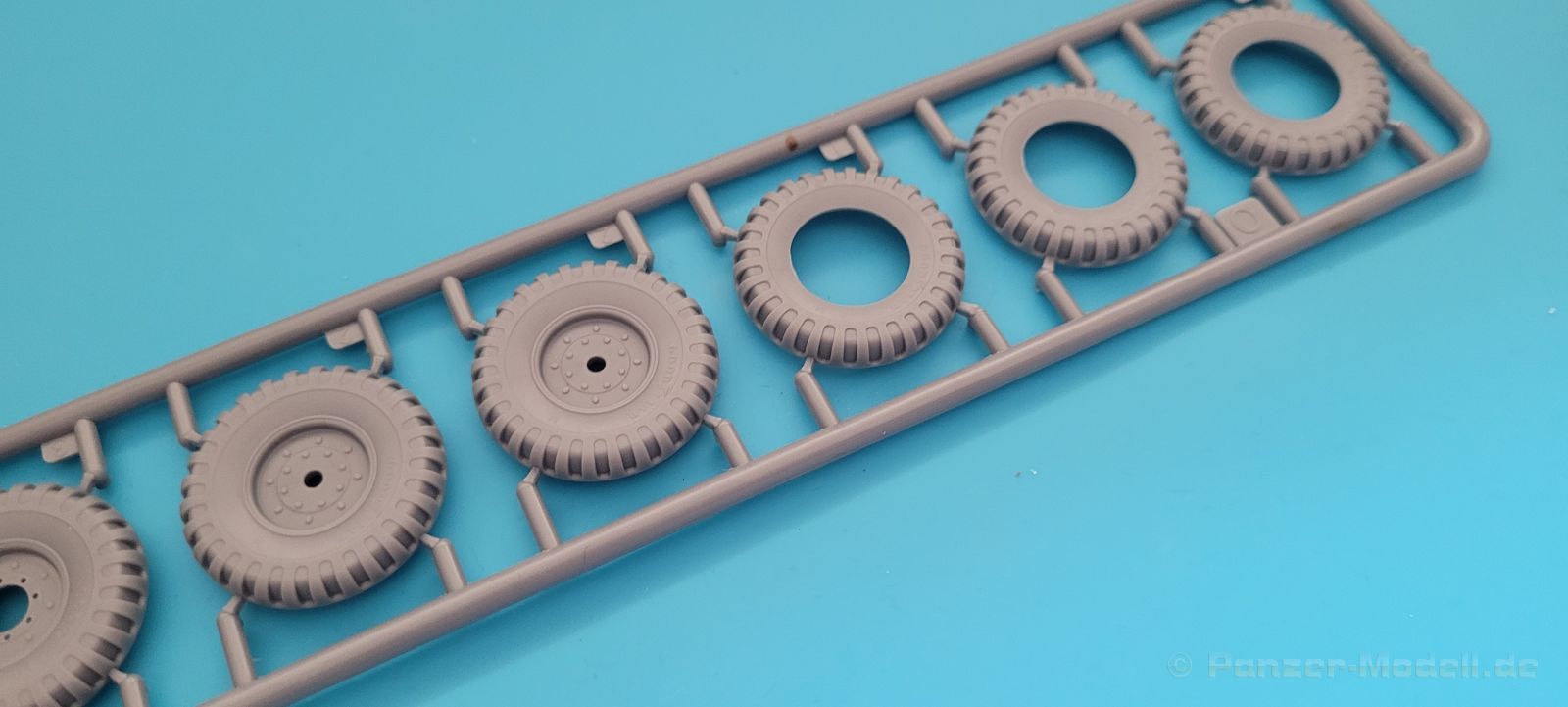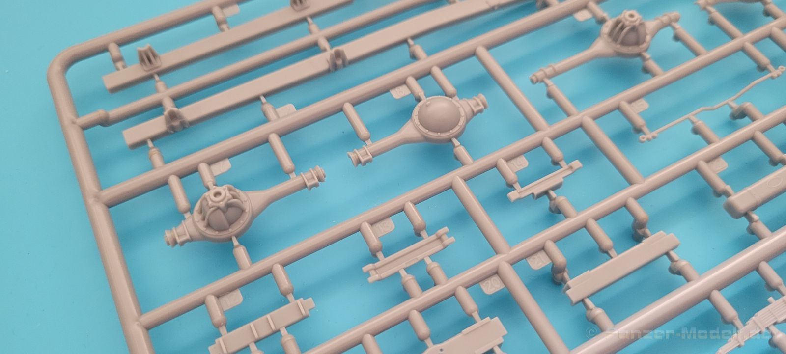 Der Bau beginnt wie üblich mit den Fahrwerkskomponenten, bei diesem Bausatz zunächst mit den Reifen, diversen Anbauteilen und den Differentialen.
