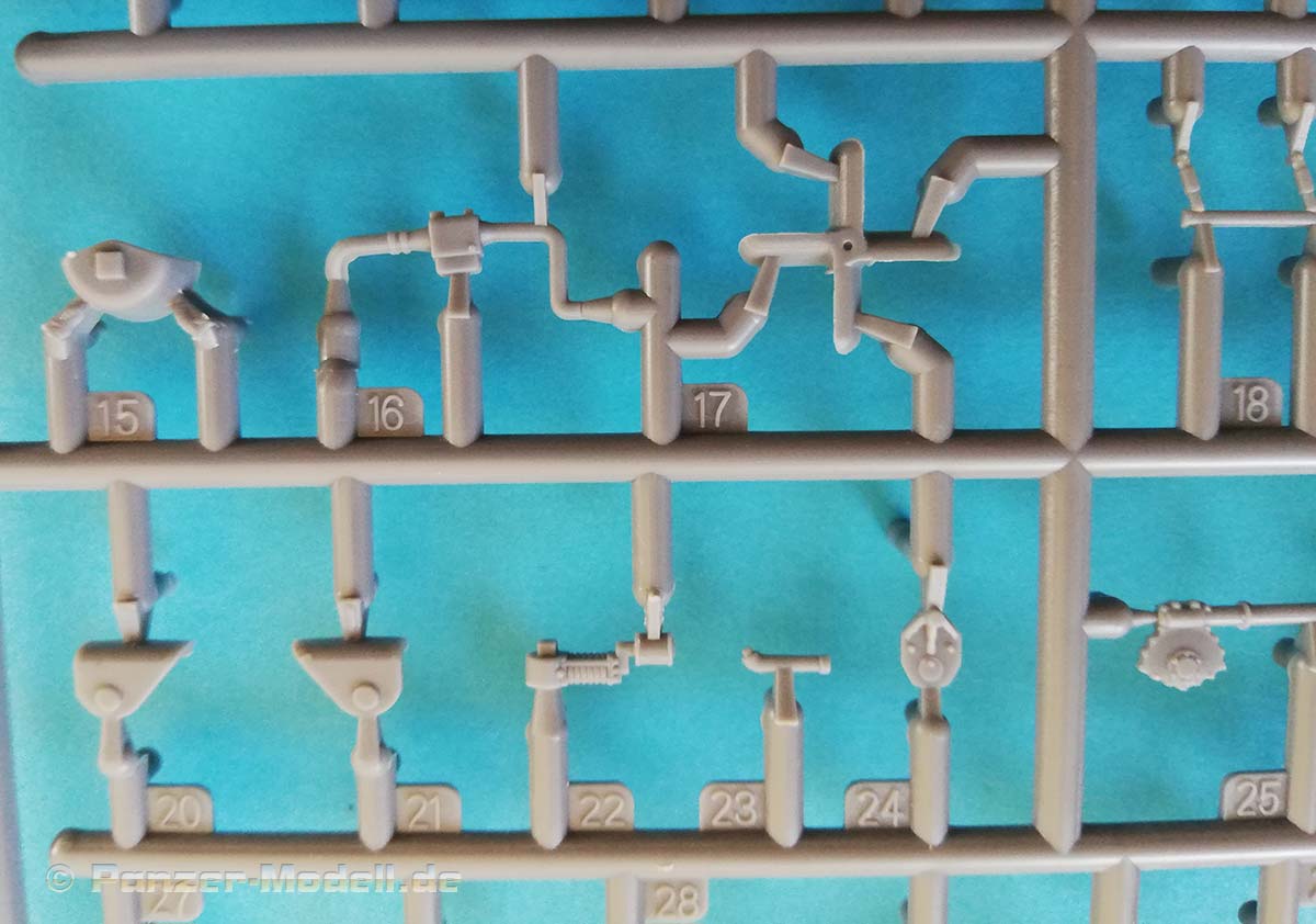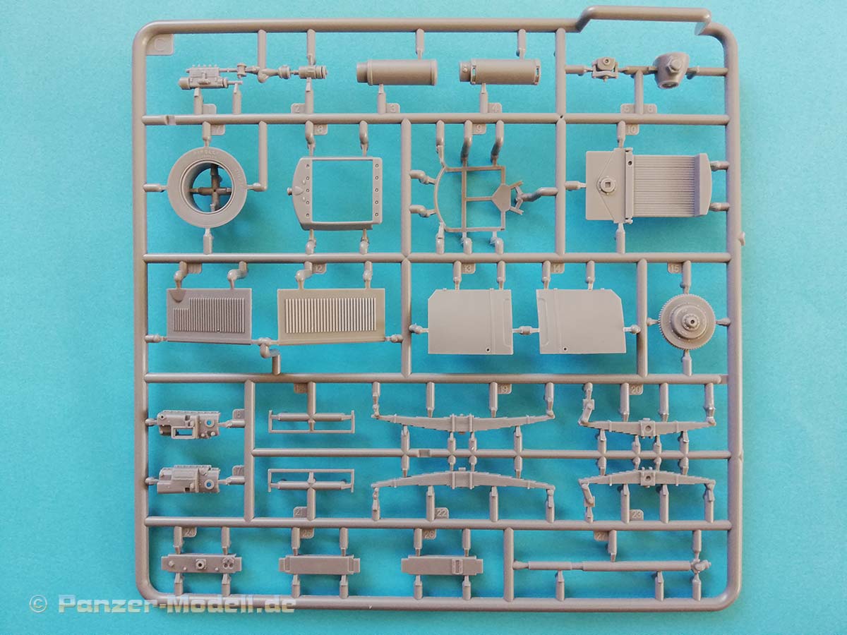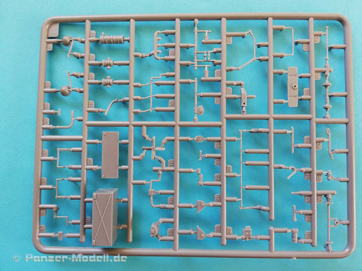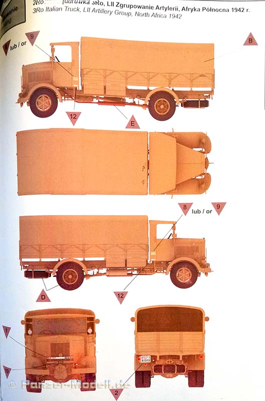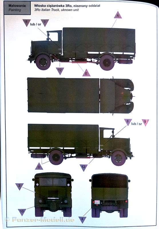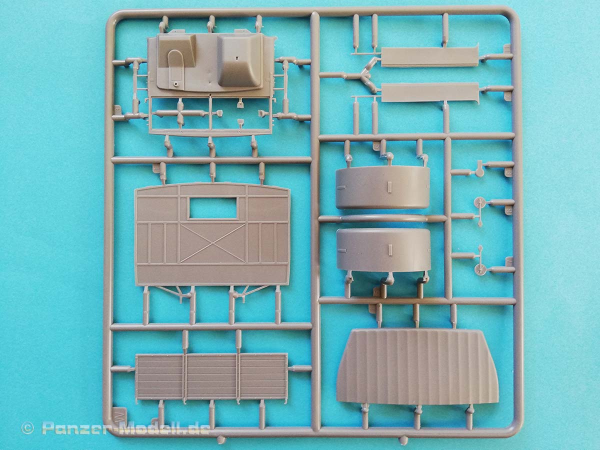 Der schwere LKW Lancia 3Ro wurde aus seinem Vorgänger Lancia Ro entwickelt. Er erhielt einen stärkeren Fünfzylinder-Motor als Ersatz für die bisher verwendeten Zwei- und Dreizylindermotoren und ein verbessertes Getriebe. Er war einer der wichtigsten und zuverlässigsten LKW der italienischen Armee im Zweiten Weltkrieg und danach. Er diente auf allen Kriegsschauplätzen auf denen die italienischer Armee kämpfte. Auch die Wehrmacht erhielt zwischen Januar 1944 und Januar 1945 772 neu gebaute Lancia 3Ro mit Einheitskabine. Aber auch ehemals italienische LKW wurden eingesetzt. Der neue Bausatz des polnischen Herstellers IBG enthält siebzehn sauber ausgeführte graue Spritzlinge und zwei klare Spritzlinge. Sieben separate Reifen, Decals, Fotoätzteile und eine Bauanleitung im typischen IBG 3D Stil runden den Bausatzumfang ab. Die Bauteile zeigen sich fein detailliert und Fischhaut ist augenscheinlich keine vorhanden. Die meisten Auswerfermarken befinden sich an später nicht mehr sichtbaren Stellen. Das Modell besitzt eine komplette Motornachbildung, aber wahrscheinlich ist von diesem nach dem Zusammenbau nicht mehr viel zu sehen, da dieser unter der schönen Motorhaube verschwindet. Es sei denn, man lässt die Seitenteile der Motorverkleidung weg, was damals auch teilweise üblich war, Die spartanisch ausgestattete Fahrerkabine zeigt sich dem Vorbild entsprechend als Rechtslenker ausgelegt viele italienische Militärfahrzeuge waren Rechtsgelenkt, da dies im Gebirge für den Fahrer Vorteile hatte bzgl. der Übersichtlichkeit. Es kann wahlweise eine Version mit Plane oder nur mit den sehr filigranen Spriegeln gebaut werden. Dies geschieht entweder durch den Einbau der Plane mit extra angegossenen Seitenwänden oder den Einbau der separat beiliegenden Seitenwände. Die große Plane aus Spritzguss zeigt eine relativ glatte Struktur, der erfahrene Modellbauer wird diese sicher mit eigenen Mitteln verbessern wollen, die vorhandene Verspannung an den Übergängen von der Plane zu den Bordwänden kann allerdings voll und ganz überzeugen. Alle vorhandenen Ätzteile werden beim Bau des LKW benötigt, und sind eine nützliche Ergänzung der Plastikteile. Die Bauanleitung führt in zweiundvierzig Schritten zum Ziel und ist wie immer bei IBG eindeutig und verständlich aufgebaut. Als Markierungsvarianten schlägt der Hersteller drei Möglichkeiten vor: