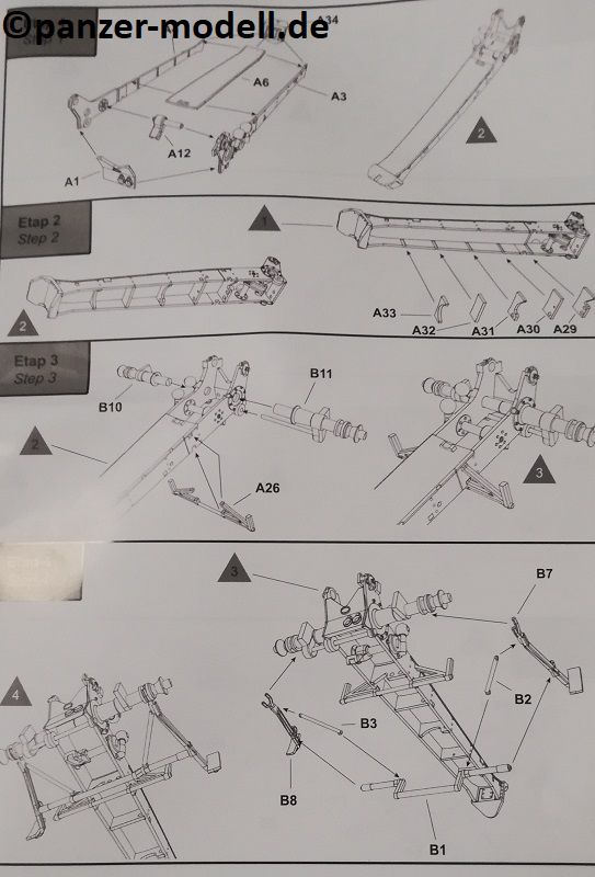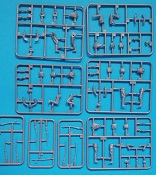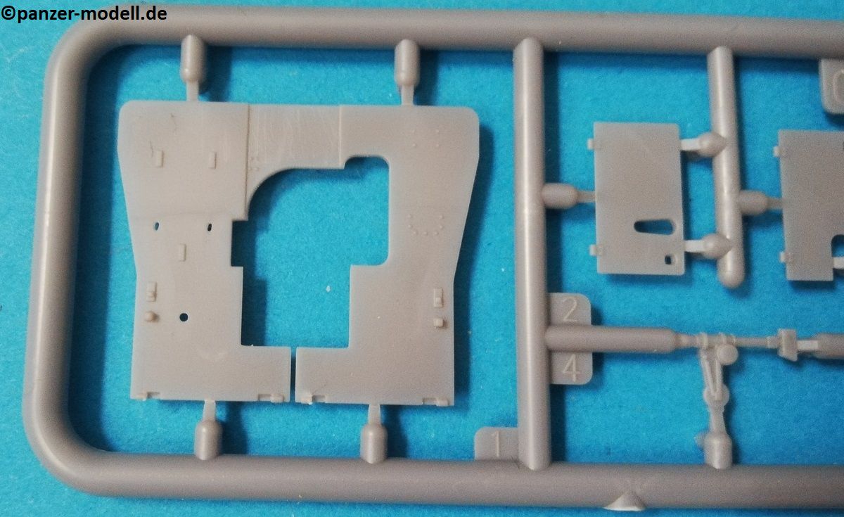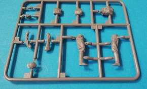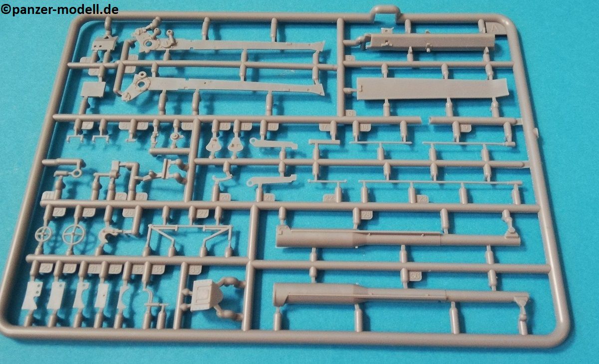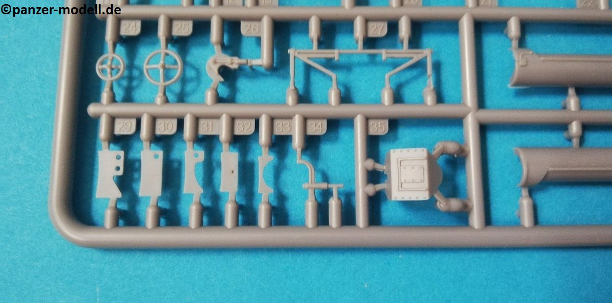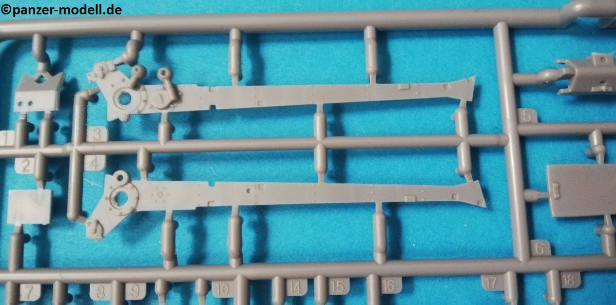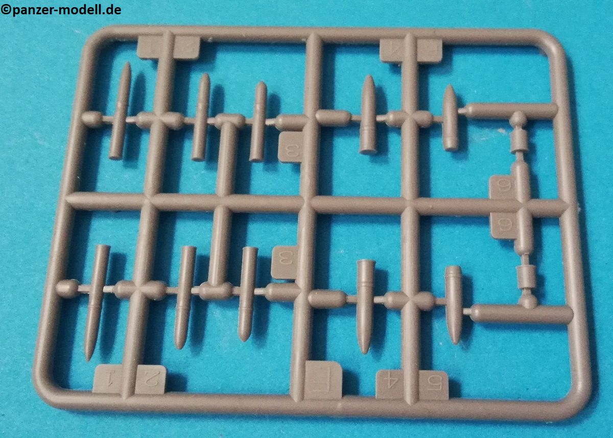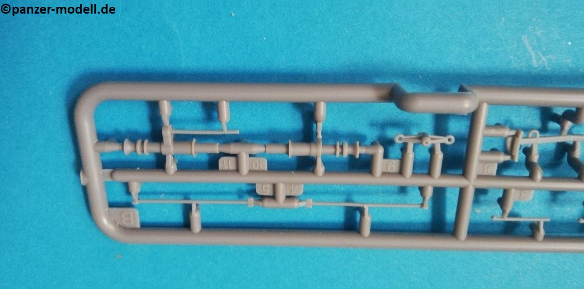 Die Bauteile zeigen sich fein detailliert und Fischhaut ist augenscheinlich keine vorhanden. Die meisten Auswerfermarken befinden sich an später nicht mehr sichtbaren Stellen. Die hier angebotene Qualität überzeugt auf ganzer Linie, trotz der relativ wenigen Bauteile. Schön fein ausgeführte Gravuren und überzeugende Nieten verleihen dem vergleichsweise kleinem Geschütz eine überzeugende Note. Die beiliegenden Fotoätzteile werden alle beim Bau benötigt, und sind eine nützliche Ergänzung der Plastikteile, um den ohnehin schon gegebenen Realismus zu verstärken. Sehr schön finde ich auch die Räder, welche mit Metall beschlagene Holzräder sehr realistisch darstellen. Ganz nach alter Schule ist das Kanonenrohr in Spritzguss in zwei Hälften gespritzt (mit einigen Anbauteilen), was zu einem erhöhten Aufwand bei der Versäuberung führt. Felder und Züge sind hier nicht zu erkennen, was aber wohl nur auffällt, wenn man direkt von vorn in das Rohr schaut. Die beiliegenden Figuren machen allerdings einen etwas seltsamen Eindruck. Der Guss ist vollkommen in Ordnung, und auch die Gesichter sind fein definiert Als Markierungsvariante für die Kanone schlägt der Hersteller eine Möglichkeit vor: