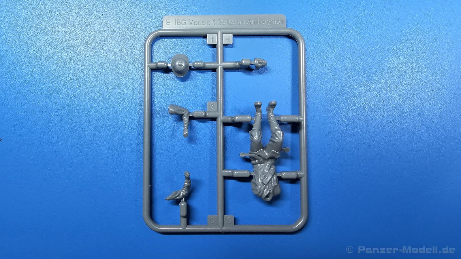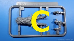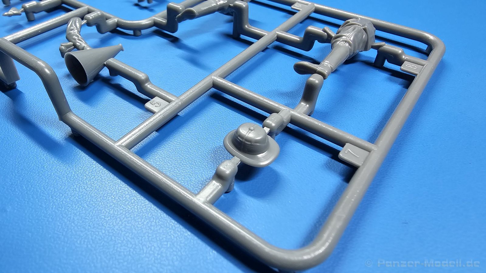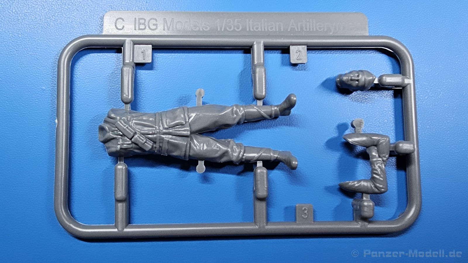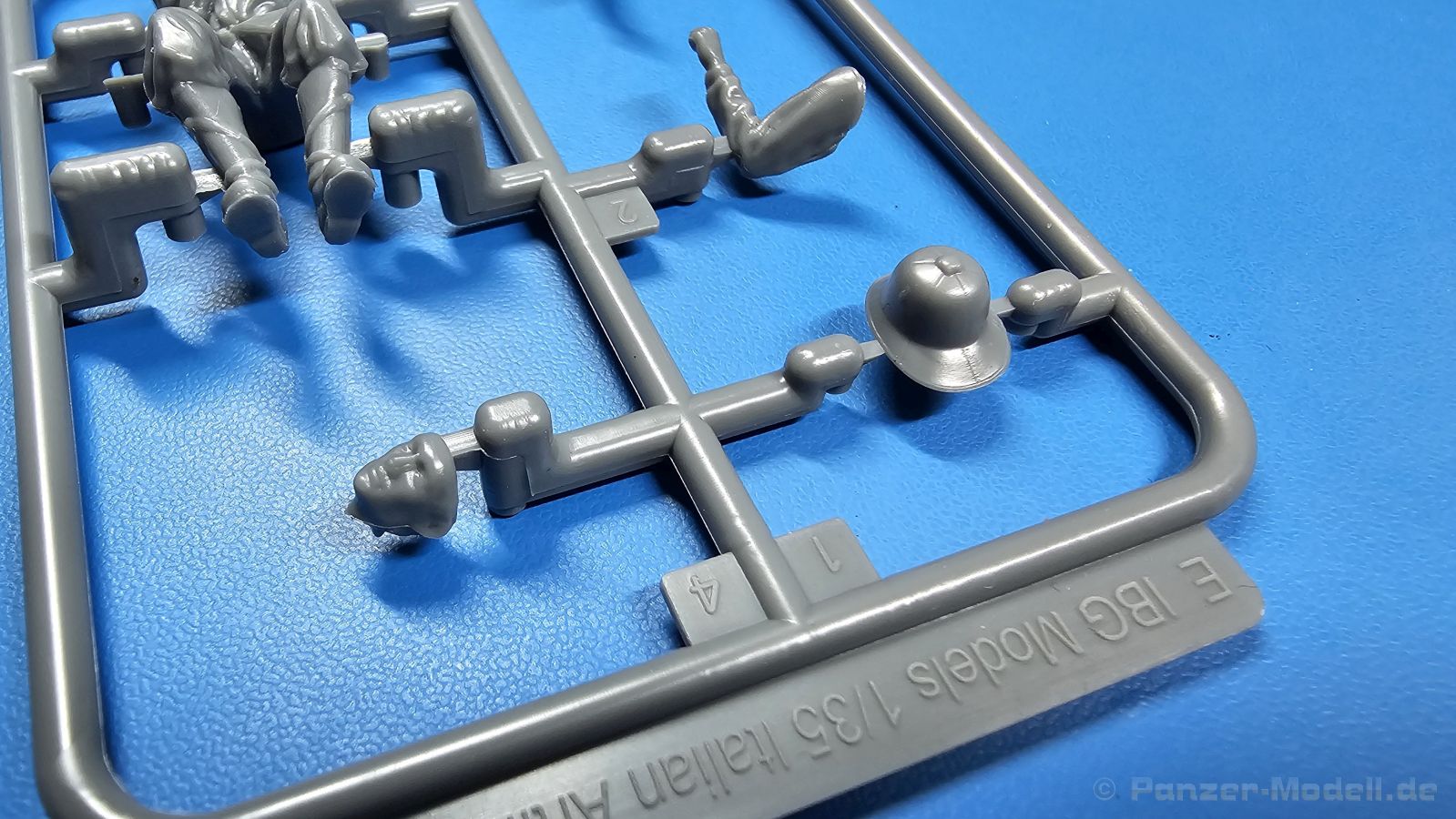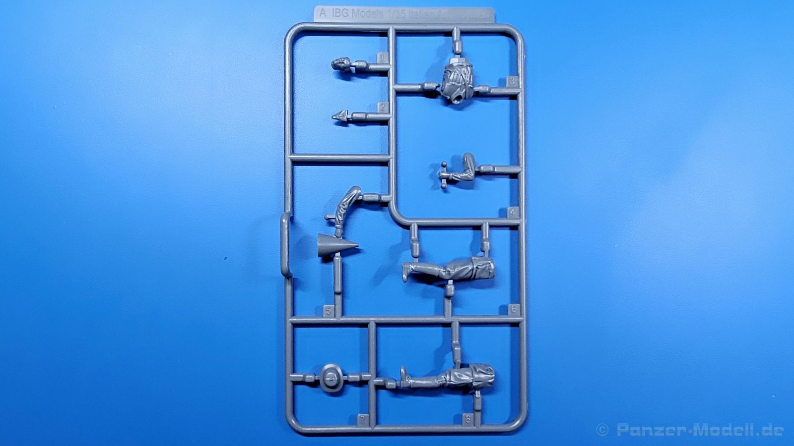 Das Original: Der Lancia 3RO war ein schwerer, italienischer Lkw, basierend auf dem Lancia RO. Er wurde ab 1939 bis 1950 produziert und war bis in die 1960-er Jahre im Einsatz. Mit seinem 93 PS Motor konnte er bis zu 45 km/h erreichen. Als Truppentransporter konnte er bis zu 32 Soldaten transportieren Es wurden aber auch Panzer und Pferde befördert. Mit einer anderen Plattform diente er auch als bewegliche Artillerie und Flugabwehr mit entsprechend montierten Geschützen. Der Lancia fand sowohl zivile als auch militärische Abnehmer. Neben der italienischen Armee nutzte ihn auch die deutsche Wehrmacht. Der Bausatz: Der Lancia 3RO mit 100 mm Haubitze von IBG hat Zuwachs in Form von Figuren bekommen. Das Fahrzeug wurde bereits unter der Nummer 35053 im Dezember 2018 herausgebracht und war schon damals eine hochdetailliertes Modell. Nun spendiert IBG eine Fahrzeugbesatzung in Form eines Fahrers, eines Offiziers und zwei Geschützbedienern dazu. Im 405 x 255 x 60 mm großen Karton finden wir 16 graue, einen klaren Spritzling, 7 Plastikreifen, 1 PE-Platine, Naßschiebebilder und ein Metallrohr für das Fahrzeug und 5 graue Spritzlinge für die Figuren und deren Waffen und Ausrüstung. Ich habe noch einen weiteren Klarsichtspritzling mit Windschutzscheiben im Karton gefunden, der aber für dieses Modell weder gebraucht noch in der Übersicht aufgeführt wird. Die Teile aus Plastik sind sauber ausgespritzt, ohne Grat und Versatz. Angüsse sind so gesetzt, dass Details in der Regel nicht beeinträchtigt werden. Unnötige oder störende Auswerferspuren sind mir nicht aufgefallen. Also, alles in allem sollte man die Teile vom Spritzling ohne viel Nacharbeit bekommen. Hier und da ist feiner Grat zu sehen, der sich leicht entfernen lassen sollte. Die Details des Geschützes sind etwas weicher als die des Lkws. An den Spritzlingen des Geschützes tauchen einige Sinkstellen auf, die sich zum Glück meist nur auf den Gießästen befinden, aber leider doch auch auf wenigen Teilen wie z.B. dem Verschlussblock. Da der Lkw bereits bekannt ist, starten wir diesmal mit den Figuren. Von Spritzguss kann man nicht so scharfe Details wie bei Resinguss oder 3D-Druck erwarten, aber dennoch kommen die typischen italienischen Uniformen gut zur Geltung. Die Gesichtszüge sind etwas schwammig, aber deutlich erkennbar, so dass man Unterschiede zwischen den Gesichtern erkennen kann. Für den Offizier gibt es acht Teile – Beine, Rumpf, Kopf, Tropenhelm, Pistolentasche und Arme. An der linken Hand ist ein großes Megaphon angegossen, dem man ggfs. die Sprechöffnung aufbohren könnte. An der linken Hand befindet sich eine kurzstielige Pfeife. Knöpfe und aufgesetzte Taschen der Uniform treten deutlich hervor. Der Offizier ist der Einzige, der kniehohe Stiefel trägt. Der stehende Kanonier kommt mit drei Teilen aus; Beine und Rumpf bilden ein Teil, dazu kommt der Kopf und die zusammengegossenen, vor der Brust gekreuzten Arme. An den Füssen trägt er Gamaschenschnürschuhe. Die Schnürung ist angedeutet, aber etwas undeutlich. Der sitzende Kanonier besteht aus Kopf, Tropenhelm, Armen und dem Rest. Der Kanonier soll rechts am Geschütz sitzen, die Arme suggerieren, dass er die Handräder bedient. Man muss beim Bau sehen, ob er deswegen nicht vielleicht doch lieber links sitzen sollte. Zu guter Letzt wäre da noch der Fahrer. Er hat zwei Köpfe zur Auswahl – einen mit angegossenem Schiffchen und einen mit separatem Tropenhelm. Auch beim ihm bilden Beine und Rumpf ein Teil. Es gibt vier Arme, von denen aber nur zwei für seine Fahrertätigkeit notwendig sind. Die beiden anderen könnte man ggfs. verwenden, wenn man ihm eine Aufgabe als Geschützbedienung zuweisen möchte. Das müsste man Bau prüfen, ob das so geht wie gedacht. Fahrer und stehender Kanonier haben schräg vor der Brust Patronentaschen angegossen. Ein Spritzling mit vier Waffen und Wasserflaschen steht zur freien Verfügung, da in der Anleitung nichts darüber ausgesagt wird. Bei den Waffen handelt es sich offensichtlich um je 2 Carcano Karabiner Terni und 2 Gebirgsstutzen 65mm. Die Ladehebel sind gut herausgearbeitet, die Abzugsbügel durchbrochen mit freistehendem Abzug. Bei den Gebirgsstutzen sollte auch das Teil unter dem Lauf durchbrochen sein, da es sich wohl um ein eingeklappten Zweibein handelt, aber da behilft man sich dann selbst. Die Figuren bringen Leben in das Fahrzeug. Wenn jetzt noch etwas mehr Ausrüstung dabei gewesen wäre… Der Fahrzeugrahmen besteht wie bei den anderen 3RO aus separaten Längs- und Querträgern mit relativ vielen Teilen, die sauber und ordentlich in jeweils exakt gerade Ausrichtung gebracht werden müssen. Es gibt sehr viele, teils aus Fotoätzteilen bestehende, teils auch filigrane, Anbauteile, die alle ihren Platz finden wollen. Die Vorder- und Hinterachse sind gut detailliert und mit recht wenigen Teilen baubar. Leider lässt sich bei der Vorderachse kein Lenkeinschlag bauen, zumindest nicht aus dem Kasten (der findige Modellbauer wird aber sicher eine Möglichkeit finden). Die Blattfedern machen eine sehr guten Eindruck. Jedes Federblatt ist sauber erkennbar. Die Blattfedern stützen die Achsen am Rahmen ab.