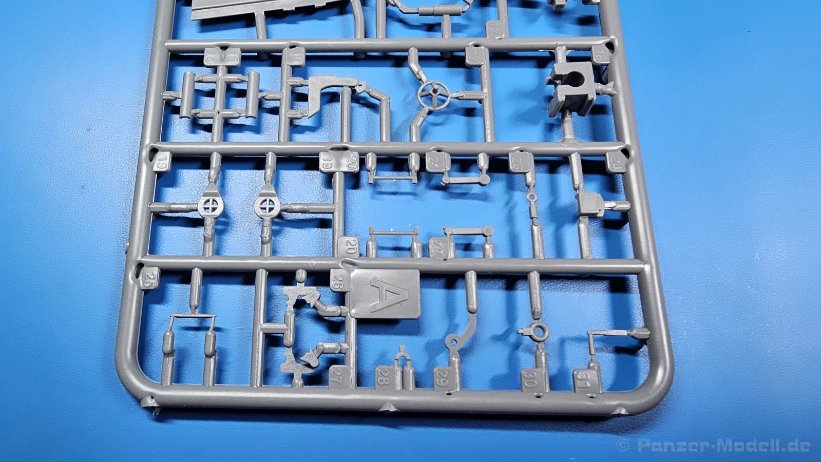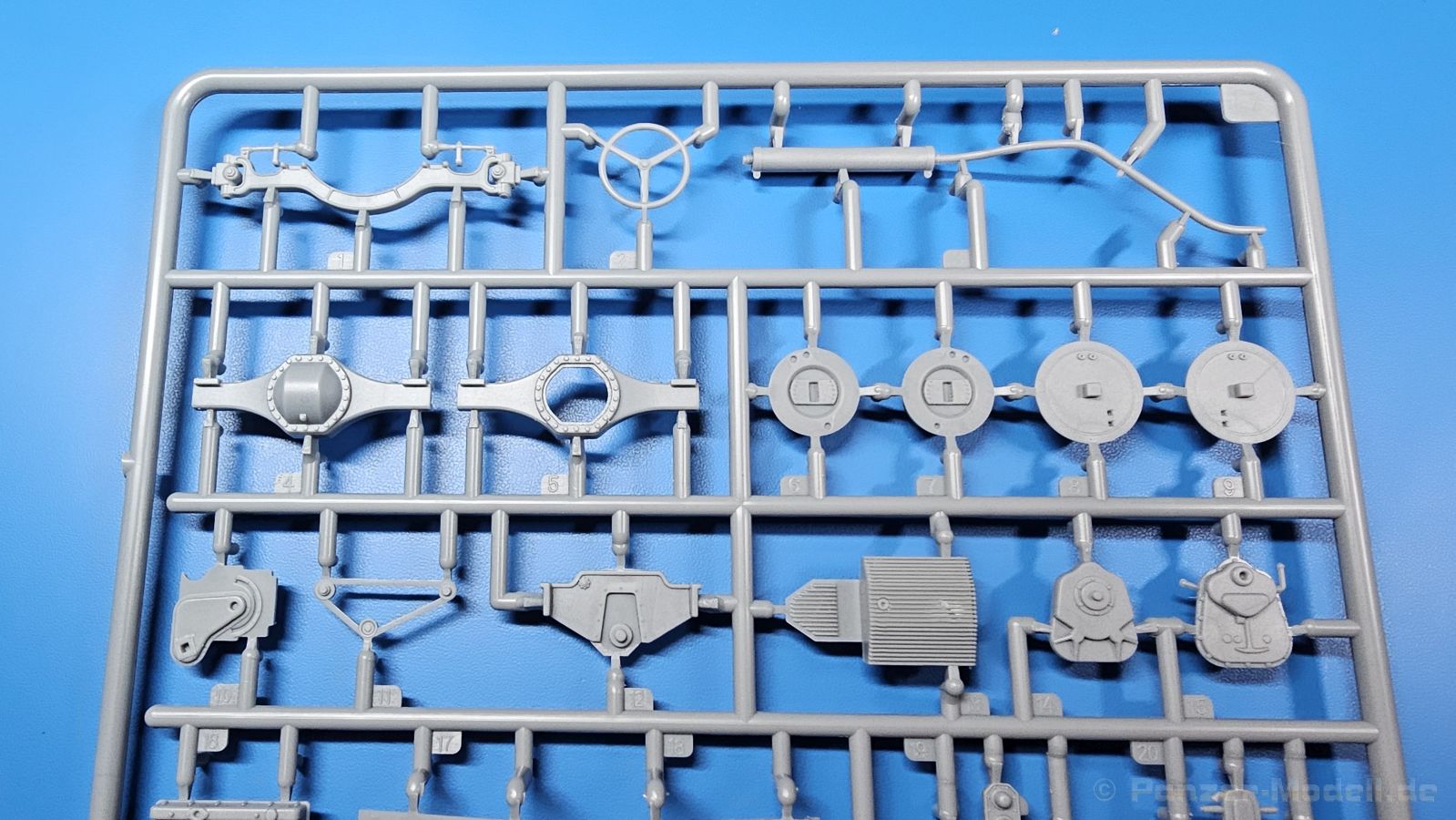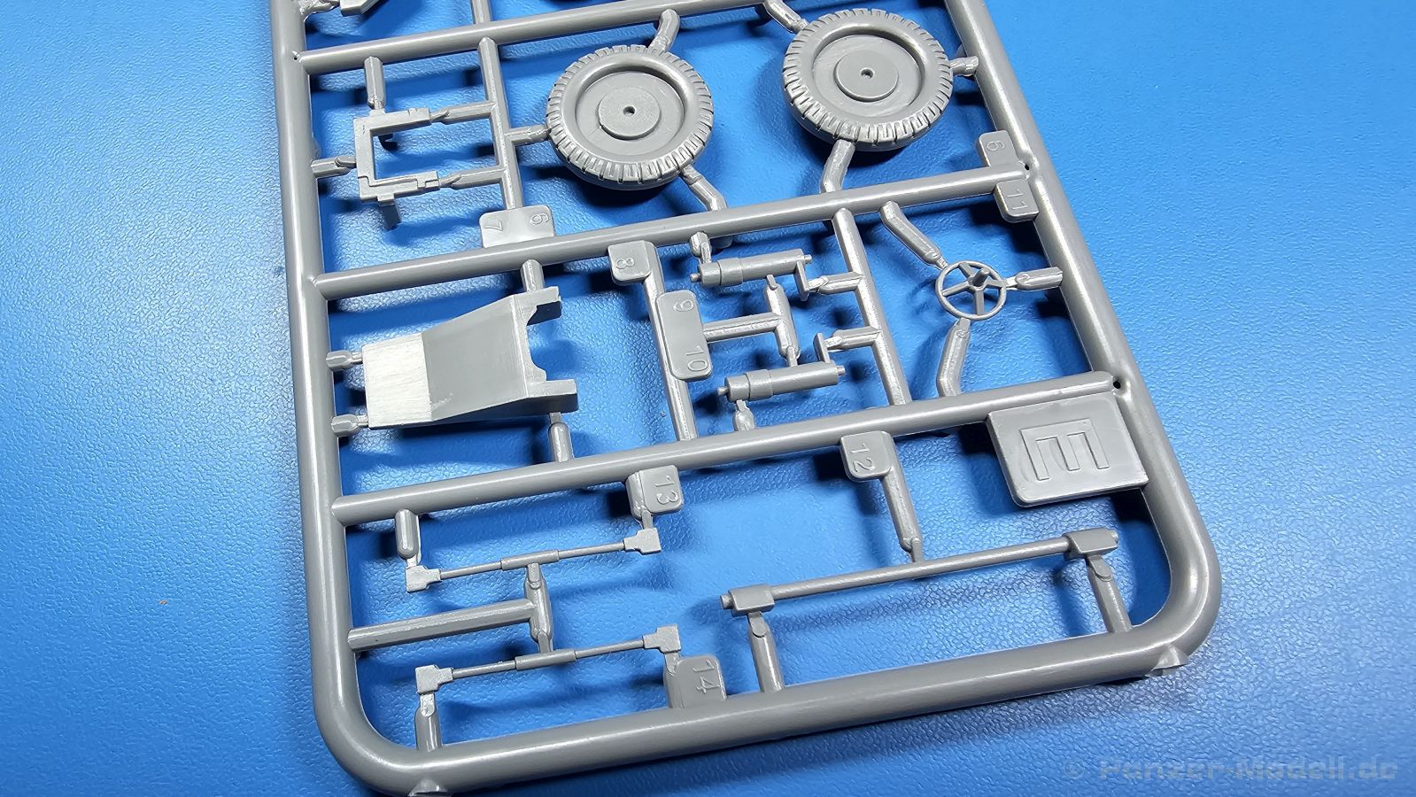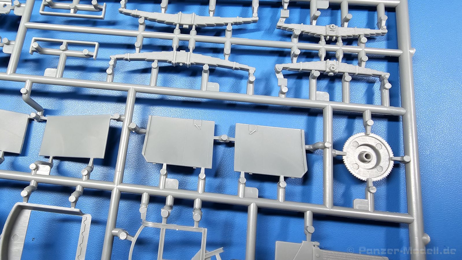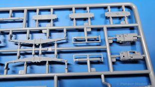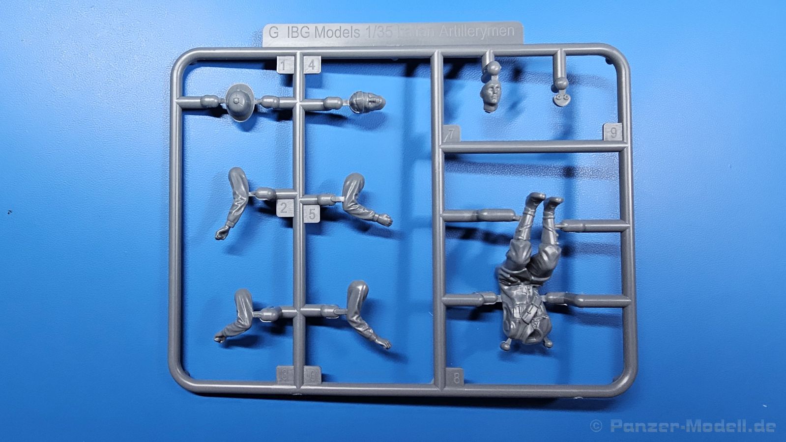 Das Original: Der Lancia 3RO war ein schwerer, italienischer Lkw, basierend auf dem Lancia RO. Er wurde ab 1939 bis 1950 produziert und war bis in die 1960-er Jahre im Einsatz. Mit seinem 93 PS Motor konnte er bis zu 45 km/h erreichen. Als Truppentransporter konnte er bis zu 32 Soldaten transportieren Es wurden aber auch Panzer und Pferde befördert. Mit einer anderen Plattform diente er auch als bewegliche Artillerie und Flugabwehr mit entsprechend montierten Geschützen. Der Lancia fand sowohl zivile als auch militärische Abnehmer. Neben der italienischen Armee nutzte ihn auch die deutsche Wehrmacht. Der Bausatz: Der Lancia 3RO mit 100 mm Haubitze von IBG hat Zuwachs in Form von Figuren bekommen. Das Fahrzeug wurde bereits unter der Nummer 35053 im Dezember 2018 herausgebracht und war schon damals eine hochdetailliertes Modell. Nun spendiert IBG eine Fahrzeugbesatzung in Form eines Fahrers, eines Offiziers und zwei Geschützbedienern dazu. Im 405 x 255 x 60 mm großen Karton finden wir 16 graue, einen klaren Spritzling, 7 Plastikreifen, 1 PE-Platine, Naßschiebebilder und ein Metallrohr für das Fahrzeug und 5 graue Spritzlinge für die Figuren und deren Waffen und Ausrüstung. Ich habe noch einen weiteren Klarsichtspritzling mit Windschutzscheiben im Karton gefunden, der aber für dieses Modell weder gebraucht noch in der Übersicht aufgeführt wird. Die Teile aus Plastik sind sauber ausgespritzt, ohne Grat und Versatz. Angüsse sind so gesetzt, dass Details in der Regel nicht beeinträchtigt werden. Unnötige oder störende Auswerferspuren sind mir nicht aufgefallen. Also, alles in allem sollte man die Teile vom Spritzling ohne viel Nacharbeit bekommen. Hier und da ist feiner Grat zu sehen, der sich leicht entfernen lassen sollte. Die Details des Geschützes sind etwas weicher als die des Lkws. An den Spritzlingen des Geschützes tauchen einige Sinkstellen auf, die sich zum Glück meist nur auf den Gießästen befinden, aber leider doch auch auf wenigen Teilen wie z.B. dem Verschlussblock. Da der Lkw bereits bekannt ist, starten wir diesmal mit den Figuren. Von Spritzguss kann man nicht so scharfe Details wie bei Resinguss oder 3D-Druck erwarten, aber dennoch kommen die typischen italienischen Uniformen gut zur Geltung. Die Gesichtszüge sind etwas schwammig, aber deutlich erkennbar, so dass man Unterschiede zwischen den Gesichtern erkennen kann. Für den Offizier gibt es acht Teile – Beine, Rumpf, Kopf, Tropenhelm, Pistolentasche und Arme. An der linken Hand ist ein großes Megaphon angegossen, dem man ggfs. die Sprechöffnung aufbohren könnte. An der linken Hand befindet sich eine kurzstielige Pfeife. Knöpfe und aufgesetzte Taschen der Uniform treten deutlich hervor. Der Offizier ist der Einzige, der kniehohe Stiefel trägt. Der stehende Kanonier kommt mit drei Teilen aus; Beine und Rumpf bilden ein Teil, dazu kommt der Kopf und die zusammengegossenen, vor der Brust gekreuzten Arme. An den Füssen trägt er Gamaschenschnürschuhe. Die Schnürung ist angedeutet, aber etwas undeutlich. Der sitzende Kanonier besteht aus Kopf, Tropenhelm, Armen und dem Rest. Der Kanonier soll rechts am Geschütz sitzen, die Arme suggerieren, dass er die Handräder bedient. Man muss beim Bau sehen, ob er deswegen nicht vielleicht doch lieber links sitzen sollte. Zu guter Letzt wäre da noch der Fahrer. Er hat zwei Köpfe zur Auswahl – einen mit angegossenem Schiffchen und einen mit separatem Tropenhelm. Auch beim ihm bilden Beine und Rumpf ein Teil. Es gibt vier Arme, von denen aber nur zwei für seine Fahrertätigkeit notwendig sind. Die beiden anderen könnte man ggfs. verwenden, wenn man ihm eine Aufgabe als Geschützbedienung zuweisen möchte. Das müsste man Bau prüfen, ob das so geht wie gedacht. Fahrer und stehender Kanonier haben schräg vor der Brust Patronentaschen angegossen. Ein Spritzling mit vier Waffen und Wasserflaschen steht zur freien Verfügung, da in der Anleitung nichts darüber ausgesagt wird. Bei den Waffen handelt es sich offensichtlich um je 2 Carcano Karabiner Terni und 2 Gebirgsstutzen 65mm. Die Ladehebel sind gut herausgearbeitet, die Abzugsbügel durchbrochen mit freistehendem Abzug. Bei den Gebirgsstutzen sollte auch das Teil unter dem Lauf durchbrochen sein, da es sich wohl um ein eingeklappten Zweibein handelt, aber da behilft man sich dann selbst. Die Figuren bringen Leben in das Fahrzeug. Wenn jetzt noch etwas mehr Ausrüstung dabei gewesen wäre… Der Fahrzeugrahmen besteht wie bei den anderen 3RO aus separaten Längs- und Querträgern mit relativ vielen Teilen, die sauber und ordentlich in jeweils exakt gerade Ausrichtung gebracht werden müssen. Es gibt sehr viele, teils aus Fotoätzteilen bestehende, teils auch filigrane, Anbauteile, die alle ihren Platz finden wollen. Die Vorder- und Hinterachse sind gut detailliert und mit recht wenigen Teilen baubar. Leider lässt sich bei der Vorderachse kein Lenkeinschlag bauen, zumindest nicht aus dem Kasten (der findige Modellbauer wird aber sicher eine Möglichkeit finden). Die Blattfedern machen eine sehr guten Eindruck. Jedes Federblatt ist sauber erkennbar. Die Blattfedern stützen die Achsen am Rahmen ab.