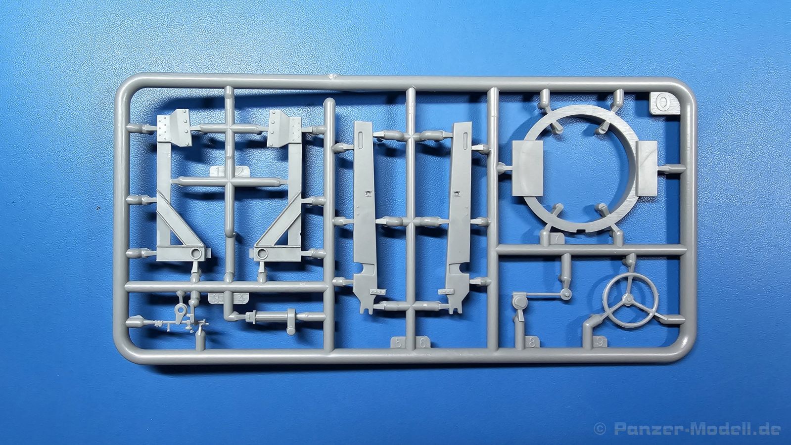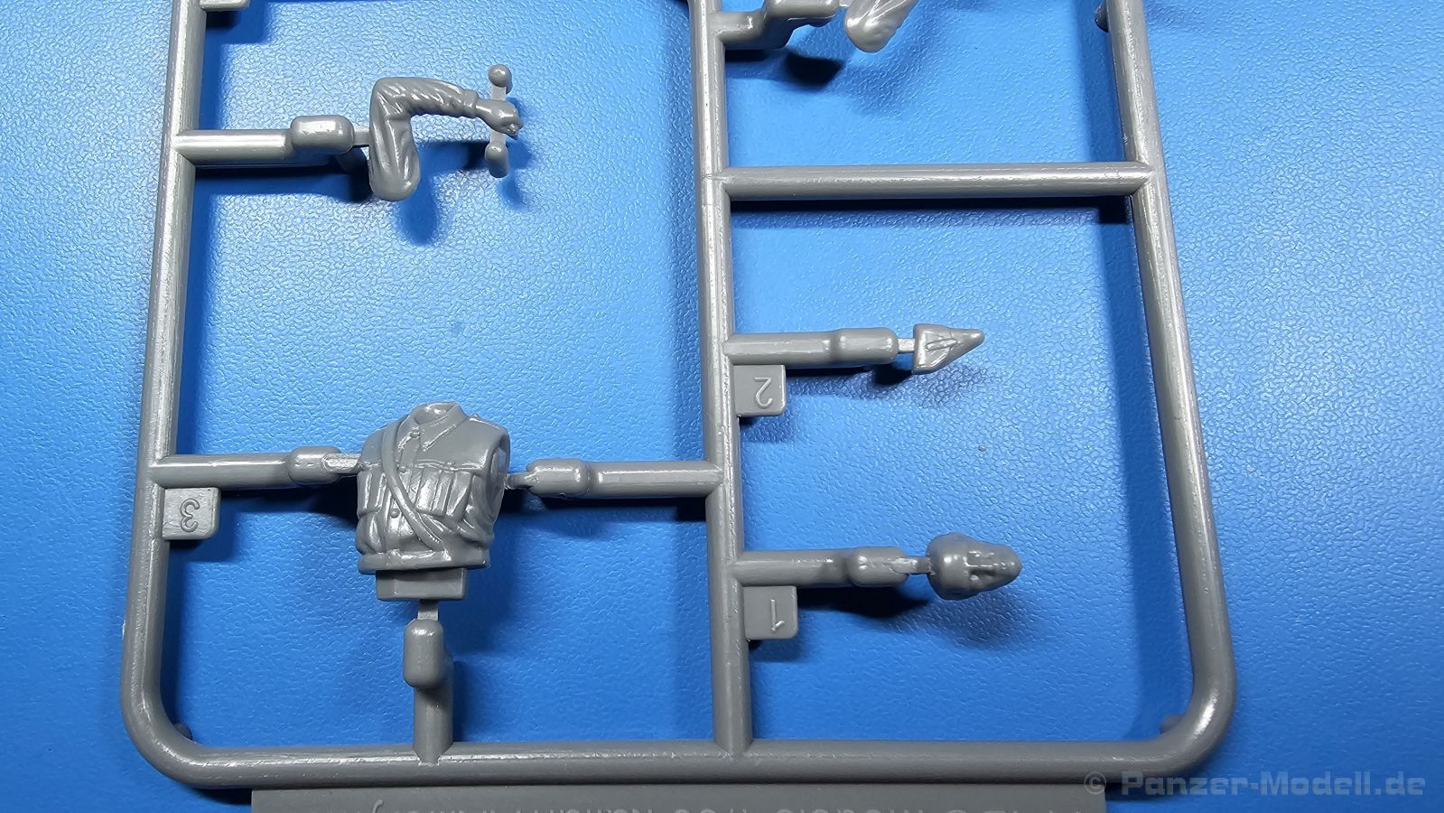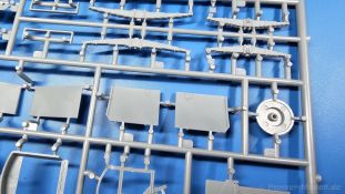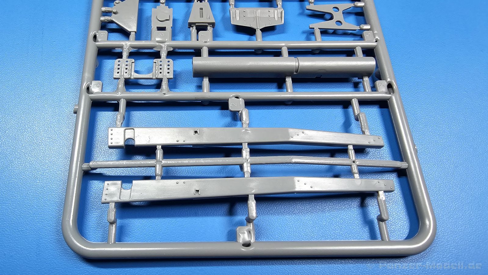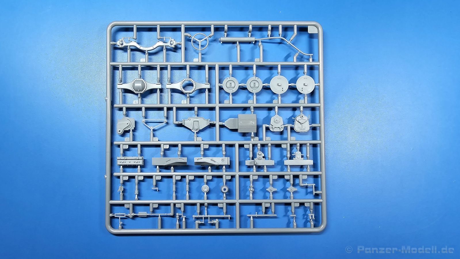 Das Original: Der Lancia 3RO war ein schwerer, italienischer Lkw, basierend auf dem Lancia RO. Er wurde ab 1939 bis 1950 produziert und war bis in die 1960-er Jahre im Einsatz. Mit seinem 93 PS Motor konnte er bis zu 45 km/h erreichen. Als Truppentransporter konnte er bis zu 32 Soldaten transportieren Es wurden aber auch Panzer und Pferde befördert. Mit einer anderen Plattform diente er auch als bewegliche Artillerie und Flugabwehr mit entsprechend montierten Geschützen. Der Lancia fand sowohl zivile als auch militärische Abnehmer. Neben der italienischen Armee nutzte ihn auch die deutsche Wehrmacht. Der Bausatz: Der Lancia 3RO mit 100 mm Haubitze von IBG hat Zuwachs in Form von Figuren bekommen. Das Fahrzeug wurde bereits unter der Nummer 35053 im Dezember 2018 herausgebracht und war schon damals eine hochdetailliertes Modell. Nun spendiert IBG eine Fahrzeugbesatzung in Form eines Fahrers, eines Offiziers und zwei Geschützbedienern dazu. Im 405 x 255 x 60 mm großen Karton finden wir 16 graue, einen klaren Spritzling, 7 Plastikreifen, 1 PE-Platine, Naßschiebebilder und ein Metallrohr für das Fahrzeug und 5 graue Spritzlinge für die Figuren und deren Waffen und Ausrüstung. Ich habe noch einen weiteren Klarsichtspritzling mit Windschutzscheiben im Karton gefunden, der aber für dieses Modell weder gebraucht noch in der Übersicht aufgeführt wird. Die Teile aus Plastik sind sauber ausgespritzt, ohne Grat und Versatz. Angüsse sind so gesetzt, dass Details in der Regel nicht beeinträchtigt werden. Unnötige oder störende Auswerferspuren sind mir nicht aufgefallen. Also, alles in allem sollte man die Teile vom Spritzling ohne viel Nacharbeit bekommen. Hier und da ist feiner Grat zu sehen, der sich leicht entfernen lassen sollte. Die Details des Geschützes sind etwas weicher als die des Lkws. An den Spritzlingen des Geschützes tauchen einige Sinkstellen auf, die sich zum Glück meist nur auf den Gießästen befinden, aber leider doch auch auf wenigen Teilen wie z.B. dem Verschlussblock. Da der Lkw bereits bekannt ist, starten wir diesmal mit den Figuren. Von Spritzguss kann man nicht so scharfe Details wie bei Resinguss oder 3D-Druck erwarten, aber dennoch kommen die typischen italienischen Uniformen gut zur Geltung. Die Gesichtszüge sind etwas schwammig, aber deutlich erkennbar, so dass man Unterschiede zwischen den Gesichtern erkennen kann. Für den Offizier gibt es acht Teile – Beine, Rumpf, Kopf, Tropenhelm, Pistolentasche und Arme. An der linken Hand ist ein großes Megaphon angegossen, dem man ggfs. die Sprechöffnung aufbohren könnte. An der linken Hand befindet sich eine kurzstielige Pfeife. Knöpfe und aufgesetzte Taschen der Uniform treten deutlich hervor. Der Offizier ist der Einzige, der kniehohe Stiefel trägt. Der stehende Kanonier kommt mit drei Teilen aus; Beine und Rumpf bilden ein Teil, dazu kommt der Kopf und die zusammengegossenen, vor der Brust gekreuzten Arme. An den Füssen trägt er Gamaschenschnürschuhe. Die Schnürung ist angedeutet, aber etwas undeutlich. Der sitzende Kanonier besteht aus Kopf, Tropenhelm, Armen und dem Rest. Der Kanonier soll rechts am Geschütz sitzen, die Arme suggerieren, dass er die Handräder bedient. Man muss beim Bau sehen, ob er deswegen nicht vielleicht doch lieber links sitzen sollte. Zu guter Letzt wäre da noch der Fahrer. Er hat zwei Köpfe zur Auswahl – einen mit angegossenem Schiffchen und einen mit separatem Tropenhelm. Auch beim ihm bilden Beine und Rumpf ein Teil. Es gibt vier Arme, von denen aber nur zwei für seine Fahrertätigkeit notwendig sind. Die beiden anderen könnte man ggfs. verwenden, wenn man ihm eine Aufgabe als Geschützbedienung zuweisen möchte. Das müsste man Bau prüfen, ob das so geht wie gedacht. Fahrer und stehender Kanonier haben schräg vor der Brust Patronentaschen angegossen. Ein Spritzling mit vier Waffen und Wasserflaschen steht zur freien Verfügung, da in der Anleitung nichts darüber ausgesagt wird. Bei den Waffen handelt es sich offensichtlich um je 2 Carcano Karabiner Terni und 2 Gebirgsstutzen 65mm. Die Ladehebel sind gut herausgearbeitet, die Abzugsbügel durchbrochen mit freistehendem Abzug. Bei den Gebirgsstutzen sollte auch das Teil unter dem Lauf durchbrochen sein, da es sich wohl um ein eingeklappten Zweibein handelt, aber da behilft man sich dann selbst. Die Figuren bringen Leben in das Fahrzeug. Wenn jetzt noch etwas mehr Ausrüstung dabei gewesen wäre… Der Fahrzeugrahmen besteht wie bei den anderen 3RO aus separaten Längs- und Querträgern mit relativ vielen Teilen, die sauber und ordentlich in jeweils exakt gerade Ausrichtung gebracht werden müssen. Es gibt sehr viele, teils aus Fotoätzteilen bestehende, teils auch filigrane, Anbauteile, die alle ihren Platz finden wollen. Die Vorder- und Hinterachse sind gut detailliert und mit recht wenigen Teilen baubar. Leider lässt sich bei der Vorderachse kein Lenkeinschlag bauen, zumindest nicht aus dem Kasten (der findige Modellbauer wird aber sicher eine Möglichkeit finden). Die Blattfedern machen eine sehr guten Eindruck. Jedes Federblatt ist sauber erkennbar. Die Blattfedern stützen die Achsen am Rahmen ab.