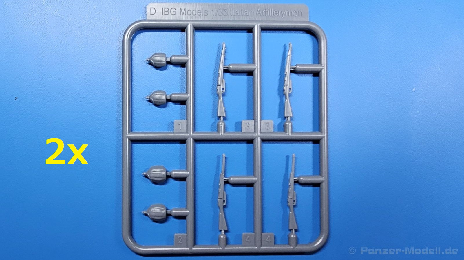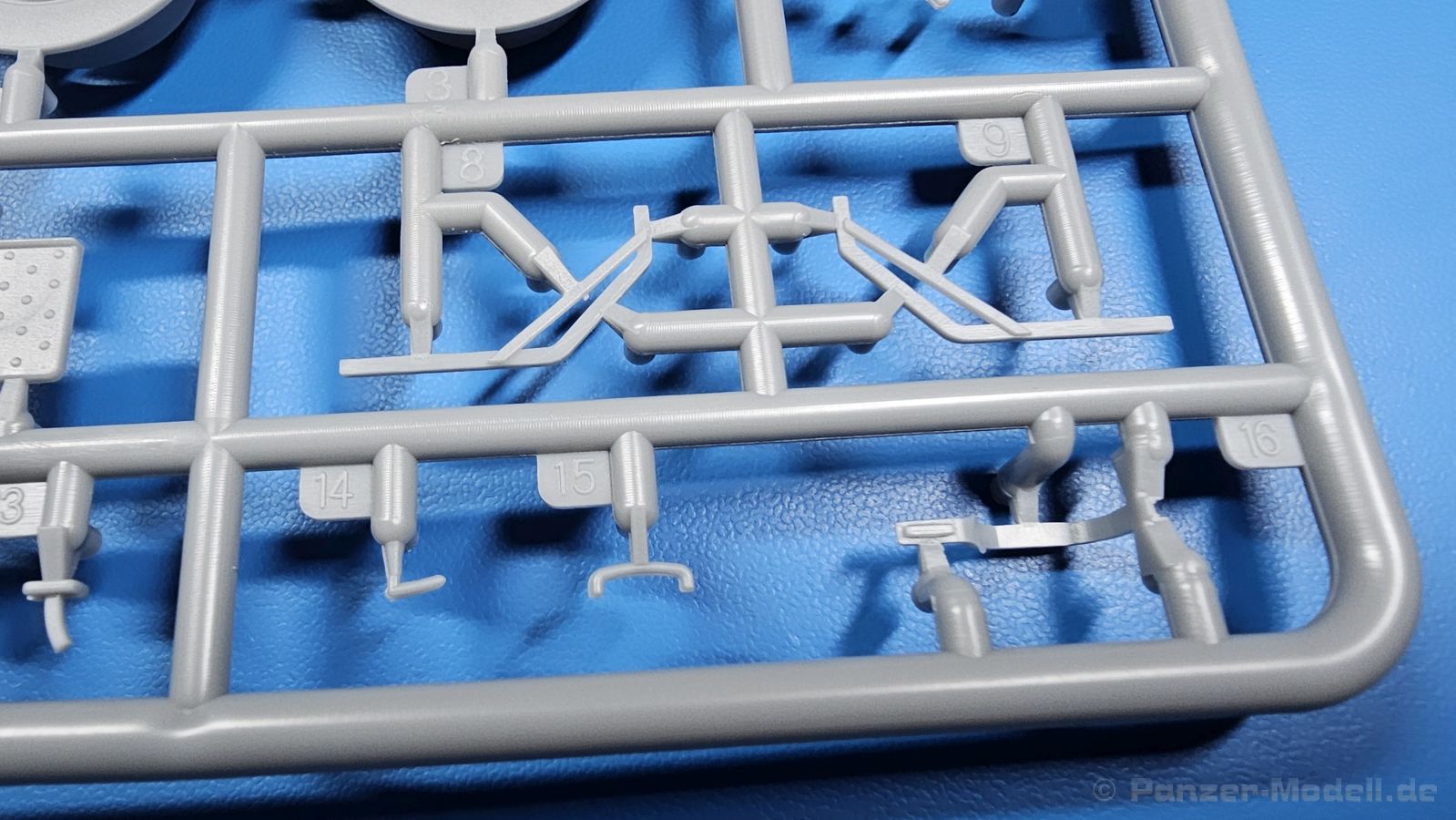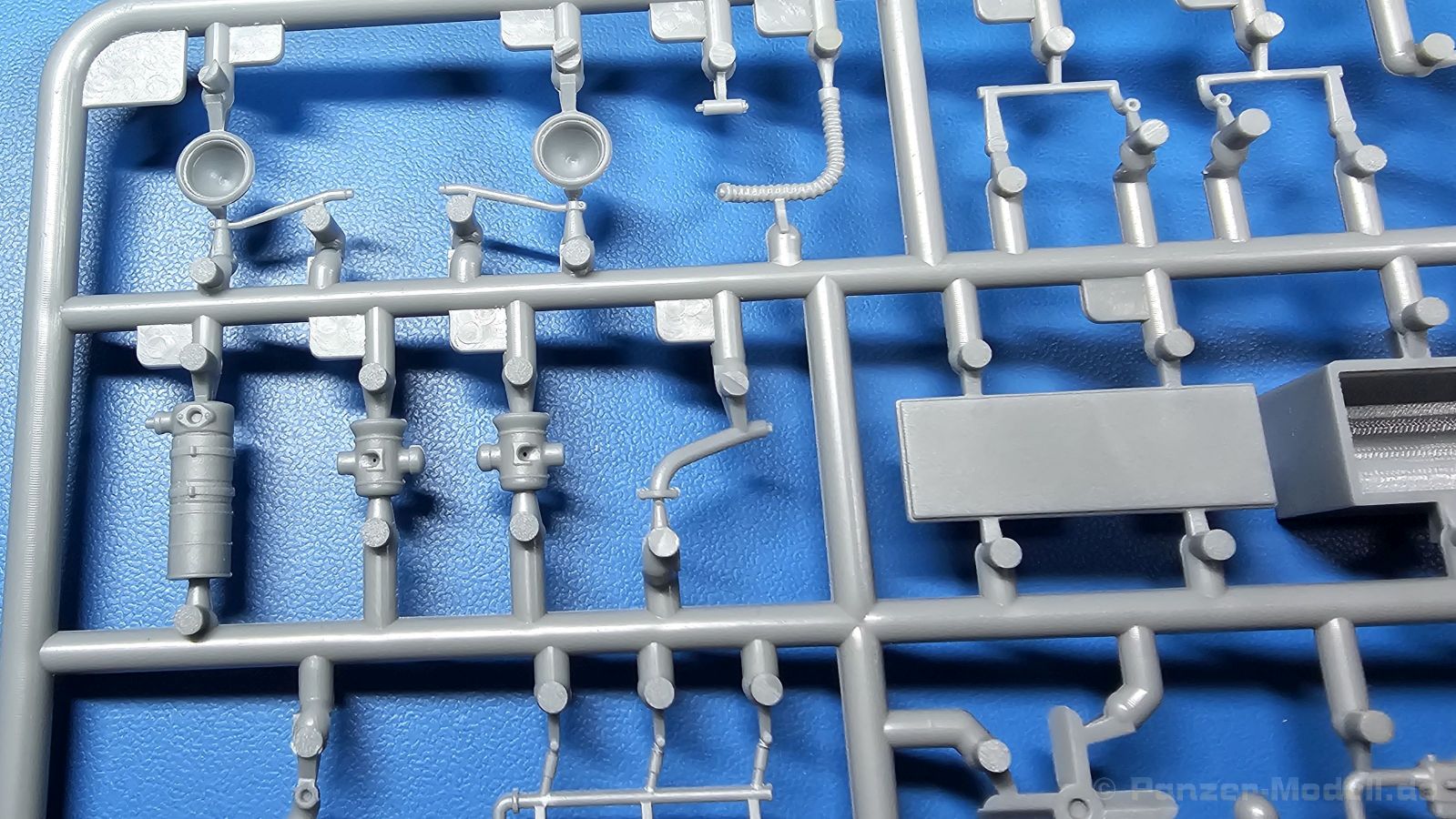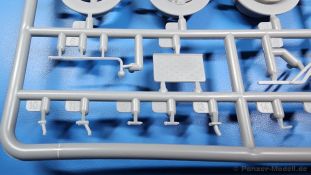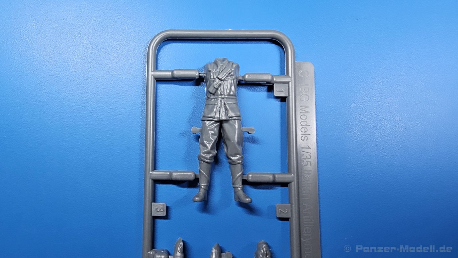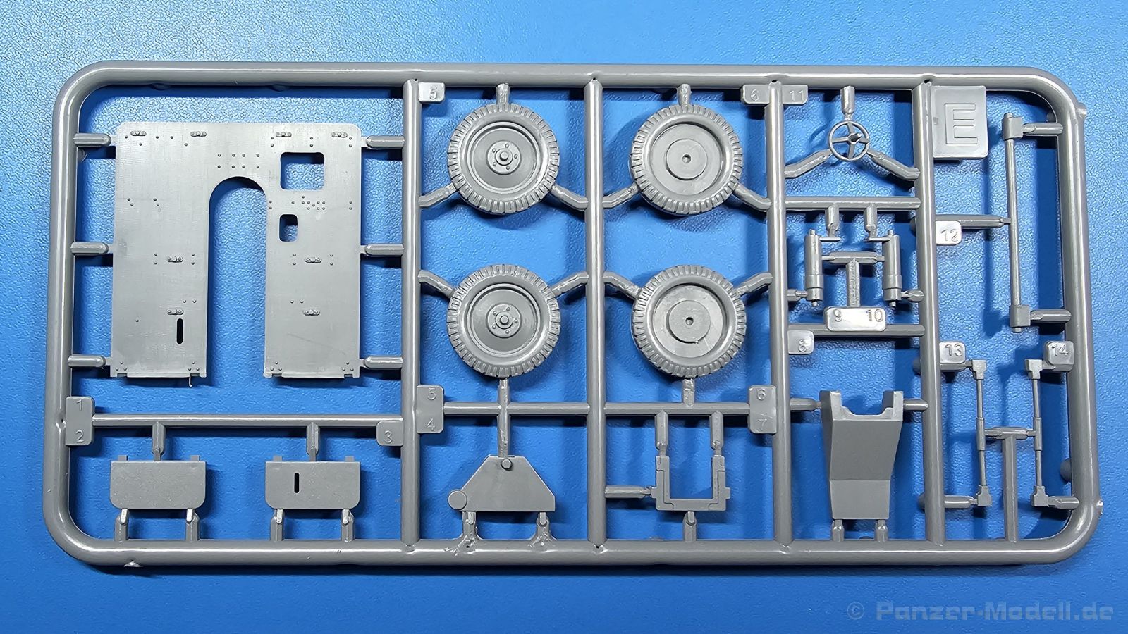 Das Original: Der Lancia 3RO war ein schwerer, italienischer Lkw, basierend auf dem Lancia RO. Er wurde ab 1939 bis 1950 produziert und war bis in die 1960-er Jahre im Einsatz. Mit seinem 93 PS Motor konnte er bis zu 45 km/h erreichen. Als Truppentransporter konnte er bis zu 32 Soldaten transportieren Es wurden aber auch Panzer und Pferde befördert. Mit einer anderen Plattform diente er auch als bewegliche Artillerie und Flugabwehr mit entsprechend montierten Geschützen. Der Lancia fand sowohl zivile als auch militärische Abnehmer. Neben der italienischen Armee nutzte ihn auch die deutsche Wehrmacht. Der Bausatz: Der Lancia 3RO mit 100 mm Haubitze von IBG hat Zuwachs in Form von Figuren bekommen. Das Fahrzeug wurde bereits unter der Nummer 35053 im Dezember 2018 herausgebracht und war schon damals eine hochdetailliertes Modell. Nun spendiert IBG eine Fahrzeugbesatzung in Form eines Fahrers, eines Offiziers und zwei Geschützbedienern dazu. Im 405 x 255 x 60 mm großen Karton finden wir 16 graue, einen klaren Spritzling, 7 Plastikreifen, 1 PE-Platine, Naßschiebebilder und ein Metallrohr für das Fahrzeug und 5 graue Spritzlinge für die Figuren und deren Waffen und Ausrüstung. Ich habe noch einen weiteren Klarsichtspritzling mit Windschutzscheiben im Karton gefunden, der aber für dieses Modell weder gebraucht noch in der Übersicht aufgeführt wird. Die Teile aus Plastik sind sauber ausgespritzt, ohne Grat und Versatz. Angüsse sind so gesetzt, dass Details in der Regel nicht beeinträchtigt werden. Unnötige oder störende Auswerferspuren sind mir nicht aufgefallen. Also, alles in allem sollte man die Teile vom Spritzling ohne viel Nacharbeit bekommen. Hier und da ist feiner Grat zu sehen, der sich leicht entfernen lassen sollte. Die Details des Geschützes sind etwas weicher als die des Lkws. An den Spritzlingen des Geschützes tauchen einige Sinkstellen auf, die sich zum Glück meist nur auf den Gießästen befinden, aber leider doch auch auf wenigen Teilen wie z.B. dem Verschlussblock. Da der Lkw bereits bekannt ist, starten wir diesmal mit den Figuren. Von Spritzguss kann man nicht so scharfe Details wie bei Resinguss oder 3D-Druck erwarten, aber dennoch kommen die typischen italienischen Uniformen gut zur Geltung. Die Gesichtszüge sind etwas schwammig, aber deutlich erkennbar, so dass man Unterschiede zwischen den Gesichtern erkennen kann. Für den Offizier gibt es acht Teile – Beine, Rumpf, Kopf, Tropenhelm, Pistolentasche und Arme. An der linken Hand ist ein großes Megaphon angegossen, dem man ggfs. die Sprechöffnung aufbohren könnte. An der linken Hand befindet sich eine kurzstielige Pfeife. Knöpfe und aufgesetzte Taschen der Uniform treten deutlich hervor. Der Offizier ist der Einzige, der kniehohe Stiefel trägt. Der stehende Kanonier kommt mit drei Teilen aus; Beine und Rumpf bilden ein Teil, dazu kommt der Kopf und die zusammengegossenen, vor der Brust gekreuzten Arme. An den Füssen trägt er Gamaschenschnürschuhe. Die Schnürung ist angedeutet, aber etwas undeutlich. Der sitzende Kanonier besteht aus Kopf, Tropenhelm, Armen und dem Rest. Der Kanonier soll rechts am Geschütz sitzen, die Arme suggerieren, dass er die Handräder bedient. Man muss beim Bau sehen, ob er deswegen nicht vielleicht doch lieber links sitzen sollte. Zu guter Letzt wäre da noch der Fahrer. Er hat zwei Köpfe zur Auswahl – einen mit angegossenem Schiffchen und einen mit separatem Tropenhelm. Auch beim ihm bilden Beine und Rumpf ein Teil. Es gibt vier Arme, von denen aber nur zwei für seine Fahrertätigkeit notwendig sind. Die beiden anderen könnte man ggfs. verwenden, wenn man ihm eine Aufgabe als Geschützbedienung zuweisen möchte. Das müsste man Bau prüfen, ob das so geht wie gedacht. Fahrer und stehender Kanonier haben schräg vor der Brust Patronentaschen angegossen. Ein Spritzling mit vier Waffen und Wasserflaschen steht zur freien Verfügung, da in der Anleitung nichts darüber ausgesagt wird. Bei den Waffen handelt es sich offensichtlich um je 2 Carcano Karabiner Terni und 2 Gebirgsstutzen 65mm. Die Ladehebel sind gut herausgearbeitet, die Abzugsbügel durchbrochen mit freistehendem Abzug. Bei den Gebirgsstutzen sollte auch das Teil unter dem Lauf durchbrochen sein, da es sich wohl um ein eingeklappten Zweibein handelt, aber da behilft man sich dann selbst. Die Figuren bringen Leben in das Fahrzeug. Wenn jetzt noch etwas mehr Ausrüstung dabei gewesen wäre… Der Fahrzeugrahmen besteht wie bei den anderen 3RO aus separaten Längs- und Querträgern mit relativ vielen Teilen, die sauber und ordentlich in jeweils exakt gerade Ausrichtung gebracht werden müssen. Es gibt sehr viele, teils aus Fotoätzteilen bestehende, teils auch filigrane, Anbauteile, die alle ihren Platz finden wollen. Die Vorder- und Hinterachse sind gut detailliert und mit recht wenigen Teilen baubar. Leider lässt sich bei der Vorderachse kein Lenkeinschlag bauen, zumindest nicht aus dem Kasten (der findige Modellbauer wird aber sicher eine Möglichkeit finden). Die Blattfedern machen eine sehr guten Eindruck. Jedes Federblatt ist sauber erkennbar. Die Blattfedern stützen die Achsen am Rahmen ab.