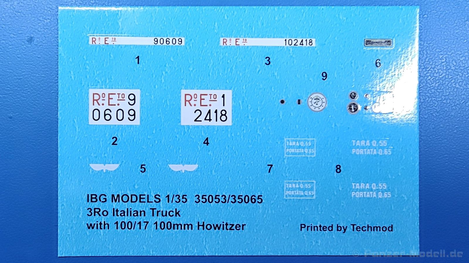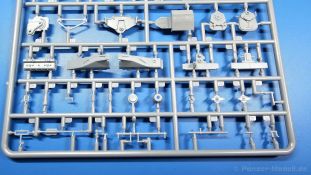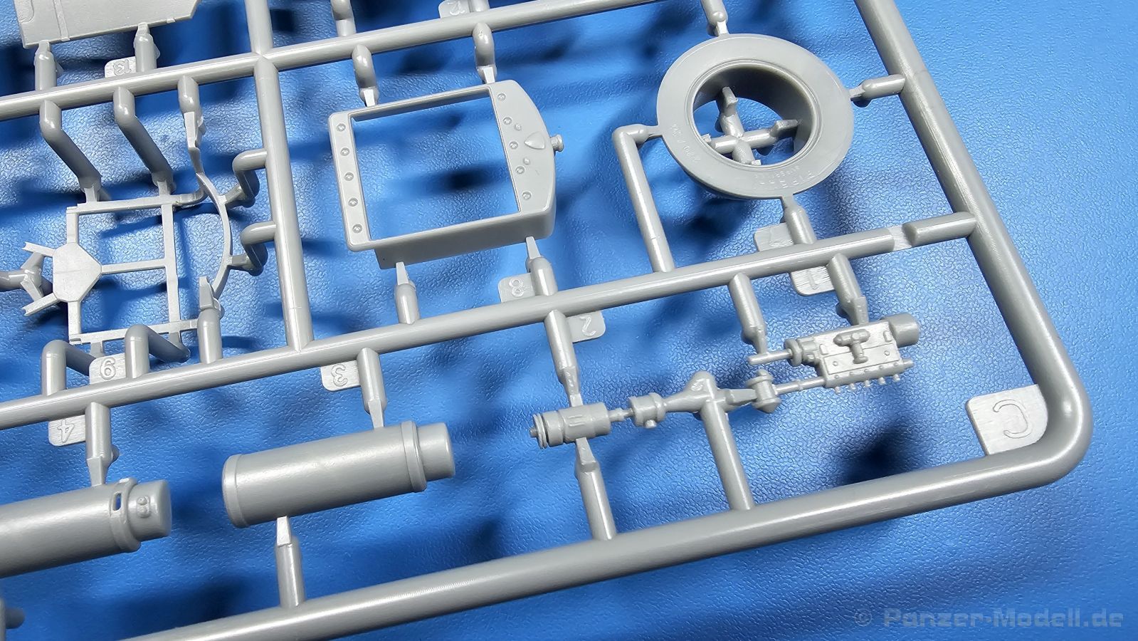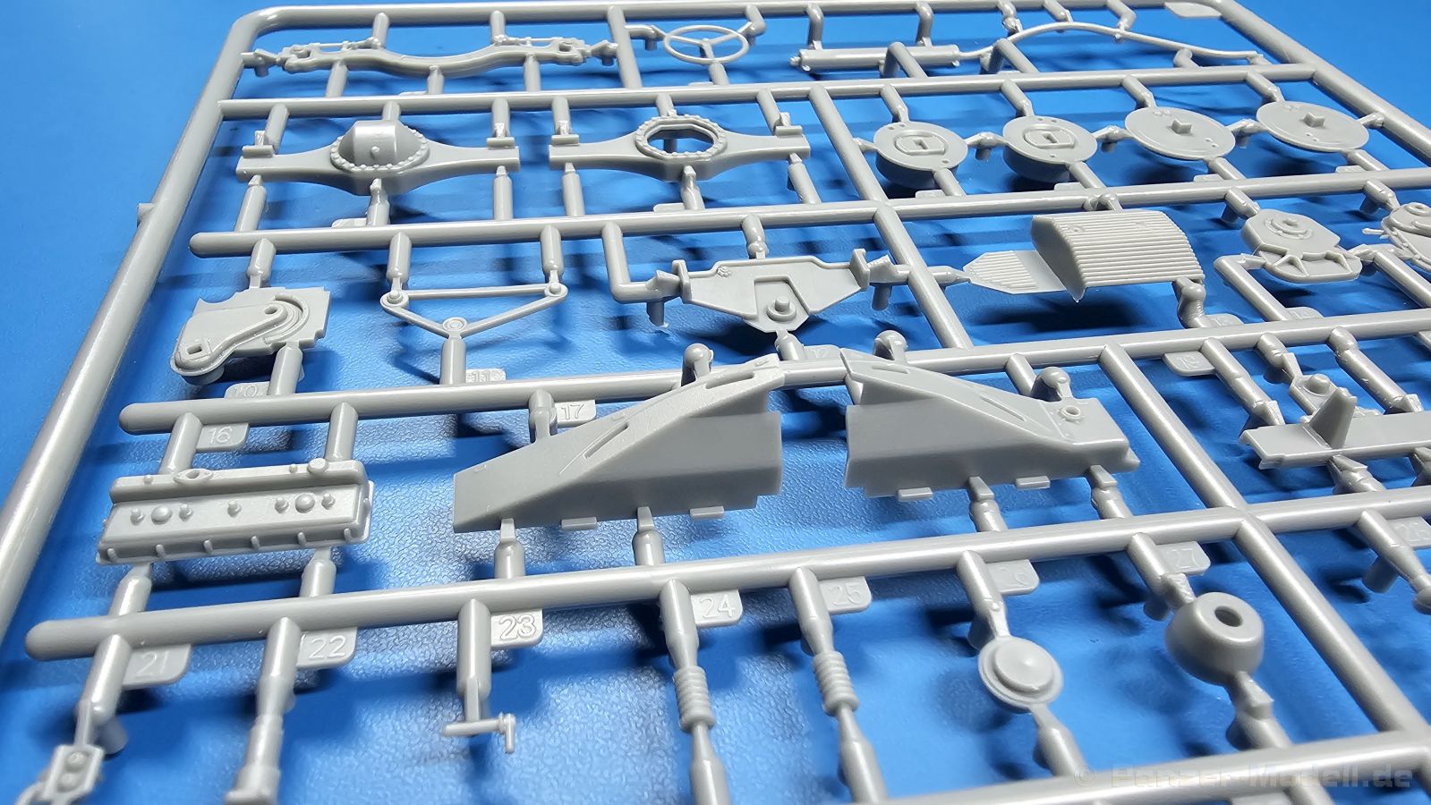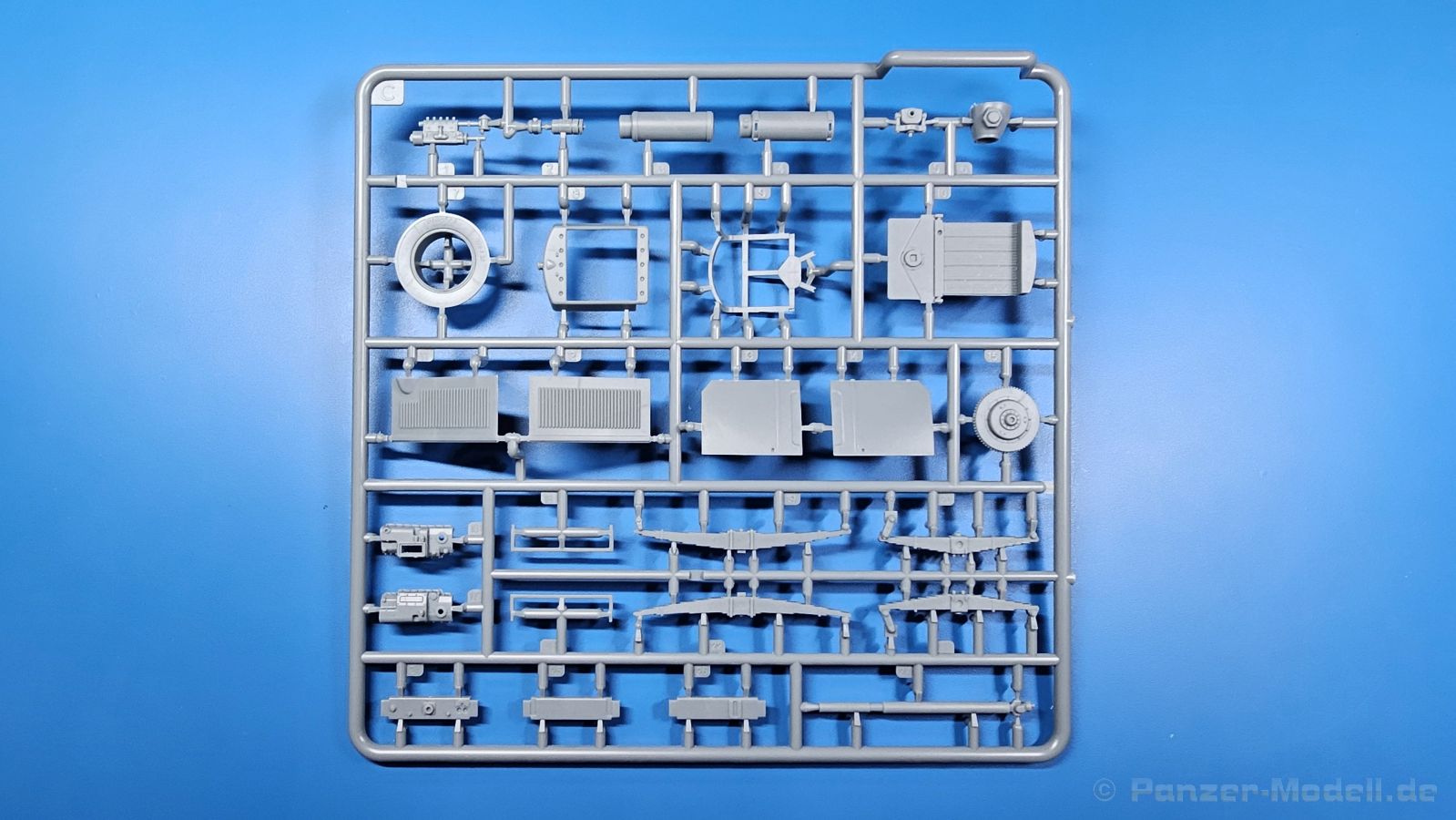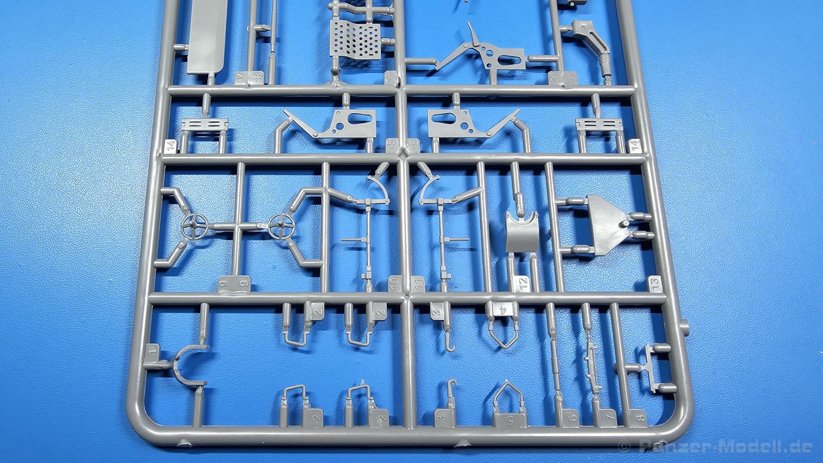 Das Original: Der Lancia 3RO war ein schwerer, italienischer Lkw, basierend auf dem Lancia RO. Er wurde ab 1939 bis 1950 produziert und war bis in die 1960-er Jahre im Einsatz. Mit seinem 93 PS Motor konnte er bis zu 45 km/h erreichen. Als Truppentransporter konnte er bis zu 32 Soldaten transportieren Es wurden aber auch Panzer und Pferde befördert. Mit einer anderen Plattform diente er auch als bewegliche Artillerie und Flugabwehr mit entsprechend montierten Geschützen. Der Lancia fand sowohl zivile als auch militärische Abnehmer. Neben der italienischen Armee nutzte ihn auch die deutsche Wehrmacht. Der Bausatz: Der Lancia 3RO mit 100 mm Haubitze von IBG hat Zuwachs in Form von Figuren bekommen. Das Fahrzeug wurde bereits unter der Nummer 35053 im Dezember 2018 herausgebracht und war schon damals eine hochdetailliertes Modell. Nun spendiert IBG eine Fahrzeugbesatzung in Form eines Fahrers, eines Offiziers und zwei Geschützbedienern dazu. Im 405 x 255 x 60 mm großen Karton finden wir 16 graue, einen klaren Spritzling, 7 Plastikreifen, 1 PE-Platine, Naßschiebebilder und ein Metallrohr für das Fahrzeug und 5 graue Spritzlinge für die Figuren und deren Waffen und Ausrüstung. Ich habe noch einen weiteren Klarsichtspritzling mit Windschutzscheiben im Karton gefunden, der aber für dieses Modell weder gebraucht noch in der Übersicht aufgeführt wird. Die Teile aus Plastik sind sauber ausgespritzt, ohne Grat und Versatz. Angüsse sind so gesetzt, dass Details in der Regel nicht beeinträchtigt werden. Unnötige oder störende Auswerferspuren sind mir nicht aufgefallen. Also, alles in allem sollte man die Teile vom Spritzling ohne viel Nacharbeit bekommen. Hier und da ist feiner Grat zu sehen, der sich leicht entfernen lassen sollte. Die Details des Geschützes sind etwas weicher als die des Lkws. An den Spritzlingen des Geschützes tauchen einige Sinkstellen auf, die sich zum Glück meist nur auf den Gießästen befinden, aber leider doch auch auf wenigen Teilen wie z.B. dem Verschlussblock. Da der Lkw bereits bekannt ist, starten wir diesmal mit den Figuren. Von Spritzguss kann man nicht so scharfe Details wie bei Resinguss oder 3D-Druck erwarten, aber dennoch kommen die typischen italienischen Uniformen gut zur Geltung. Die Gesichtszüge sind etwas schwammig, aber deutlich erkennbar, so dass man Unterschiede zwischen den Gesichtern erkennen kann. Für den Offizier gibt es acht Teile – Beine, Rumpf, Kopf, Tropenhelm, Pistolentasche und Arme. An der linken Hand ist ein großes Megaphon angegossen, dem man ggfs. die Sprechöffnung aufbohren könnte. An der linken Hand befindet sich eine kurzstielige Pfeife. Knöpfe und aufgesetzte Taschen der Uniform treten deutlich hervor. Der Offizier ist der Einzige, der kniehohe Stiefel trägt. Der stehende Kanonier kommt mit drei Teilen aus; Beine und Rumpf bilden ein Teil, dazu kommt der Kopf und die zusammengegossenen, vor der Brust gekreuzten Arme. An den Füssen trägt er Gamaschenschnürschuhe. Die Schnürung ist angedeutet, aber etwas undeutlich. Der sitzende Kanonier besteht aus Kopf, Tropenhelm, Armen und dem Rest. Der Kanonier soll rechts am Geschütz sitzen, die Arme suggerieren, dass er die Handräder bedient. Man muss beim Bau sehen, ob er deswegen nicht vielleicht doch lieber links sitzen sollte. Zu guter Letzt wäre da noch der Fahrer. Er hat zwei Köpfe zur Auswahl – einen mit angegossenem Schiffchen und einen mit separatem Tropenhelm. Auch beim ihm bilden Beine und Rumpf ein Teil. Es gibt vier Arme, von denen aber nur zwei für seine Fahrertätigkeit notwendig sind. Die beiden anderen könnte man ggfs. verwenden, wenn man ihm eine Aufgabe als Geschützbedienung zuweisen möchte. Das müsste man Bau prüfen, ob das so geht wie gedacht. Fahrer und stehender Kanonier haben schräg vor der Brust Patronentaschen angegossen. Ein Spritzling mit vier Waffen und Wasserflaschen steht zur freien Verfügung, da in der Anleitung nichts darüber ausgesagt wird. Bei den Waffen handelt es sich offensichtlich um je 2 Carcano Karabiner Terni und 2 Gebirgsstutzen 65mm. Die Ladehebel sind gut herausgearbeitet, die Abzugsbügel durchbrochen mit freistehendem Abzug. Bei den Gebirgsstutzen sollte auch das Teil unter dem Lauf durchbrochen sein, da es sich wohl um ein eingeklappten Zweibein handelt, aber da behilft man sich dann selbst. Die Figuren bringen Leben in das Fahrzeug. Wenn jetzt noch etwas mehr Ausrüstung dabei gewesen wäre… Der Fahrzeugrahmen besteht wie bei den anderen 3RO aus separaten Längs- und Querträgern mit relativ vielen Teilen, die sauber und ordentlich in jeweils exakt gerade Ausrichtung gebracht werden müssen. Es gibt sehr viele, teils aus Fotoätzteilen bestehende, teils auch filigrane, Anbauteile, die alle ihren Platz finden wollen. Die Vorder- und Hinterachse sind gut detailliert und mit recht wenigen Teilen baubar. Leider lässt sich bei der Vorderachse kein Lenkeinschlag bauen, zumindest nicht aus dem Kasten (der findige Modellbauer wird aber sicher eine Möglichkeit finden). Die Blattfedern machen eine sehr guten Eindruck. Jedes Federblatt ist sauber erkennbar. Die Blattfedern stützen die Achsen am Rahmen ab.