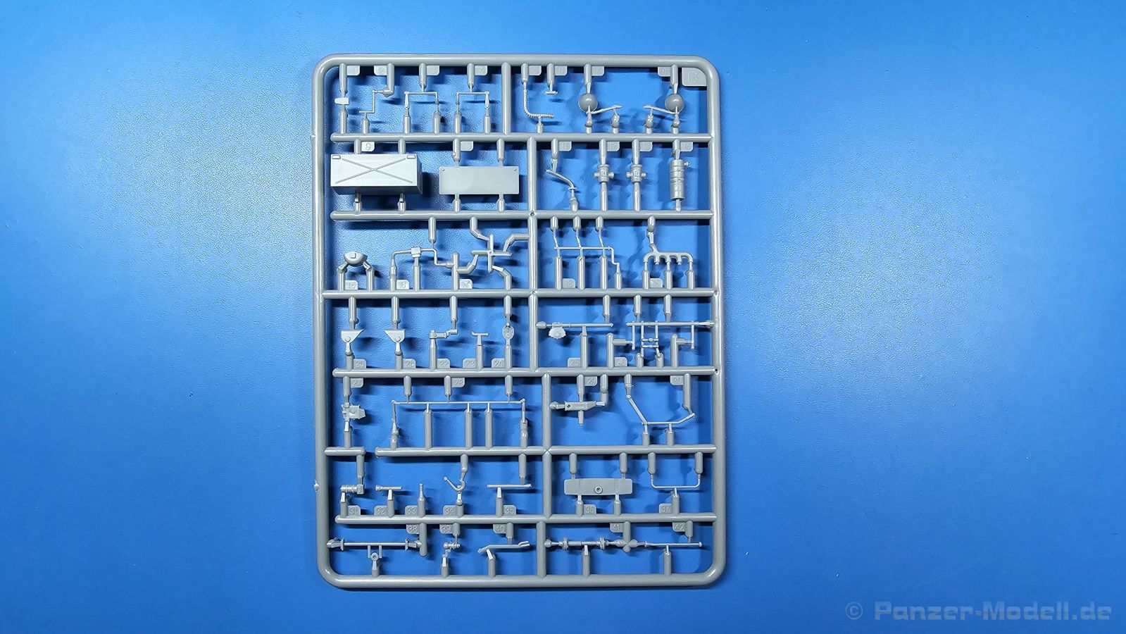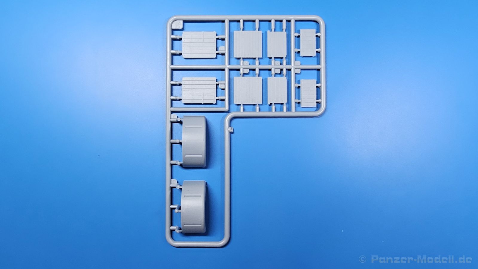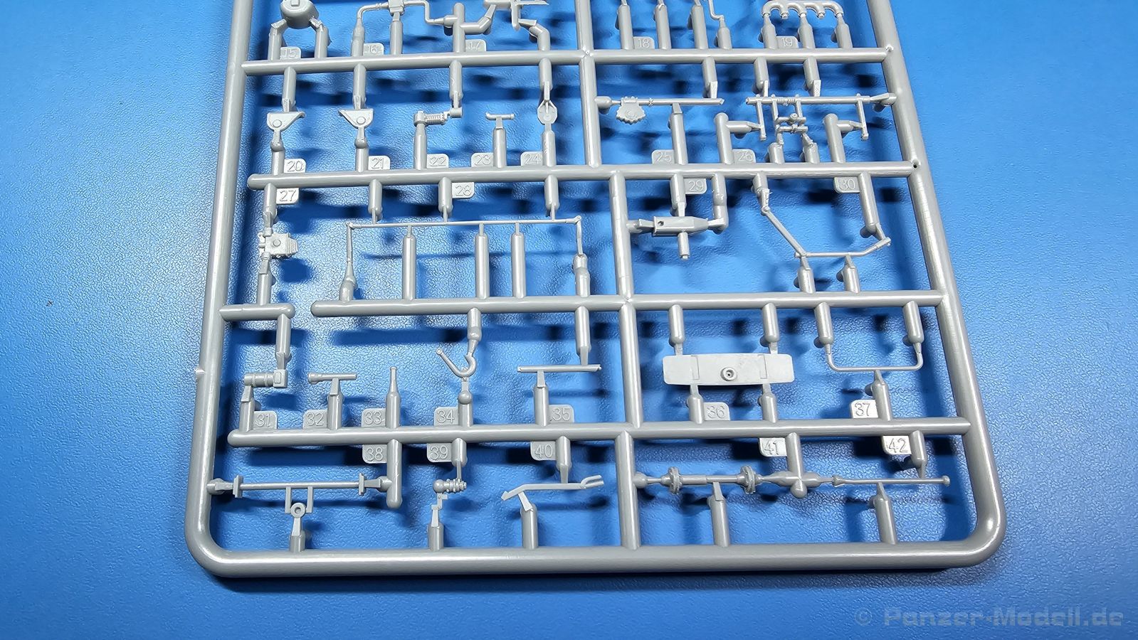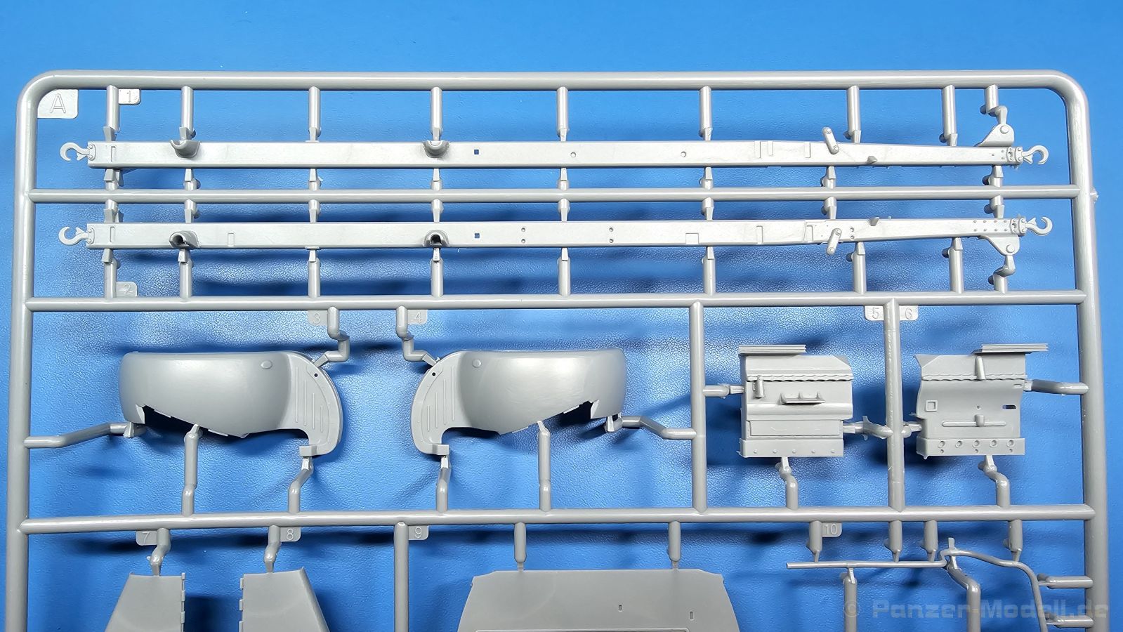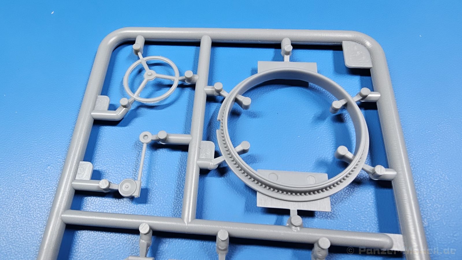 Das Original: Der Lancia 3RO war ein schwerer, italienischer Lkw, basierend auf dem Lancia RO. Er wurde ab 1939 bis 1950 produziert und war bis in die 1960-er Jahre im Einsatz. Mit seinem 93 PS Motor konnte er bis zu 45 km/h erreichen. Als Truppentransporter konnte er bis zu 32 Soldaten transportieren Es wurden aber auch Panzer und Pferde befördert. Mit einer anderen Plattform diente er auch als bewegliche Artillerie und Flugabwehr mit entsprechend montierten Geschützen. Der Lancia fand sowohl zivile als auch militärische Abnehmer. Neben der italienischen Armee nutzte ihn auch die deutsche Wehrmacht. Der Bausatz: Der Lancia 3RO mit 100 mm Haubitze von IBG hat Zuwachs in Form von Figuren bekommen. Das Fahrzeug wurde bereits unter der Nummer 35053 im Dezember 2018 herausgebracht und war schon damals eine hochdetailliertes Modell. Nun spendiert IBG eine Fahrzeugbesatzung in Form eines Fahrers, eines Offiziers und zwei Geschützbedienern dazu. Im 405 x 255 x 60 mm großen Karton finden wir 16 graue, einen klaren Spritzling, 7 Plastikreifen, 1 PE-Platine, Naßschiebebilder und ein Metallrohr für das Fahrzeug und 5 graue Spritzlinge für die Figuren und deren Waffen und Ausrüstung. Ich habe noch einen weiteren Klarsichtspritzling mit Windschutzscheiben im Karton gefunden, der aber für dieses Modell weder gebraucht noch in der Übersicht aufgeführt wird. Die Teile aus Plastik sind sauber ausgespritzt, ohne Grat und Versatz. Angüsse sind so gesetzt, dass Details in der Regel nicht beeinträchtigt werden. Unnötige oder störende Auswerferspuren sind mir nicht aufgefallen. Also, alles in allem sollte man die Teile vom Spritzling ohne viel Nacharbeit bekommen. Hier und da ist feiner Grat zu sehen, der sich leicht entfernen lassen sollte. Die Details des Geschützes sind etwas weicher als die des Lkws. An den Spritzlingen des Geschützes tauchen einige Sinkstellen auf, die sich zum Glück meist nur auf den Gießästen befinden, aber leider doch auch auf wenigen Teilen wie z.B. dem Verschlussblock. Da der Lkw bereits bekannt ist, starten wir diesmal mit den Figuren. Von Spritzguss kann man nicht so scharfe Details wie bei Resinguss oder 3D-Druck erwarten, aber dennoch kommen die typischen italienischen Uniformen gut zur Geltung. Die Gesichtszüge sind etwas schwammig, aber deutlich erkennbar, so dass man Unterschiede zwischen den Gesichtern erkennen kann. Für den Offizier gibt es acht Teile – Beine, Rumpf, Kopf, Tropenhelm, Pistolentasche und Arme. An der linken Hand ist ein großes Megaphon angegossen, dem man ggfs. die Sprechöffnung aufbohren könnte. An der linken Hand befindet sich eine kurzstielige Pfeife. Knöpfe und aufgesetzte Taschen der Uniform treten deutlich hervor. Der Offizier ist der Einzige, der kniehohe Stiefel trägt. Der stehende Kanonier kommt mit drei Teilen aus; Beine und Rumpf bilden ein Teil, dazu kommt der Kopf und die zusammengegossenen, vor der Brust gekreuzten Arme. An den Füssen trägt er Gamaschenschnürschuhe. Die Schnürung ist angedeutet, aber etwas undeutlich. Der sitzende Kanonier besteht aus Kopf, Tropenhelm, Armen und dem Rest. Der Kanonier soll rechts am Geschütz sitzen, die Arme suggerieren, dass er die Handräder bedient. Man muss beim Bau sehen, ob er deswegen nicht vielleicht doch lieber links sitzen sollte. Zu guter Letzt wäre da noch der Fahrer. Er hat zwei Köpfe zur Auswahl – einen mit angegossenem Schiffchen und einen mit separatem Tropenhelm. Auch beim ihm bilden Beine und Rumpf ein Teil. Es gibt vier Arme, von denen aber nur zwei für seine Fahrertätigkeit notwendig sind. Die beiden anderen könnte man ggfs. verwenden, wenn man ihm eine Aufgabe als Geschützbedienung zuweisen möchte. Das müsste man Bau prüfen, ob das so geht wie gedacht. Fahrer und stehender Kanonier haben schräg vor der Brust Patronentaschen angegossen. Ein Spritzling mit vier Waffen und Wasserflaschen steht zur freien Verfügung, da in der Anleitung nichts darüber ausgesagt wird. Bei den Waffen handelt es sich offensichtlich um je 2 Carcano Karabiner Terni und 2 Gebirgsstutzen 65mm. Die Ladehebel sind gut herausgearbeitet, die Abzugsbügel durchbrochen mit freistehendem Abzug. Bei den Gebirgsstutzen sollte auch das Teil unter dem Lauf durchbrochen sein, da es sich wohl um ein eingeklappten Zweibein handelt, aber da behilft man sich dann selbst. Die Figuren bringen Leben in das Fahrzeug. Wenn jetzt noch etwas mehr Ausrüstung dabei gewesen wäre… Der Fahrzeugrahmen besteht wie bei den anderen 3RO aus separaten Längs- und Querträgern mit relativ vielen Teilen, die sauber und ordentlich in jeweils exakt gerade Ausrichtung gebracht werden müssen. Es gibt sehr viele, teils aus Fotoätzteilen bestehende, teils auch filigrane, Anbauteile, die alle ihren Platz finden wollen. Die Vorder- und Hinterachse sind gut detailliert und mit recht wenigen Teilen baubar. Leider lässt sich bei der Vorderachse kein Lenkeinschlag bauen, zumindest nicht aus dem Kasten (der findige Modellbauer wird aber sicher eine Möglichkeit finden). Die Blattfedern machen eine sehr guten Eindruck. Jedes Federblatt ist sauber erkennbar. Die Blattfedern stützen die Achsen am Rahmen ab.
