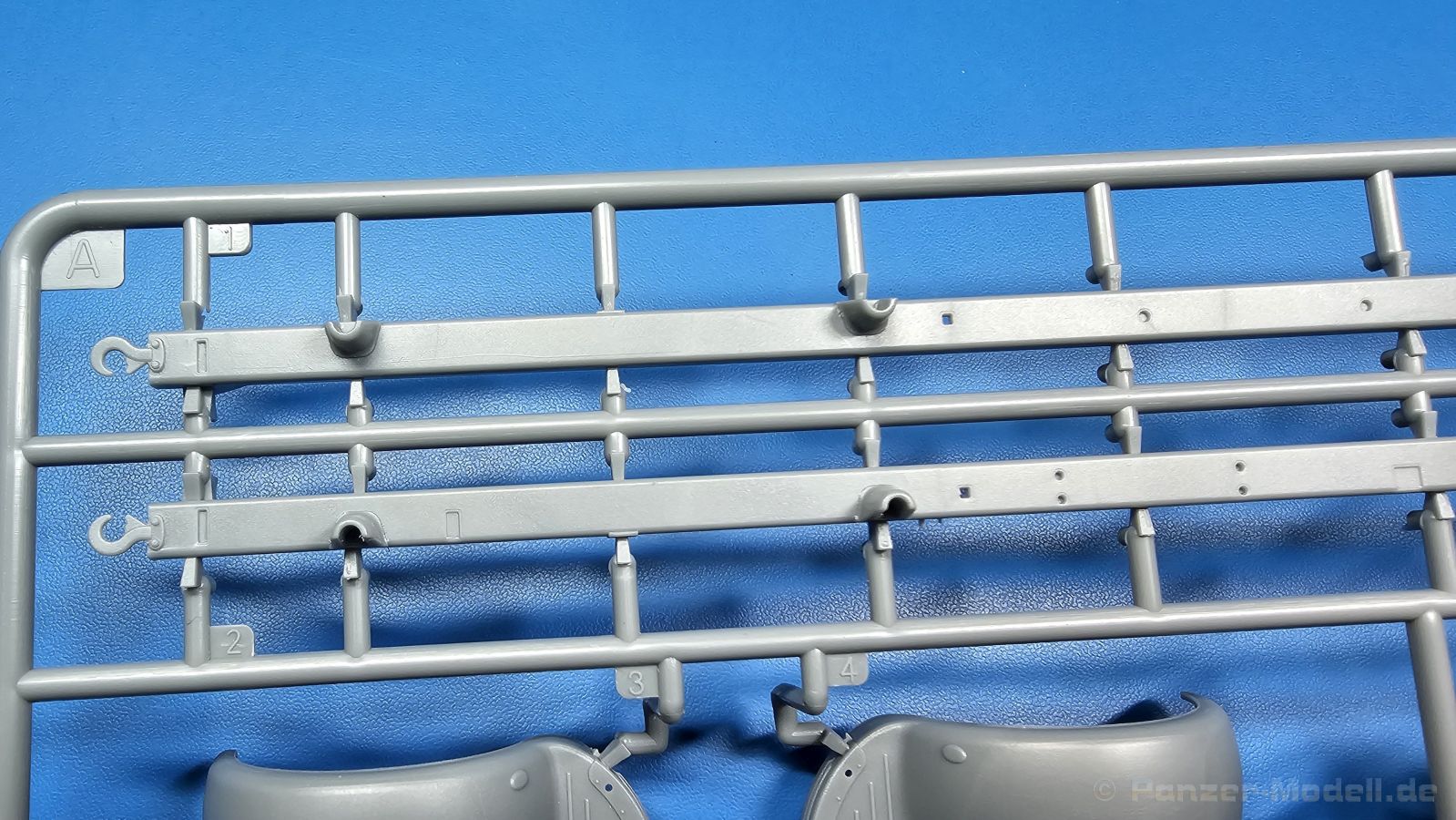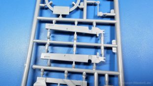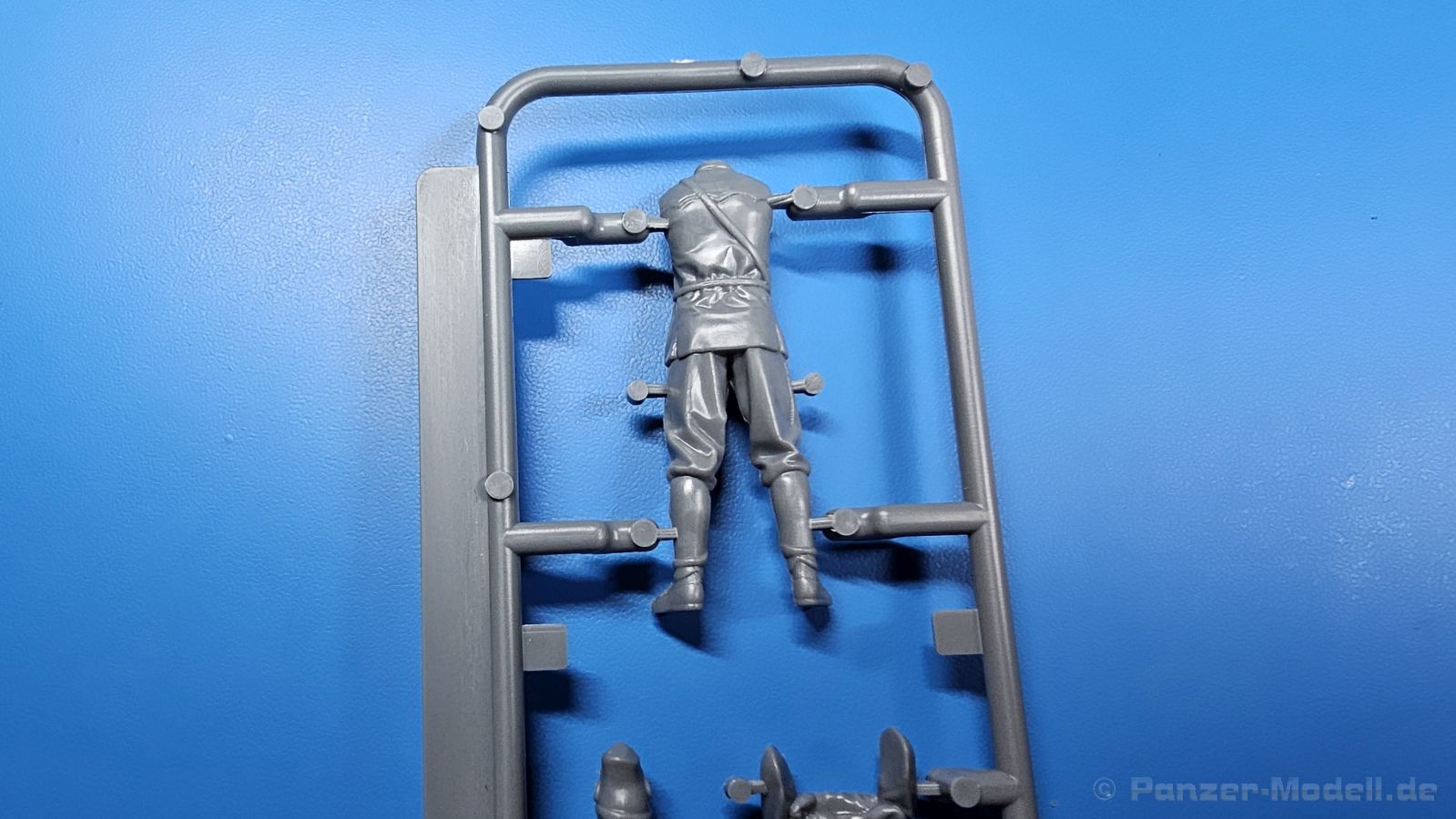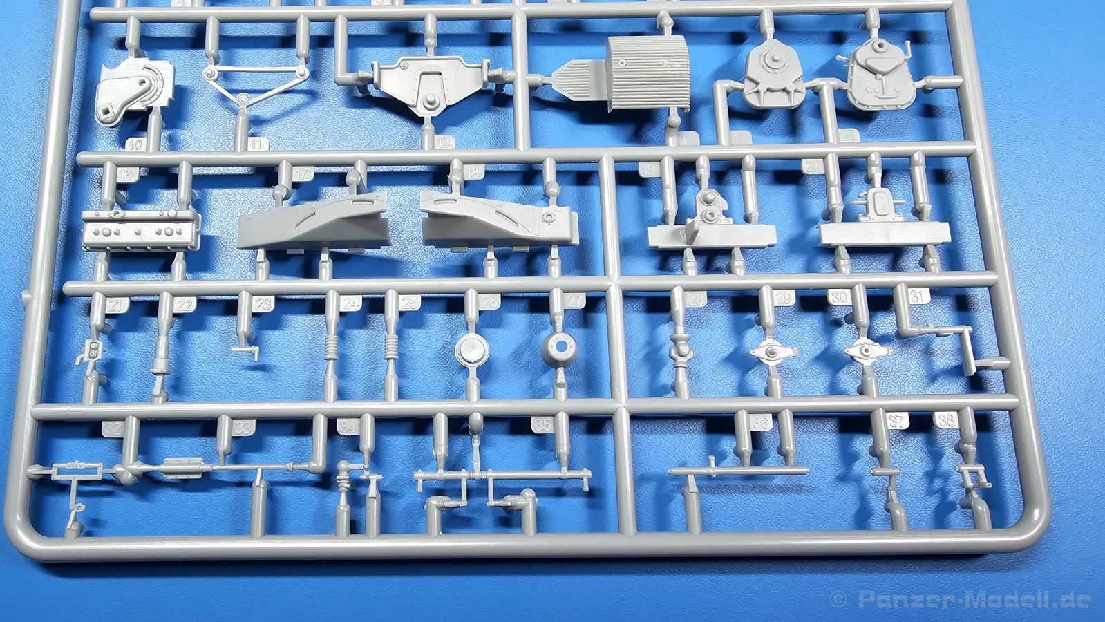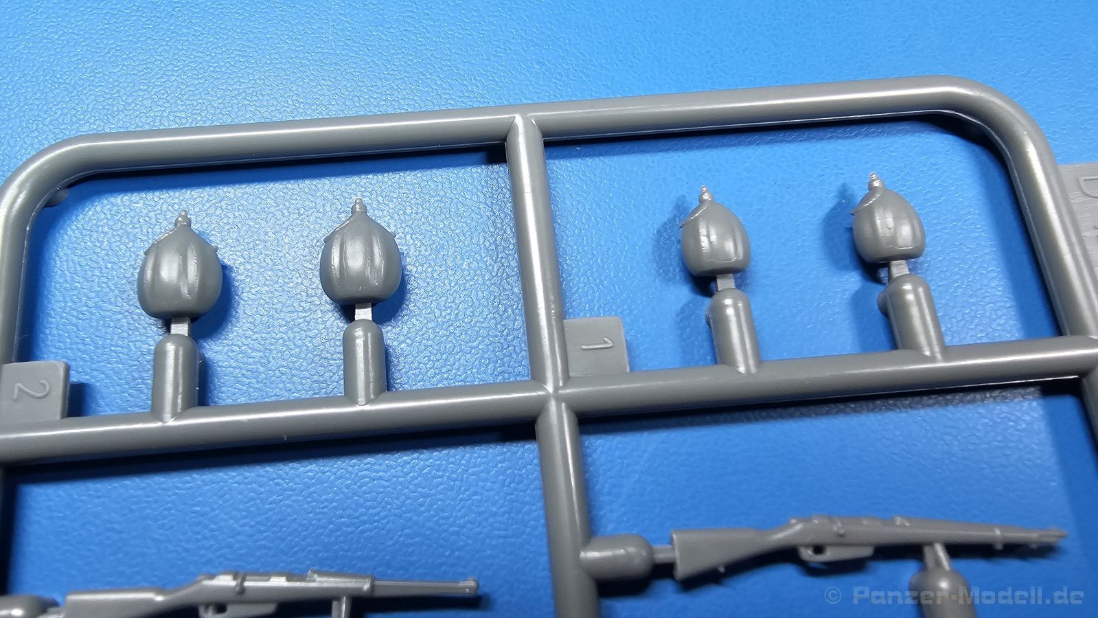 Das Original: Der Lancia 3RO war ein schwerer, italienischer Lkw, basierend auf dem Lancia RO. Er wurde ab 1939 bis 1950 produziert und war bis in die 1960-er Jahre im Einsatz. Mit seinem 93 PS Motor konnte er bis zu 45 km/h erreichen. Als Truppentransporter konnte er bis zu 32 Soldaten transportieren Es wurden aber auch Panzer und Pferde befördert. Mit einer anderen Plattform diente er auch als bewegliche Artillerie und Flugabwehr mit entsprechend montierten Geschützen. Der Lancia fand sowohl zivile als auch militärische Abnehmer. Neben der italienischen Armee nutzte ihn auch die deutsche Wehrmacht. Der Bausatz: Der Lancia 3RO mit 100 mm Haubitze von IBG hat Zuwachs in Form von Figuren bekommen. Das Fahrzeug wurde bereits unter der Nummer 35053 im Dezember 2018 herausgebracht und war schon damals eine hochdetailliertes Modell. Nun spendiert IBG eine Fahrzeugbesatzung in Form eines Fahrers, eines Offiziers und zwei Geschützbedienern dazu. Im 405 x 255 x 60 mm großen Karton finden wir 16 graue, einen klaren Spritzling, 7 Plastikreifen, 1 PE-Platine, Naßschiebebilder und ein Metallrohr für das Fahrzeug und 5 graue Spritzlinge für die Figuren und deren Waffen und Ausrüstung. Ich habe noch einen weiteren Klarsichtspritzling mit Windschutzscheiben im Karton gefunden, der aber für dieses Modell weder gebraucht noch in der Übersicht aufgeführt wird. Die Teile aus Plastik sind sauber ausgespritzt, ohne Grat und Versatz. Angüsse sind so gesetzt, dass Details in der Regel nicht beeinträchtigt werden. Unnötige oder störende Auswerferspuren sind mir nicht aufgefallen. Also, alles in allem sollte man die Teile vom Spritzling ohne viel Nacharbeit bekommen. Hier und da ist feiner Grat zu sehen, der sich leicht entfernen lassen sollte. Die Details des Geschützes sind etwas weicher als die des Lkws. An den Spritzlingen des Geschützes tauchen einige Sinkstellen auf, die sich zum Glück meist nur auf den Gießästen befinden, aber leider doch auch auf wenigen Teilen wie z.B. dem Verschlussblock. Da der Lkw bereits bekannt ist, starten wir diesmal mit den Figuren. Von Spritzguss kann man nicht so scharfe Details wie bei Resinguss oder 3D-Druck erwarten, aber dennoch kommen die typischen italienischen Uniformen gut zur Geltung. Die Gesichtszüge sind etwas schwammig, aber deutlich erkennbar, so dass man Unterschiede zwischen den Gesichtern erkennen kann. Für den Offizier gibt es acht Teile – Beine, Rumpf, Kopf, Tropenhelm, Pistolentasche und Arme. An der linken Hand ist ein großes Megaphon angegossen, dem man ggfs. die Sprechöffnung aufbohren könnte. An der linken Hand befindet sich eine kurzstielige Pfeife. Knöpfe und aufgesetzte Taschen der Uniform treten deutlich hervor. Der Offizier ist der Einzige, der kniehohe Stiefel trägt. Der stehende Kanonier kommt mit drei Teilen aus; Beine und Rumpf bilden ein Teil, dazu kommt der Kopf und die zusammengegossenen, vor der Brust gekreuzten Arme. An den Füssen trägt er Gamaschenschnürschuhe. Die Schnürung ist angedeutet, aber etwas undeutlich. Der sitzende Kanonier besteht aus Kopf, Tropenhelm, Armen und dem Rest. Der Kanonier soll rechts am Geschütz sitzen, die Arme suggerieren, dass er die Handräder bedient. Man muss beim Bau sehen, ob er deswegen nicht vielleicht doch lieber links sitzen sollte. Zu guter Letzt wäre da noch der Fahrer. Er hat zwei Köpfe zur Auswahl – einen mit angegossenem Schiffchen und einen mit separatem Tropenhelm. Auch beim ihm bilden Beine und Rumpf ein Teil. Es gibt vier Arme, von denen aber nur zwei für seine Fahrertätigkeit notwendig sind. Die beiden anderen könnte man ggfs. verwenden, wenn man ihm eine Aufgabe als Geschützbedienung zuweisen möchte. Das müsste man Bau prüfen, ob das so geht wie gedacht. Fahrer und stehender Kanonier haben schräg vor der Brust Patronentaschen angegossen. Ein Spritzling mit vier Waffen und Wasserflaschen steht zur freien Verfügung, da in der Anleitung nichts darüber ausgesagt wird. Bei den Waffen handelt es sich offensichtlich um je 2 Carcano Karabiner Terni und 2 Gebirgsstutzen 65mm. Die Ladehebel sind gut herausgearbeitet, die Abzugsbügel durchbrochen mit freistehendem Abzug. Bei den Gebirgsstutzen sollte auch das Teil unter dem Lauf durchbrochen sein, da es sich wohl um ein eingeklappten Zweibein handelt, aber da behilft man sich dann selbst. Die Figuren bringen Leben in das Fahrzeug. Wenn jetzt noch etwas mehr Ausrüstung dabei gewesen wäre… Der Fahrzeugrahmen besteht wie bei den anderen 3RO aus separaten Längs- und Querträgern mit relativ vielen Teilen, die sauber und ordentlich in jeweils exakt gerade Ausrichtung gebracht werden müssen. Es gibt sehr viele, teils aus Fotoätzteilen bestehende, teils auch filigrane, Anbauteile, die alle ihren Platz finden wollen. Die Vorder- und Hinterachse sind gut detailliert und mit recht wenigen Teilen baubar. Leider lässt sich bei der Vorderachse kein Lenkeinschlag bauen, zumindest nicht aus dem Kasten (der findige Modellbauer wird aber sicher eine Möglichkeit finden). Die Blattfedern machen eine sehr guten Eindruck. Jedes Federblatt ist sauber erkennbar. Die Blattfedern stützen die Achsen am Rahmen ab.