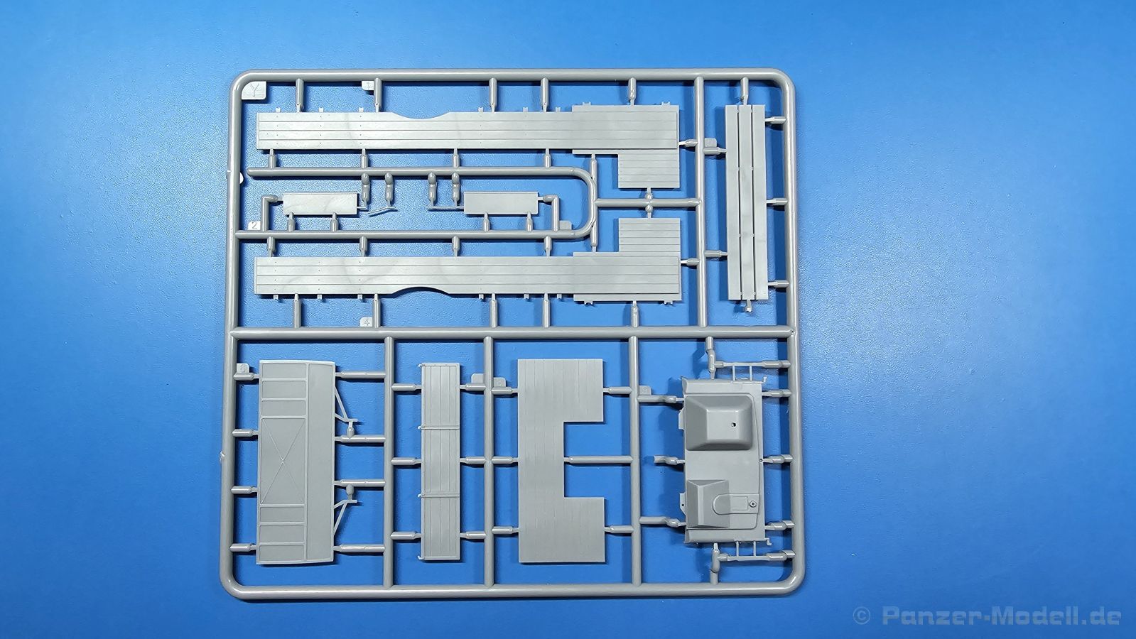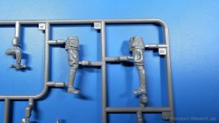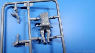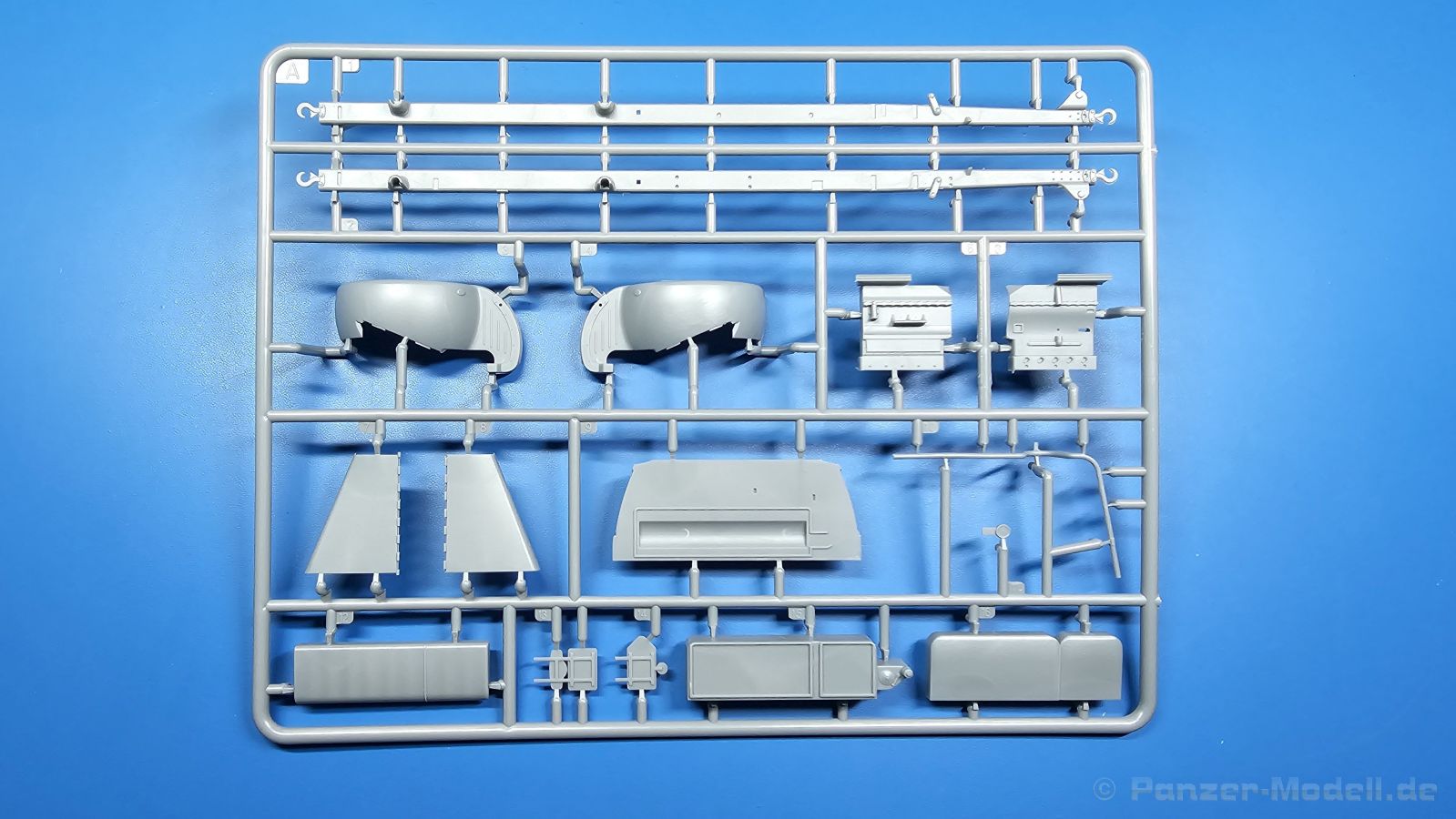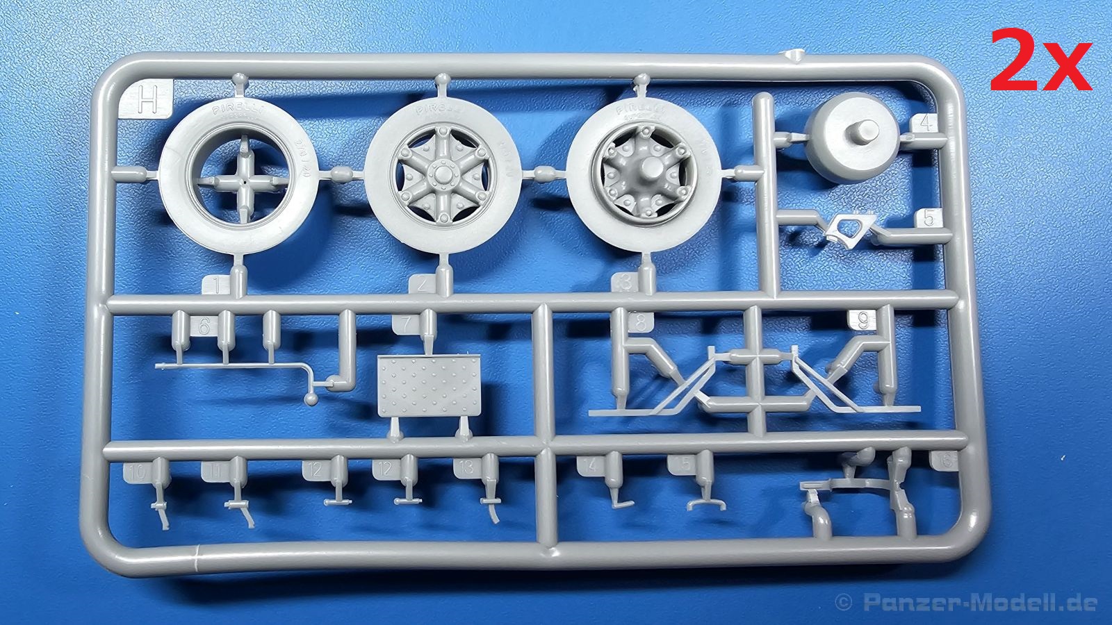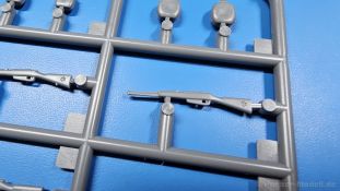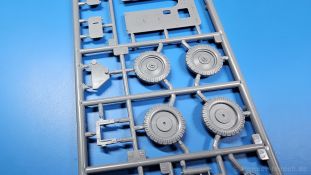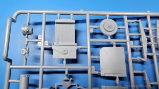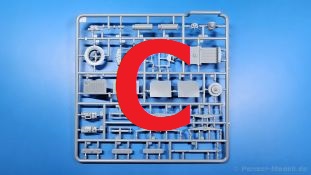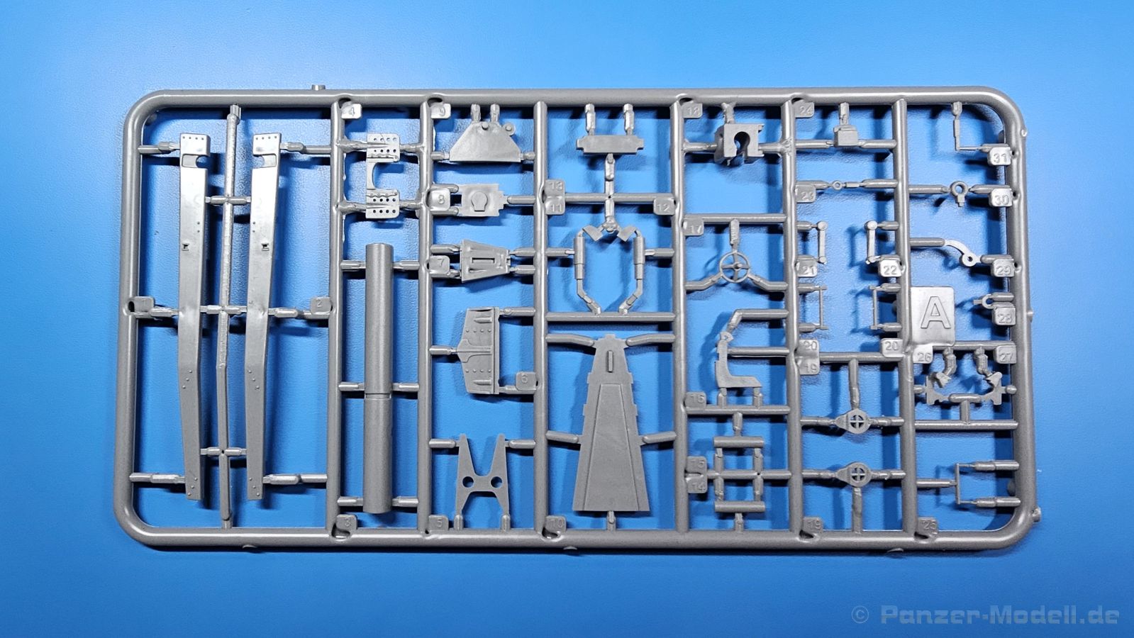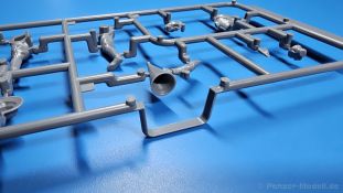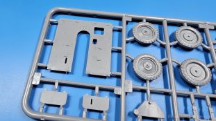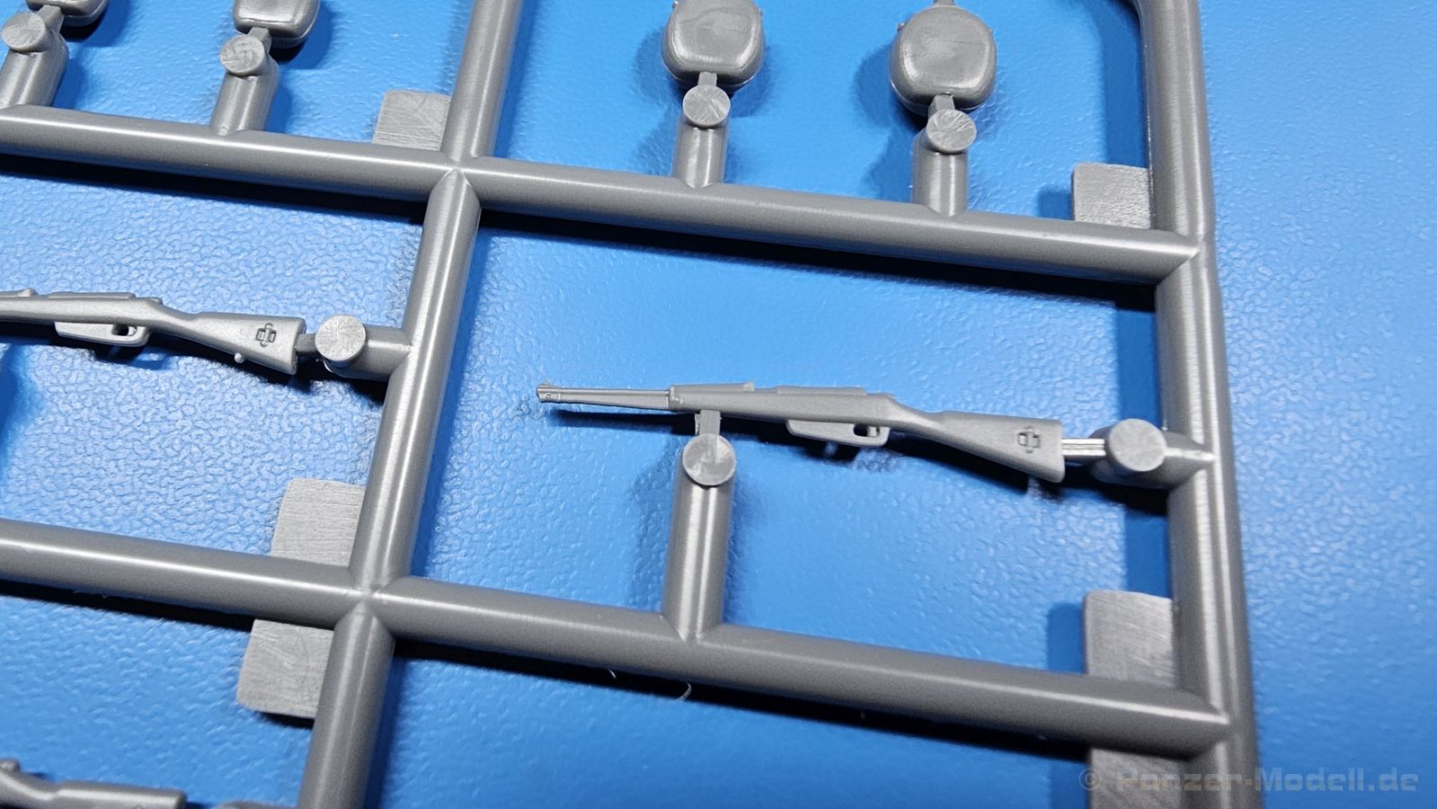 Das Original: Der Lancia 3RO war ein schwerer, italienischer Lkw, basierend auf dem Lancia RO. Er wurde ab 1939 bis 1950 produziert und war bis in die 1960-er Jahre im Einsatz. Mit seinem 93 PS Motor konnte er bis zu 45 km/h erreichen. Als Truppentransporter konnte er bis zu 32 Soldaten transportieren Es wurden aber auch Panzer und Pferde befördert. Mit einer anderen Plattform diente er auch als bewegliche Artillerie und Flugabwehr mit entsprechend montierten Geschützen. Der Lancia fand sowohl zivile als auch militärische Abnehmer. Neben der italienischen Armee nutzte ihn auch die deutsche Wehrmacht. Der Bausatz: Der Lancia 3RO mit 100 mm Haubitze von IBG hat Zuwachs in Form von Figuren bekommen. Das Fahrzeug wurde bereits unter der Nummer 35053 im Dezember 2018 herausgebracht und war schon damals eine hochdetailliertes Modell. Nun spendiert IBG eine Fahrzeugbesatzung in Form eines Fahrers, eines Offiziers und zwei Geschützbedienern dazu. Im 405 x 255 x 60 mm großen Karton finden wir 16 graue, einen klaren Spritzling, 7 Plastikreifen, 1 PE-Platine, Naßschiebebilder und ein Metallrohr für das Fahrzeug und 5 graue Spritzlinge für die Figuren und deren Waffen und Ausrüstung. Ich habe noch einen weiteren Klarsichtspritzling mit Windschutzscheiben im Karton gefunden, der aber für dieses Modell weder gebraucht noch in der Übersicht aufgeführt wird. Die Teile aus Plastik sind sauber ausgespritzt, ohne Grat und Versatz. Angüsse sind so gesetzt, dass Details in der Regel nicht beeinträchtigt werden. Unnötige oder störende Auswerferspuren sind mir nicht aufgefallen. Also, alles in allem sollte man die Teile vom Spritzling ohne viel Nacharbeit bekommen. Hier und da ist feiner Grat zu sehen, der sich leicht entfernen lassen sollte. Die Details des Geschützes sind etwas weicher als die des Lkws. An den Spritzlingen des Geschützes tauchen einige Sinkstellen auf, die sich zum Glück meist nur auf den Gießästen befinden, aber leider doch auch auf wenigen Teilen wie z.B. dem Verschlussblock. Da der Lkw bereits bekannt ist, starten wir diesmal mit den Figuren. Von Spritzguss kann man nicht so scharfe Details wie bei Resinguss oder 3D-Druck erwarten, aber dennoch kommen die typischen italienischen Uniformen gut zur Geltung. Die Gesichtszüge sind etwas schwammig, aber deutlich erkennbar, so dass man Unterschiede zwischen den Gesichtern erkennen kann. Für den Offizier gibt es acht Teile – Beine, Rumpf, Kopf, Tropenhelm, Pistolentasche und Arme. An der linken Hand ist ein großes Megaphon angegossen, dem man ggfs. die Sprechöffnung aufbohren könnte. An der linken Hand befindet sich eine kurzstielige Pfeife. Knöpfe und aufgesetzte Taschen der Uniform treten deutlich hervor. Der Offizier ist der Einzige, der kniehohe Stiefel trägt. Der stehende Kanonier kommt mit drei Teilen aus; Beine und Rumpf bilden ein Teil, dazu kommt der Kopf und die zusammengegossenen, vor der Brust gekreuzten Arme. An den Füssen trägt er Gamaschenschnürschuhe. Die Schnürung ist angedeutet, aber etwas undeutlich. Der sitzende Kanonier besteht aus Kopf, Tropenhelm, Armen und dem Rest. Der Kanonier soll rechts am Geschütz sitzen, die Arme suggerieren, dass er die Handräder bedient. Man muss beim Bau sehen, ob er deswegen nicht vielleicht doch lieber links sitzen sollte. Zu guter Letzt wäre da noch der Fahrer. Er hat zwei Köpfe zur Auswahl – einen mit angegossenem Schiffchen und einen mit separatem Tropenhelm. Auch beim ihm bilden Beine und Rumpf ein Teil. Es gibt vier Arme, von denen aber nur zwei für seine Fahrertätigkeit notwendig sind. Die beiden anderen könnte man ggfs. verwenden, wenn man ihm eine Aufgabe als Geschützbedienung zuweisen möchte. Das müsste man Bau prüfen, ob das so geht wie gedacht. Fahrer und stehender Kanonier haben schräg vor der Brust Patronentaschen angegossen. Ein Spritzling mit vier Waffen und Wasserflaschen steht zur freien Verfügung, da in der Anleitung nichts darüber ausgesagt wird. Bei den Waffen handelt es sich offensichtlich um je 2 Carcano Karabiner Terni und 2 Gebirgsstutzen 65mm. Die Ladehebel sind gut herausgearbeitet, die Abzugsbügel durchbrochen mit freistehendem Abzug. Bei den Gebirgsstutzen sollte auch das Teil unter dem Lauf durchbrochen sein, da es sich wohl um ein eingeklappten Zweibein handelt, aber da behilft man sich dann selbst. Die Figuren bringen Leben in das Fahrzeug. Wenn jetzt noch etwas mehr Ausrüstung dabei gewesen wäre… Der Fahrzeugrahmen besteht wie bei den anderen 3RO aus separaten Längs- und Querträgern mit relativ vielen Teilen, die sauber und ordentlich in jeweils exakt gerade Ausrichtung gebracht werden müssen. Es gibt sehr viele, teils aus Fotoätzteilen bestehende, teils auch filigrane, Anbauteile, die alle ihren Platz finden wollen. Die Vorder- und Hinterachse sind gut detailliert und mit recht wenigen Teilen baubar. Leider lässt sich bei der Vorderachse kein Lenkeinschlag bauen, zumindest nicht aus dem Kasten (der findige Modellbauer wird aber sicher eine Möglichkeit finden). Die Blattfedern machen eine sehr guten Eindruck. Jedes Federblatt ist sauber erkennbar. Die Blattfedern stützen die Achsen am Rahmen ab.
