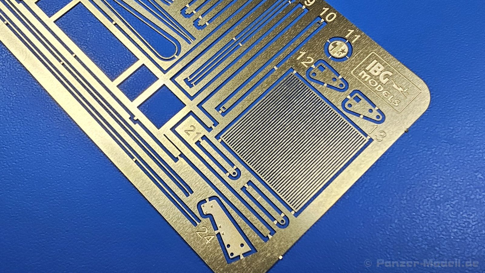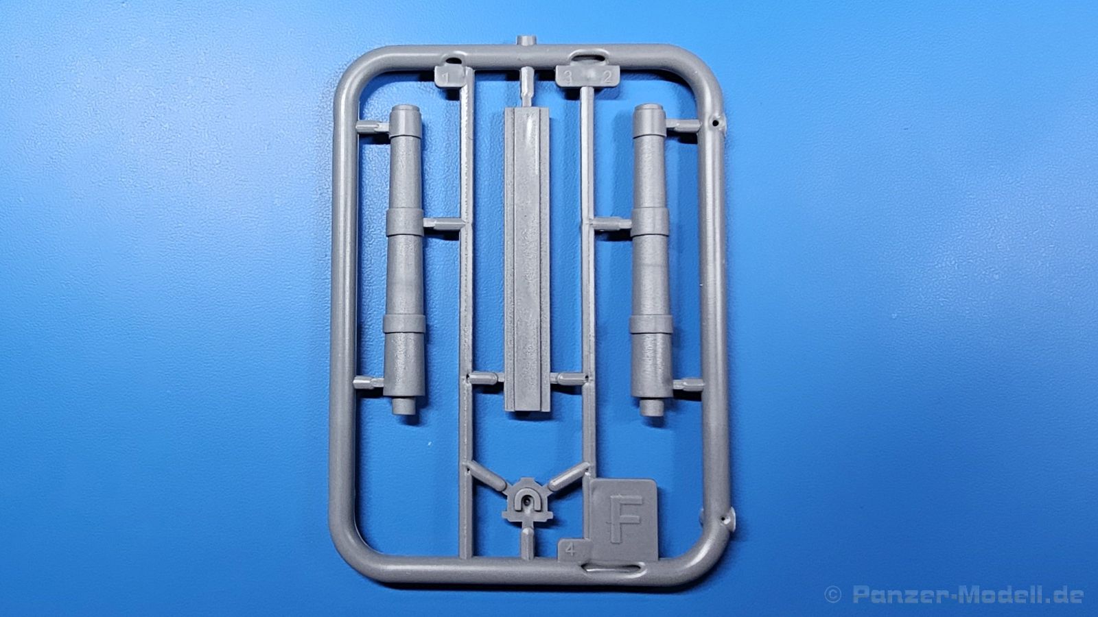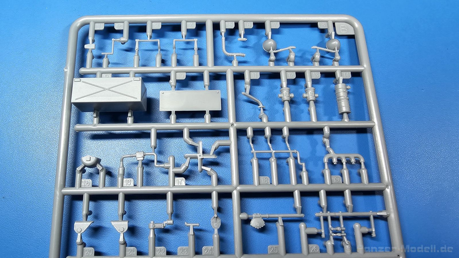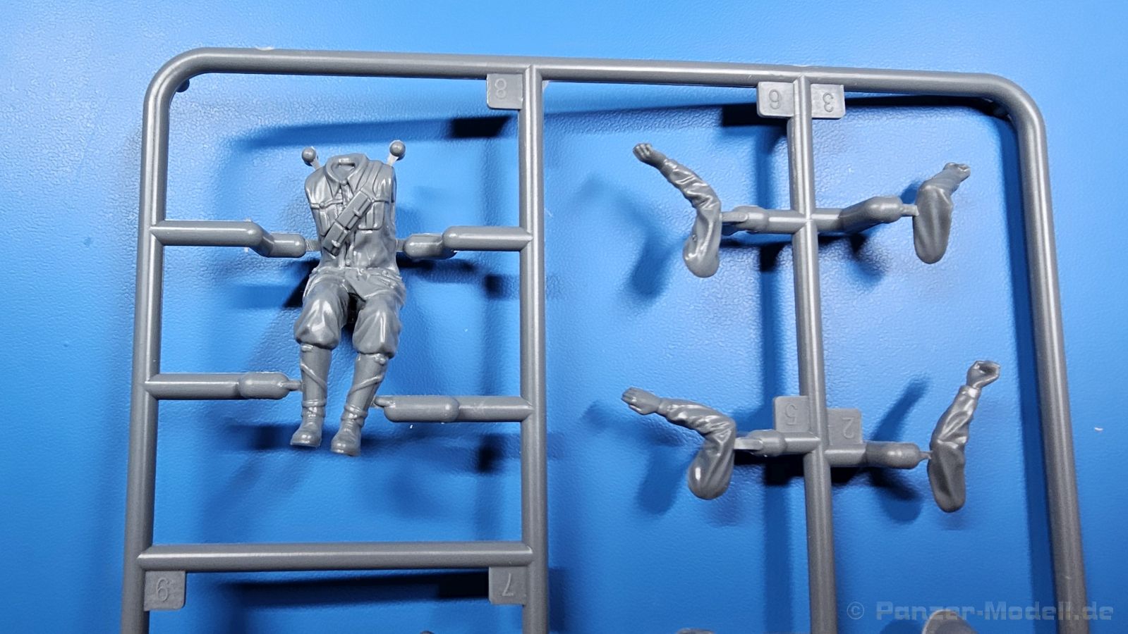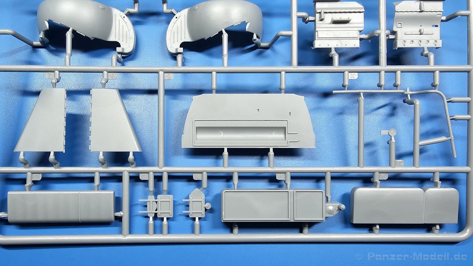 Das Original: Der Lancia 3RO war ein schwerer, italienischer Lkw, basierend auf dem Lancia RO. Er wurde ab 1939 bis 1950 produziert und war bis in die 1960-er Jahre im Einsatz. Mit seinem 93 PS Motor konnte er bis zu 45 km/h erreichen. Als Truppentransporter konnte er bis zu 32 Soldaten transportieren Es wurden aber auch Panzer und Pferde befördert. Mit einer anderen Plattform diente er auch als bewegliche Artillerie und Flugabwehr mit entsprechend montierten Geschützen. Der Lancia fand sowohl zivile als auch militärische Abnehmer. Neben der italienischen Armee nutzte ihn auch die deutsche Wehrmacht. Der Bausatz: Der Lancia 3RO mit 100 mm Haubitze von IBG hat Zuwachs in Form von Figuren bekommen. Das Fahrzeug wurde bereits unter der Nummer 35053 im Dezember 2018 herausgebracht und war schon damals eine hochdetailliertes Modell. Nun spendiert IBG eine Fahrzeugbesatzung in Form eines Fahrers, eines Offiziers und zwei Geschützbedienern dazu. Im 405 x 255 x 60 mm großen Karton finden wir 16 graue, einen klaren Spritzling, 7 Plastikreifen, 1 PE-Platine, Naßschiebebilder und ein Metallrohr für das Fahrzeug und 5 graue Spritzlinge für die Figuren und deren Waffen und Ausrüstung. Ich habe noch einen weiteren Klarsichtspritzling mit Windschutzscheiben im Karton gefunden, der aber für dieses Modell weder gebraucht noch in der Übersicht aufgeführt wird. Die Teile aus Plastik sind sauber ausgespritzt, ohne Grat und Versatz. Angüsse sind so gesetzt, dass Details in der Regel nicht beeinträchtigt werden. Unnötige oder störende Auswerferspuren sind mir nicht aufgefallen. Also, alles in allem sollte man die Teile vom Spritzling ohne viel Nacharbeit bekommen. Hier und da ist feiner Grat zu sehen, der sich leicht entfernen lassen sollte. Die Details des Geschützes sind etwas weicher als die des Lkws. An den Spritzlingen des Geschützes tauchen einige Sinkstellen auf, die sich zum Glück meist nur auf den Gießästen befinden, aber leider doch auch auf wenigen Teilen wie z.B. dem Verschlussblock. Da der Lkw bereits bekannt ist, starten wir diesmal mit den Figuren. Von Spritzguss kann man nicht so scharfe Details wie bei Resinguss oder 3D-Druck erwarten, aber dennoch kommen die typischen italienischen Uniformen gut zur Geltung. Die Gesichtszüge sind etwas schwammig, aber deutlich erkennbar, so dass man Unterschiede zwischen den Gesichtern erkennen kann. Für den Offizier gibt es acht Teile – Beine, Rumpf, Kopf, Tropenhelm, Pistolentasche und Arme. An der linken Hand ist ein großes Megaphon angegossen, dem man ggfs. die Sprechöffnung aufbohren könnte. An der linken Hand befindet sich eine kurzstielige Pfeife. Knöpfe und aufgesetzte Taschen der Uniform treten deutlich hervor. Der Offizier ist der Einzige, der kniehohe Stiefel trägt. Der stehende Kanonier kommt mit drei Teilen aus; Beine und Rumpf bilden ein Teil, dazu kommt der Kopf und die zusammengegossenen, vor der Brust gekreuzten Arme. An den Füssen trägt er Gamaschenschnürschuhe. Die Schnürung ist angedeutet, aber etwas undeutlich. Der sitzende Kanonier besteht aus Kopf, Tropenhelm, Armen und dem Rest. Der Kanonier soll rechts am Geschütz sitzen, die Arme suggerieren, dass er die Handräder bedient. Man muss beim Bau sehen, ob er deswegen nicht vielleicht doch lieber links sitzen sollte. Zu guter Letzt wäre da noch der Fahrer. Er hat zwei Köpfe zur Auswahl – einen mit angegossenem Schiffchen und einen mit separatem Tropenhelm. Auch beim ihm bilden Beine und Rumpf ein Teil. Es gibt vier Arme, von denen aber nur zwei für seine Fahrertätigkeit notwendig sind. Die beiden anderen könnte man ggfs. verwenden, wenn man ihm eine Aufgabe als Geschützbedienung zuweisen möchte. Das müsste man Bau prüfen, ob das so geht wie gedacht. Fahrer und stehender Kanonier haben schräg vor der Brust Patronentaschen angegossen. Ein Spritzling mit vier Waffen und Wasserflaschen steht zur freien Verfügung, da in der Anleitung nichts darüber ausgesagt wird. Bei den Waffen handelt es sich offensichtlich um je 2 Carcano Karabiner Terni und 2 Gebirgsstutzen 65mm. Die Ladehebel sind gut herausgearbeitet, die Abzugsbügel durchbrochen mit freistehendem Abzug. Bei den Gebirgsstutzen sollte auch das Teil unter dem Lauf durchbrochen sein, da es sich wohl um ein eingeklappten Zweibein handelt, aber da behilft man sich dann selbst. Die Figuren bringen Leben in das Fahrzeug. Wenn jetzt noch etwas mehr Ausrüstung dabei gewesen wäre… Der Fahrzeugrahmen besteht wie bei den anderen 3RO aus separaten Längs- und Querträgern mit relativ vielen Teilen, die sauber und ordentlich in jeweils exakt gerade Ausrichtung gebracht werden müssen. Es gibt sehr viele, teils aus Fotoätzteilen bestehende, teils auch filigrane, Anbauteile, die alle ihren Platz finden wollen. Die Vorder- und Hinterachse sind gut detailliert und mit recht wenigen Teilen baubar. Leider lässt sich bei der Vorderachse kein Lenkeinschlag bauen, zumindest nicht aus dem Kasten (der findige Modellbauer wird aber sicher eine Möglichkeit finden). Die Blattfedern machen eine sehr guten Eindruck. Jedes Federblatt ist sauber erkennbar. Die Blattfedern stützen die Achsen am Rahmen ab.