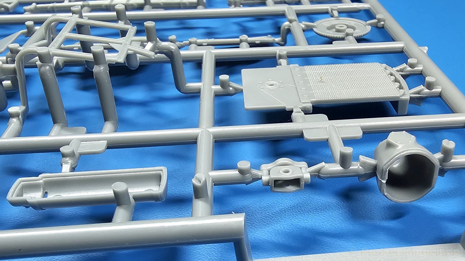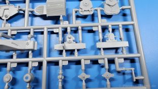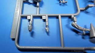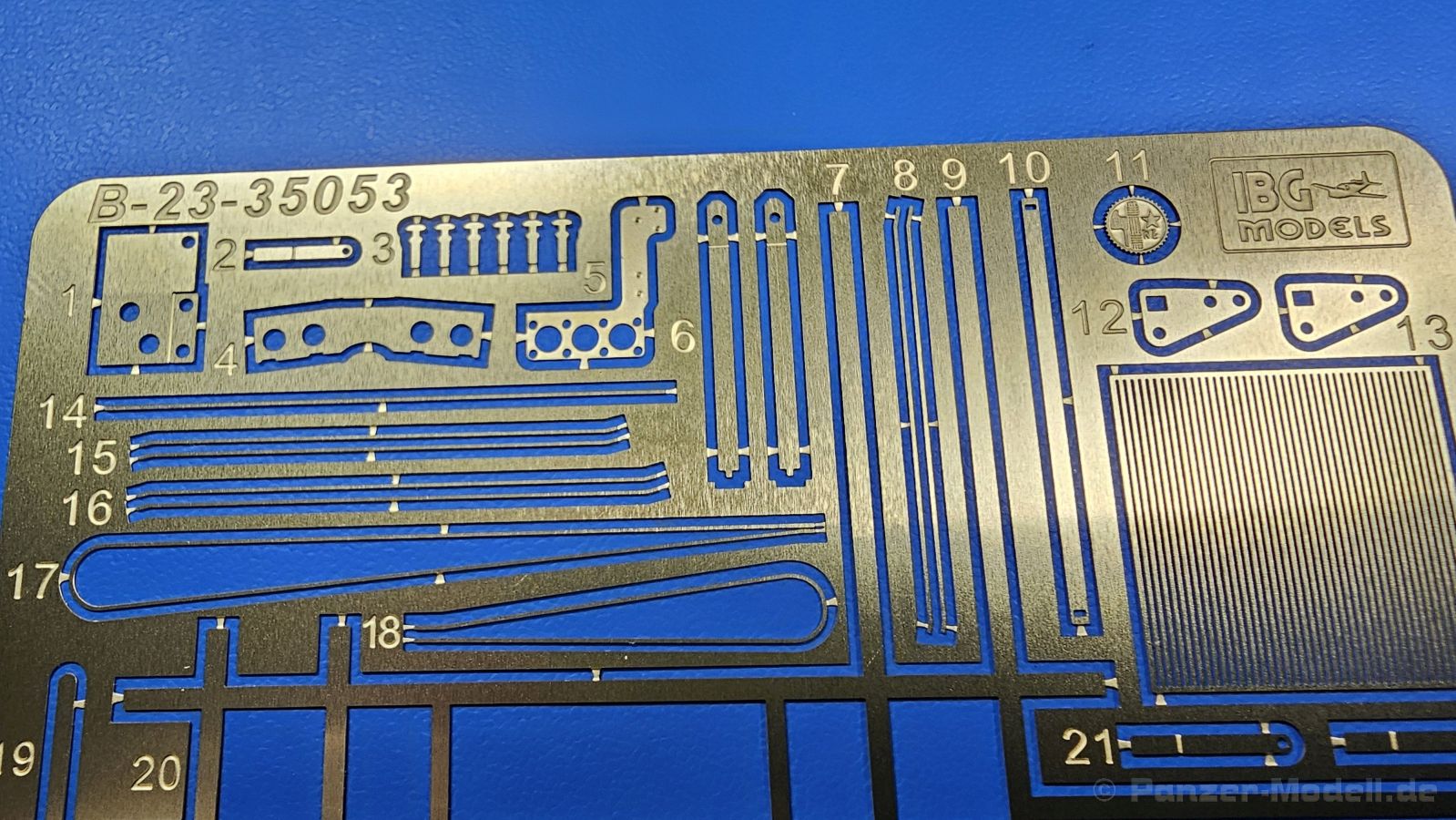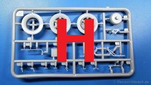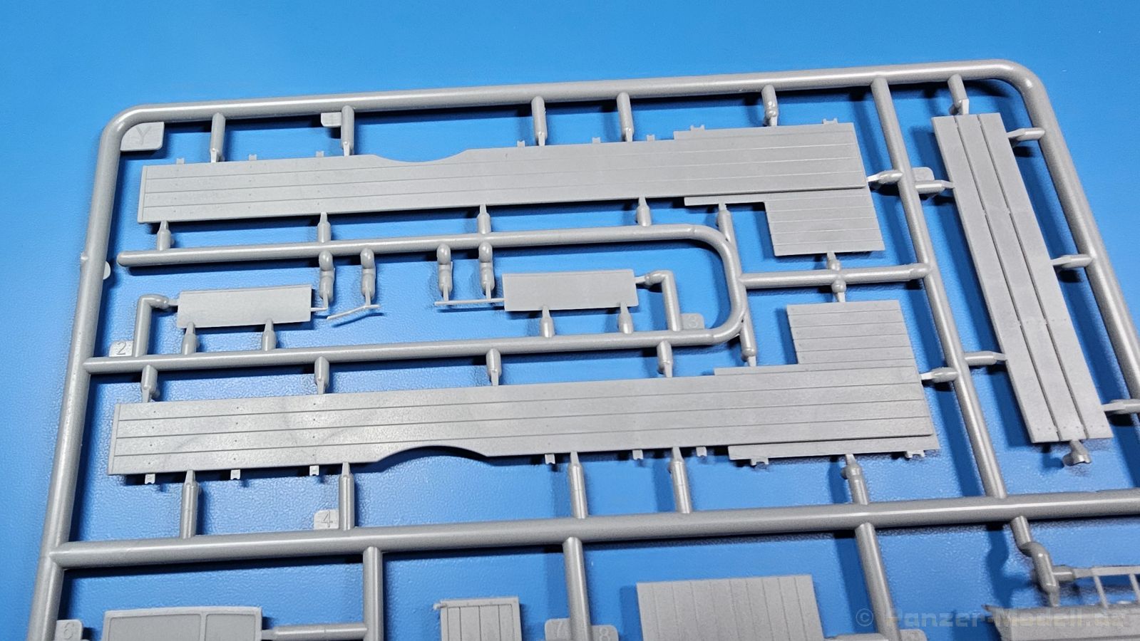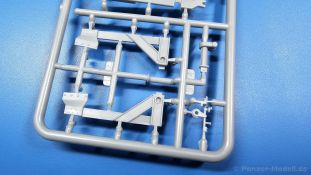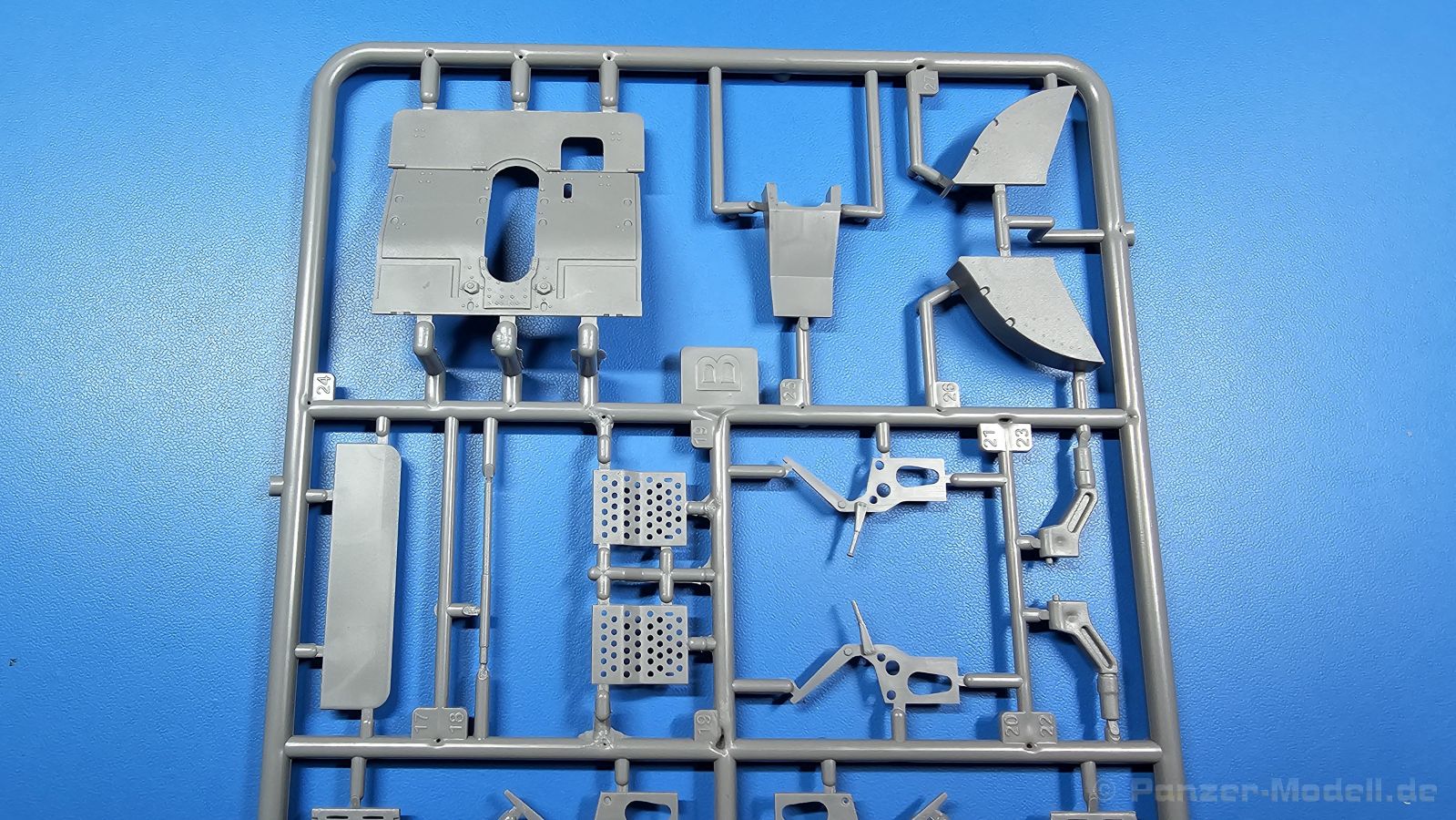 Das Original: Der Lancia 3RO war ein schwerer, italienischer Lkw, basierend auf dem Lancia RO. Er wurde ab 1939 bis 1950 produziert und war bis in die 1960-er Jahre im Einsatz. Mit seinem 93 PS Motor konnte er bis zu 45 km/h erreichen. Als Truppentransporter konnte er bis zu 32 Soldaten transportieren Es wurden aber auch Panzer und Pferde befördert. Mit einer anderen Plattform diente er auch als bewegliche Artillerie und Flugabwehr mit entsprechend montierten Geschützen. Der Lancia fand sowohl zivile als auch militärische Abnehmer. Neben der italienischen Armee nutzte ihn auch die deutsche Wehrmacht. Der Bausatz: Der Lancia 3RO mit 100 mm Haubitze von IBG hat Zuwachs in Form von Figuren bekommen. Das Fahrzeug wurde bereits unter der Nummer 35053 im Dezember 2018 herausgebracht und war schon damals eine hochdetailliertes Modell. Nun spendiert IBG eine Fahrzeugbesatzung in Form eines Fahrers, eines Offiziers und zwei Geschützbedienern dazu. Im 405 x 255 x 60 mm großen Karton finden wir 16 graue, einen klaren Spritzling, 7 Plastikreifen, 1 PE-Platine, Naßschiebebilder und ein Metallrohr für das Fahrzeug und 5 graue Spritzlinge für die Figuren und deren Waffen und Ausrüstung. Ich habe noch einen weiteren Klarsichtspritzling mit Windschutzscheiben im Karton gefunden, der aber für dieses Modell weder gebraucht noch in der Übersicht aufgeführt wird. Die Teile aus Plastik sind sauber ausgespritzt, ohne Grat und Versatz. Angüsse sind so gesetzt, dass Details in der Regel nicht beeinträchtigt werden. Unnötige oder störende Auswerferspuren sind mir nicht aufgefallen. Also, alles in allem sollte man die Teile vom Spritzling ohne viel Nacharbeit bekommen. Hier und da ist feiner Grat zu sehen, der sich leicht entfernen lassen sollte. Die Details des Geschützes sind etwas weicher als die des Lkws. An den Spritzlingen des Geschützes tauchen einige Sinkstellen auf, die sich zum Glück meist nur auf den Gießästen befinden, aber leider doch auch auf wenigen Teilen wie z.B. dem Verschlussblock. Da der Lkw bereits bekannt ist, starten wir diesmal mit den Figuren. Von Spritzguss kann man nicht so scharfe Details wie bei Resinguss oder 3D-Druck erwarten, aber dennoch kommen die typischen italienischen Uniformen gut zur Geltung. Die Gesichtszüge sind etwas schwammig, aber deutlich erkennbar, so dass man Unterschiede zwischen den Gesichtern erkennen kann. Für den Offizier gibt es acht Teile – Beine, Rumpf, Kopf, Tropenhelm, Pistolentasche und Arme. An der linken Hand ist ein großes Megaphon angegossen, dem man ggfs. die Sprechöffnung aufbohren könnte. An der linken Hand befindet sich eine kurzstielige Pfeife. Knöpfe und aufgesetzte Taschen der Uniform treten deutlich hervor. Der Offizier ist der Einzige, der kniehohe Stiefel trägt. Der stehende Kanonier kommt mit drei Teilen aus; Beine und Rumpf bilden ein Teil, dazu kommt der Kopf und die zusammengegossenen, vor der Brust gekreuzten Arme. An den Füssen trägt er Gamaschenschnürschuhe. Die Schnürung ist angedeutet, aber etwas undeutlich. Der sitzende Kanonier besteht aus Kopf, Tropenhelm, Armen und dem Rest. Der Kanonier soll rechts am Geschütz sitzen, die Arme suggerieren, dass er die Handräder bedient. Man muss beim Bau sehen, ob er deswegen nicht vielleicht doch lieber links sitzen sollte. Zu guter Letzt wäre da noch der Fahrer. Er hat zwei Köpfe zur Auswahl – einen mit angegossenem Schiffchen und einen mit separatem Tropenhelm. Auch beim ihm bilden Beine und Rumpf ein Teil. Es gibt vier Arme, von denen aber nur zwei für seine Fahrertätigkeit notwendig sind. Die beiden anderen könnte man ggfs. verwenden, wenn man ihm eine Aufgabe als Geschützbedienung zuweisen möchte. Das müsste man Bau prüfen, ob das so geht wie gedacht. Fahrer und stehender Kanonier haben schräg vor der Brust Patronentaschen angegossen. Ein Spritzling mit vier Waffen und Wasserflaschen steht zur freien Verfügung, da in der Anleitung nichts darüber ausgesagt wird. Bei den Waffen handelt es sich offensichtlich um je 2 Carcano Karabiner Terni und 2 Gebirgsstutzen 65mm. Die Ladehebel sind gut herausgearbeitet, die Abzugsbügel durchbrochen mit freistehendem Abzug. Bei den Gebirgsstutzen sollte auch das Teil unter dem Lauf durchbrochen sein, da es sich wohl um ein eingeklappten Zweibein handelt, aber da behilft man sich dann selbst. Die Figuren bringen Leben in das Fahrzeug. Wenn jetzt noch etwas mehr Ausrüstung dabei gewesen wäre… Der Fahrzeugrahmen besteht wie bei den anderen 3RO aus separaten Längs- und Querträgern mit relativ vielen Teilen, die sauber und ordentlich in jeweils exakt gerade Ausrichtung gebracht werden müssen. Es gibt sehr viele, teils aus Fotoätzteilen bestehende, teils auch filigrane, Anbauteile, die alle ihren Platz finden wollen. Die Vorder- und Hinterachse sind gut detailliert und mit recht wenigen Teilen baubar. Leider lässt sich bei der Vorderachse kein Lenkeinschlag bauen, zumindest nicht aus dem Kasten (der findige Modellbauer wird aber sicher eine Möglichkeit finden). Die Blattfedern machen eine sehr guten Eindruck. Jedes Federblatt ist sauber erkennbar. Die Blattfedern stützen die Achsen am Rahmen ab.