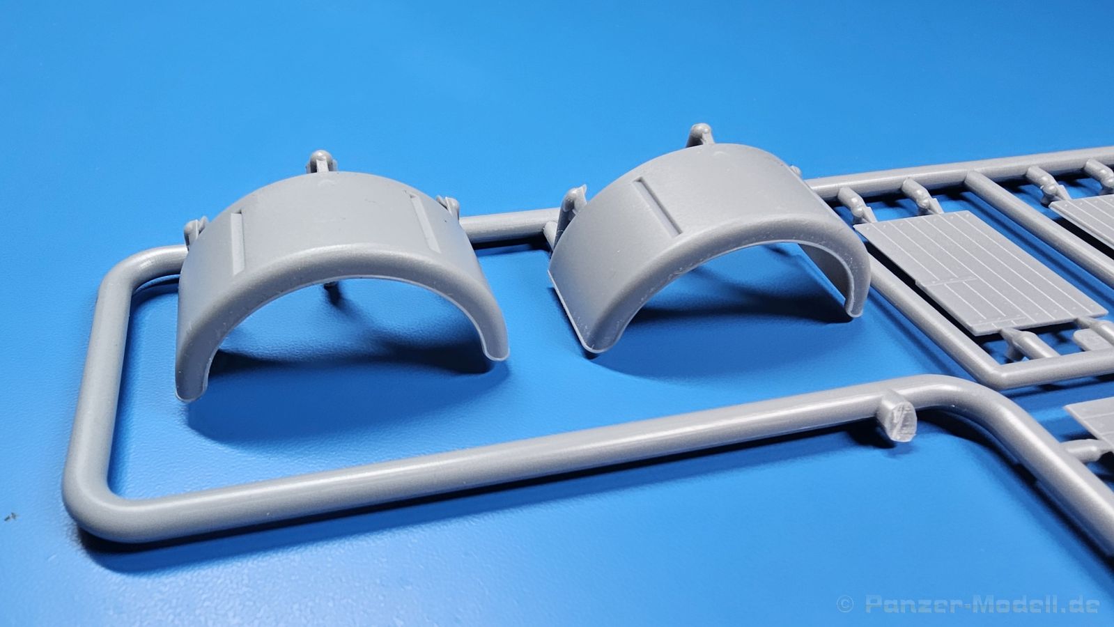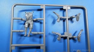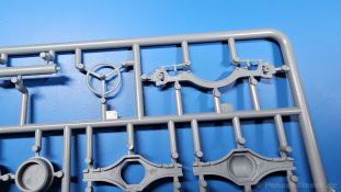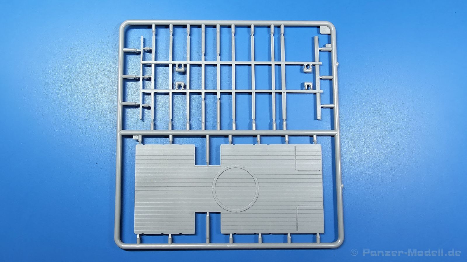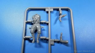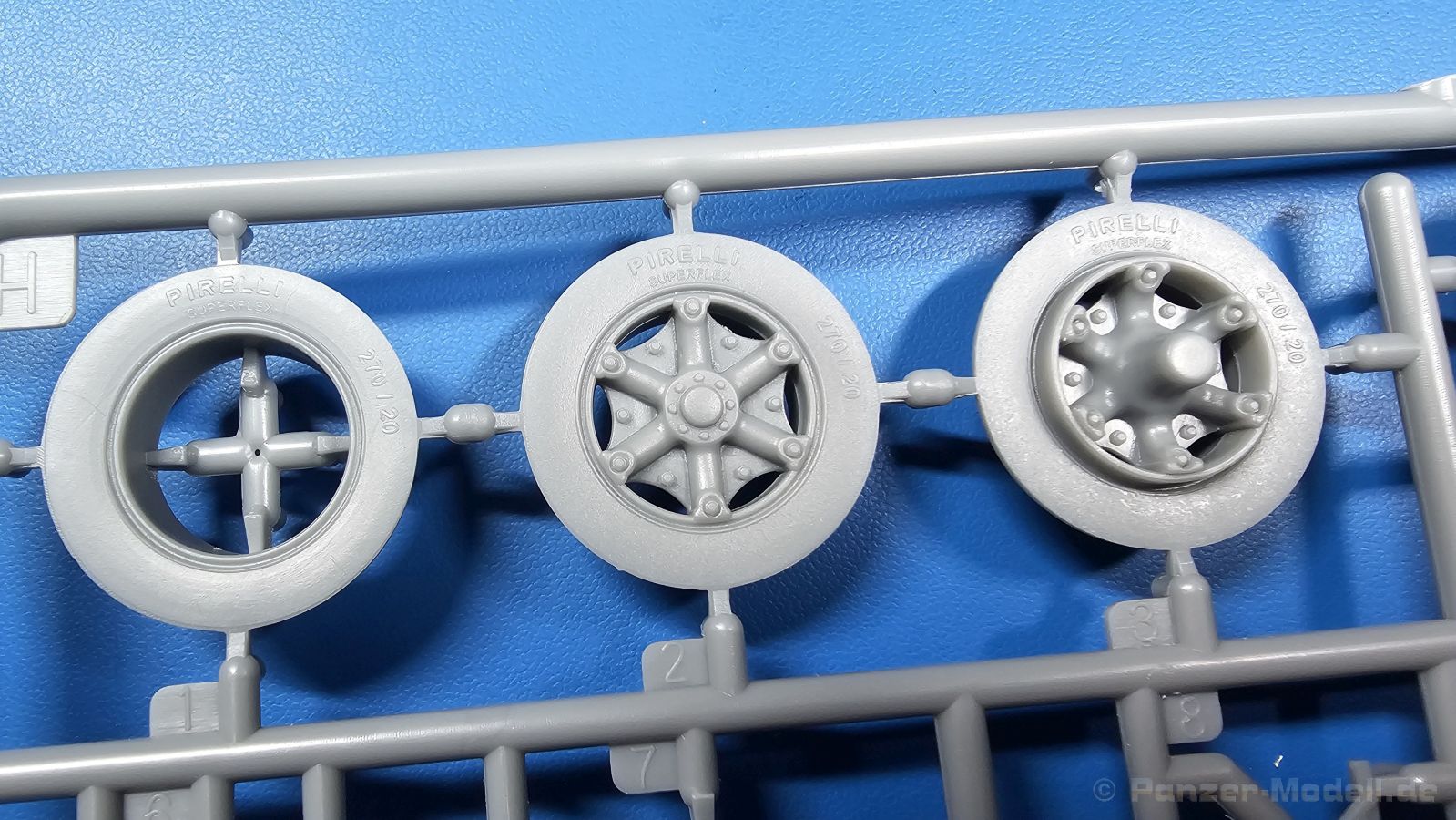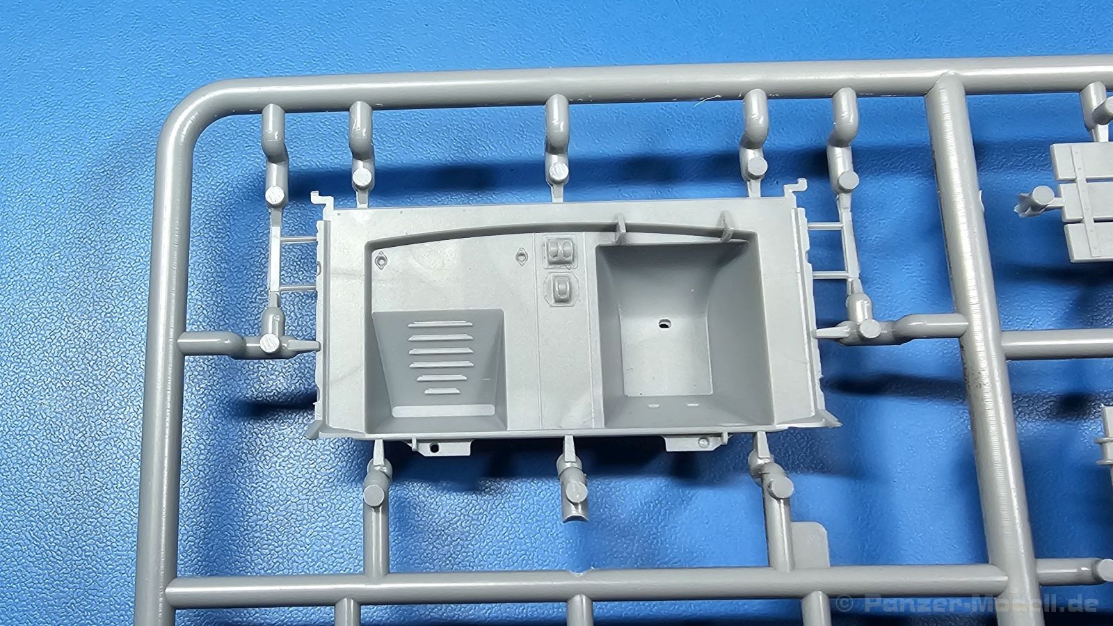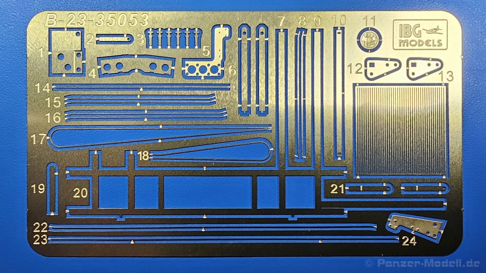 Das Original: Der Lancia 3RO war ein schwerer, italienischer Lkw, basierend auf dem Lancia RO. Er wurde ab 1939 bis 1950 produziert und war bis in die 1960-er Jahre im Einsatz. Mit seinem 93 PS Motor konnte er bis zu 45 km/h erreichen. Als Truppentransporter konnte er bis zu 32 Soldaten transportieren Es wurden aber auch Panzer und Pferde befördert. Mit einer anderen Plattform diente er auch als bewegliche Artillerie und Flugabwehr mit entsprechend montierten Geschützen. Der Lancia fand sowohl zivile als auch militärische Abnehmer. Neben der italienischen Armee nutzte ihn auch die deutsche Wehrmacht. Der Bausatz: Der Lancia 3RO mit 100 mm Haubitze von IBG hat Zuwachs in Form von Figuren bekommen. Das Fahrzeug wurde bereits unter der Nummer 35053 im Dezember 2018 herausgebracht und war schon damals eine hochdetailliertes Modell. Nun spendiert IBG eine Fahrzeugbesatzung in Form eines Fahrers, eines Offiziers und zwei Geschützbedienern dazu. Im 405 x 255 x 60 mm großen Karton finden wir 16 graue, einen klaren Spritzling, 7 Plastikreifen, 1 PE-Platine, Naßschiebebilder und ein Metallrohr für das Fahrzeug und 5 graue Spritzlinge für die Figuren und deren Waffen und Ausrüstung. Ich habe noch einen weiteren Klarsichtspritzling mit Windschutzscheiben im Karton gefunden, der aber für dieses Modell weder gebraucht noch in der Übersicht aufgeführt wird. Die Teile aus Plastik sind sauber ausgespritzt, ohne Grat und Versatz. Angüsse sind so gesetzt, dass Details in der Regel nicht beeinträchtigt werden. Unnötige oder störende Auswerferspuren sind mir nicht aufgefallen. Also, alles in allem sollte man die Teile vom Spritzling ohne viel Nacharbeit bekommen. Hier und da ist feiner Grat zu sehen, der sich leicht entfernen lassen sollte. Die Details des Geschützes sind etwas weicher als die des Lkws. An den Spritzlingen des Geschützes tauchen einige Sinkstellen auf, die sich zum Glück meist nur auf den Gießästen befinden, aber leider doch auch auf wenigen Teilen wie z.B. dem Verschlussblock. Da der Lkw bereits bekannt ist, starten wir diesmal mit den Figuren. Von Spritzguss kann man nicht so scharfe Details wie bei Resinguss oder 3D-Druck erwarten, aber dennoch kommen die typischen italienischen Uniformen gut zur Geltung. Die Gesichtszüge sind etwas schwammig, aber deutlich erkennbar, so dass man Unterschiede zwischen den Gesichtern erkennen kann. Für den Offizier gibt es acht Teile – Beine, Rumpf, Kopf, Tropenhelm, Pistolentasche und Arme. An der linken Hand ist ein großes Megaphon angegossen, dem man ggfs. die Sprechöffnung aufbohren könnte. An der linken Hand befindet sich eine kurzstielige Pfeife. Knöpfe und aufgesetzte Taschen der Uniform treten deutlich hervor. Der Offizier ist der Einzige, der kniehohe Stiefel trägt. Der stehende Kanonier kommt mit drei Teilen aus; Beine und Rumpf bilden ein Teil, dazu kommt der Kopf und die zusammengegossenen, vor der Brust gekreuzten Arme. An den Füssen trägt er Gamaschenschnürschuhe. Die Schnürung ist angedeutet, aber etwas undeutlich. Der sitzende Kanonier besteht aus Kopf, Tropenhelm, Armen und dem Rest. Der Kanonier soll rechts am Geschütz sitzen, die Arme suggerieren, dass er die Handräder bedient. Man muss beim Bau sehen, ob er deswegen nicht vielleicht doch lieber links sitzen sollte. Zu guter Letzt wäre da noch der Fahrer. Er hat zwei Köpfe zur Auswahl – einen mit angegossenem Schiffchen und einen mit separatem Tropenhelm. Auch beim ihm bilden Beine und Rumpf ein Teil. Es gibt vier Arme, von denen aber nur zwei für seine Fahrertätigkeit notwendig sind. Die beiden anderen könnte man ggfs. verwenden, wenn man ihm eine Aufgabe als Geschützbedienung zuweisen möchte. Das müsste man Bau prüfen, ob das so geht wie gedacht. Fahrer und stehender Kanonier haben schräg vor der Brust Patronentaschen angegossen. Ein Spritzling mit vier Waffen und Wasserflaschen steht zur freien Verfügung, da in der Anleitung nichts darüber ausgesagt wird. Bei den Waffen handelt es sich offensichtlich um je 2 Carcano Karabiner Terni und 2 Gebirgsstutzen 65mm. Die Ladehebel sind gut herausgearbeitet, die Abzugsbügel durchbrochen mit freistehendem Abzug. Bei den Gebirgsstutzen sollte auch das Teil unter dem Lauf durchbrochen sein, da es sich wohl um ein eingeklappten Zweibein handelt, aber da behilft man sich dann selbst. Die Figuren bringen Leben in das Fahrzeug. Wenn jetzt noch etwas mehr Ausrüstung dabei gewesen wäre… Der Fahrzeugrahmen besteht wie bei den anderen 3RO aus separaten Längs- und Querträgern mit relativ vielen Teilen, die sauber und ordentlich in jeweils exakt gerade Ausrichtung gebracht werden müssen. Es gibt sehr viele, teils aus Fotoätzteilen bestehende, teils auch filigrane, Anbauteile, die alle ihren Platz finden wollen. Die Vorder- und Hinterachse sind gut detailliert und mit recht wenigen Teilen baubar. Leider lässt sich bei der Vorderachse kein Lenkeinschlag bauen, zumindest nicht aus dem Kasten (der findige Modellbauer wird aber sicher eine Möglichkeit finden). Die Blattfedern machen eine sehr guten Eindruck. Jedes Federblatt ist sauber erkennbar. Die Blattfedern stützen die Achsen am Rahmen ab.