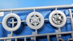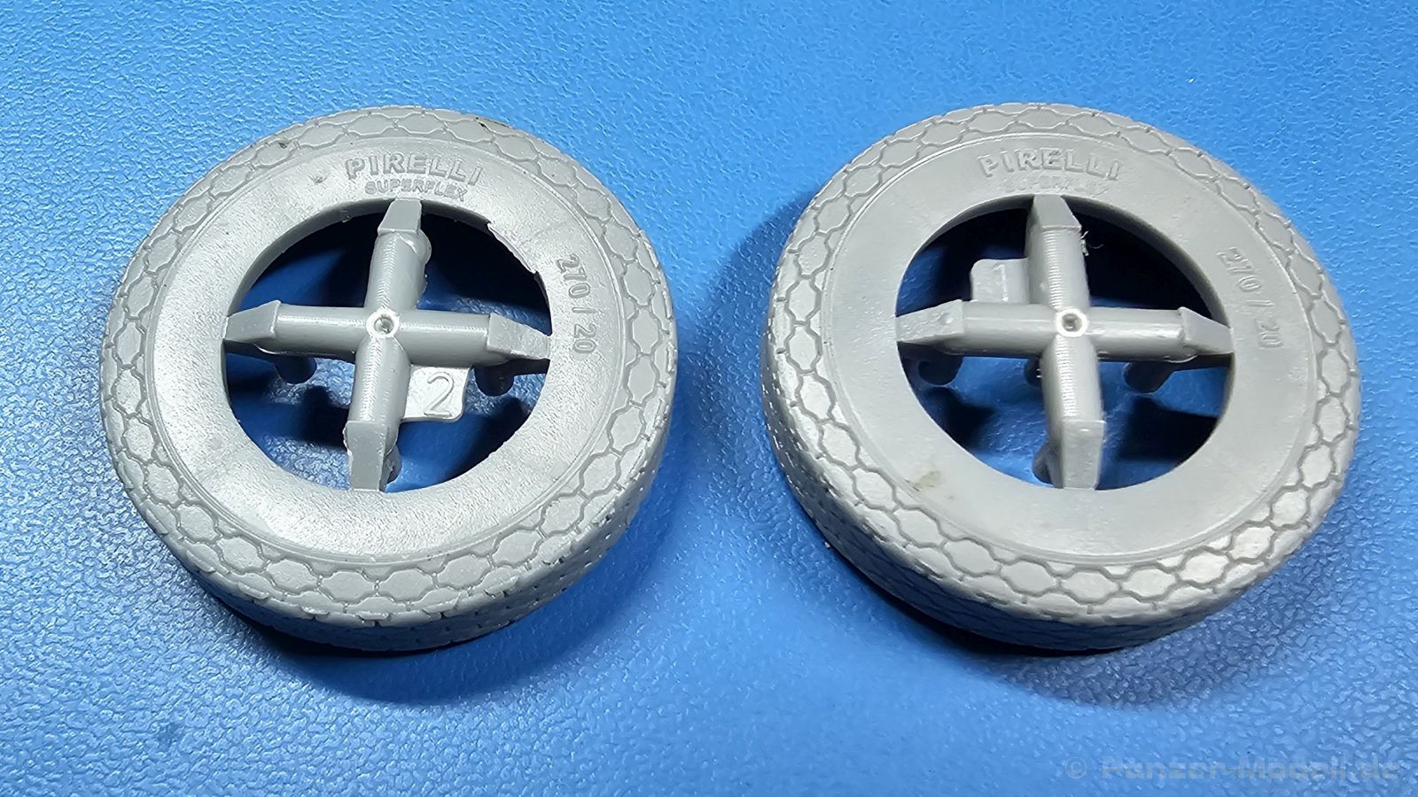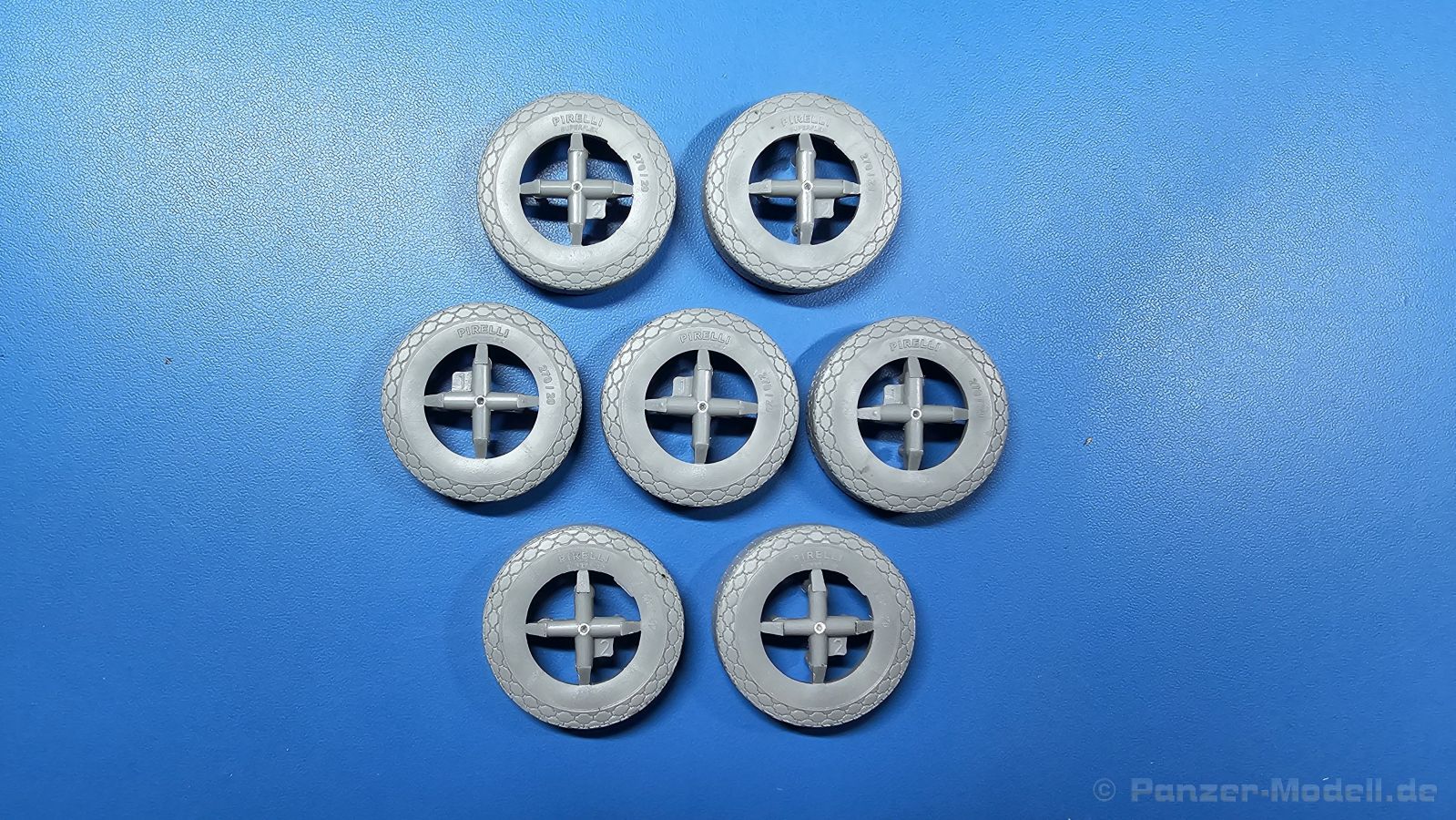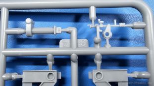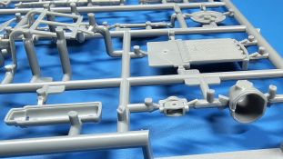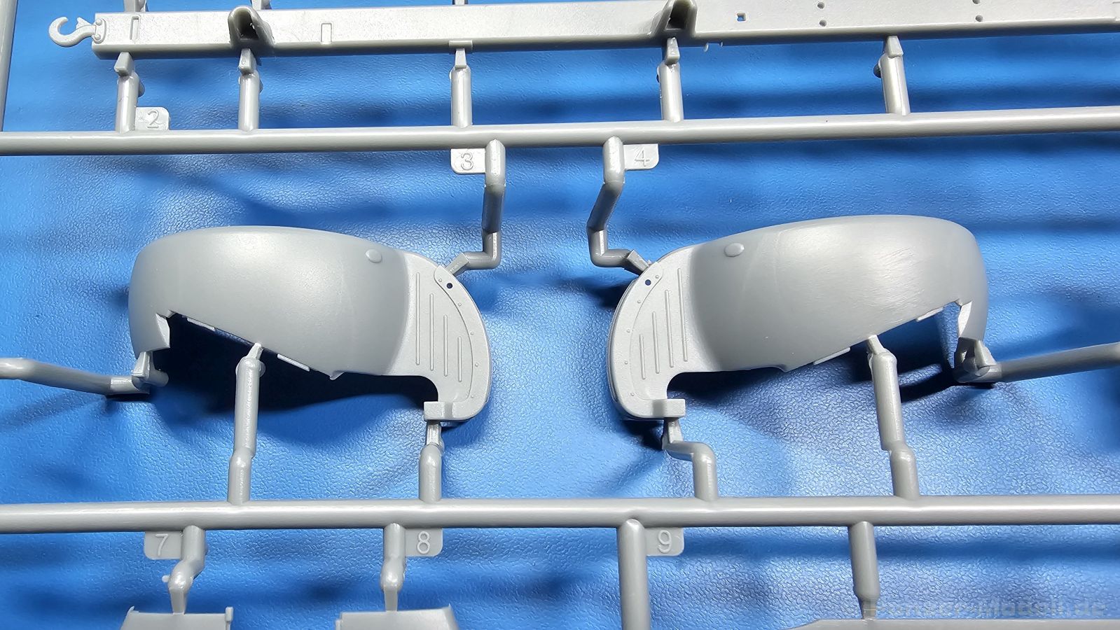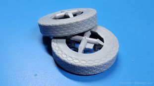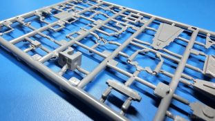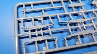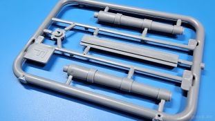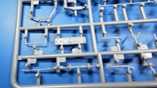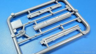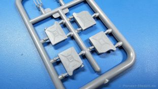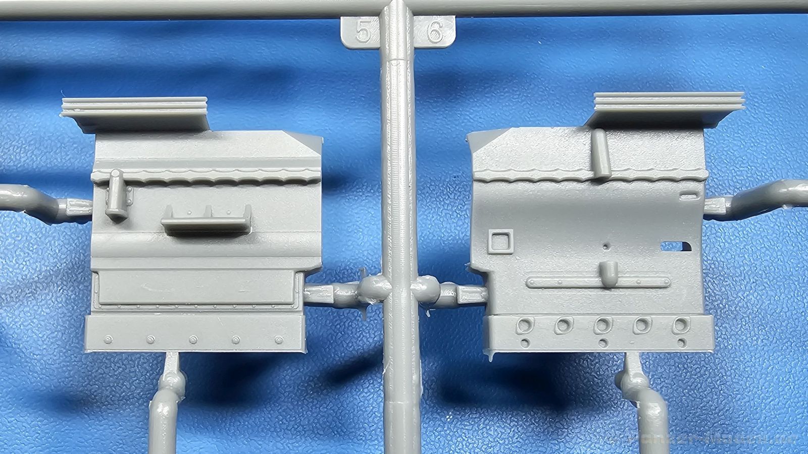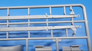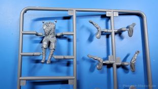 Das Original: Der Lancia 3RO war ein schwerer, italienischer Lkw, basierend auf dem Lancia RO. Er wurde ab 1939 bis 1950 produziert und war bis in die 1960-er Jahre im Einsatz. Mit seinem 93 PS Motor konnte er bis zu 45 km/h erreichen. Als Truppentransporter konnte er bis zu 32 Soldaten transportieren Es wurden aber auch Panzer und Pferde befördert. Mit einer anderen Plattform diente er auch als bewegliche Artillerie und Flugabwehr mit entsprechend montierten Geschützen. Der Lancia fand sowohl zivile als auch militärische Abnehmer. Neben der italienischen Armee nutzte ihn auch die deutsche Wehrmacht. Der Bausatz: Der Lancia 3RO mit 100 mm Haubitze von IBG hat Zuwachs in Form von Figuren bekommen. Das Fahrzeug wurde bereits unter der Nummer 35053 im Dezember 2018 herausgebracht und war schon damals eine hochdetailliertes Modell. Nun spendiert IBG eine Fahrzeugbesatzung in Form eines Fahrers, eines Offiziers und zwei Geschützbedienern dazu. Im 405 x 255 x 60 mm großen Karton finden wir 16 graue, einen klaren Spritzling, 7 Plastikreifen, 1 PE-Platine, Naßschiebebilder und ein Metallrohr für das Fahrzeug und 5 graue Spritzlinge für die Figuren und deren Waffen und Ausrüstung. Ich habe noch einen weiteren Klarsichtspritzling mit Windschutzscheiben im Karton gefunden, der aber für dieses Modell weder gebraucht noch in der Übersicht aufgeführt wird. Die Teile aus Plastik sind sauber ausgespritzt, ohne Grat und Versatz. Angüsse sind so gesetzt, dass Details in der Regel nicht beeinträchtigt werden. Unnötige oder störende Auswerferspuren sind mir nicht aufgefallen. Also, alles in allem sollte man die Teile vom Spritzling ohne viel Nacharbeit bekommen. Hier und da ist feiner Grat zu sehen, der sich leicht entfernen lassen sollte. Die Details des Geschützes sind etwas weicher als die des Lkws. An den Spritzlingen des Geschützes tauchen einige Sinkstellen auf, die sich zum Glück meist nur auf den Gießästen befinden, aber leider doch auch auf wenigen Teilen wie z.B. dem Verschlussblock. Da der Lkw bereits bekannt ist, starten wir diesmal mit den Figuren. Von Spritzguss kann man nicht so scharfe Details wie bei Resinguss oder 3D-Druck erwarten, aber dennoch kommen die typischen italienischen Uniformen gut zur Geltung. Die Gesichtszüge sind etwas schwammig, aber deutlich erkennbar, so dass man Unterschiede zwischen den Gesichtern erkennen kann. Für den Offizier gibt es acht Teile – Beine, Rumpf, Kopf, Tropenhelm, Pistolentasche und Arme. An der linken Hand ist ein großes Megaphon angegossen, dem man ggfs. die Sprechöffnung aufbohren könnte. An der linken Hand befindet sich eine kurzstielige Pfeife. Knöpfe und aufgesetzte Taschen der Uniform treten deutlich hervor. Der Offizier ist der Einzige, der kniehohe Stiefel trägt. Der stehende Kanonier kommt mit drei Teilen aus; Beine und Rumpf bilden ein Teil, dazu kommt der Kopf und die zusammengegossenen, vor der Brust gekreuzten Arme. An den Füssen trägt er Gamaschenschnürschuhe. Die Schnürung ist angedeutet, aber etwas undeutlich. Der sitzende Kanonier besteht aus Kopf, Tropenhelm, Armen und dem Rest. Der Kanonier soll rechts am Geschütz sitzen, die Arme suggerieren, dass er die Handräder bedient. Man muss beim Bau sehen, ob er deswegen nicht vielleicht doch lieber links sitzen sollte. Zu guter Letzt wäre da noch der Fahrer. Er hat zwei Köpfe zur Auswahl – einen mit angegossenem Schiffchen und einen mit separatem Tropenhelm. Auch beim ihm bilden Beine und Rumpf ein Teil. Es gibt vier Arme, von denen aber nur zwei für seine Fahrertätigkeit notwendig sind. Die beiden anderen könnte man ggfs. verwenden, wenn man ihm eine Aufgabe als Geschützbedienung zuweisen möchte. Das müsste man Bau prüfen, ob das so geht wie gedacht. Fahrer und stehender Kanonier haben schräg vor der Brust Patronentaschen angegossen. Ein Spritzling mit vier Waffen und Wasserflaschen steht zur freien Verfügung, da in der Anleitung nichts darüber ausgesagt wird. Bei den Waffen handelt es sich offensichtlich um je 2 Carcano Karabiner Terni und 2 Gebirgsstutzen 65mm. Die Ladehebel sind gut herausgearbeitet, die Abzugsbügel durchbrochen mit freistehendem Abzug. Bei den Gebirgsstutzen sollte auch das Teil unter dem Lauf durchbrochen sein, da es sich wohl um ein eingeklappten Zweibein handelt, aber da behilft man sich dann selbst. Die Figuren bringen Leben in das Fahrzeug. Wenn jetzt noch etwas mehr Ausrüstung dabei gewesen wäre… Der Fahrzeugrahmen besteht wie bei den anderen 3RO aus separaten Längs- und Querträgern mit relativ vielen Teilen, die sauber und ordentlich in jeweils exakt gerade Ausrichtung gebracht werden müssen. Es gibt sehr viele, teils aus Fotoätzteilen bestehende, teils auch filigrane, Anbauteile, die alle ihren Platz finden wollen. Die Vorder- und Hinterachse sind gut detailliert und mit recht wenigen Teilen baubar. Leider lässt sich bei der Vorderachse kein Lenkeinschlag bauen, zumindest nicht aus dem Kasten (der findige Modellbauer wird aber sicher eine Möglichkeit finden). Die Blattfedern machen eine sehr guten Eindruck. Jedes Federblatt ist sauber erkennbar. Die Blattfedern stützen die Achsen am Rahmen ab.