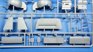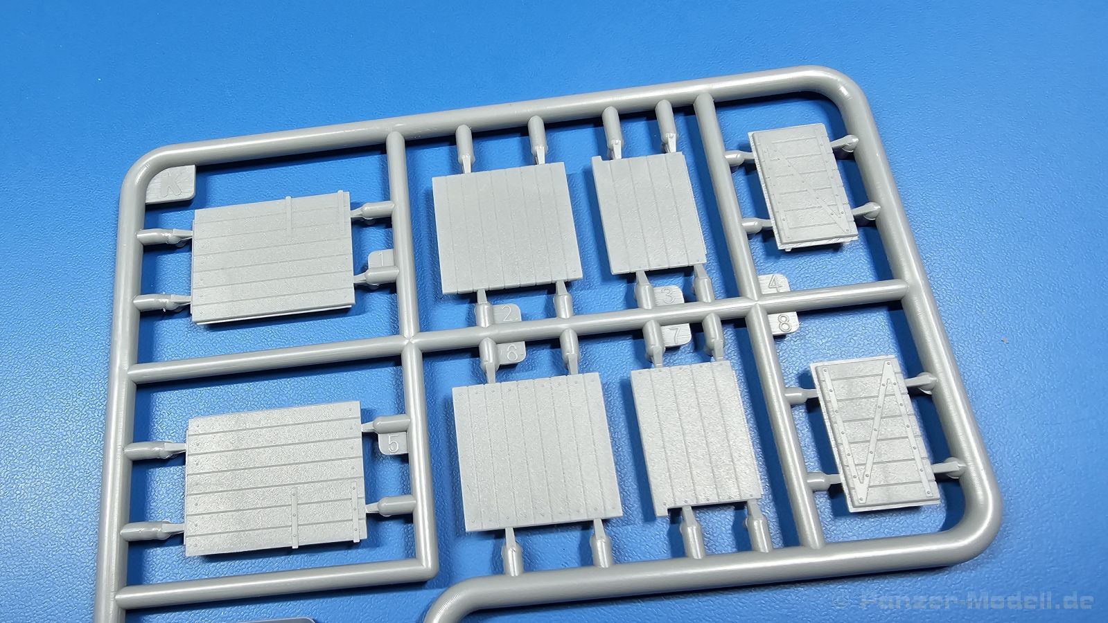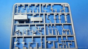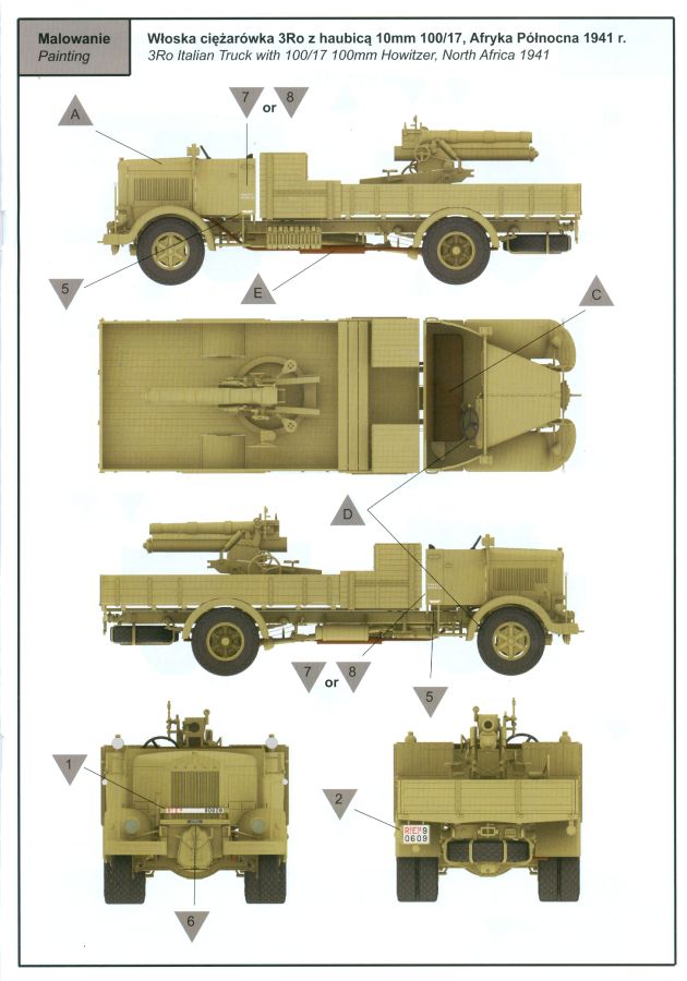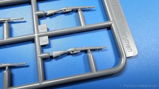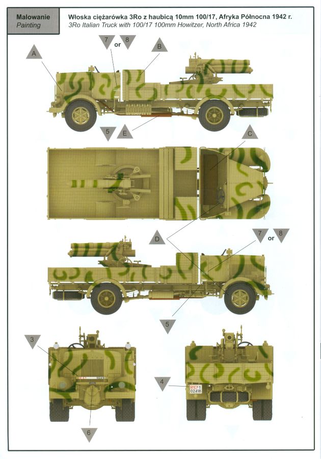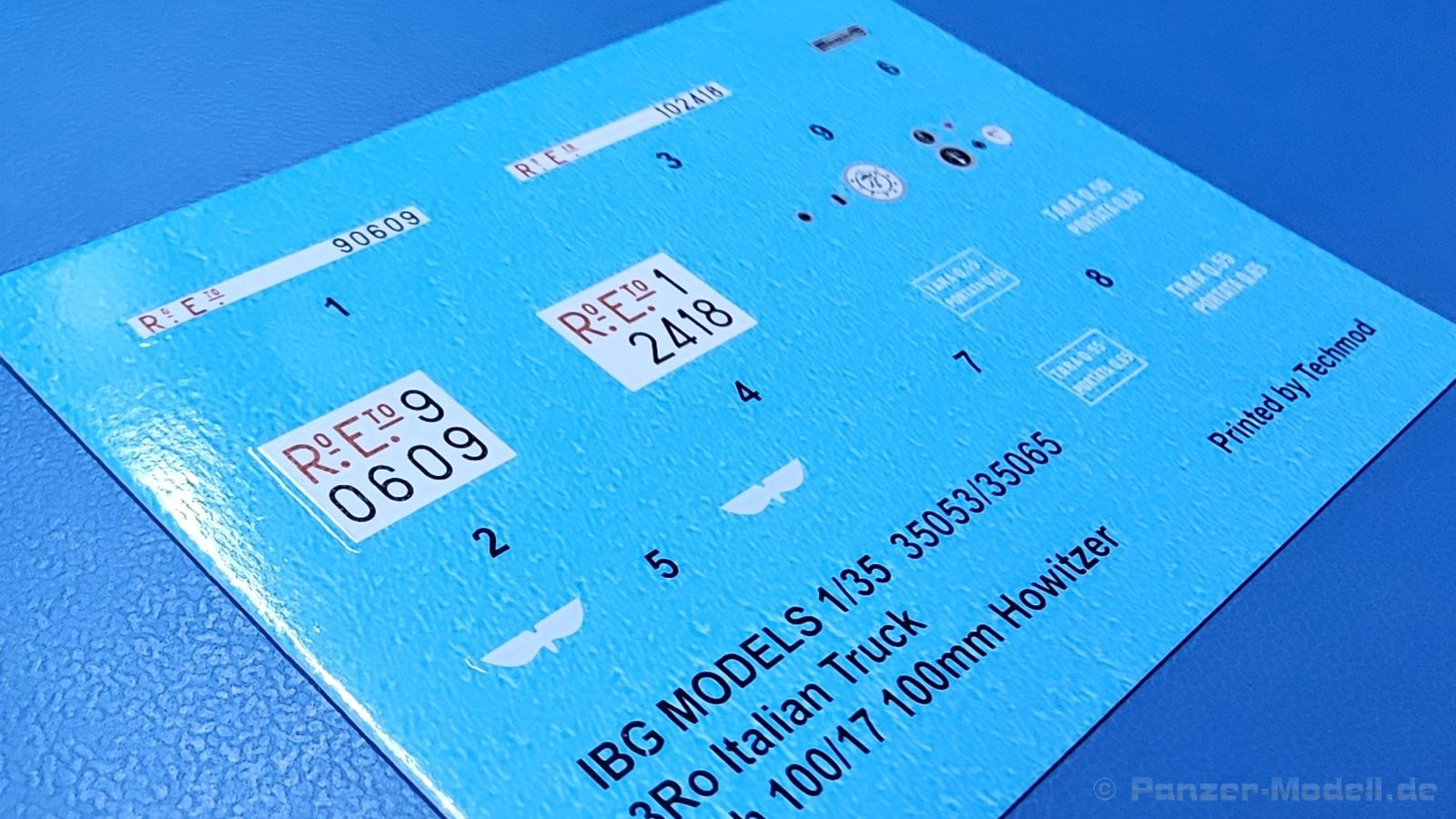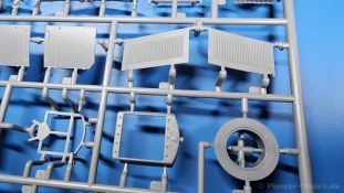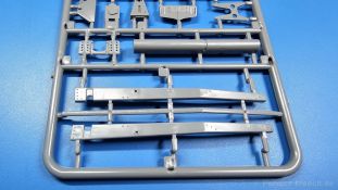 Die Auslegung des Fahrerhauses als Rechtslenker machte mich stutzig. In Italien gab es bis in die 1920-Jahre eine regional unterschiedliche Regelung mit Rechts- und Linksverkehr, welches eine Erklärung sein könnte, allerdings wurde der Lancia 3Ro erst ab 1938 entwickelt. Das oben offene Fahrerhaus ist immer noch ein viele Einzelteile aufgebrochen. An die Rückwand wird innen die durchgehende Rückenlehne angebracht. Die schmalen Seitenwände haben um unteren Ende Stangen zur Aufhängung der Trittbleche. Hier sollte man beim Hantieren aufpassen, um die Stangen nicht bereits vor der Montage des Fahrerhauses auf dem Rahmen abzubrechen. Der Boden nimmt die einteilige Sitzbank auf, deren Darstellung aber eine Trennung zwischen Fahrer- und Beifahrersitz aufweist. Es macht den Eindruck, dass der Fahrer auf dem Tank sitzt, denn rechts von seinem Sitz schaut ein Einfüllstutzen heraus. Schalt- und Handbremshebel werden ebenfalls auf den Boden geklebt. Die Fahrerhausfront ist auch beidseitig detailliert. Bereits angegossen sind die Halterungen mit den Winkern. An der Motortrennwand wird der Luftfilter mittels PE-Halterung montiert und über die Zuluftleitung mit dem Motor verbunden. Innen finden sich Kupplungs-, Brems- und Gaspedal, Lenkstange und -rad, Armaturentafel, kleine Bedienhebel und Haltebügel für den/die Beifahrer. Beidseitig detaillierte Türen können geöffnet oder geschlossen angebaut werden. Die äußeren Türgriffe werden separat angebracht. Beidseitig werden Suchscheinwerfer(?) angebracht. Für die Frontscheiben gibt es kratzer- und schlierenfreie Klarsichtteile, die aber bei dieser Version nicht angebracht werden, auch wenn sie im Bausatz enthalten sind. Die Motorhaube besteht aus dem mit angegossenem Einfüllstutzen Kühlerrahmen, der mit einem PE-Gitter verfeinert wird, den Seitenblechen mit Lüftungsrippen und den 2 Haubenteilen, die über ein schönes Klavierscharnier verbunden werden. Die Aufteilung erlaubt eine geöffnete Darstellung der Motorhaube. Die Seitenteile erhalten je 3 Riegel aus PE-Teilen. Die Vorderräder werden von großen Kotflügeln mit nach vorn ausgestellten Trittflächen überdeckt. Auf den Trittflächen werden feine Begrenzungsstangen befestigt, von denen man vorher den feinen Grat entfernen sollte. Die ausgehöhlten Fahrscheinwerfer mit Klarsichtscheiben finden seitlich am Kühlerrahmen ihren Platz. Der Boden der Ladefläche wird auf einen einteiligen Hilfsrahmen montiert und weist eine Holzbohlenstruktur auf, sowie den genieteten Rahmen für die Aufnahme der Haubitze. Die Ladefläche wird an den vier Seiten von entsprechenden und ebenfalls optisch ansprechenden Seitenwänden abgeschlossen. Zusätzlich gibt es zwei Staukisten und eine Sitzbank für die Geschützbedienung. Der Unterboden bekommt noch die Schmutzfänger der Hinterräder, die zusätzlich durch Fotoätzteile abgestützt werden. Auf der linken Unterseite wird noch eine Halterung mit fünf 20 Liter Kanistern angebracht. Jeder Kanister besteht aus zwei Längshälften und dem Griff. Der Ausguss mit geschlossenem Deckel ist an einer Hälfte bereits angegossen. Auch wenn sie durch die speziellen Versteifungsrippen wie Wehrmachtskanister aussehen, tragen sie doch fein und deutlich die Gravierung R.E. für Reggio Escercito im mittleren Feld, darunter ein C und darüber 20 Litre. Somit sind sie eindeutig italienische Kanister. Die Bauanleitung im ca. A4 Format hat 16 Seiten und ist in schwarz-weiß mit farbigen Akzenten gehalten. Kurze Beschreibungen oder Anleitungen sind in Polnisch und in Englisch gehalten. Die erste Seite startet mit Zeichenerklärungen, PE- und Decalübersicht, sowie den benötigten Farben und gibt Farbnummern für Vallejo Model Air, Hataka, Life Color, Mr. Hobby, AK Interactive und Mission Models an. Die Teile- und Spritzlingübersicht findet sich Seite 2. Der Bau des Fahrzeugs wird in 42 sinnvoll aufgeteilten, leicht verständlichen Schritten mit ausreichend großen Zeichnungen erklärt. Im Bereich des Fahrwerks erscheinen die Teile vielleicht etwas überladen. Man sollte aufpassen, dass man nichts übersieht. Einzelne Baugruppen, die in einem späteren Bauschritt verbaut werden, erhalten eine weiße Nummer in einem Dreieck. Bei Verwendung der Baugruppe erscheint das Dreieck wieder, dann in schwarzer Schrift. Am Ende der Bauschritte kommt eine Seite mit den Bau- und Bemalungsanleitungen für die Figuren. Die Anbringung der Decals und die Bemalungsanleitung für zwei Fahrzeuge finden sich auf den letzten Seiten. · R.E. 90609 - Nordafrika 1941 in einfarbig Sahara Khaki · R.E. 102418 - Nordafrika 1942 in Sahara Khaki mit graugrünen Tarnstreifen Während bei den Erstausgaben von 35053 noch keine Decals für die Armaturen dabei waren, sind sie diesmal dabei. Die Decals sind leicht seidenmatt glänzend mit wenig Trägerrand. Leider geht die Bauanleitung nicht auf die Anbringung der Armaturendecals ein. Der Bausatz hat schon allein einiges geboten, aber zusammen mit den Figuren kommt jetzt noch Diorama-Potential dazu. Winzige Plastik- (z.B. Pedale und Bedienknöpfe) und Fotoätzteile (z.B. Haubenriegel, Kanisterhalterungen) erfordern Modellbauerfahrung. Sicherlich ein Modell, das Herausforderung und Spaß beim Bau verspricht und ein äußerst befriedigendes Ergebnis.