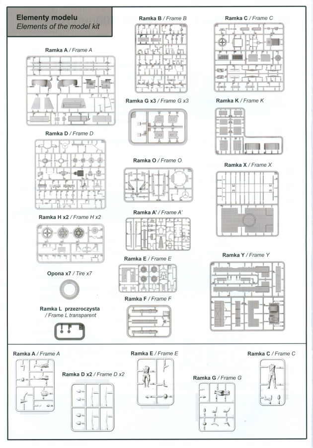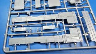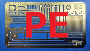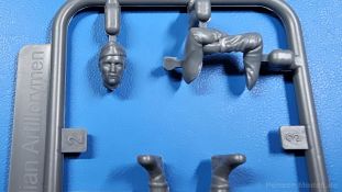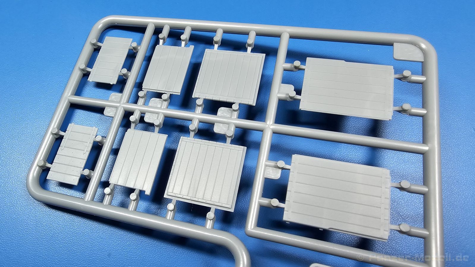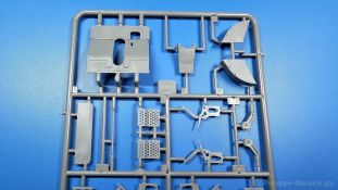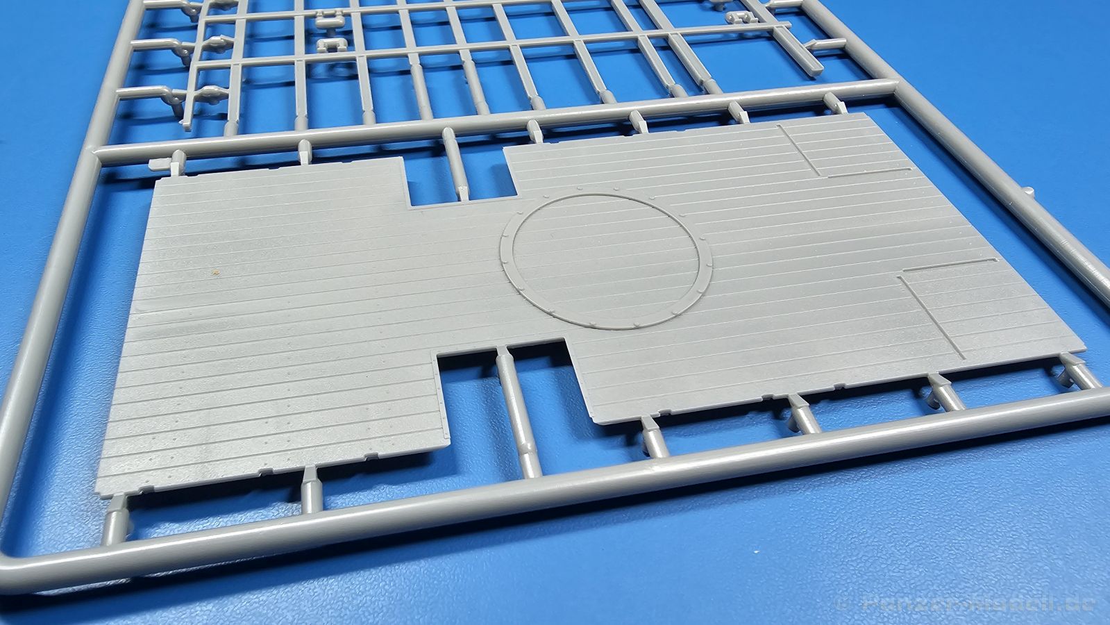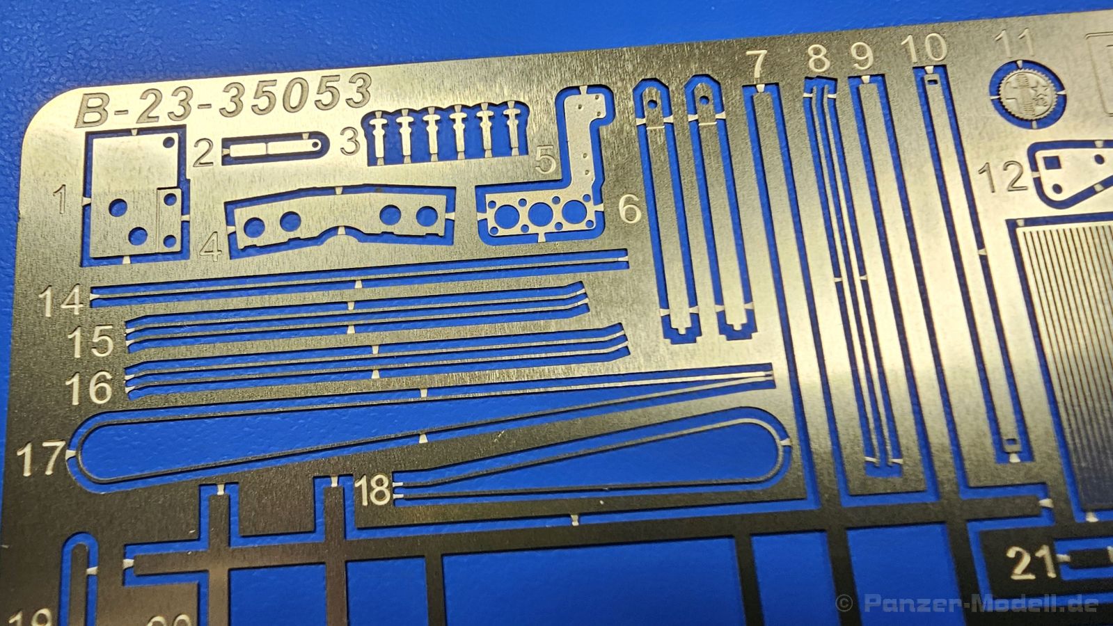 Die Auslegung des Fahrerhauses als Rechtslenker machte mich stutzig. In Italien gab es bis in die 1920-Jahre eine regional unterschiedliche Regelung mit Rechts- und Linksverkehr, welches eine Erklärung sein könnte, allerdings wurde der Lancia 3Ro erst ab 1938 entwickelt. Das oben offene Fahrerhaus ist immer noch ein viele Einzelteile aufgebrochen. An die Rückwand wird innen die durchgehende Rückenlehne angebracht. Die schmalen Seitenwände haben um unteren Ende Stangen zur Aufhängung der Trittbleche. Hier sollte man beim Hantieren aufpassen, um die Stangen nicht bereits vor der Montage des Fahrerhauses auf dem Rahmen abzubrechen. Der Boden nimmt die einteilige Sitzbank auf, deren Darstellung aber eine Trennung zwischen Fahrer- und Beifahrersitz aufweist. Es macht den Eindruck, dass der Fahrer auf dem Tank sitzt, denn rechts von seinem Sitz schaut ein Einfüllstutzen heraus. Schalt- und Handbremshebel werden ebenfalls auf den Boden geklebt. Die Fahrerhausfront ist auch beidseitig detailliert. Bereits angegossen sind die Halterungen mit den Winkern. An der Motortrennwand wird der Luftfilter mittels PE-Halterung montiert und über die Zuluftleitung mit dem Motor verbunden. Innen finden sich Kupplungs-, Brems- und Gaspedal, Lenkstange und -rad, Armaturentafel, kleine Bedienhebel und Haltebügel für den/die Beifahrer. Beidseitig detaillierte Türen können geöffnet oder geschlossen angebaut werden. Die äußeren Türgriffe werden separat angebracht. Beidseitig werden Suchscheinwerfer(?) angebracht. Für die Frontscheiben gibt es kratzer- und schlierenfreie Klarsichtteile, die aber bei dieser Version nicht angebracht werden, auch wenn sie im Bausatz enthalten sind. Die Motorhaube besteht aus dem mit angegossenem Einfüllstutzen Kühlerrahmen, der mit einem PE-Gitter verfeinert wird, den Seitenblechen mit Lüftungsrippen und den 2 Haubenteilen, die über ein schönes Klavierscharnier verbunden werden. Die Aufteilung erlaubt eine geöffnete Darstellung der Motorhaube. Die Seitenteile erhalten je 3 Riegel aus PE-Teilen. Die Vorderräder werden von großen Kotflügeln mit nach vorn ausgestellten Trittflächen überdeckt. Auf den Trittflächen werden feine Begrenzungsstangen befestigt, von denen man vorher den feinen Grat entfernen sollte. Die ausgehöhlten Fahrscheinwerfer mit Klarsichtscheiben finden seitlich am Kühlerrahmen ihren Platz. Der Boden der Ladefläche wird auf einen einteiligen Hilfsrahmen montiert und weist eine Holzbohlenstruktur auf, sowie den genieteten Rahmen für die Aufnahme der Haubitze. Die Ladefläche wird an den vier Seiten von entsprechenden und ebenfalls optisch ansprechenden Seitenwänden abgeschlossen. Zusätzlich gibt es zwei Staukisten und eine Sitzbank für die Geschützbedienung. Der Unterboden bekommt noch die Schmutzfänger der Hinterräder, die zusätzlich durch Fotoätzteile abgestützt werden. Auf der linken Unterseite wird noch eine Halterung mit fünf 20 Liter Kanistern angebracht. Jeder Kanister besteht aus zwei Längshälften und dem Griff. Der Ausguss mit geschlossenem Deckel ist an einer Hälfte bereits angegossen. Auch wenn sie durch die speziellen Versteifungsrippen wie Wehrmachtskanister aussehen, tragen sie doch fein und deutlich die Gravierung R.E. für Reggio Escercito im mittleren Feld, darunter ein C und darüber 20 Litre. Somit sind sie eindeutig italienische Kanister. Die Bauanleitung im ca. A4 Format hat 16 Seiten und ist in schwarz-weiß mit farbigen Akzenten gehalten. Kurze Beschreibungen oder Anleitungen sind in Polnisch und in Englisch gehalten. Die erste Seite startet mit Zeichenerklärungen, PE- und Decalübersicht, sowie den benötigten Farben und gibt Farbnummern für Vallejo Model Air, Hataka, Life Color, Mr. Hobby, AK Interactive und Mission Models an. Die Teile- und Spritzlingübersicht findet sich Seite 2. Der Bau des Fahrzeugs wird in 42 sinnvoll aufgeteilten, leicht verständlichen Schritten mit ausreichend großen Zeichnungen erklärt. Im Bereich des Fahrwerks erscheinen die Teile vielleicht etwas überladen. Man sollte aufpassen, dass man nichts übersieht. Einzelne Baugruppen, die in einem späteren Bauschritt verbaut werden, erhalten eine weiße Nummer in einem Dreieck. Bei Verwendung der Baugruppe erscheint das Dreieck wieder, dann in schwarzer Schrift. Am Ende der Bauschritte kommt eine Seite mit den Bau- und Bemalungsanleitungen für die Figuren. Die Anbringung der Decals und die Bemalungsanleitung für zwei Fahrzeuge finden sich auf den letzten Seiten. · R.E. 90609 - Nordafrika 1941 in einfarbig Sahara Khaki · R.E. 102418 - Nordafrika 1942 in Sahara Khaki mit graugrünen Tarnstreifen Während bei den Erstausgaben von 35053 noch keine Decals für die Armaturen dabei waren, sind sie diesmal dabei. Die Decals sind leicht seidenmatt glänzend mit wenig Trägerrand. Leider geht die Bauanleitung nicht auf die Anbringung der Armaturendecals ein. Der Bausatz hat schon allein einiges geboten, aber zusammen mit den Figuren kommt jetzt noch Diorama-Potential dazu. Winzige Plastik- (z.B. Pedale und Bedienknöpfe) und Fotoätzteile (z.B. Haubenriegel, Kanisterhalterungen) erfordern Modellbauerfahrung. Sicherlich ein Modell, das Herausforderung und Spaß beim Bau verspricht und ein äußerst befriedigendes Ergebnis.