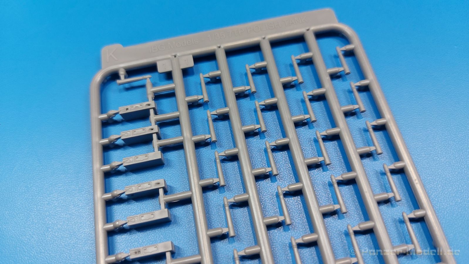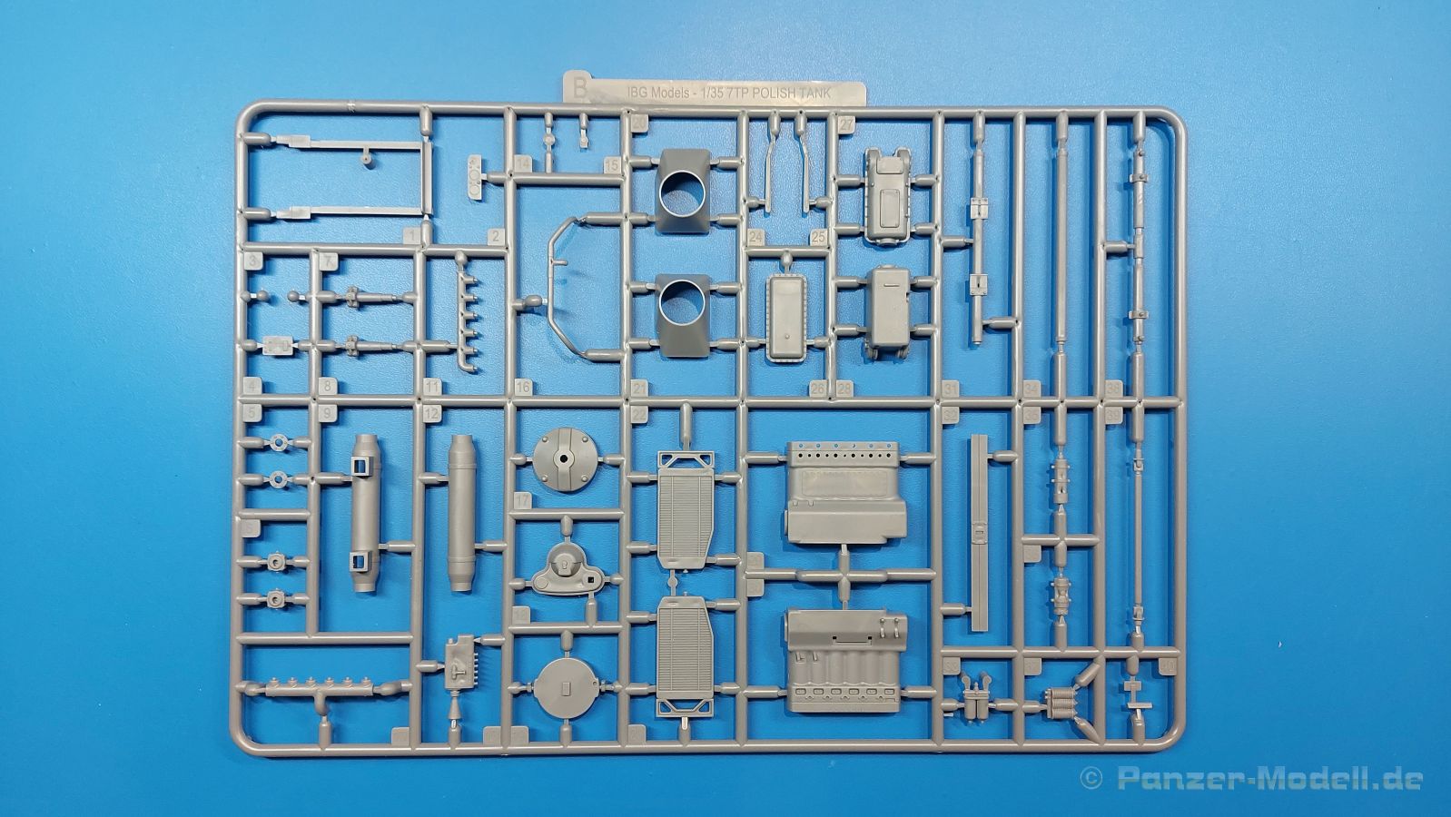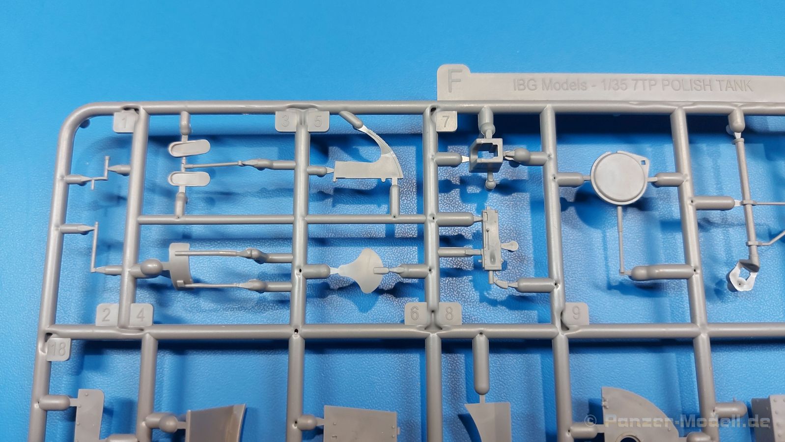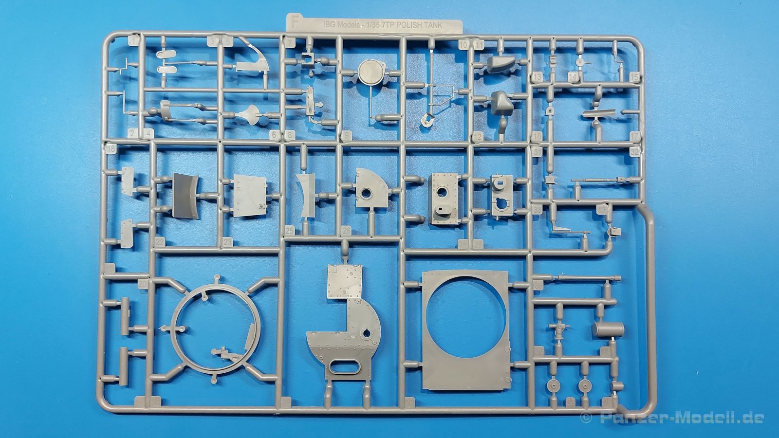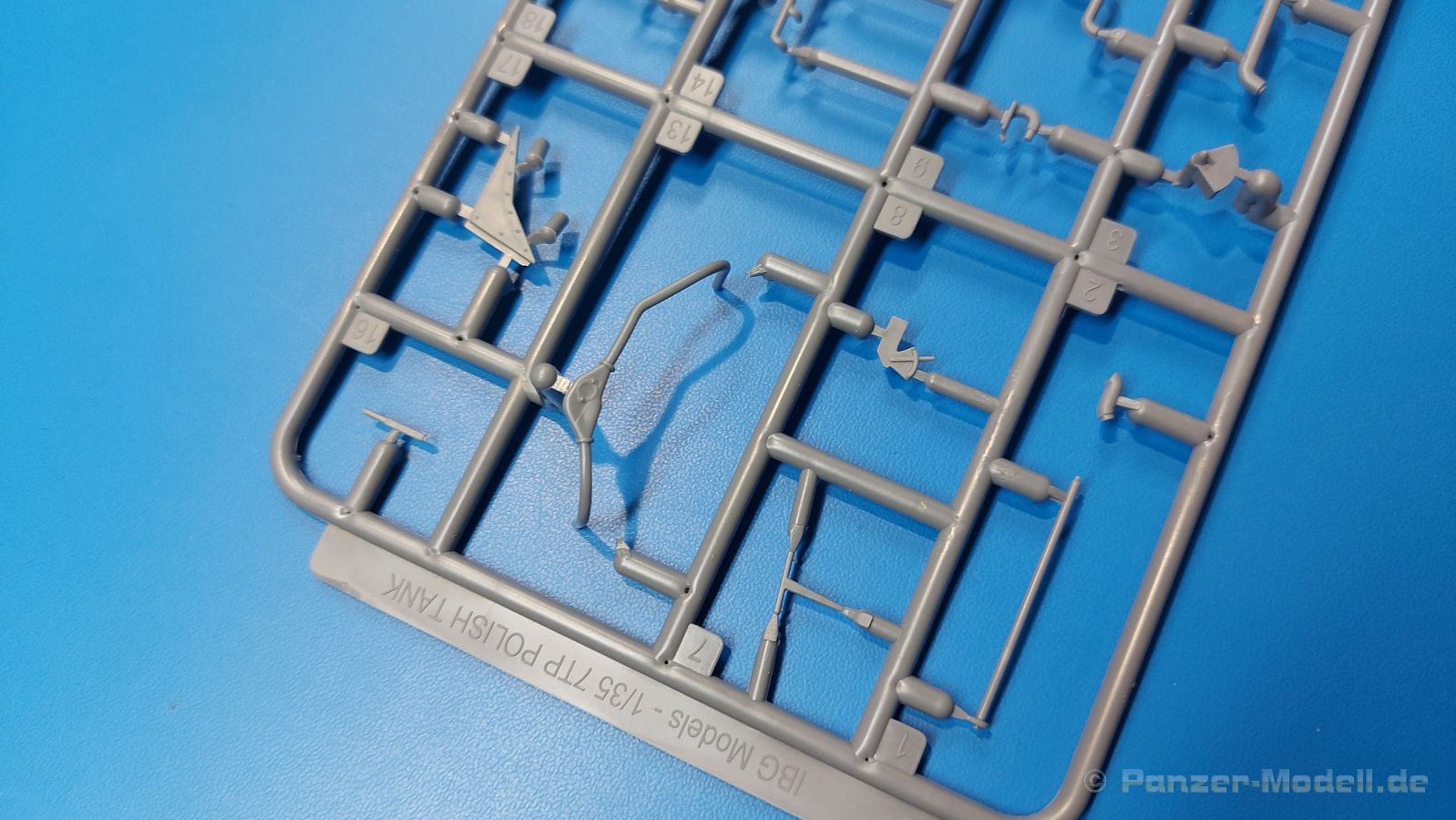Die Bausätze: IBG hat bereits einige polnische 7TP mit Einzel- und Doppelturm inklusive vollständiger Inneneinrichtung herausgebracht. Da dieser Panzer von der Wehrmacht als Beutefahrzeug übernommen und eingesetzt wurde, bringt der Hersteller konsequenterweise nun auch diese Version auf den Markt. Der Karton mit Stülpdeckel hat die gleiche Größe wie die seiner Vorgänger - 400 x 260 x 60 mm. Die meisten Spritzlinge sind einzeln in Klarsichttüten verpackt. Im Karton enthalten sind 13 hell-graue, ein Klarsichtspritzling, 1 PE-Platine, Decals und die Bauanleitung. Bei den vorigen 7TP Bausätzen wiesen einige Spritzlinge tiefe Sinkstellen auf, die leider auch wieder in diesem vorzufinden sind. Die im Spritzrahmen selbst sollten uns nicht stören, aber auch einige Teile sind betroffen. So hat es auch wieder einige der MG-Munitionskästen (Teile K2) erwischt, aber da man nur 10 Kästen braucht, sind genügend einwandfreie vorhanden. Weitere Sinkstellen sind z.B. am Auspuffkrümmer, dem Gehäuse des Turm-MGs, den Ölfiltern, der Einspritzpumpe und der Lichtmaschine. Da dies Teile der Inneneinrichtung sind, entscheidet man selbst, ob man die Sinkstellen ignoriert, da nach dem Bau kaum noch sichtbar und man sich die Mühe des Verspachtelns auf sich nimmt, weil man das perfekte Modell bauen möchte. Sinnigerweise machen die Teile selbst einen sehr guten Eindruck, mit schönen, feinen Details wie zum Beispiel der Griff und der Verschluss grade an den MG-Gurtkästen. Angüsse sind so gesetzt, dass Details nicht beeinträchtigt werden. Man entdeckt Auswerferspuren auf einigen größeren Teilen wie Motorabdeckung oder Bodenplatte, aber sie sind flach und an Stellen, die später kaum einzusehen sind oder von anderen Teilen überdeckt werden. Die Klarsichtteile für die Scheinwerfer sind kristallklar, ohne Kratzer oder Schlieren. Auch die PE-Teile hinterlassen einen guten Eindruck, grad die Gitter. Die Unterwanne besteht aus Bodenplatte, Seitenteilen und Heckplatte. Auf den Innenseiten kann man die Nietrahmen samt Nieten sehen, auf die beim Original die Panzerplatten genietet waren. Entsprechend sind außen die Nietköpfe und bei den Seitenteilen zusätzlich Trennfugen zu sehen. Die Aufnahmen der Stützrollen sind auch von innen zu sehen und werden mit PE-Platten dargestellt. Eine Zwischenwand trennt Motor- und Kampfraum. Sie ist mit zwei Wartungsklappen mit Scharnieren versehen und enthält zwei Öffnungen, für die feine PE-Gitter beiliegen. Der 6-Zylinder Diesel-Reihenmotor ist sehr detailliert. Der Motorblock besteht aus zwei Längshälften, die mit Ventildeckel und Ölwanne geschlossen werden. Alle wichtigen Anbauteile sind vorhanden - Einspritzpumpe, Anlasser, Luft-, Kraftstoff-, Ölfilter, Abgaskrümmer, Luftkanal, Kühlleitungen, Turbolader(?) und Kupplungsdom. Der Motor ruht auf einem Rahmen aus L-Profilen, der auf der Querachse der hinteren Laufrollenwagen aufliegt. 2 Kühler mit feinen Rippen bekommen je ein Luftgehäuse mit Ventilatoren. Über Keilriemen mit Keilriemenscheiben, die zusammen aus einem Teil bestehen, werden die Ventilatoren mit dem Motor verbunden. Den Motorraum mit all seinen Details zu verschließen, wäre eine Schande, aber es gibt auch einen Lichtblick. Die Heckplatte enthält eine große Öffnung, für die es zwei große Klappen mit PE-Handgriffen gibt, die geschlossen oder offen angebaut werden können. Die Öffnung für die Starterkurbel wird mit einem PE-Deckel verschlossen und ein Rücklicht angebracht. Der Auspuff besteht aus dem eigentlichen Rohr, das am Ende angeschrägt und ausgehöhlt ist und von den beiden Schalldämpferhälften umschlossen wird. Leider sind die seitlichen Wartungsklappen geschlossen angegossen. Der Motordeckel enthält zwei große, angegossene Lüftergrätings, die durchbrochen dargestellt sind. Für 2 weitere Öffnungen gibt es PE-Gitter, die annähernd pyramidenförmig gebogen werden müssen. Je nach Passform werde ich den Motordeckel nur auflegen, nicht kleben. So kann man immer mal wieder einen Blick hineinwerfen. Für das untere Heck gibt es noch einen T-Träger, der als Aufnahme für Ersatzkettenglieder dient und mittig eine Anhängekupplung mit PE-Riegel erhält. Vom Motor nach vorn führt ein Kardangehäuse durch den Kampfraum. IBG hat sich nicht einfach mit dem Gehäuse zufriedengegeben, sondern dieses in Unter- und Oberschale geteilt. Die Kardanwelle mit schönen Gelenken wird in das Gehäuse eingelegt. Man kann also auch eine Wartungsszene mit entfernter Oberschale darstellen (Gelenke abschmieren oder Reparatur). Ein Schaltgetriebeblock wird vorn mittig auf die Bodenplatte gesetzt. Schalthebel und Schaltkulisse (letztere aus einem PE-Teil zu biegen) bringt man auf der Fahrerseite an. Die vom Schaltgetriebe abgehenden Antriebswellengehäuse sind mehrteilig ausgeführt und sehr schön mit Ecken und Kanten und Verschraubungen wiedergegeben. Sie schließen an den Lenkbremsen an. Die Querachse der vorderen Rollenwagen findet vor dem Fahrersitz und unter der Kardanwelle seinen Platz. Auch die Antriebsräder haben eine Querachse, die feine Lager bekommen und Ausstellhebel aus PE. Das Lenkbremssystem ist mit Hebeln, Widerlagern und natürlich den Lenkbremshebeln des Fahrers wiedergegeben. Auch hier wird die Detaillierung mittels PE unterstützt. Der zweiteilige Kraftstofftank wird links von Schaltgetriebe auf den Boden gesetzt. (Als Fahrer eines solchen Gefechtsfahrzeuges würde ich mich da nicht so wohl fühlen!) Der Fahrersitz besitzt aus Sitzpolster (mit Vertiefungen auf der Sitzfläche) und der Rückenlehne. Dem Fahrer steht zudem ein Bremspedal aus Plastik und ein Gaspedal aus PE zur Verfügung. Im Kampfraum hinter dem Fahrer findet der Munitionsbunker aus PE seinen Platz. Er kann 80 Schuss Kanonenmunition und 10 Patronenkästen MG-Munition aufnehmen. Die beiden K-Spritzlinge enthalten je 41 einzelne 37mm Patronen und 15 MG-Gurtkästen, also mehr als genug! Der Kampfraum wird nach oben mit einer Platte geschlossen, die natürlich