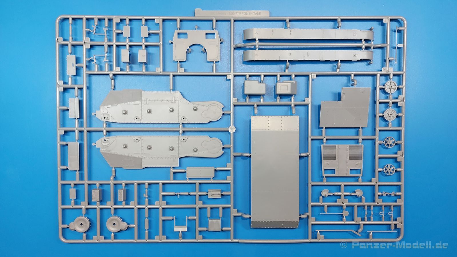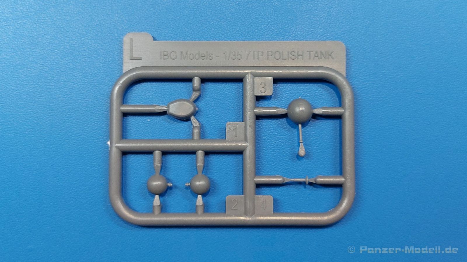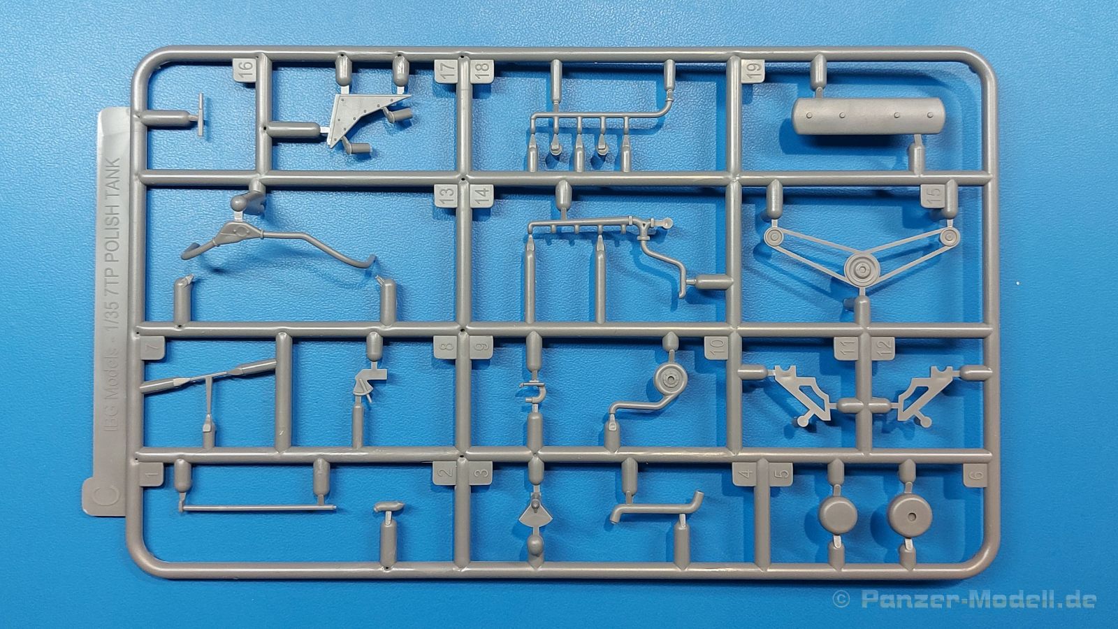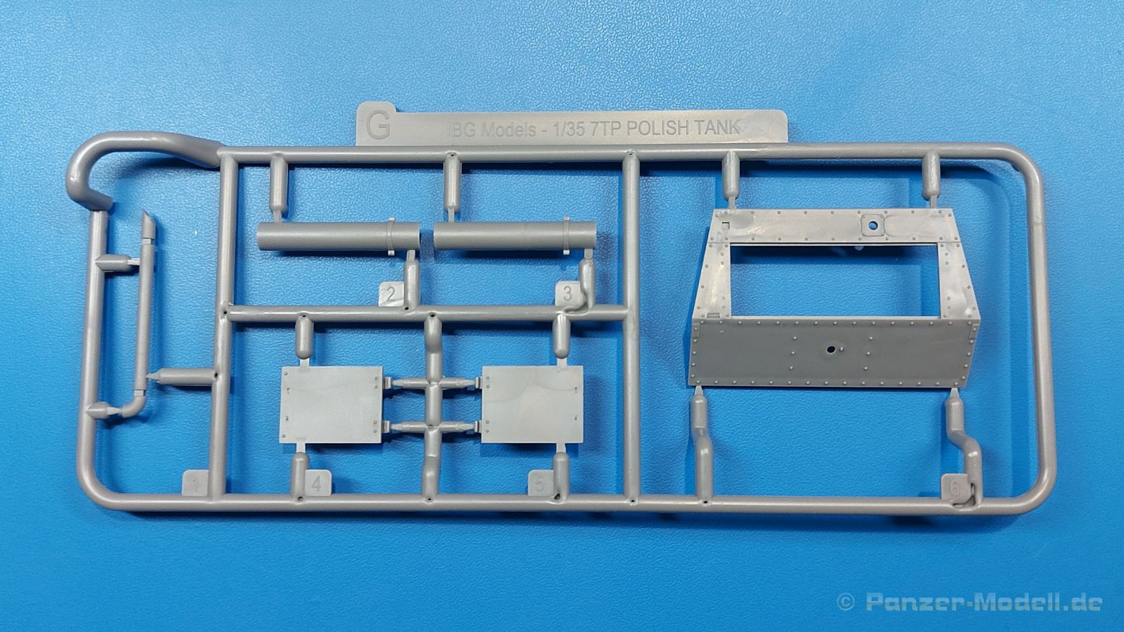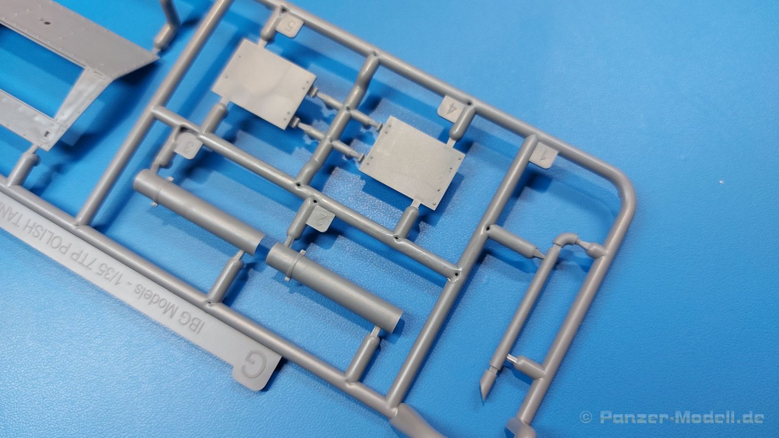 Die Bausätze: IBG hat bereits einige polnische 7TP mit Einzel- und Doppelturm inklusive vollständiger Inneneinrichtung herausgebracht. Da dieser Panzer von der Wehrmacht als Beutefahrzeug übernommen und eingesetzt wurde, bringt der Hersteller konsequenterweise nun auch diese Version auf den Markt. Der Karton mit Stülpdeckel hat die gleiche Größe wie die seiner Vorgänger - 400 x 260 x 60 mm. Die meisten Spritzlinge sind einzeln in Klarsichttüten verpackt. Im Karton enthalten sind 13 hell-graue, ein Klarsichtspritzling, 1 PE-Platine, Decals und die Bauanleitung. Bei den vorigen 7TP Bausätzen wiesen einige Spritzlinge tiefe Sinkstellen auf, die leider auch wieder in diesem vorzufinden sind. Die im Spritzrahmen selbst sollten uns nicht stören, aber auch einige Teile sind betroffen. So hat es auch wieder einige der MG-Munitionskästen (Teile K2) erwischt, aber da man nur 10 Kästen braucht, sind genügend einwandfreie vorhanden. Weitere Sinkstellen sind z.B. am Auspuffkrümmer, dem Gehäuse des Turm-MGs, den Ölfiltern, der Einspritzpumpe und der Lichtmaschine. Da dies Teile der Inneneinrichtung sind, entscheidet man selbst, ob man die Sinkstellen ignoriert, da nach dem Bau kaum noch sichtbar und man sich die Mühe des Verspachtelns auf sich nimmt, weil man das perfekte Modell bauen möchte. Sinnigerweise machen die Teile selbst einen sehr guten Eindruck, mit schönen, feinen Details wie zum Beispiel der Griff und der Verschluss grade an den MG-Gurtkästen. Angüsse sind so gesetzt, dass Details nicht beeinträchtigt werden. Man entdeckt Auswerferspuren auf einigen größeren Teilen wie Motorabdeckung oder Bodenplatte, aber sie sind flach und an Stellen, die später kaum einzusehen sind oder von anderen Teilen überdeckt werden. Die Klarsichtteile für die Scheinwerfer sind kristallklar, ohne Kratzer oder Schlieren. Auch die PE-Teile hinterlassen einen guten Eindruck, grad die Gitter. Die Unterwanne besteht aus Bodenplatte, Seitenteilen und Heckplatte. Auf den Innenseiten kann man die Nietrahmen samt Nieten sehen, auf die beim Original die Panzerplatten genietet waren. Entsprechend sind außen die Nietköpfe und bei den Seitenteilen zusätzlich Trennfugen zu sehen. Die Aufnahmen der Stützrollen sind auch von innen zu sehen und werden mit PE-Platten dargestellt. Eine Zwischenwand trennt Motor- und Kampfraum. Sie ist mit zwei Wartungsklappen mit Scharnieren versehen und enthält zwei Öffnungen, für die feine PE-Gitter beiliegen. Der 6-Zylinder Diesel-Reihenmotor ist sehr detailliert. Der Motorblock besteht aus zwei Längshälften, die mit Ventildeckel und Ölwanne geschlossen werden. Alle wichtigen Anbauteile sind vorhanden - Einspritzpumpe, Anlasser, Luft-, Kraftstoff-, Ölfilter, Abgaskrümmer, Luftkanal, Kühlleitungen, Turbolader(?) und Kupplungsdom. Der Motor ruht auf einem Rahmen aus L-Profilen, der auf der Querachse der hinteren Laufrollenwagen aufliegt. 2 Kühler mit feinen Rippen bekommen je ein Luftgehäuse mit Ventilatoren. Über Keilriemen mit Keilriemenscheiben, die zusammen aus einem Teil bestehen, werden die Ventilatoren mit dem Motor verbunden. Den Motorraum mit all seinen Details zu verschließen, wäre eine Schande, aber es gibt auch einen Lichtblick. Die Heckplatte enthält eine große Öffnung, für die es zwei große Klappen mit PE-Handgriffen gibt, die geschlossen oder offen angebaut werden können. Die Öffnung für die Starterkurbel wird mit einem PE-Deckel verschlossen und ein Rücklicht angebracht. Der Auspuff besteht aus dem eigentlichen Rohr, das am Ende angeschrägt und ausgehöhlt ist und von den beiden Schalldämpferhälften umschlossen wird. Leider sind die seitlichen Wartungsklappen geschlossen angegossen. Der Motordeckel enthält zwei große, angegossene Lüftergrätings, die durchbrochen dargestellt sind. Für 2 weitere Öffnungen gibt es PE-Gitter, die annähernd pyramidenförmig gebogen werden müssen. Je nach Passform werde ich den Motordeckel nur auflegen, nicht kleben. So kann man immer mal wieder einen Blick hineinwerfen. Für das untere Heck gibt es noch einen T-Träger, der als Aufnahme für Ersatzkettenglieder dient und mittig eine Anhängekupplung mit PE-Riegel erhält. Vom Motor nach vorn führt ein Kardangehäuse durch den Kampfraum. IBG hat sich nicht einfach mit dem Gehäuse zufriedengegeben, sondern dieses in Unter- und Oberschale geteilt. Die Kardanwelle mit schönen Gelenken wird in das Gehäuse eingelegt. Man kann also auch eine Wartungsszene mit entfernter Oberschale darstellen (Gelenke abschmieren oder Reparatur). Ein Schaltgetriebeblock wird vorn mittig auf die Bodenplatte gesetzt. Schalthebel und Schaltkulisse (letztere aus einem PE-Teil zu biegen) bringt man auf der Fahrerseite an. Die vom Schaltgetriebe abgehenden Antriebswellengehäuse sind mehrteilig ausgeführt und sehr schön mit Ecken und Kanten und Verschraubungen wiedergegeben. Sie schließen an den Lenkbremsen an. Die Querachse der vorderen Rollenwagen findet vor dem Fahrersitz und unter der Kardanwelle seinen Platz. Auch die Antriebsräder haben eine Querachse, die feine Lager bekommen und Ausstellhebel aus PE. Das Lenkbremssystem ist mit Hebeln, Widerlagern und natürlich den Lenkbremshebeln des Fahrers wiedergegeben. Auch hier wird die Detaillierung mittels PE unterstützt. Der zweiteilige Kraftstofftank wird links von Schaltgetriebe auf den Boden gesetzt. (Als Fahrer eines solchen Gefechtsfahrzeuges würde ich mich da nicht so wohl fühlen!) Der Fahrersitz besitzt aus Sitzpolster (mit Vertiefungen auf der Sitzfläche) und der Rückenlehne. Dem Fahrer steht zudem ein Bremspedal aus Plastik und ein Gaspedal aus PE zur Verfügung. Im Kampfraum hinter dem Fahrer findet der Munitionsbunker aus PE seinen Platz. Er kann 80 Schuss Kanonenmunition und 10 Patronenkästen MG-Munition aufnehmen. Die beiden K-Spritzlinge enthalten je 41 einzelne 37mm Patronen und 15 MG-Gurtkästen, also mehr als genug! Der Kampfraum wird nach oben mit einer Platte geschlossen, die natürlich