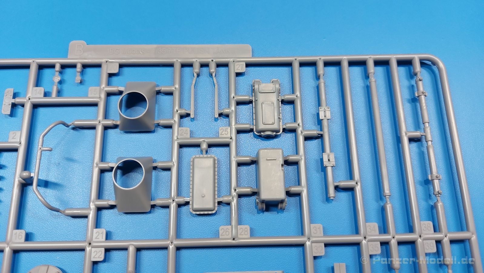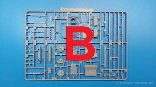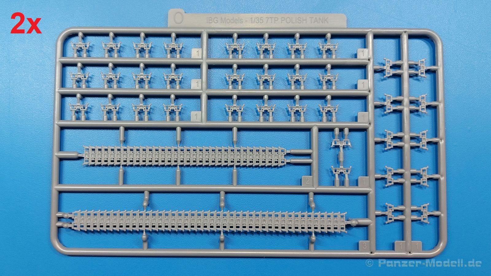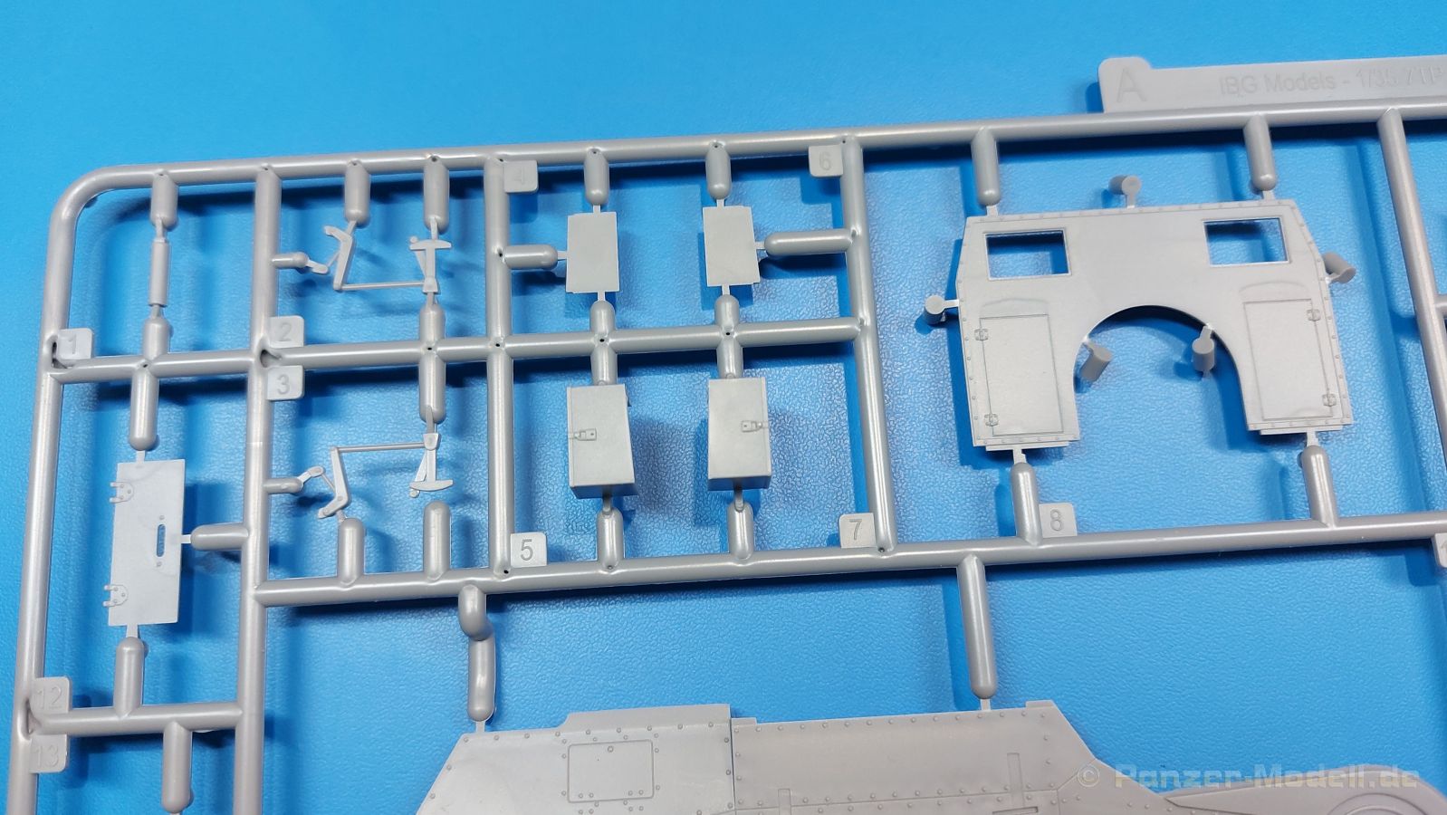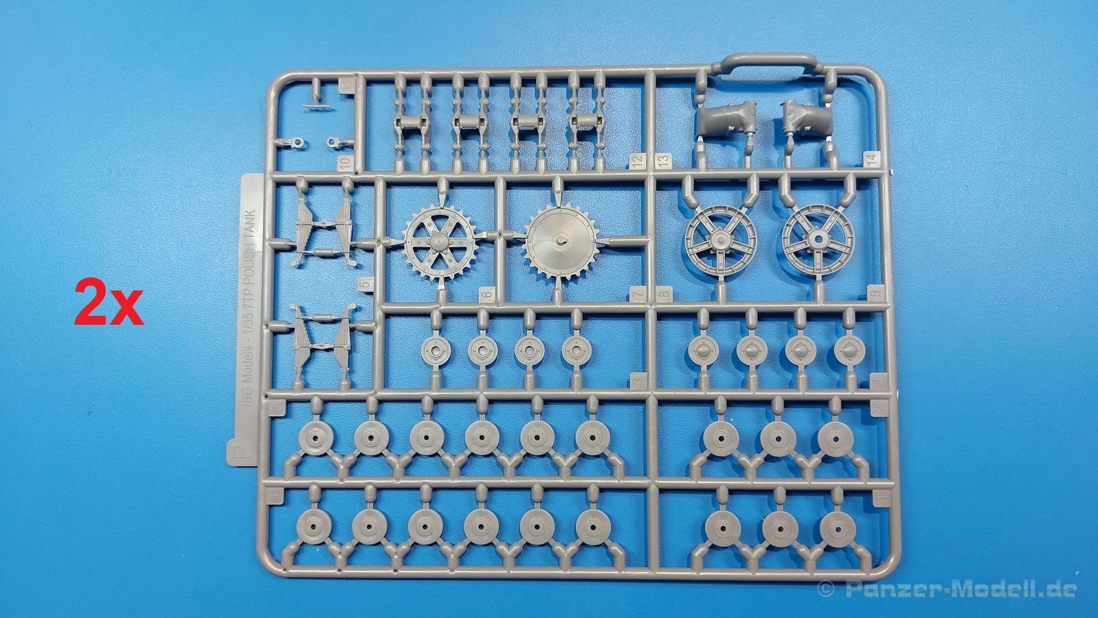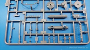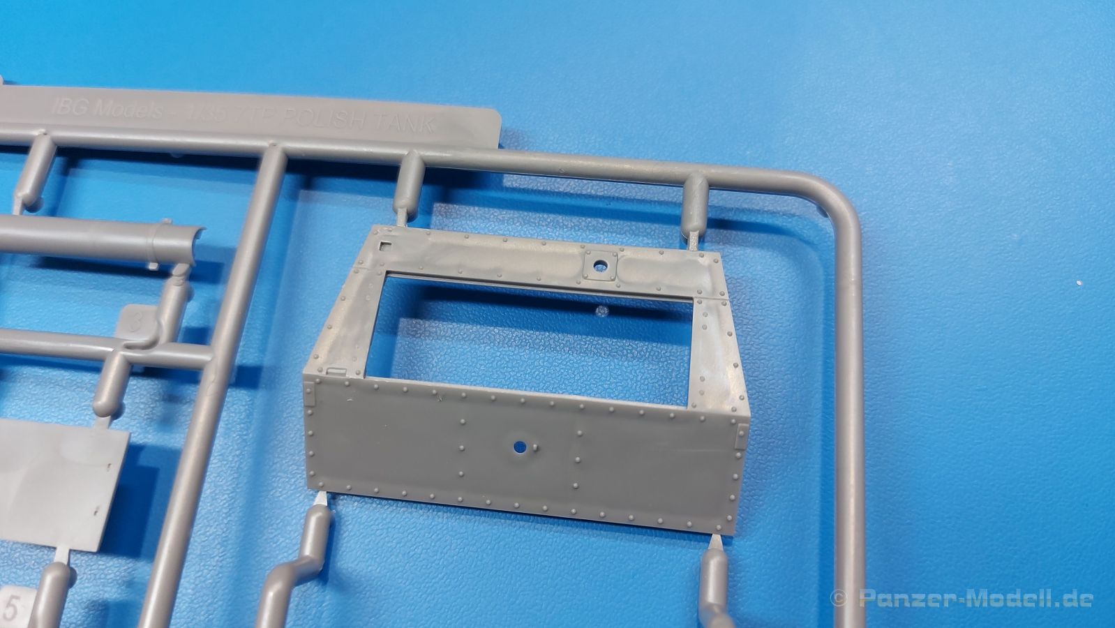 Die Bausätze: IBG hat bereits einige polnische 7TP mit Einzel- und Doppelturm inklusive vollständiger Inneneinrichtung herausgebracht. Da dieser Panzer von der Wehrmacht als Beutefahrzeug übernommen und eingesetzt wurde, bringt der Hersteller konsequenterweise nun auch diese Version auf den Markt. Der Karton mit Stülpdeckel hat die gleiche Größe wie die seiner Vorgänger - 400 x 260 x 60 mm. Die meisten Spritzlinge sind einzeln in Klarsichttüten verpackt. Im Karton enthalten sind 13 hell-graue, ein Klarsichtspritzling, 1 PE-Platine, Decals und die Bauanleitung. Bei den vorigen 7TP Bausätzen wiesen einige Spritzlinge tiefe Sinkstellen auf, die leider auch wieder in diesem vorzufinden sind. Die im Spritzrahmen selbst sollten uns nicht stören, aber auch einige Teile sind betroffen. So hat es auch wieder einige der MG-Munitionskästen (Teile K2) erwischt, aber da man nur 10 Kästen braucht, sind genügend einwandfreie vorhanden. Weitere Sinkstellen sind z.B. am Auspuffkrümmer, dem Gehäuse des Turm-MGs, den Ölfiltern, der Einspritzpumpe und der Lichtmaschine. Da dies Teile der Inneneinrichtung sind, entscheidet man selbst, ob man die Sinkstellen ignoriert, da nach dem Bau kaum noch sichtbar und man sich die Mühe des Verspachtelns auf sich nimmt, weil man das perfekte Modell bauen möchte. Sinnigerweise machen die Teile selbst einen sehr guten Eindruck, mit schönen, feinen Details wie zum Beispiel der Griff und der Verschluss grade an den MG-Gurtkästen. Angüsse sind so gesetzt, dass Details nicht beeinträchtigt werden. Man entdeckt Auswerferspuren auf einigen größeren Teilen wie Motorabdeckung oder Bodenplatte, aber sie sind flach und an Stellen, die später kaum einzusehen sind oder von anderen Teilen überdeckt werden. Die Klarsichtteile für die Scheinwerfer sind kristallklar, ohne Kratzer oder Schlieren. Auch die PE-Teile hinterlassen einen guten Eindruck, grad die Gitter. Die Unterwanne besteht aus Bodenplatte, Seitenteilen und Heckplatte. Auf den Innenseiten kann man die Nietrahmen samt Nieten sehen, auf die beim Original die Panzerplatten genietet waren. Entsprechend sind außen die Nietköpfe und bei den Seitenteilen zusätzlich Trennfugen zu sehen. Die Aufnahmen der Stützrollen sind auch von innen zu sehen und werden mit PE-Platten dargestellt. Eine Zwischenwand trennt Motor- und Kampfraum. Sie ist mit zwei Wartungsklappen mit Scharnieren versehen und enthält zwei Öffnungen, für die feine PE-Gitter beiliegen. Der 6-Zylinder Diesel-Reihenmotor ist sehr detailliert. Der Motorblock besteht aus zwei Längshälften, die mit Ventildeckel und Ölwanne geschlossen werden. Alle wichtigen Anbauteile sind vorhanden - Einspritzpumpe, Anlasser, Luft-, Kraftstoff-, Ölfilter, Abgaskrümmer, Luftkanal, Kühlleitungen, Turbolader(?) und Kupplungsdom. Der Motor ruht auf einem Rahmen aus L-Profilen, der auf der Querachse der hinteren Laufrollenwagen aufliegt. 2 Kühler mit feinen Rippen bekommen je ein Luftgehäuse mit Ventilatoren. Über Keilriemen mit Keilriemenscheiben, die zusammen aus einem Teil bestehen, werden die Ventilatoren mit dem Motor verbunden. Den Motorraum mit all seinen Details zu verschließen, wäre eine Schande, aber es gibt auch einen Lichtblick. Die Heckplatte enthält eine große Öffnung, für die es zwei große Klappen mit PE-Handgriffen gibt, die geschlossen oder offen angebaut werden können. Die Öffnung für die Starterkurbel wird mit einem PE-Deckel verschlossen und ein Rücklicht angebracht. Der Auspuff besteht aus dem eigentlichen Rohr, das am Ende angeschrägt und ausgehöhlt ist und von den beiden Schalldämpferhälften umschlossen wird. Leider sind die seitlichen Wartungsklappen geschlossen angegossen. Der Motordeckel enthält zwei große, angegossene Lüftergrätings, die durchbrochen dargestellt sind. Für 2 weitere Öffnungen gibt es PE-Gitter, die annähernd pyramidenförmig gebogen werden müssen. Je nach Passform werde ich den Motordeckel nur auflegen, nicht kleben. So kann man immer mal wieder einen Blick hineinwerfen. Für das untere Heck gibt es noch einen T-Träger, der als Aufnahme für Ersatzkettenglieder dient und mittig eine Anhängekupplung mit PE-Riegel erhält. Vom Motor nach vorn führt ein Kardangehäuse durch den Kampfraum. IBG hat sich nicht einfach mit dem Gehäuse zufriedengegeben, sondern dieses in Unter- und Oberschale geteilt. Die Kardanwelle mit schönen Gelenken wird in das Gehäuse eingelegt. Man kann also auch eine Wartungsszene mit entfernter Oberschale darstellen (Gelenke abschmieren oder Reparatur). Ein Schaltgetriebeblock wird vorn mittig auf die Bodenplatte gesetzt. Schalthebel und Schaltkulisse (letztere aus einem PE-Teil zu biegen) bringt man auf der Fahrerseite an. Die vom Schaltgetriebe abgehenden Antriebswellengehäuse sind mehrteilig ausgeführt und sehr schön mit Ecken und Kanten und Verschraubungen wiedergegeben. Sie schließen an den Lenkbremsen an. Die Querachse der vorderen Rollenwagen findet vor dem Fahrersitz und unter der Kardanwelle seinen Platz. Auch die Antriebsräder haben eine Querachse, die feine Lager bekommen und Ausstellhebel aus PE. Das Lenkbremssystem ist mit Hebeln, Widerlagern und natürlich den Lenkbremshebeln des Fahrers wiedergegeben. Auch hier wird die Detaillierung mittels PE unterstützt. Der zweiteilige Kraftstofftank wird links von Schaltgetriebe auf den Boden gesetzt. (Als Fahrer eines solchen Gefechtsfahrzeuges würde ich mich da nicht so wohl fühlen!) Der Fahrersitz besitzt aus Sitzpolster (mit Vertiefungen auf der Sitzfläche) und der Rückenlehne. Dem Fahrer steht zudem ein Bremspedal aus Plastik und ein Gaspedal aus PE zur Verfügung. Im Kampfraum hinter dem Fahrer findet der Munitionsbunker aus PE seinen Platz. Er kann 80 Schuss Kanonenmunition und 10 Patronenkästen MG-Munition aufnehmen. Die beiden K-Spritzlinge enthalten je 41 einzelne 37mm Patronen und 15 MG-Gurtkästen, also mehr als genug! Der Kampfraum wird nach oben mit einer Platte geschlossen, die natürlich
