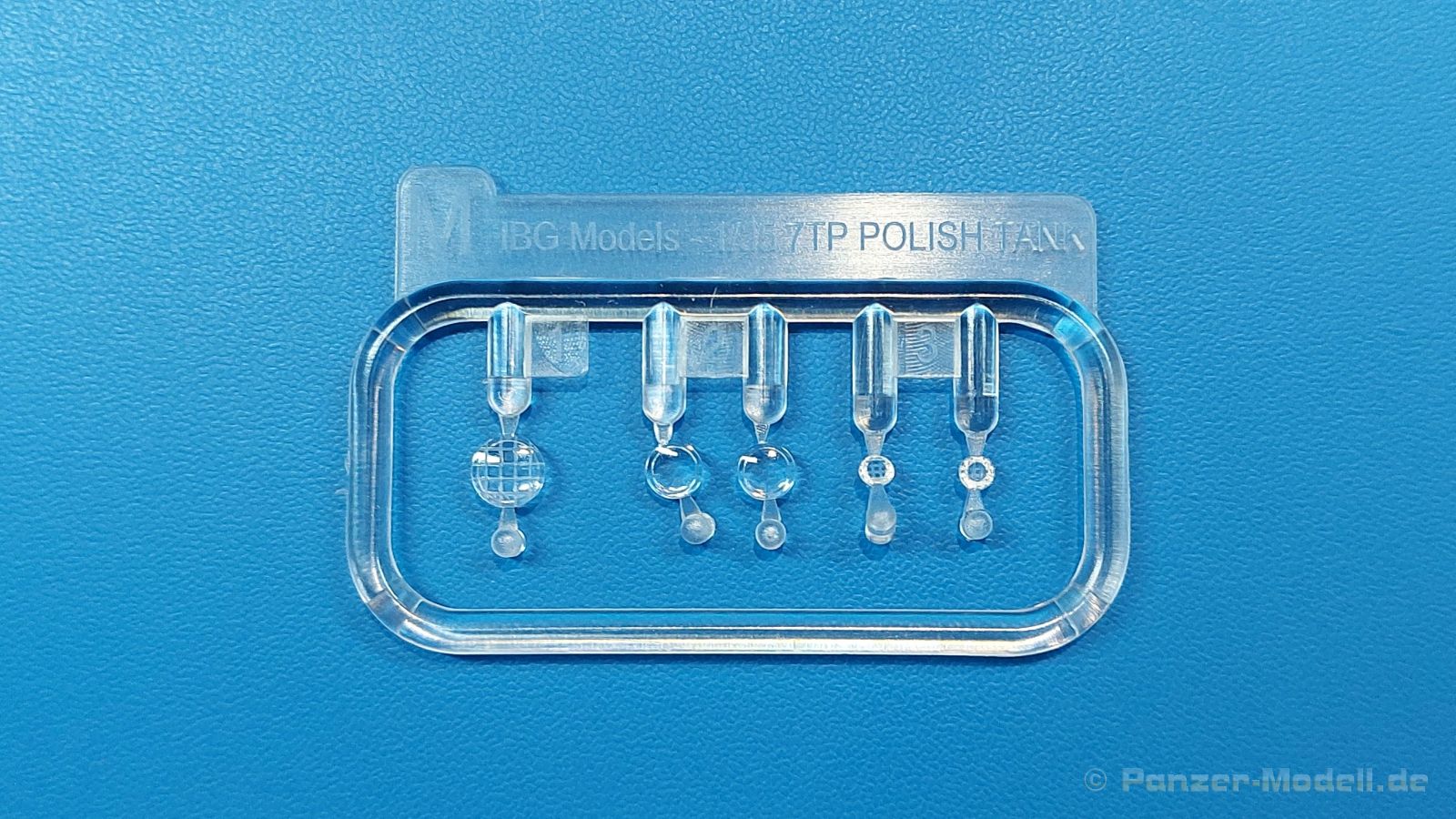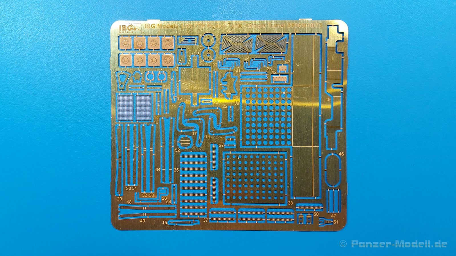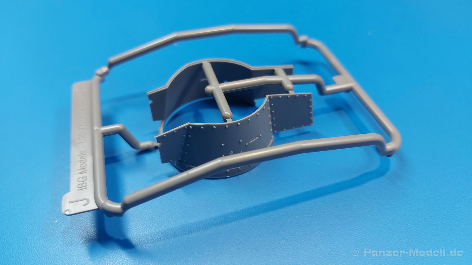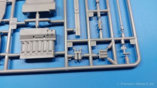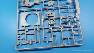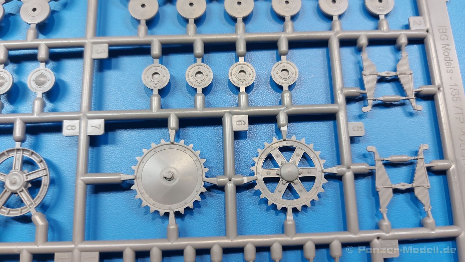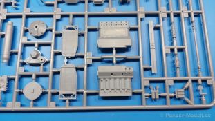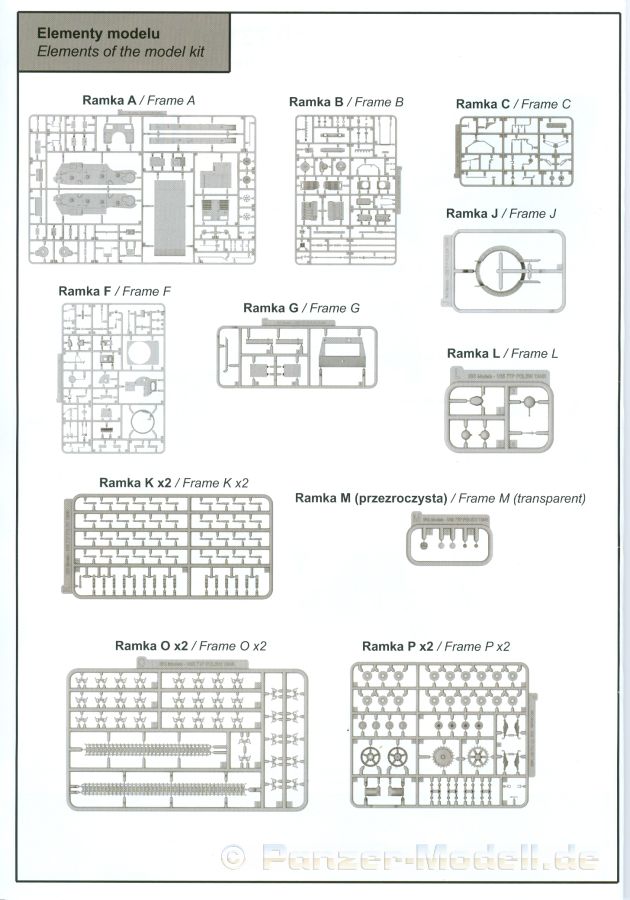 Die Bausätze: IBG hat bereits einige polnische 7TP mit Einzel- und Doppelturm inklusive vollständiger Inneneinrichtung herausgebracht. Da dieser Panzer von der Wehrmacht als Beutefahrzeug übernommen und eingesetzt wurde, bringt der Hersteller konsequenterweise nun auch diese Version auf den Markt. Der Karton mit Stülpdeckel hat die gleiche Größe wie die seiner Vorgänger - 400 x 260 x 60 mm. Die meisten Spritzlinge sind einzeln in Klarsichttüten verpackt. Im Karton enthalten sind 13 hell-graue, ein Klarsichtspritzling, 1 PE-Platine, Decals und die Bauanleitung. Bei den vorigen 7TP Bausätzen wiesen einige Spritzlinge tiefe Sinkstellen auf, die leider auch wieder in diesem vorzufinden sind. Die im Spritzrahmen selbst sollten uns nicht stören, aber auch einige Teile sind betroffen. So hat es auch wieder einige der MG-Munitionskästen (Teile K2) erwischt, aber da man nur 10 Kästen braucht, sind genügend einwandfreie vorhanden. Weitere Sinkstellen sind z.B. am Auspuffkrümmer, dem Gehäuse des Turm-MGs, den Ölfiltern, der Einspritzpumpe und der Lichtmaschine. Da dies Teile der Inneneinrichtung sind, entscheidet man selbst, ob man die Sinkstellen ignoriert, da nach dem Bau kaum noch sichtbar und man sich die Mühe des Verspachtelns auf sich nimmt, weil man das perfekte Modell bauen möchte. Sinnigerweise machen die Teile selbst einen sehr guten Eindruck, mit schönen, feinen Details wie zum Beispiel der Griff und der Verschluss grade an den MG-Gurtkästen. Angüsse sind so gesetzt, dass Details nicht beeinträchtigt werden. Man entdeckt Auswerferspuren auf einigen größeren Teilen wie Motorabdeckung oder Bodenplatte, aber sie sind flach und an Stellen, die später kaum einzusehen sind oder von anderen Teilen überdeckt werden. Die Klarsichtteile für die Scheinwerfer sind kristallklar, ohne Kratzer oder Schlieren. Auch die PE-Teile hinterlassen einen guten Eindruck, grad die Gitter. Die Unterwanne besteht aus Bodenplatte, Seitenteilen und Heckplatte. Auf den Innenseiten kann man die Nietrahmen samt Nieten sehen, auf die beim Original die Panzerplatten genietet waren. Entsprechend sind außen die Nietköpfe und bei den Seitenteilen zusätzlich Trennfugen zu sehen. Die Aufnahmen der Stützrollen sind auch von innen zu sehen und werden mit PE-Platten dargestellt. Eine Zwischenwand trennt Motor- und Kampfraum. Sie ist mit zwei Wartungsklappen mit Scharnieren versehen und enthält zwei Öffnungen, für die feine PE-Gitter beiliegen. Der 6-Zylinder Diesel-Reihenmotor ist sehr detailliert. Der Motorblock besteht aus zwei Längshälften, die mit Ventildeckel und Ölwanne geschlossen werden. Alle wichtigen Anbauteile sind vorhanden - Einspritzpumpe, Anlasser, Luft-, Kraftstoff-, Ölfilter, Abgaskrümmer, Luftkanal, Kühlleitungen, Turbolader(?) und Kupplungsdom. Der Motor ruht auf einem Rahmen aus L-Profilen, der auf der Querachse der hinteren Laufrollenwagen aufliegt. 2 Kühler mit feinen Rippen bekommen je ein Luftgehäuse mit Ventilatoren. Über Keilriemen mit Keilriemenscheiben, die zusammen aus einem Teil bestehen, werden die Ventilatoren mit dem Motor verbunden. Den Motorraum mit all seinen Details zu verschließen, wäre eine Schande, aber es gibt auch einen Lichtblick. Die Heckplatte enthält eine große Öffnung, für die es zwei große Klappen mit PE-Handgriffen gibt, die geschlossen oder offen angebaut werden können. Die Öffnung für die Starterkurbel wird mit einem PE-Deckel verschlossen und ein Rücklicht angebracht. Der Auspuff besteht aus dem eigentlichen Rohr, das am Ende angeschrägt und ausgehöhlt ist und von den beiden Schalldämpferhälften umschlossen wird. Leider sind die seitlichen Wartungsklappen geschlossen angegossen. Der Motordeckel enthält zwei große, angegossene Lüftergrätings, die durchbrochen dargestellt sind. Für 2 weitere Öffnungen gibt es PE-Gitter, die annähernd pyramidenförmig gebogen werden müssen. Je nach Passform werde ich den Motordeckel nur auflegen, nicht kleben. So kann man immer mal wieder einen Blick hineinwerfen. Für das untere Heck gibt es noch einen T-Träger, der als Aufnahme für Ersatzkettenglieder dient und mittig eine Anhängekupplung mit PE-Riegel erhält. Vom Motor nach vorn führt ein Kardangehäuse durch den Kampfraum. IBG hat sich nicht einfach mit dem Gehäuse zufriedengegeben, sondern dieses in Unter- und Oberschale geteilt. Die Kardanwelle mit schönen Gelenken wird in das Gehäuse eingelegt. Man kann also auch eine Wartungsszene mit entfernter Oberschale darstellen (Gelenke abschmieren oder Reparatur). Ein Schaltgetriebeblock wird vorn mittig auf die Bodenplatte gesetzt. Schalthebel und Schaltkulisse (letztere aus einem PE-Teil zu biegen) bringt man auf der Fahrerseite an. Die vom Schaltgetriebe abgehenden Antriebswellengehäuse sind mehrteilig ausgeführt und sehr schön mit Ecken und Kanten und Verschraubungen wiedergegeben. Sie schließen an den Lenkbremsen an. Die Querachse der vorderen Rollenwagen findet vor dem Fahrersitz und unter der Kardanwelle seinen Platz. Auch die Antriebsräder haben eine Querachse, die feine Lager bekommen und Ausstellhebel aus PE. Das Lenkbremssystem ist mit Hebeln, Widerlagern und natürlich den Lenkbremshebeln des Fahrers wiedergegeben. Auch hier wird die Detaillierung mittels PE unterstützt. Der zweiteilige Kraftstofftank wird links von Schaltgetriebe auf den Boden gesetzt. (Als Fahrer eines solchen Gefechtsfahrzeuges würde ich mich da nicht so wohl fühlen!) Der Fahrersitz besitzt aus Sitzpolster (mit Vertiefungen auf der Sitzfläche) und der Rückenlehne. Dem Fahrer steht zudem ein Bremspedal aus Plastik und ein Gaspedal aus PE zur Verfügung. Im Kampfraum hinter dem Fahrer findet der Munitionsbunker aus PE seinen Platz. Er kann 80 Schuss Kanonenmunition und 10 Patronenkästen MG-Munition aufnehmen. Die beiden K-Spritzlinge enthalten je 41 einzelne 37mm Patronen und 15 MG-Gurtkästen, also mehr als genug! Der Kampfraum wird nach oben mit einer Platte geschlossen, die natürlich