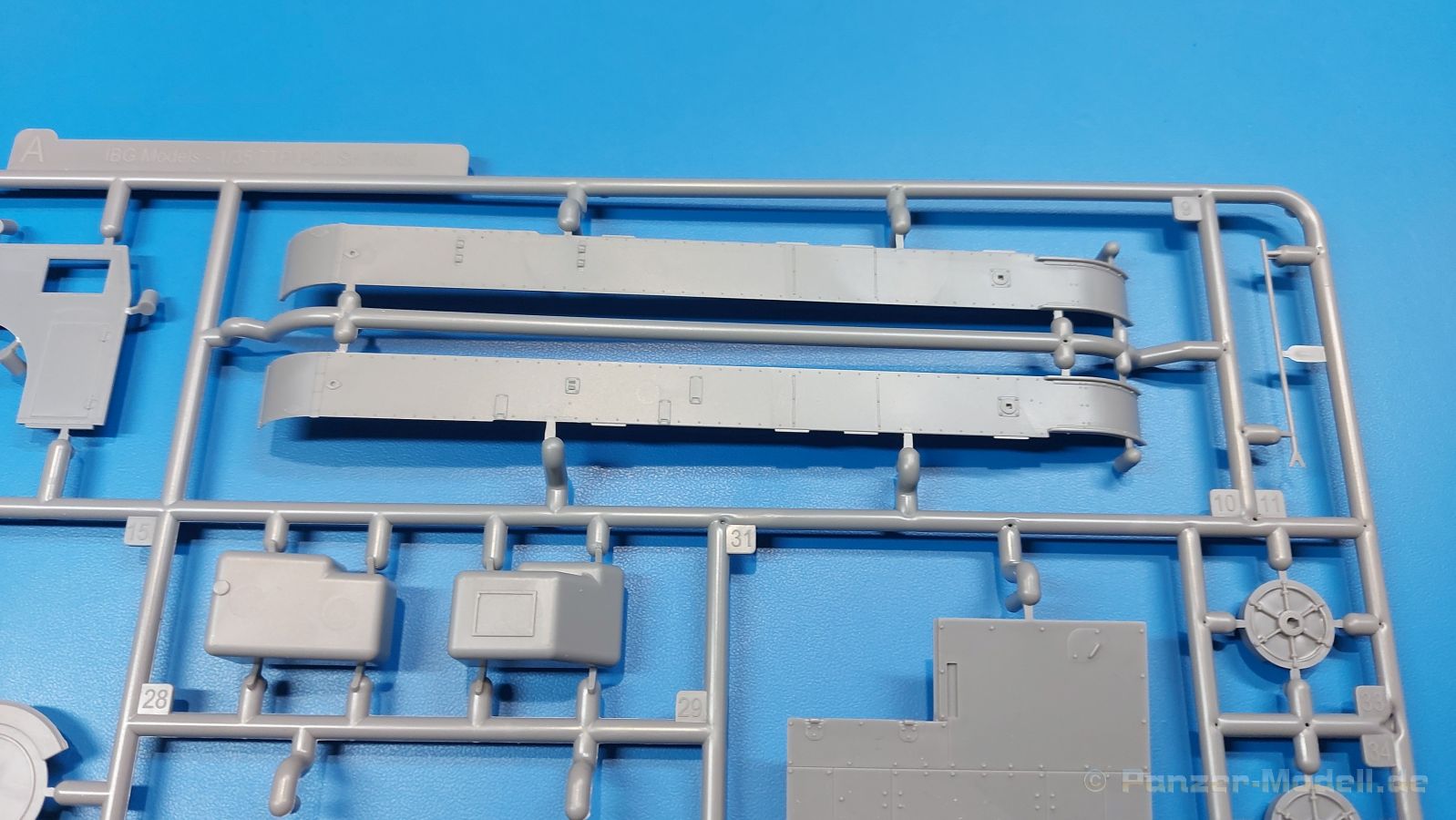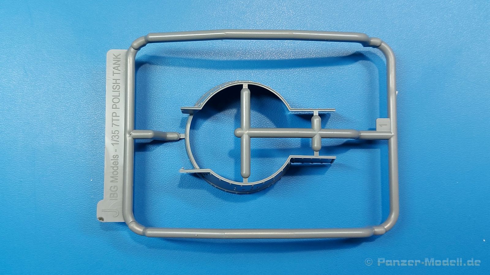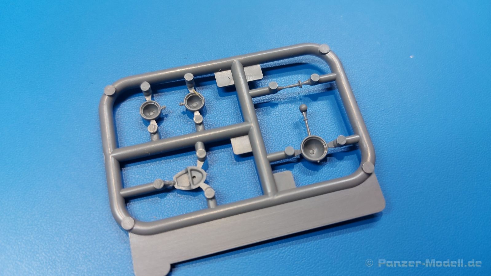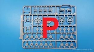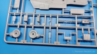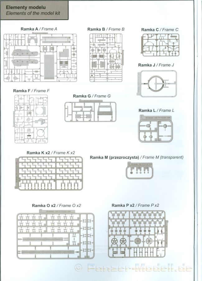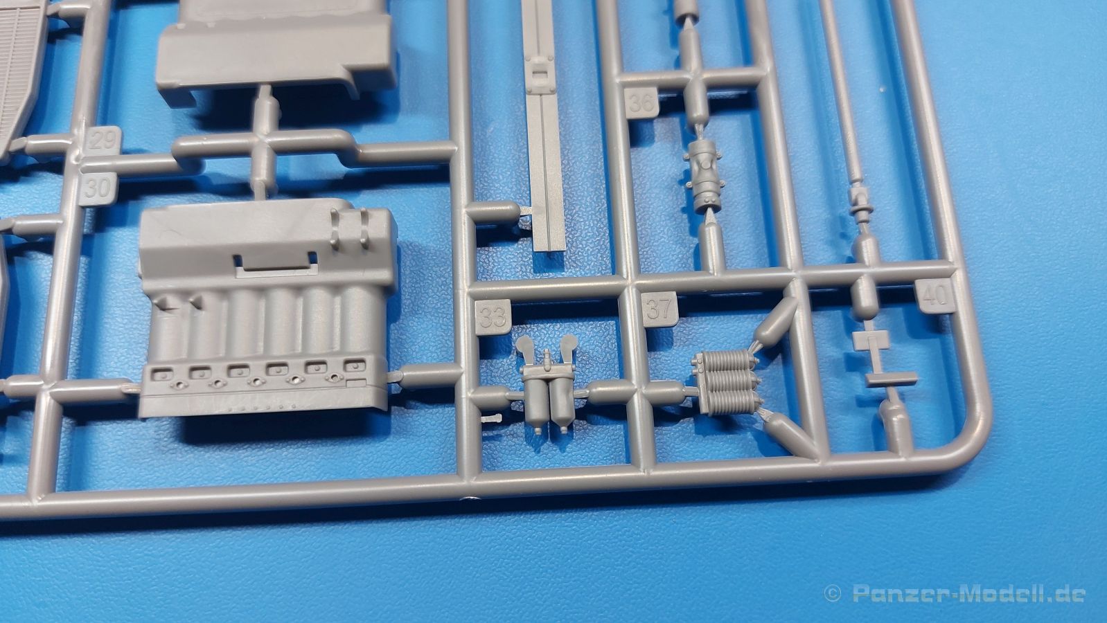 Die Bausätze: IBG hat bereits einige polnische 7TP mit Einzel- und Doppelturm inklusive vollständiger Inneneinrichtung herausgebracht. Da dieser Panzer von der Wehrmacht als Beutefahrzeug übernommen und eingesetzt wurde, bringt der Hersteller konsequenterweise nun auch diese Version auf den Markt. Der Karton mit Stülpdeckel hat die gleiche Größe wie die seiner Vorgänger - 400 x 260 x 60 mm. Die meisten Spritzlinge sind einzeln in Klarsichttüten verpackt. Im Karton enthalten sind 13 hell-graue, ein Klarsichtspritzling, 1 PE-Platine, Decals und die Bauanleitung. Bei den vorigen 7TP Bausätzen wiesen einige Spritzlinge tiefe Sinkstellen auf, die leider auch wieder in diesem vorzufinden sind. Die im Spritzrahmen selbst sollten uns nicht stören, aber auch einige Teile sind betroffen. So hat es auch wieder einige der MG-Munitionskästen (Teile K2) erwischt, aber da man nur 10 Kästen braucht, sind genügend einwandfreie vorhanden. Weitere Sinkstellen sind z.B. am Auspuffkrümmer, dem Gehäuse des Turm-MGs, den Ölfiltern, der Einspritzpumpe und der Lichtmaschine. Da dies Teile der Inneneinrichtung sind, entscheidet man selbst, ob man die Sinkstellen ignoriert, da nach dem Bau kaum noch sichtbar und man sich die Mühe des Verspachtelns auf sich nimmt, weil man das perfekte Modell bauen möchte. Sinnigerweise machen die Teile selbst einen sehr guten Eindruck, mit schönen, feinen Details wie zum Beispiel der Griff und der Verschluss grade an den MG-Gurtkästen. Angüsse sind so gesetzt, dass Details nicht beeinträchtigt werden. Man entdeckt Auswerferspuren auf einigen größeren Teilen wie Motorabdeckung oder Bodenplatte, aber sie sind flach und an Stellen, die später kaum einzusehen sind oder von anderen Teilen überdeckt werden. Die Klarsichtteile für die Scheinwerfer sind kristallklar, ohne Kratzer oder Schlieren. Auch die PE-Teile hinterlassen einen guten Eindruck, grad die Gitter. Die Unterwanne besteht aus Bodenplatte, Seitenteilen und Heckplatte. Auf den Innenseiten kann man die Nietrahmen samt Nieten sehen, auf die beim Original die Panzerplatten genietet waren. Entsprechend sind außen die Nietköpfe und bei den Seitenteilen zusätzlich Trennfugen zu sehen. Die Aufnahmen der Stützrollen sind auch von innen zu sehen und werden mit PE-Platten dargestellt. Eine Zwischenwand trennt Motor- und Kampfraum. Sie ist mit zwei Wartungsklappen mit Scharnieren versehen und enthält zwei Öffnungen, für die feine PE-Gitter beiliegen. Der 6-Zylinder Diesel-Reihenmotor ist sehr detailliert. Der Motorblock besteht aus zwei Längshälften, die mit Ventildeckel und Ölwanne geschlossen werden. Alle wichtigen Anbauteile sind vorhanden - Einspritzpumpe, Anlasser, Luft-, Kraftstoff-, Ölfilter, Abgaskrümmer, Luftkanal, Kühlleitungen, Turbolader(?) und Kupplungsdom. Der Motor ruht auf einem Rahmen aus L-Profilen, der auf der Querachse der hinteren Laufrollenwagen aufliegt. 2 Kühler mit feinen Rippen bekommen je ein Luftgehäuse mit Ventilatoren. Über Keilriemen mit Keilriemenscheiben, die zusammen aus einem Teil bestehen, werden die Ventilatoren mit dem Motor verbunden. Den Motorraum mit all seinen Details zu verschließen, wäre eine Schande, aber es gibt auch einen Lichtblick. Die Heckplatte enthält eine große Öffnung, für die es zwei große Klappen mit PE-Handgriffen gibt, die geschlossen oder offen angebaut werden können. Die Öffnung für die Starterkurbel wird mit einem PE-Deckel verschlossen und ein Rücklicht angebracht. Der Auspuff besteht aus dem eigentlichen Rohr, das am Ende angeschrägt und ausgehöhlt ist und von den beiden Schalldämpferhälften umschlossen wird. Leider sind die seitlichen Wartungsklappen geschlossen angegossen. Der Motordeckel enthält zwei große, angegossene Lüftergrätings, die durchbrochen dargestellt sind. Für 2 weitere Öffnungen gibt es PE-Gitter, die annähernd pyramidenförmig gebogen werden müssen. Je nach Passform werde ich den Motordeckel nur auflegen, nicht kleben. So kann man immer mal wieder einen Blick hineinwerfen. Für das untere Heck gibt es noch einen T-Träger, der als Aufnahme für Ersatzkettenglieder dient und mittig eine Anhängekupplung mit PE-Riegel erhält. Vom Motor nach vorn führt ein Kardangehäuse durch den Kampfraum. IBG hat sich nicht einfach mit dem Gehäuse zufriedengegeben, sondern dieses in Unter- und Oberschale geteilt. Die Kardanwelle mit schönen Gelenken wird in das Gehäuse eingelegt. Man kann also auch eine Wartungsszene mit entfernter Oberschale darstellen (Gelenke abschmieren oder Reparatur). Ein Schaltgetriebeblock wird vorn mittig auf die Bodenplatte gesetzt. Schalthebel und Schaltkulisse (letztere aus einem PE-Teil zu biegen) bringt man auf der Fahrerseite an. Die vom Schaltgetriebe abgehenden Antriebswellengehäuse sind mehrteilig ausgeführt und sehr schön mit Ecken und Kanten und Verschraubungen wiedergegeben. Sie schließen an den Lenkbremsen an. Die Querachse der vorderen Rollenwagen findet vor dem Fahrersitz und unter der Kardanwelle seinen Platz. Auch die Antriebsräder haben eine Querachse, die feine Lager bekommen und Ausstellhebel aus PE. Das Lenkbremssystem ist mit Hebeln, Widerlagern und natürlich den Lenkbremshebeln des Fahrers wiedergegeben. Auch hier wird die Detaillierung mittels PE unterstützt. Der zweiteilige Kraftstofftank wird links von Schaltgetriebe auf den Boden gesetzt. (Als Fahrer eines solchen Gefechtsfahrzeuges würde ich mich da nicht so wohl fühlen!) Der Fahrersitz besitzt aus Sitzpolster (mit Vertiefungen auf der Sitzfläche) und der Rückenlehne. Dem Fahrer steht zudem ein Bremspedal aus Plastik und ein Gaspedal aus PE zur Verfügung. Im Kampfraum hinter dem Fahrer findet der Munitionsbunker aus PE seinen Platz. Er kann 80 Schuss Kanonenmunition und 10 Patronenkästen MG-Munition aufnehmen. Die beiden K-Spritzlinge enthalten je 41 einzelne 37mm Patronen und 15 MG-Gurtkästen, also mehr als genug! Der Kampfraum wird nach oben mit einer Platte geschlossen, die natürlich