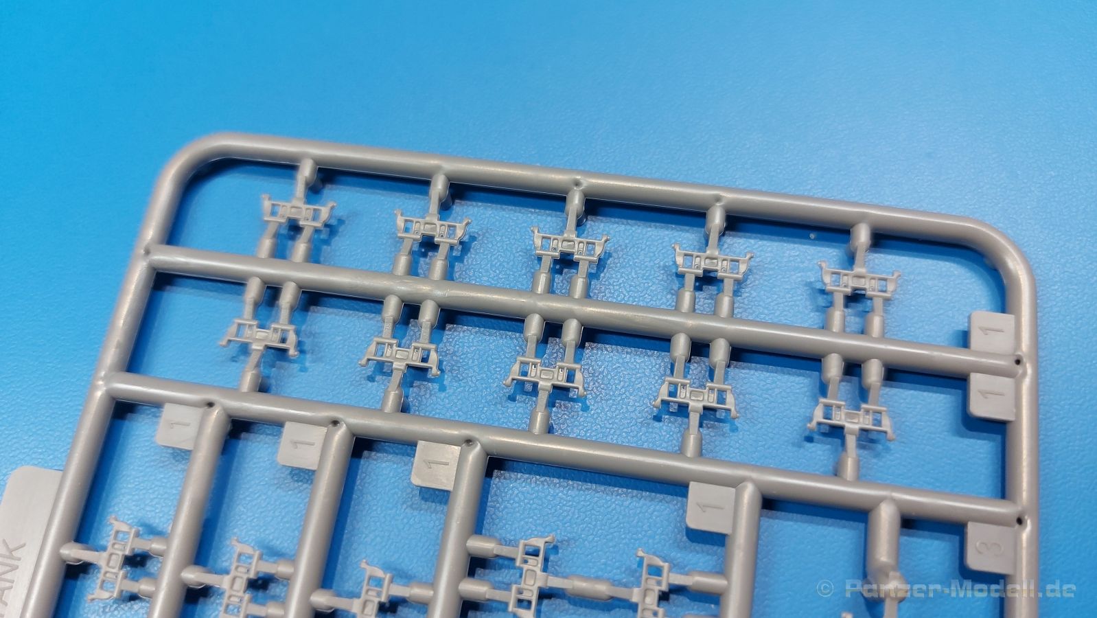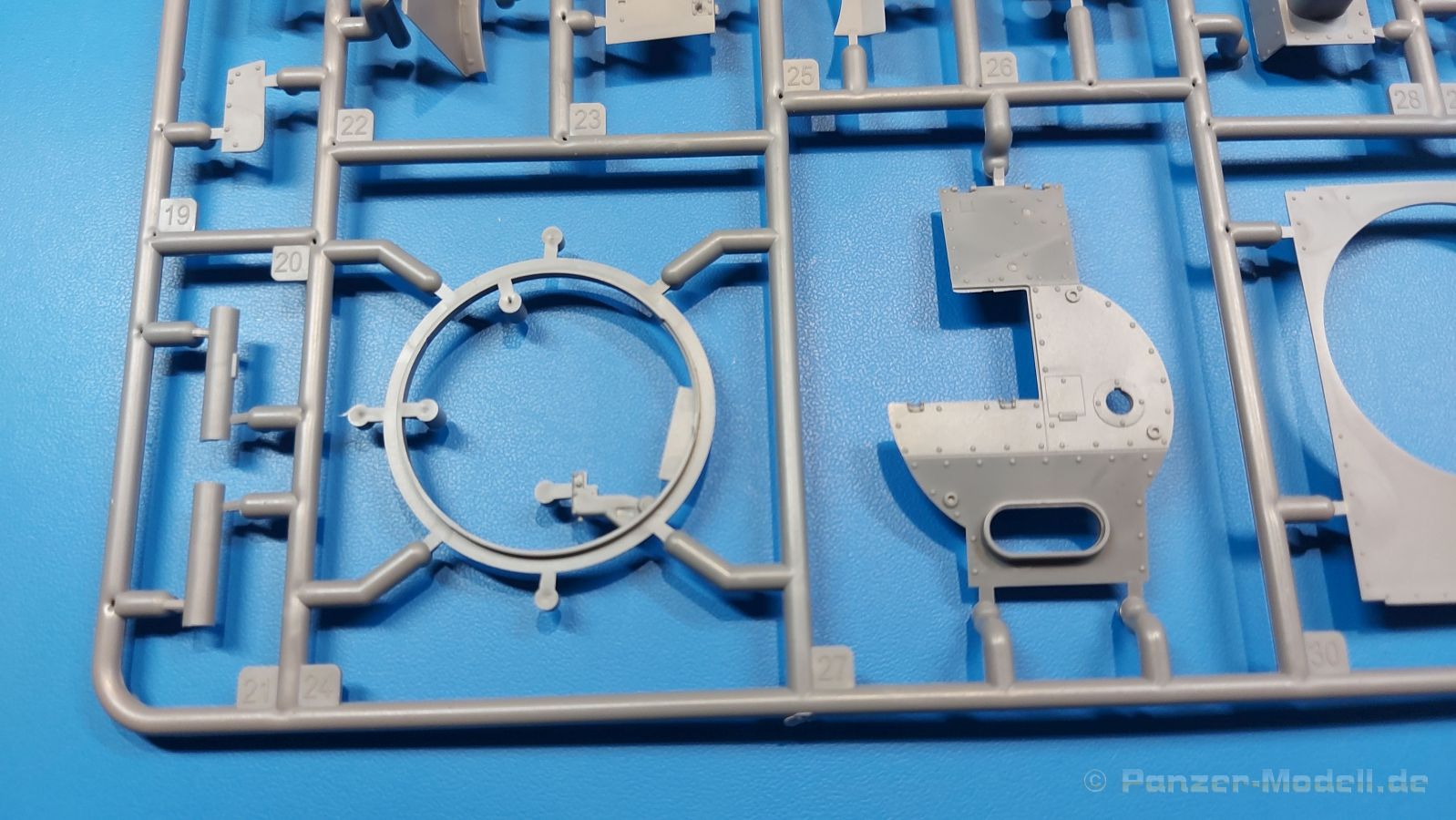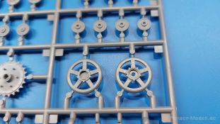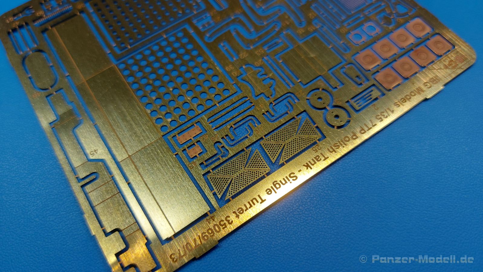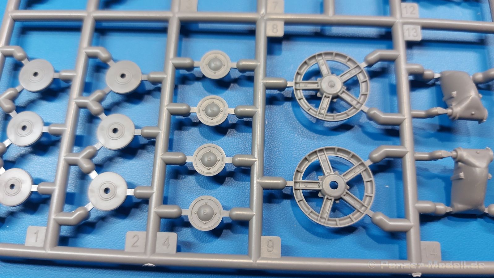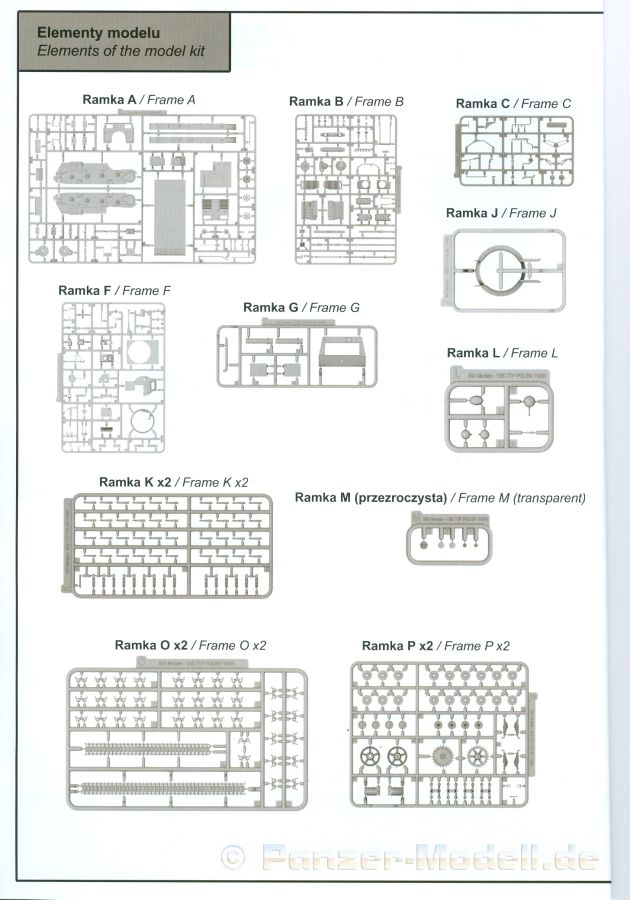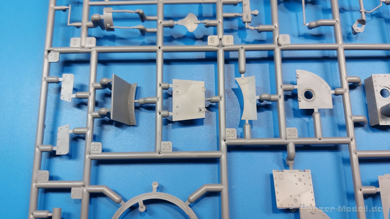 Die Bausätze: IBG hat bereits einige polnische 7TP mit Einzel- und Doppelturm inklusive vollständiger Inneneinrichtung herausgebracht. Da dieser Panzer von der Wehrmacht als Beutefahrzeug übernommen und eingesetzt wurde, bringt der Hersteller konsequenterweise nun auch diese Version auf den Markt. Der Karton mit Stülpdeckel hat die gleiche Größe wie die seiner Vorgänger - 400 x 260 x 60 mm. Die meisten Spritzlinge sind einzeln in Klarsichttüten verpackt. Im Karton enthalten sind 13 hell-graue, ein Klarsichtspritzling, 1 PE-Platine, Decals und die Bauanleitung. Bei den vorigen 7TP Bausätzen wiesen einige Spritzlinge tiefe Sinkstellen auf, die leider auch wieder in diesem vorzufinden sind. Die im Spritzrahmen selbst sollten uns nicht stören, aber auch einige Teile sind betroffen. So hat es auch wieder einige der MG-Munitionskästen (Teile K2) erwischt, aber da man nur 10 Kästen braucht, sind genügend einwandfreie vorhanden. Weitere Sinkstellen sind z.B. am Auspuffkrümmer, dem Gehäuse des Turm-MGs, den Ölfiltern, der Einspritzpumpe und der Lichtmaschine. Da dies Teile der Inneneinrichtung sind, entscheidet man selbst, ob man die Sinkstellen ignoriert, da nach dem Bau kaum noch sichtbar und man sich die Mühe des Verspachtelns auf sich nimmt, weil man das perfekte Modell bauen möchte. Sinnigerweise machen die Teile selbst einen sehr guten Eindruck, mit schönen, feinen Details wie zum Beispiel der Griff und der Verschluss grade an den MG-Gurtkästen. Angüsse sind so gesetzt, dass Details nicht beeinträchtigt werden. Man entdeckt Auswerferspuren auf einigen größeren Teilen wie Motorabdeckung oder Bodenplatte, aber sie sind flach und an Stellen, die später kaum einzusehen sind oder von anderen Teilen überdeckt werden. Die Klarsichtteile für die Scheinwerfer sind kristallklar, ohne Kratzer oder Schlieren. Auch die PE-Teile hinterlassen einen guten Eindruck, grad die Gitter. Die Unterwanne besteht aus Bodenplatte, Seitenteilen und Heckplatte. Auf den Innenseiten kann man die Nietrahmen samt Nieten sehen, auf die beim Original die Panzerplatten genietet waren. Entsprechend sind außen die Nietköpfe und bei den Seitenteilen zusätzlich Trennfugen zu sehen. Die Aufnahmen der Stützrollen sind auch von innen zu sehen und werden mit PE-Platten dargestellt. Eine Zwischenwand trennt Motor- und Kampfraum. Sie ist mit zwei Wartungsklappen mit Scharnieren versehen und enthält zwei Öffnungen, für die feine PE-Gitter beiliegen. Der 6-Zylinder Diesel-Reihenmotor ist sehr detailliert. Der Motorblock besteht aus zwei Längshälften, die mit Ventildeckel und Ölwanne geschlossen werden. Alle wichtigen Anbauteile sind vorhanden - Einspritzpumpe, Anlasser, Luft-, Kraftstoff-, Ölfilter, Abgaskrümmer, Luftkanal, Kühlleitungen, Turbolader(?) und Kupplungsdom. Der Motor ruht auf einem Rahmen aus L-Profilen, der auf der Querachse der hinteren Laufrollenwagen aufliegt. 2 Kühler mit feinen Rippen bekommen je ein Luftgehäuse mit Ventilatoren. Über Keilriemen mit Keilriemenscheiben, die zusammen aus einem Teil bestehen, werden die Ventilatoren mit dem Motor verbunden. Den Motorraum mit all seinen Details zu verschließen, wäre eine Schande, aber es gibt auch einen Lichtblick. Die Heckplatte enthält eine große Öffnung, für die es zwei große Klappen mit PE-Handgriffen gibt, die geschlossen oder offen angebaut werden können. Die Öffnung für die Starterkurbel wird mit einem PE-Deckel verschlossen und ein Rücklicht angebracht. Der Auspuff besteht aus dem eigentlichen Rohr, das am Ende angeschrägt und ausgehöhlt ist und von den beiden Schalldämpferhälften umschlossen wird. Leider sind die seitlichen Wartungsklappen geschlossen angegossen. Der Motordeckel enthält zwei große, angegossene Lüftergrätings, die durchbrochen dargestellt sind. Für 2 weitere Öffnungen gibt es PE-Gitter, die annähernd pyramidenförmig gebogen werden müssen. Je nach Passform werde ich den Motordeckel nur auflegen, nicht kleben. So kann man immer mal wieder einen Blick hineinwerfen. Für das untere Heck gibt es noch einen T-Träger, der als Aufnahme für Ersatzkettenglieder dient und mittig eine Anhängekupplung mit PE-Riegel erhält. Vom Motor nach vorn führt ein Kardangehäuse durch den Kampfraum. IBG hat sich nicht einfach mit dem Gehäuse zufriedengegeben, sondern dieses in Unter- und Oberschale geteilt. Die Kardanwelle mit schönen Gelenken wird in das Gehäuse eingelegt. Man kann also auch eine Wartungsszene mit entfernter Oberschale darstellen (Gelenke abschmieren oder Reparatur). Ein Schaltgetriebeblock wird vorn mittig auf die Bodenplatte gesetzt. Schalthebel und Schaltkulisse (letztere aus einem PE-Teil zu biegen) bringt man auf der Fahrerseite an. Die vom Schaltgetriebe abgehenden Antriebswellengehäuse sind mehrteilig ausgeführt und sehr schön mit Ecken und Kanten und Verschraubungen wiedergegeben. Sie schließen an den Lenkbremsen an. Die Querachse der vorderen Rollenwagen findet vor dem Fahrersitz und unter der Kardanwelle seinen Platz. Auch die Antriebsräder haben eine Querachse, die feine Lager bekommen und Ausstellhebel aus PE. Das Lenkbremssystem ist mit Hebeln, Widerlagern und natürlich den Lenkbremshebeln des Fahrers wiedergegeben. Auch hier wird die Detaillierung mittels PE unterstützt. Der zweiteilige Kraftstofftank wird links von Schaltgetriebe auf den Boden gesetzt. (Als Fahrer eines solchen Gefechtsfahrzeuges würde ich mich da nicht so wohl fühlen!) Der Fahrersitz besitzt aus Sitzpolster (mit Vertiefungen auf der Sitzfläche) und der Rückenlehne. Dem Fahrer steht zudem ein Bremspedal aus Plastik und ein Gaspedal aus PE zur Verfügung. Im Kampfraum hinter dem Fahrer findet der Munitionsbunker aus PE seinen Platz. Er kann 80 Schuss Kanonenmunition und 10 Patronenkästen MG-Munition aufnehmen. Die beiden K-Spritzlinge enthalten je 41 einzelne 37mm Patronen und 15 MG-Gurtkästen, also mehr als genug! Der Kampfraum wird nach oben mit einer Platte geschlossen, die natürlich