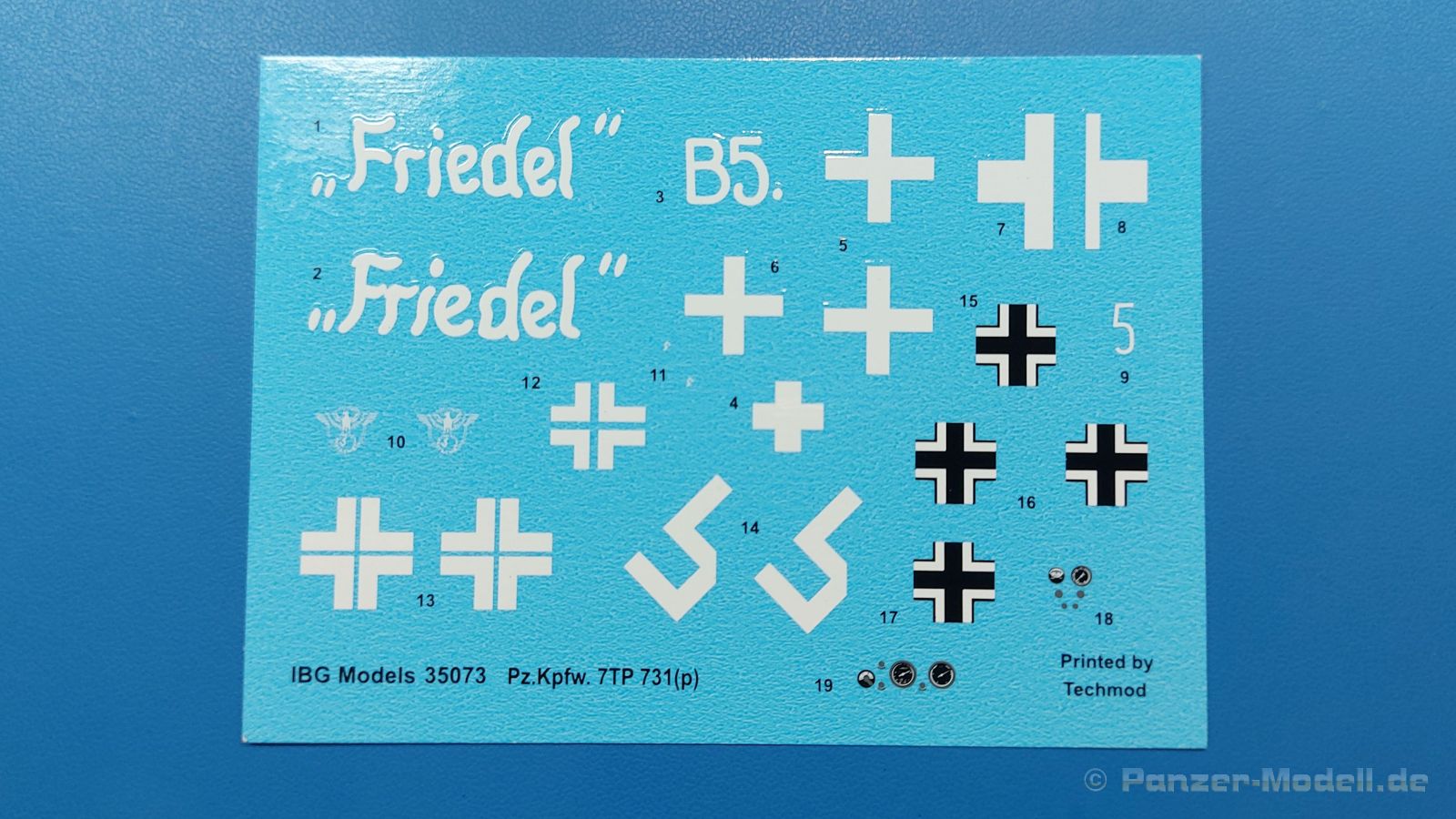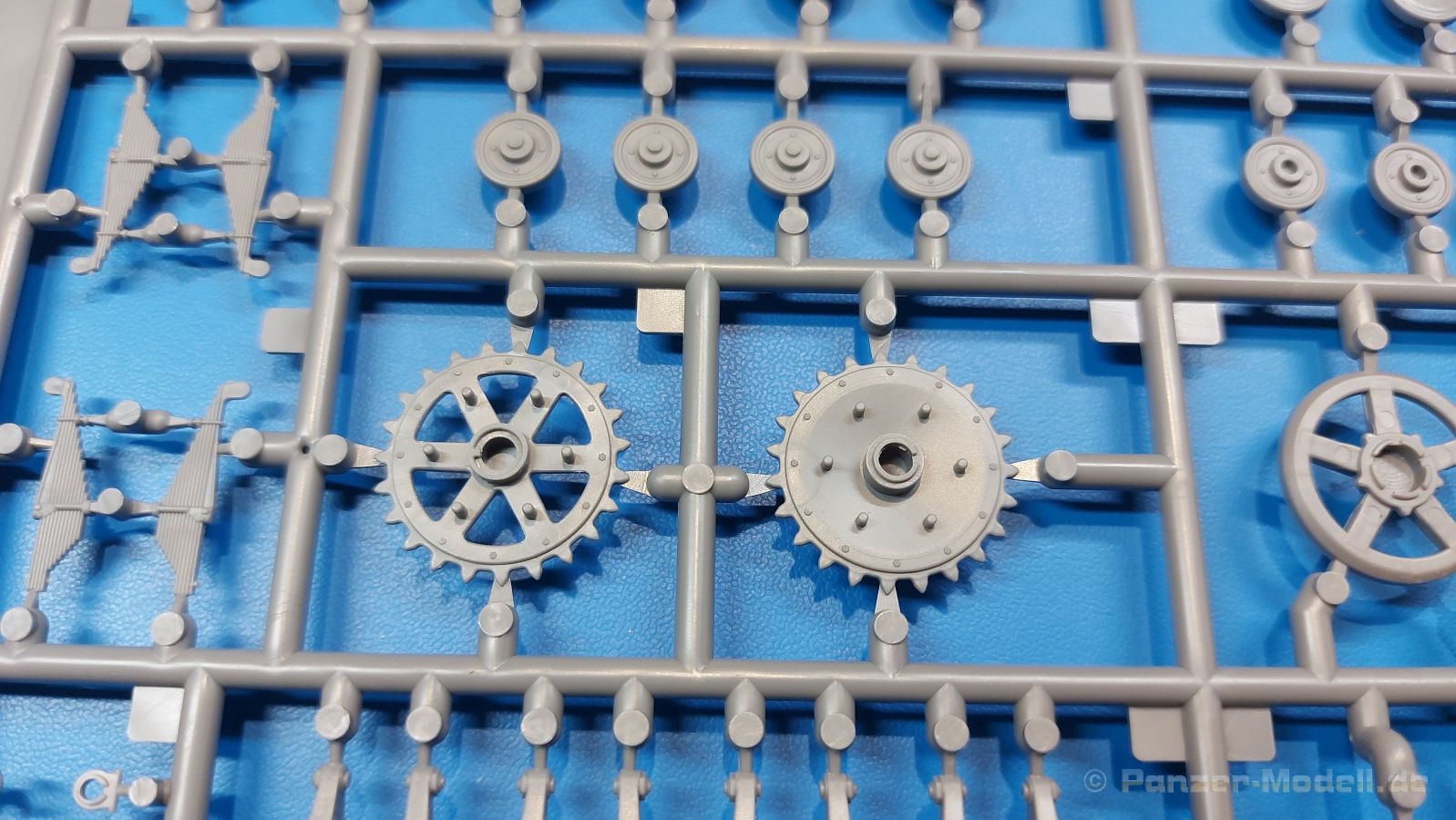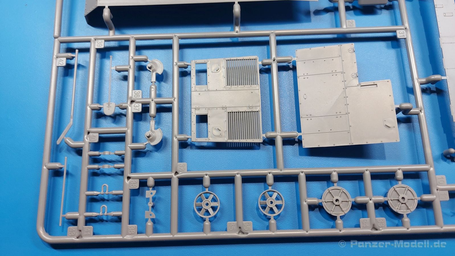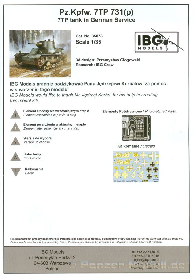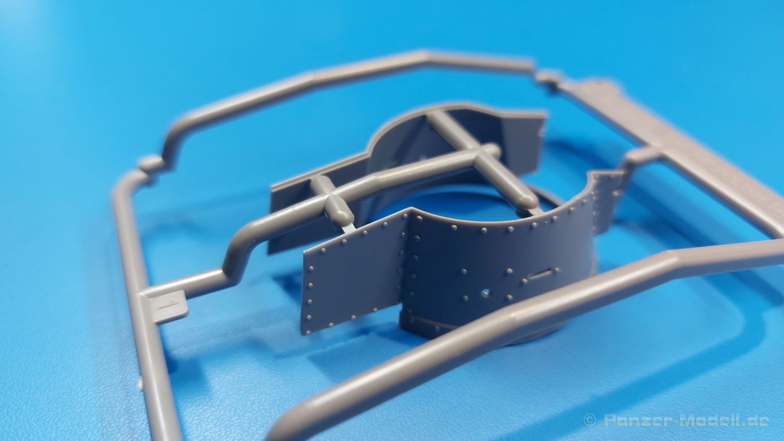 Die Bausätze: IBG hat bereits einige polnische 7TP mit Einzel- und Doppelturm inklusive vollständiger Inneneinrichtung herausgebracht. Da dieser Panzer von der Wehrmacht als Beutefahrzeug übernommen und eingesetzt wurde, bringt der Hersteller konsequenterweise nun auch diese Version auf den Markt. Der Karton mit Stülpdeckel hat die gleiche Größe wie die seiner Vorgänger - 400 x 260 x 60 mm. Die meisten Spritzlinge sind einzeln in Klarsichttüten verpackt. Im Karton enthalten sind 13 hell-graue, ein Klarsichtspritzling, 1 PE-Platine, Decals und die Bauanleitung. Bei den vorigen 7TP Bausätzen wiesen einige Spritzlinge tiefe Sinkstellen auf, die leider auch wieder in diesem vorzufinden sind. Die im Spritzrahmen selbst sollten uns nicht stören, aber auch einige Teile sind betroffen. So hat es auch wieder einige der MG-Munitionskästen (Teile K2) erwischt, aber da man nur 10 Kästen braucht, sind genügend einwandfreie vorhanden. Weitere Sinkstellen sind z.B. am Auspuffkrümmer, dem Gehäuse des Turm-MGs, den Ölfiltern, der Einspritzpumpe und der Lichtmaschine. Da dies Teile der Inneneinrichtung sind, entscheidet man selbst, ob man die Sinkstellen ignoriert, da nach dem Bau kaum noch sichtbar und man sich die Mühe des Verspachtelns auf sich nimmt, weil man das perfekte Modell bauen möchte. Sinnigerweise machen die Teile selbst einen sehr guten Eindruck, mit schönen, feinen Details wie zum Beispiel der Griff und der Verschluss grade an den MG-Gurtkästen. Angüsse sind so gesetzt, dass Details nicht beeinträchtigt werden. Man entdeckt Auswerferspuren auf einigen größeren Teilen wie Motorabdeckung oder Bodenplatte, aber sie sind flach und an Stellen, die später kaum einzusehen sind oder von anderen Teilen überdeckt werden. Die Klarsichtteile für die Scheinwerfer sind kristallklar, ohne Kratzer oder Schlieren. Auch die PE-Teile hinterlassen einen guten Eindruck, grad die Gitter. Die Unterwanne besteht aus Bodenplatte, Seitenteilen und Heckplatte. Auf den Innenseiten kann man die Nietrahmen samt Nieten sehen, auf die beim Original die Panzerplatten genietet waren. Entsprechend sind außen die Nietköpfe und bei den Seitenteilen zusätzlich Trennfugen zu sehen. Die Aufnahmen der Stützrollen sind auch von innen zu sehen und werden mit PE-Platten dargestellt. Eine Zwischenwand trennt Motor- und Kampfraum. Sie ist mit zwei Wartungsklappen mit Scharnieren versehen und enthält zwei Öffnungen, für die feine PE-Gitter beiliegen. Der 6-Zylinder Diesel-Reihenmotor ist sehr detailliert. Der Motorblock besteht aus zwei Längshälften, die mit Ventildeckel und Ölwanne geschlossen werden. Alle wichtigen Anbauteile sind vorhanden - Einspritzpumpe, Anlasser, Luft-, Kraftstoff-, Ölfilter, Abgaskrümmer, Luftkanal, Kühlleitungen, Turbolader(?) und Kupplungsdom. Der Motor ruht auf einem Rahmen aus L-Profilen, der auf der Querachse der hinteren Laufrollenwagen aufliegt. 2 Kühler mit feinen Rippen bekommen je ein Luftgehäuse mit Ventilatoren. Über Keilriemen mit Keilriemenscheiben, die zusammen aus einem Teil bestehen, werden die Ventilatoren mit dem Motor verbunden. Den Motorraum mit all seinen Details zu verschließen, wäre eine Schande, aber es gibt auch einen Lichtblick. Die Heckplatte enthält eine große Öffnung, für die es zwei große Klappen mit PE-Handgriffen gibt, die geschlossen oder offen angebaut werden können. Die Öffnung für die Starterkurbel wird mit einem PE-Deckel verschlossen und ein Rücklicht angebracht. Der Auspuff besteht aus dem eigentlichen Rohr, das am Ende angeschrägt und ausgehöhlt ist und von den beiden Schalldämpferhälften umschlossen wird. Leider sind die seitlichen Wartungsklappen geschlossen angegossen. Der Motordeckel enthält zwei große, angegossene Lüftergrätings, die durchbrochen dargestellt sind. Für 2 weitere Öffnungen gibt es PE-Gitter, die annähernd pyramidenförmig gebogen werden müssen. Je nach Passform werde ich den Motordeckel nur auflegen, nicht kleben. So kann man immer mal wieder einen Blick hineinwerfen. Für das untere Heck gibt es noch einen T-Träger, der als Aufnahme für Ersatzkettenglieder dient und mittig eine Anhängekupplung mit PE-Riegel erhält. Vom Motor nach vorn führt ein Kardangehäuse durch den Kampfraum. IBG hat sich nicht einfach mit dem Gehäuse zufriedengegeben, sondern dieses in Unter- und Oberschale geteilt. Die Kardanwelle mit schönen Gelenken wird in das Gehäuse eingelegt. Man kann also auch eine Wartungsszene mit entfernter Oberschale darstellen (Gelenke abschmieren oder Reparatur). Ein Schaltgetriebeblock wird vorn mittig auf die Bodenplatte gesetzt. Schalthebel und Schaltkulisse (letztere aus einem PE-Teil zu biegen) bringt man auf der Fahrerseite an. Die vom Schaltgetriebe abgehenden Antriebswellengehäuse sind mehrteilig ausgeführt und sehr schön mit Ecken und Kanten und Verschraubungen wiedergegeben. Sie schließen an den Lenkbremsen an. Die Querachse der vorderen Rollenwagen findet vor dem Fahrersitz und unter der Kardanwelle seinen Platz. Auch die Antriebsräder haben eine Querachse, die feine Lager bekommen und Ausstellhebel aus PE. Das Lenkbremssystem ist mit Hebeln, Widerlagern und natürlich den Lenkbremshebeln des Fahrers wiedergegeben. Auch hier wird die Detaillierung mittels PE unterstützt. Der zweiteilige Kraftstofftank wird links von Schaltgetriebe auf den Boden gesetzt. (Als Fahrer eines solchen Gefechtsfahrzeuges würde ich mich da nicht so wohl fühlen!) Der Fahrersitz besitzt aus Sitzpolster (mit Vertiefungen auf der Sitzfläche) und der Rückenlehne. Dem Fahrer steht zudem ein Bremspedal aus Plastik und ein Gaspedal aus PE zur Verfügung. Im Kampfraum hinter dem Fahrer findet der Munitionsbunker aus PE seinen Platz. Er kann 80 Schuss Kanonenmunition und 10 Patronenkästen MG-Munition aufnehmen. Die beiden K-Spritzlinge enthalten je 41 einzelne 37mm Patronen und 15 MG-Gurtkästen, also mehr als genug! Der Kampfraum wird nach oben mit einer Platte geschlossen, die natürlich
