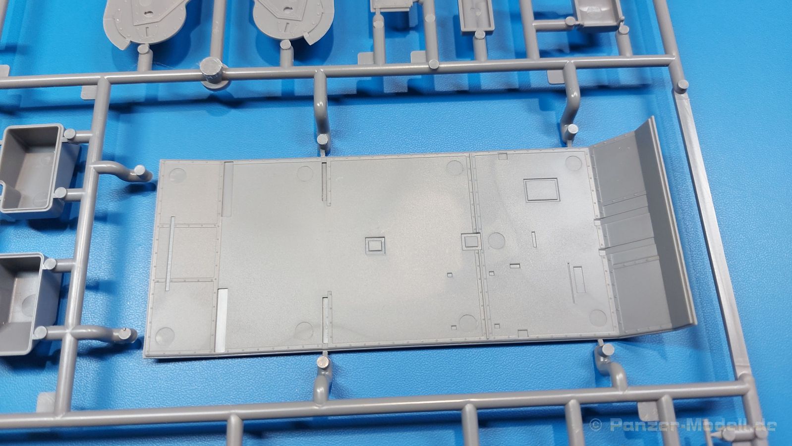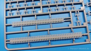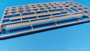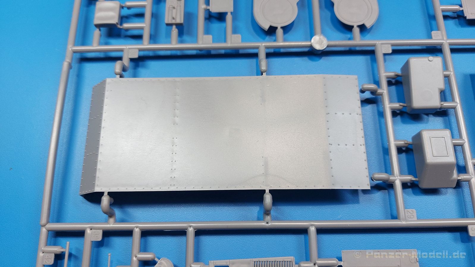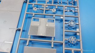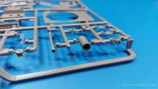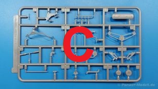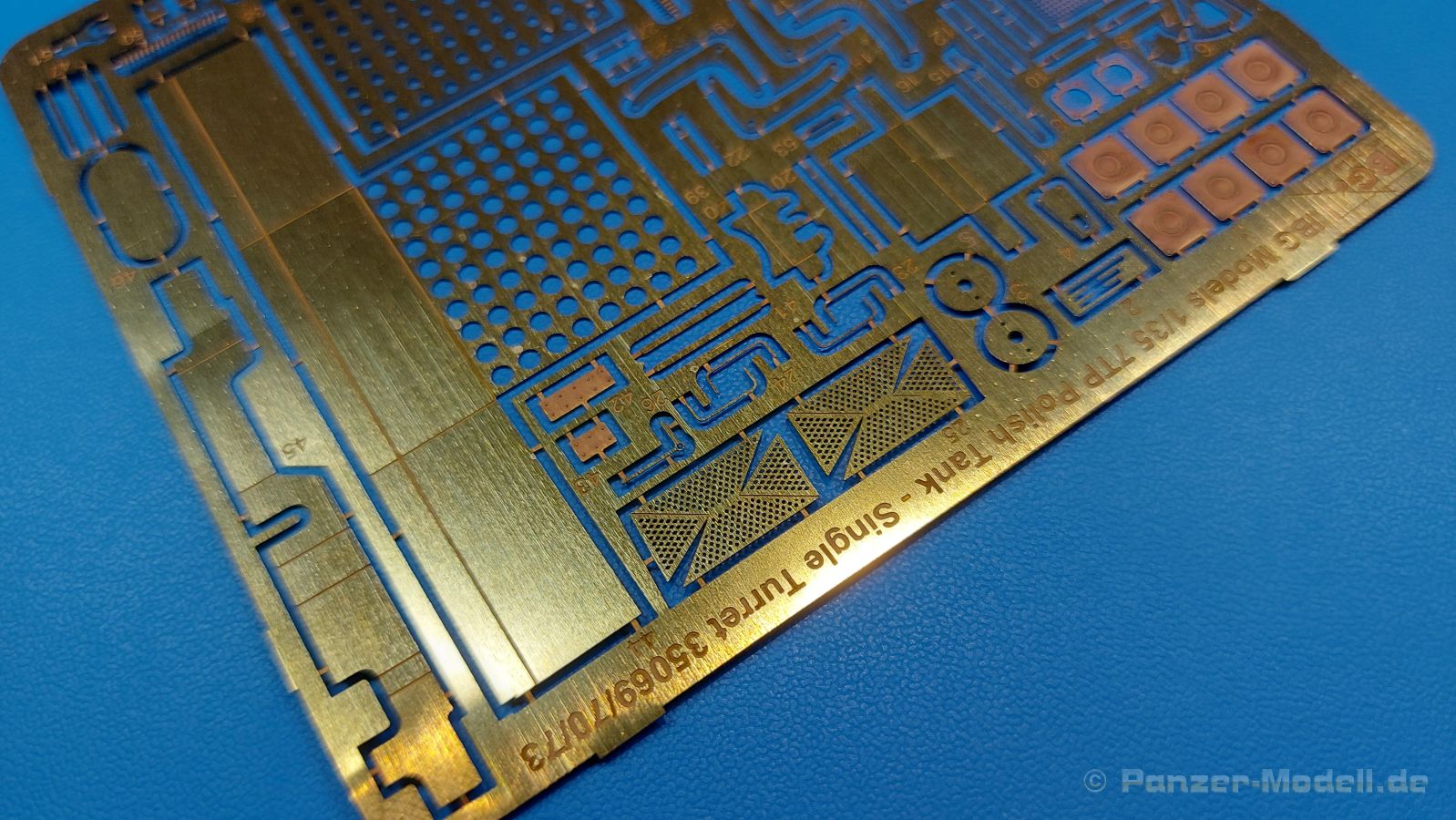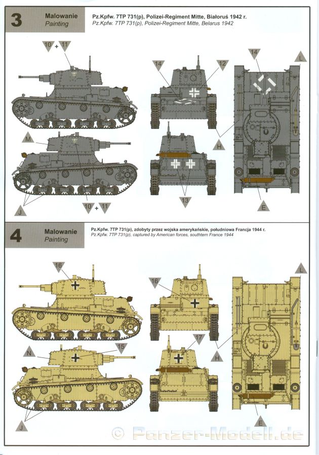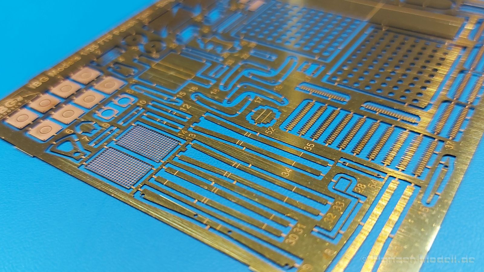 Die Bausätze: IBG hat bereits einige polnische 7TP mit Einzel- und Doppelturm inklusive vollständiger Inneneinrichtung herausgebracht. Da dieser Panzer von der Wehrmacht als Beutefahrzeug übernommen und eingesetzt wurde, bringt der Hersteller konsequenterweise nun auch diese Version auf den Markt. Der Karton mit Stülpdeckel hat die gleiche Größe wie die seiner Vorgänger - 400 x 260 x 60 mm. Die meisten Spritzlinge sind einzeln in Klarsichttüten verpackt. Im Karton enthalten sind 13 hell-graue, ein Klarsichtspritzling, 1 PE-Platine, Decals und die Bauanleitung. Bei den vorigen 7TP Bausätzen wiesen einige Spritzlinge tiefe Sinkstellen auf, die leider auch wieder in diesem vorzufinden sind. Die im Spritzrahmen selbst sollten uns nicht stören, aber auch einige Teile sind betroffen. So hat es auch wieder einige der MG-Munitionskästen (Teile K2) erwischt, aber da man nur 10 Kästen braucht, sind genügend einwandfreie vorhanden. Weitere Sinkstellen sind z.B. am Auspuffkrümmer, dem Gehäuse des Turm-MGs, den Ölfiltern, der Einspritzpumpe und der Lichtmaschine. Da dies Teile der Inneneinrichtung sind, entscheidet man selbst, ob man die Sinkstellen ignoriert, da nach dem Bau kaum noch sichtbar und man sich die Mühe des Verspachtelns auf sich nimmt, weil man das perfekte Modell bauen möchte. Sinnigerweise machen die Teile selbst einen sehr guten Eindruck, mit schönen, feinen Details wie zum Beispiel der Griff und der Verschluss grade an den MG-Gurtkästen. Angüsse sind so gesetzt, dass Details nicht beeinträchtigt werden. Man entdeckt Auswerferspuren auf einigen größeren Teilen wie Motorabdeckung oder Bodenplatte, aber sie sind flach und an Stellen, die später kaum einzusehen sind oder von anderen Teilen überdeckt werden. Die Klarsichtteile für die Scheinwerfer sind kristallklar, ohne Kratzer oder Schlieren. Auch die PE-Teile hinterlassen einen guten Eindruck, grad die Gitter. Die Unterwanne besteht aus Bodenplatte, Seitenteilen und Heckplatte. Auf den Innenseiten kann man die Nietrahmen samt Nieten sehen, auf die beim Original die Panzerplatten genietet waren. Entsprechend sind außen die Nietköpfe und bei den Seitenteilen zusätzlich Trennfugen zu sehen. Die Aufnahmen der Stützrollen sind auch von innen zu sehen und werden mit PE-Platten dargestellt. Eine Zwischenwand trennt Motor- und Kampfraum. Sie ist mit zwei Wartungsklappen mit Scharnieren versehen und enthält zwei Öffnungen, für die feine PE-Gitter beiliegen. Der 6-Zylinder Diesel-Reihenmotor ist sehr detailliert. Der Motorblock besteht aus zwei Längshälften, die mit Ventildeckel und Ölwanne geschlossen werden. Alle wichtigen Anbauteile sind vorhanden - Einspritzpumpe, Anlasser, Luft-, Kraftstoff-, Ölfilter, Abgaskrümmer, Luftkanal, Kühlleitungen, Turbolader(?) und Kupplungsdom. Der Motor ruht auf einem Rahmen aus L-Profilen, der auf der Querachse der hinteren Laufrollenwagen aufliegt. 2 Kühler mit feinen Rippen bekommen je ein Luftgehäuse mit Ventilatoren. Über Keilriemen mit Keilriemenscheiben, die zusammen aus einem Teil bestehen, werden die Ventilatoren mit dem Motor verbunden. Den Motorraum mit all seinen Details zu verschließen, wäre eine Schande, aber es gibt auch einen Lichtblick. Die Heckplatte enthält eine große Öffnung, für die es zwei große Klappen mit PE-Handgriffen gibt, die geschlossen oder offen angebaut werden können. Die Öffnung für die Starterkurbel wird mit einem PE-Deckel verschlossen und ein Rücklicht angebracht. Der Auspuff besteht aus dem eigentlichen Rohr, das am Ende angeschrägt und ausgehöhlt ist und von den beiden Schalldämpferhälften umschlossen wird. Leider sind die seitlichen Wartungsklappen geschlossen angegossen. Der Motordeckel enthält zwei große, angegossene Lüftergrätings, die durchbrochen dargestellt sind. Für 2 weitere Öffnungen gibt es PE-Gitter, die annähernd pyramidenförmig gebogen werden müssen. Je nach Passform werde ich den Motordeckel nur auflegen, nicht kleben. So kann man immer mal wieder einen Blick hineinwerfen. Für das untere Heck gibt es noch einen T-Träger, der als Aufnahme für Ersatzkettenglieder dient und mittig eine Anhängekupplung mit PE-Riegel erhält. Vom Motor nach vorn führt ein Kardangehäuse durch den Kampfraum. IBG hat sich nicht einfach mit dem Gehäuse zufriedengegeben, sondern dieses in Unter- und Oberschale geteilt. Die Kardanwelle mit schönen Gelenken wird in das Gehäuse eingelegt. Man kann also auch eine Wartungsszene mit entfernter Oberschale darstellen (Gelenke abschmieren oder Reparatur). Ein Schaltgetriebeblock wird vorn mittig auf die Bodenplatte gesetzt. Schalthebel und Schaltkulisse (letztere aus einem PE-Teil zu biegen) bringt man auf der Fahrerseite an. Die vom Schaltgetriebe abgehenden Antriebswellengehäuse sind mehrteilig ausgeführt und sehr schön mit Ecken und Kanten und Verschraubungen wiedergegeben. Sie schließen an den Lenkbremsen an. Die Querachse der vorderen Rollenwagen findet vor dem Fahrersitz und unter der Kardanwelle seinen Platz. Auch die Antriebsräder haben eine Querachse, die feine Lager bekommen und Ausstellhebel aus PE. Das Lenkbremssystem ist mit Hebeln, Widerlagern und natürlich den Lenkbremshebeln des Fahrers wiedergegeben. Auch hier wird die Detaillierung mittels PE unterstützt. Der zweiteilige Kraftstofftank wird links von Schaltgetriebe auf den Boden gesetzt. (Als Fahrer eines solchen Gefechtsfahrzeuges würde ich mich da nicht so wohl fühlen!) Der Fahrersitz besitzt aus Sitzpolster (mit Vertiefungen auf der Sitzfläche) und der Rückenlehne. Dem Fahrer steht zudem ein Bremspedal aus Plastik und ein Gaspedal aus PE zur Verfügung. Im Kampfraum hinter dem Fahrer findet der Munitionsbunker aus PE seinen Platz. Er kann 80 Schuss Kanonenmunition und 10 Patronenkästen MG-Munition aufnehmen. Die beiden K-Spritzlinge enthalten je 41 einzelne 37mm Patronen und 15 MG-Gurtkästen, also mehr als genug! Der Kampfraum wird nach oben mit einer Platte geschlossen, die natürlich