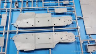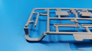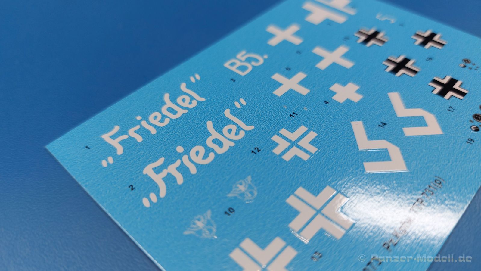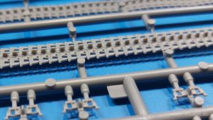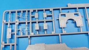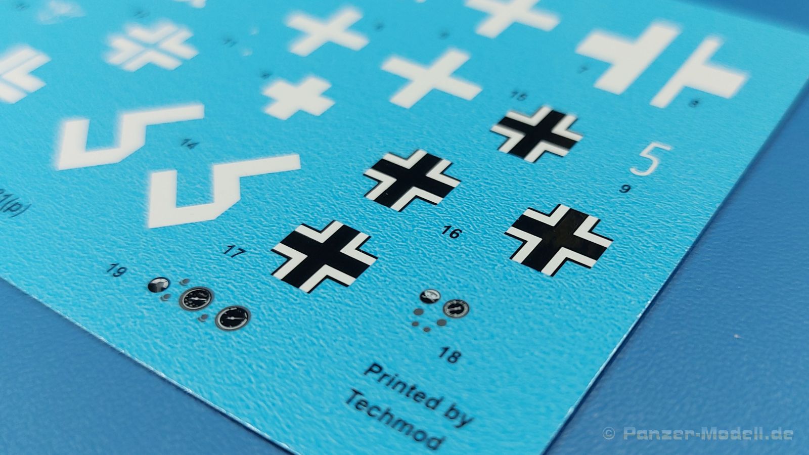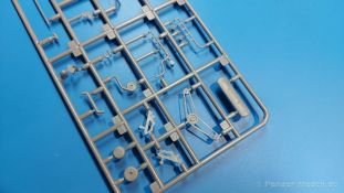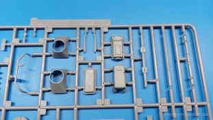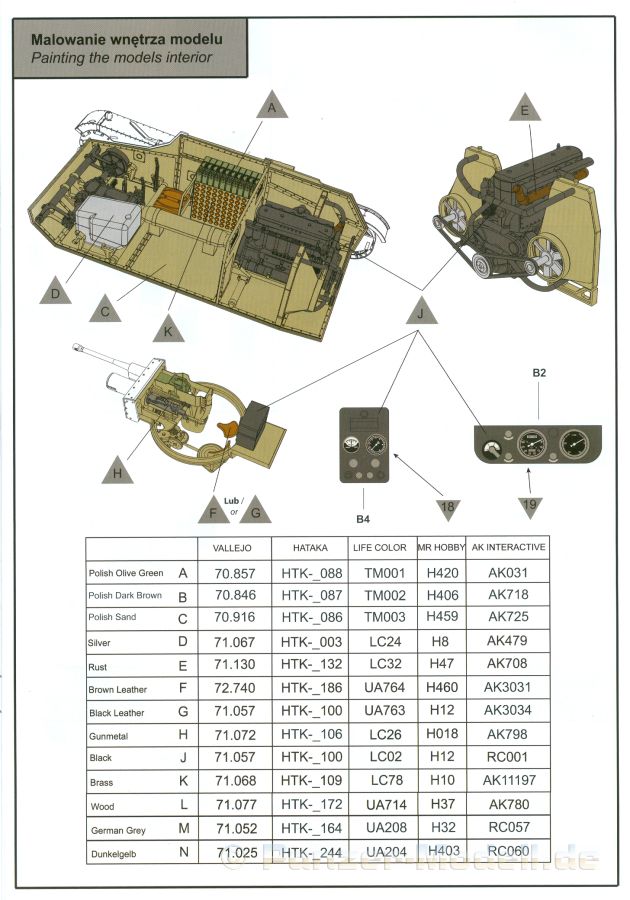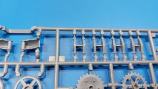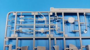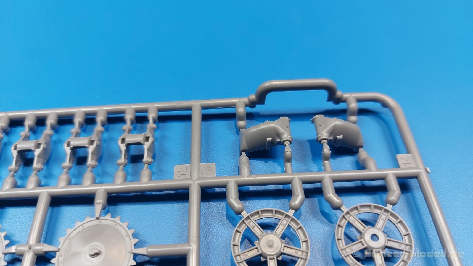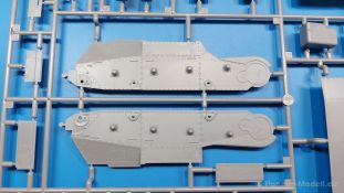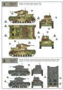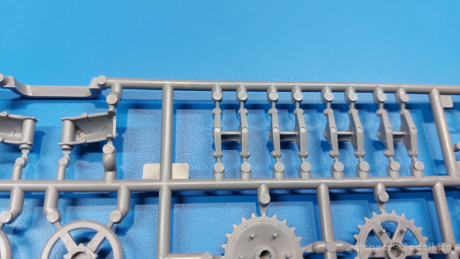 Die Bausätze: IBG hat bereits einige polnische 7TP mit Einzel- und Doppelturm inklusive vollständiger Inneneinrichtung herausgebracht. Da dieser Panzer von der Wehrmacht als Beutefahrzeug übernommen und eingesetzt wurde, bringt der Hersteller konsequenterweise nun auch diese Version auf den Markt. Der Karton mit Stülpdeckel hat die gleiche Größe wie die seiner Vorgänger - 400 x 260 x 60 mm. Die meisten Spritzlinge sind einzeln in Klarsichttüten verpackt. Im Karton enthalten sind 13 hell-graue, ein Klarsichtspritzling, 1 PE-Platine, Decals und die Bauanleitung. Bei den vorigen 7TP Bausätzen wiesen einige Spritzlinge tiefe Sinkstellen auf, die leider auch wieder in diesem vorzufinden sind. Die im Spritzrahmen selbst sollten uns nicht stören, aber auch einige Teile sind betroffen. So hat es auch wieder einige der MG-Munitionskästen (Teile K2) erwischt, aber da man nur 10 Kästen braucht, sind genügend einwandfreie vorhanden. Weitere Sinkstellen sind z.B. am Auspuffkrümmer, dem Gehäuse des Turm-MGs, den Ölfiltern, der Einspritzpumpe und der Lichtmaschine. Da dies Teile der Inneneinrichtung sind, entscheidet man selbst, ob man die Sinkstellen ignoriert, da nach dem Bau kaum noch sichtbar und man sich die Mühe des Verspachtelns auf sich nimmt, weil man das perfekte Modell bauen möchte. Sinnigerweise machen die Teile selbst einen sehr guten Eindruck, mit schönen, feinen Details wie zum Beispiel der Griff und der Verschluss grade an den MG-Gurtkästen. Angüsse sind so gesetzt, dass Details nicht beeinträchtigt werden. Man entdeckt Auswerferspuren auf einigen größeren Teilen wie Motorabdeckung oder Bodenplatte, aber sie sind flach und an Stellen, die später kaum einzusehen sind oder von anderen Teilen überdeckt werden. Die Klarsichtteile für die Scheinwerfer sind kristallklar, ohne Kratzer oder Schlieren. Auch die PE-Teile hinterlassen einen guten Eindruck, grad die Gitter. Die Unterwanne besteht aus Bodenplatte, Seitenteilen und Heckplatte. Auf den Innenseiten kann man die Nietrahmen samt Nieten sehen, auf die beim Original die Panzerplatten genietet waren. Entsprechend sind außen die Nietköpfe und bei den Seitenteilen zusätzlich Trennfugen zu sehen. Die Aufnahmen der Stützrollen sind auch von innen zu sehen und werden mit PE-Platten dargestellt. Eine Zwischenwand trennt Motor- und Kampfraum. Sie ist mit zwei Wartungsklappen mit Scharnieren versehen und enthält zwei Öffnungen, für die feine PE-Gitter beiliegen. Der 6-Zylinder Diesel-Reihenmotor ist sehr detailliert. Der Motorblock besteht aus zwei Längshälften, die mit Ventildeckel und Ölwanne geschlossen werden. Alle wichtigen Anbauteile sind vorhanden - Einspritzpumpe, Anlasser, Luft-, Kraftstoff-, Ölfilter, Abgaskrümmer, Luftkanal, Kühlleitungen, Turbolader(?) und Kupplungsdom. Der Motor ruht auf einem Rahmen aus L-Profilen, der auf der Querachse der hinteren Laufrollenwagen aufliegt. 2 Kühler mit feinen Rippen bekommen je ein Luftgehäuse mit Ventilatoren. Über Keilriemen mit Keilriemenscheiben, die zusammen aus einem Teil bestehen, werden die Ventilatoren mit dem Motor verbunden. Den Motorraum mit all seinen Details zu verschließen, wäre eine Schande, aber es gibt auch einen Lichtblick. Die Heckplatte enthält eine große Öffnung, für die es zwei große Klappen mit PE-Handgriffen gibt, die geschlossen oder offen angebaut werden können. Die Öffnung für die Starterkurbel wird mit einem PE-Deckel verschlossen und ein Rücklicht angebracht. Der Auspuff besteht aus dem eigentlichen Rohr, das am Ende angeschrägt und ausgehöhlt ist und von den beiden Schalldämpferhälften umschlossen wird. Leider sind die seitlichen Wartungsklappen geschlossen angegossen. Der Motordeckel enthält zwei große, angegossene Lüftergrätings, die durchbrochen dargestellt sind. Für 2 weitere Öffnungen gibt es PE-Gitter, die annähernd pyramidenförmig gebogen werden müssen. Je nach Passform werde ich den Motordeckel nur auflegen, nicht kleben. So kann man immer mal wieder einen Blick hineinwerfen. Für das untere Heck gibt es noch einen T-Träger, der als Aufnahme für Ersatzkettenglieder dient und mittig eine Anhängekupplung mit PE-Riegel erhält. Vom Motor nach vorn führt ein Kardangehäuse durch den Kampfraum. IBG hat sich nicht einfach mit dem Gehäuse zufriedengegeben, sondern dieses in Unter- und Oberschale geteilt. Die Kardanwelle mit schönen Gelenken wird in das Gehäuse eingelegt. Man kann also auch eine Wartungsszene mit entfernter Oberschale darstellen (Gelenke abschmieren oder Reparatur). Ein Schaltgetriebeblock wird vorn mittig auf die Bodenplatte gesetzt. Schalthebel und Schaltkulisse (letztere aus einem PE-Teil zu biegen) bringt man auf der Fahrerseite an. Die vom Schaltgetriebe abgehenden Antriebswellengehäuse sind mehrteilig ausgeführt und sehr schön mit Ecken und Kanten und Verschraubungen wiedergegeben. Sie schließen an den Lenkbremsen an. Die Querachse der vorderen Rollenwagen findet vor dem Fahrersitz und unter der Kardanwelle seinen Platz. Auch die Antriebsräder haben eine Querachse, die feine Lager bekommen und Ausstellhebel aus PE. Das Lenkbremssystem ist mit Hebeln, Widerlagern und natürlich den Lenkbremshebeln des Fahrers wiedergegeben. Auch hier wird die Detaillierung mittels PE unterstützt. Der zweiteilige Kraftstofftank wird links von Schaltgetriebe auf den Boden gesetzt. (Als Fahrer eines solchen Gefechtsfahrzeuges würde ich mich da nicht so wohl fühlen!) Der Fahrersitz besitzt aus Sitzpolster (mit Vertiefungen auf der Sitzfläche) und der Rückenlehne. Dem Fahrer steht zudem ein Bremspedal aus Plastik und ein Gaspedal aus PE zur Verfügung. Im Kampfraum hinter dem Fahrer findet der Munitionsbunker aus PE seinen Platz. Er kann 80 Schuss Kanonenmunition und 10 Patronenkästen MG-Munition aufnehmen. Die beiden K-Spritzlinge enthalten je 41 einzelne 37mm Patronen und 15 MG-Gurtkästen, also mehr als genug! Der Kampfraum wird nach oben mit einer Platte geschlossen, die natürlich